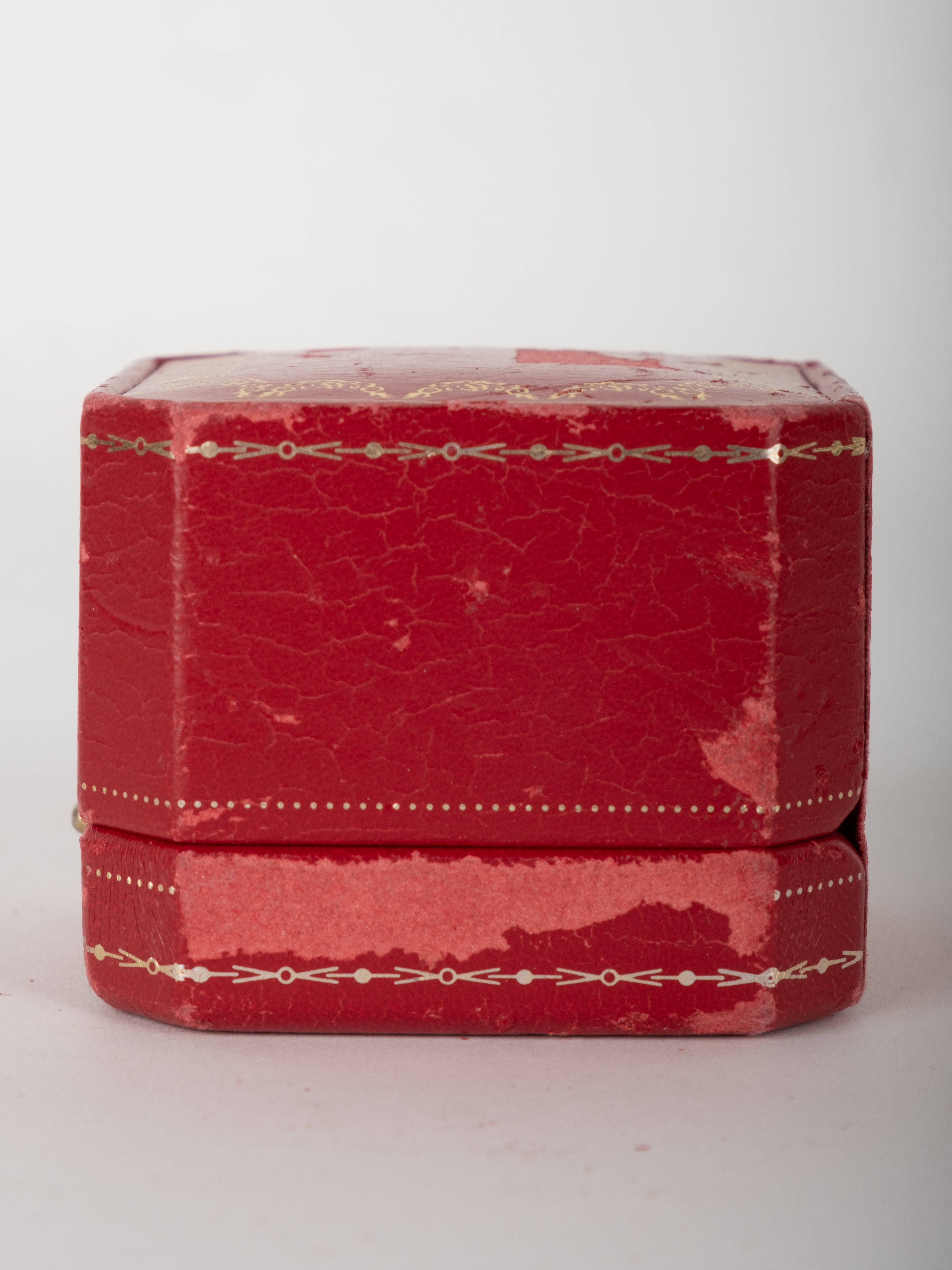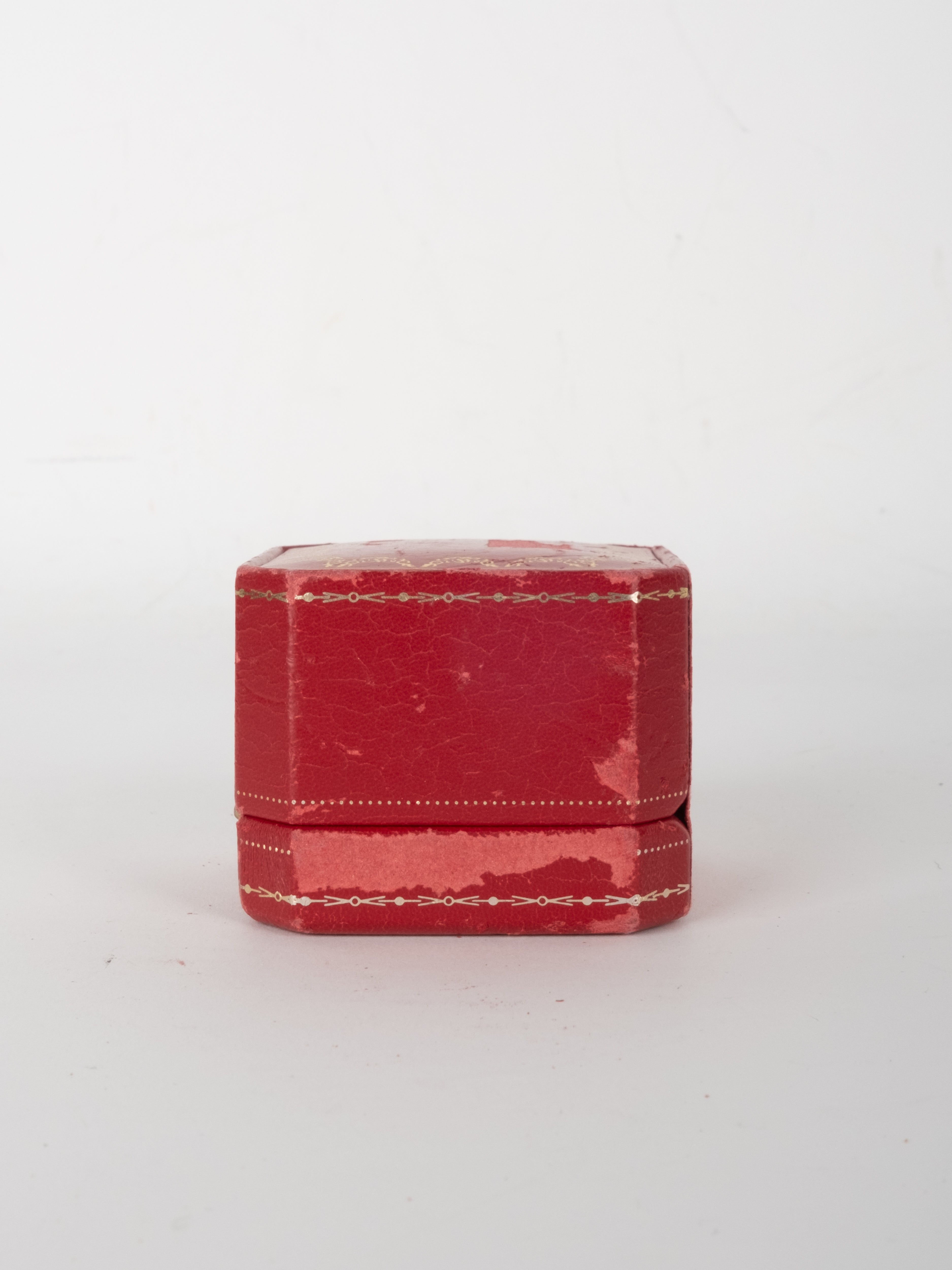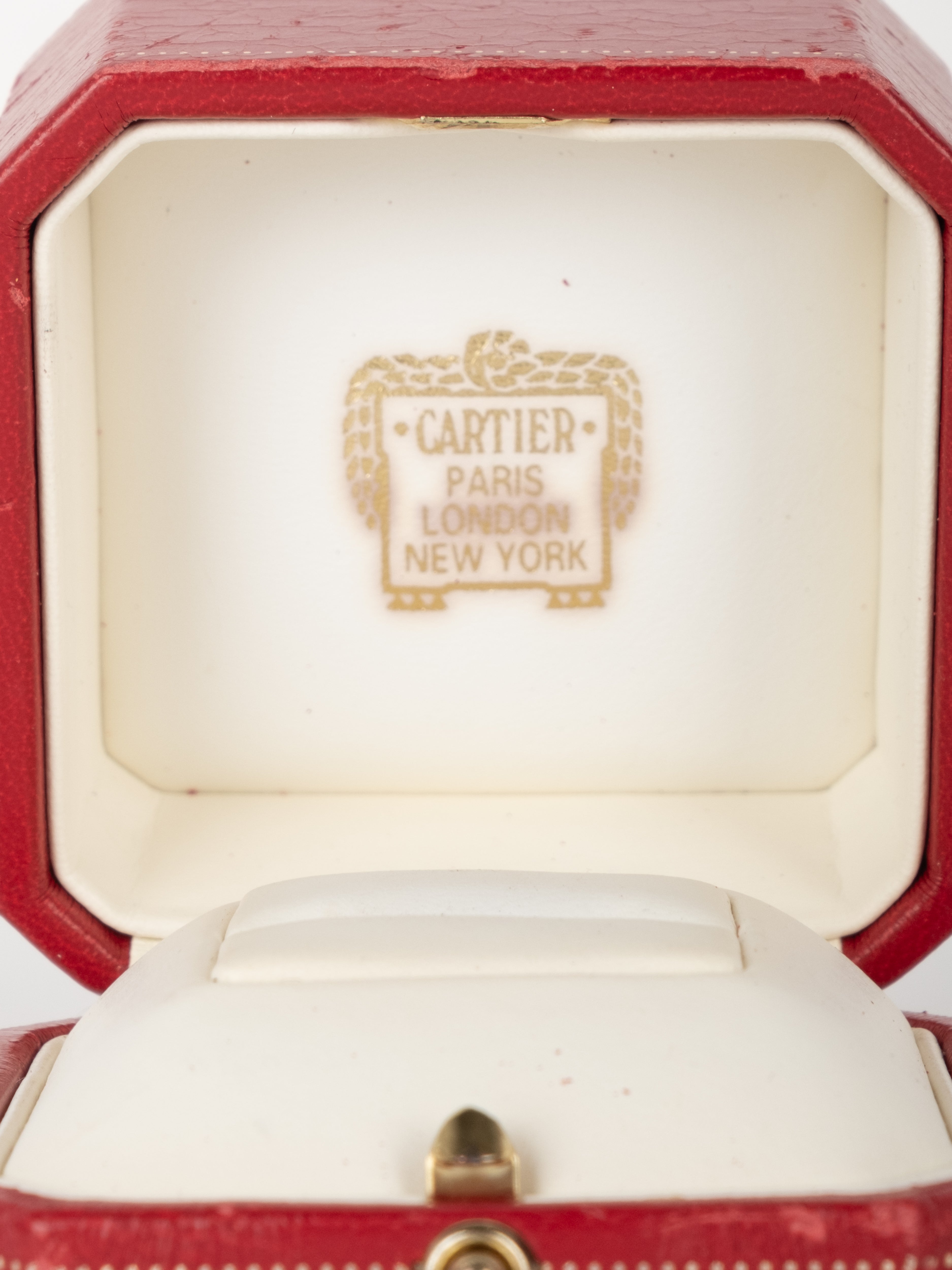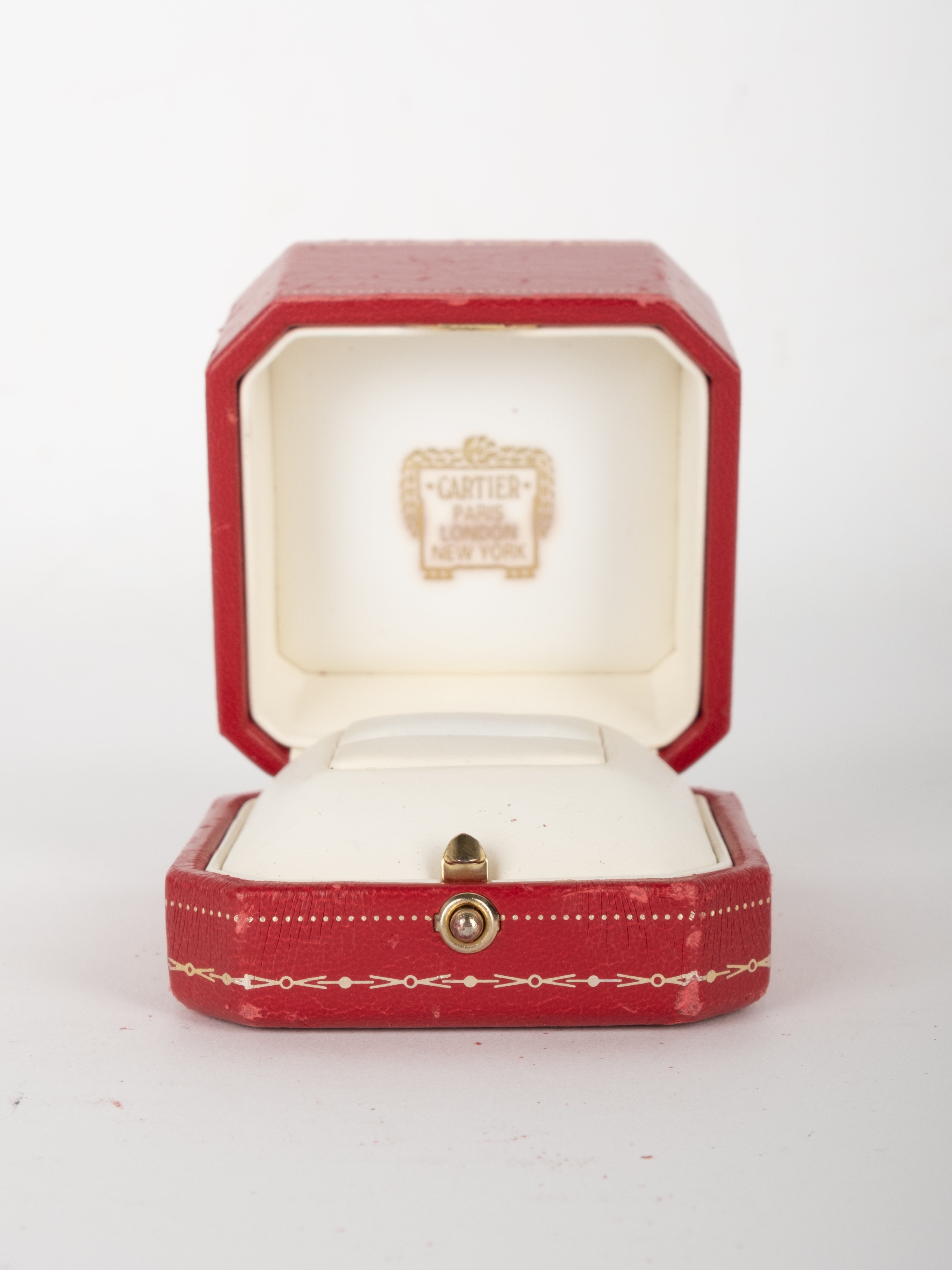 קופסת תכשיטים מקורית של Cartier בגוון אדום עמוק, עם תפירה דקורטיבית והטבעות זהב עדינות. הקופסה נפתחת ונסגרת בצורה תקינה, עם פנים בהיר המיועד לאחסון תכשיט.