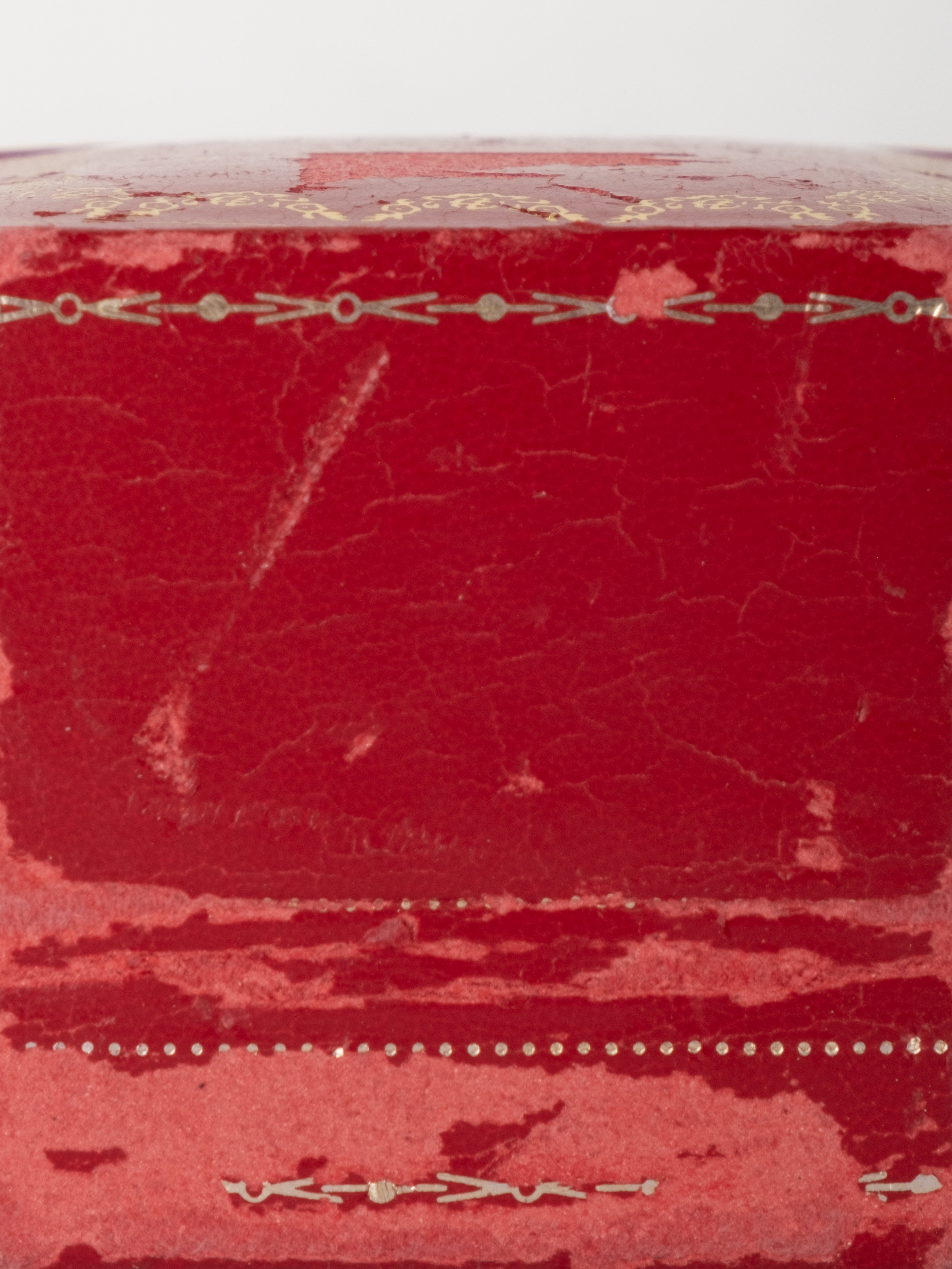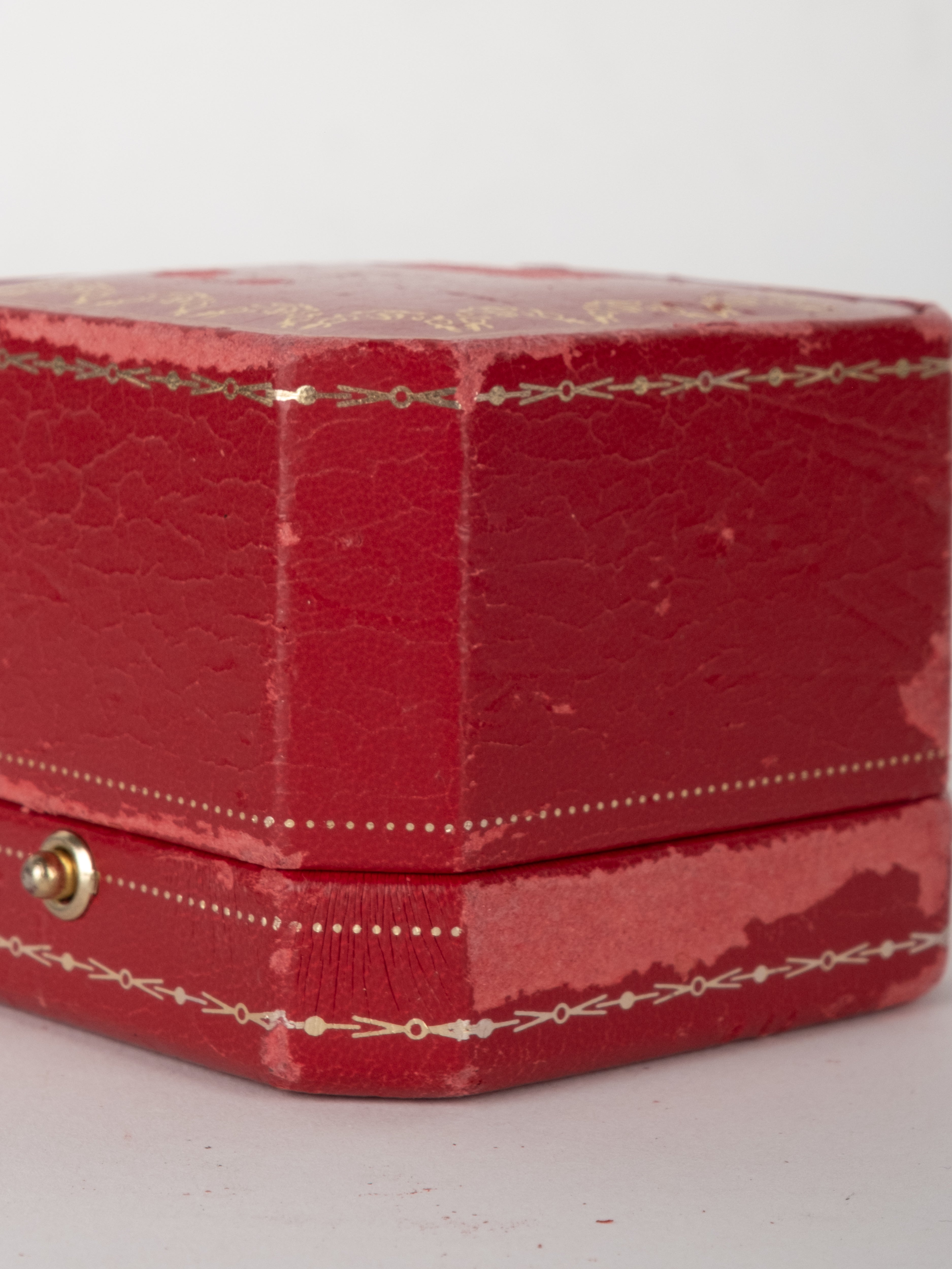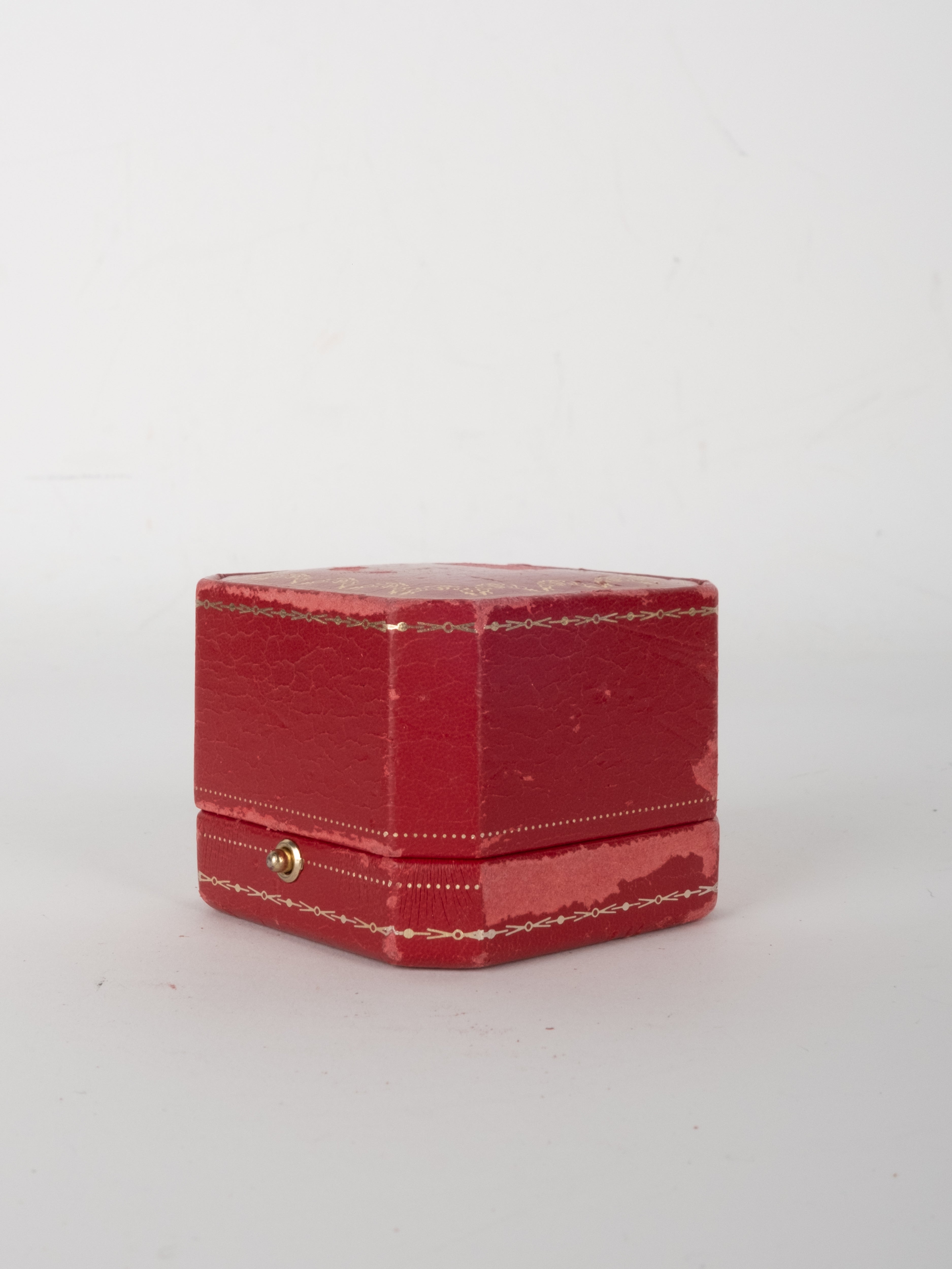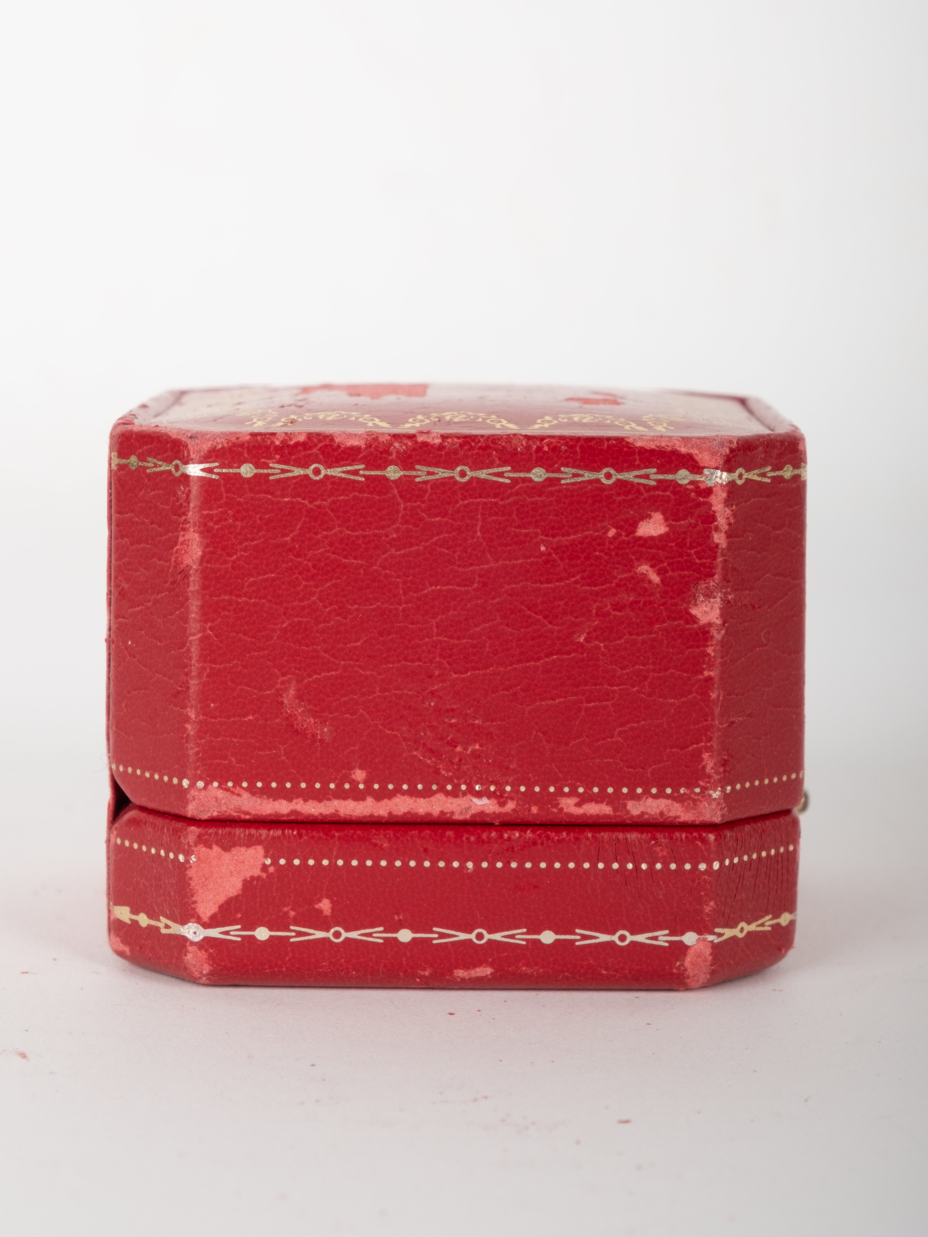 קופסת תכשיטים מקורית של Cartier בגוון אדום עמוק, עם תפירה דקורטיבית והטבעות זהב עדינות. הקופסה נפתחת ונסגרת בצורה תקינה, עם פנים בהיר המיועד לאחסון תכשיט.