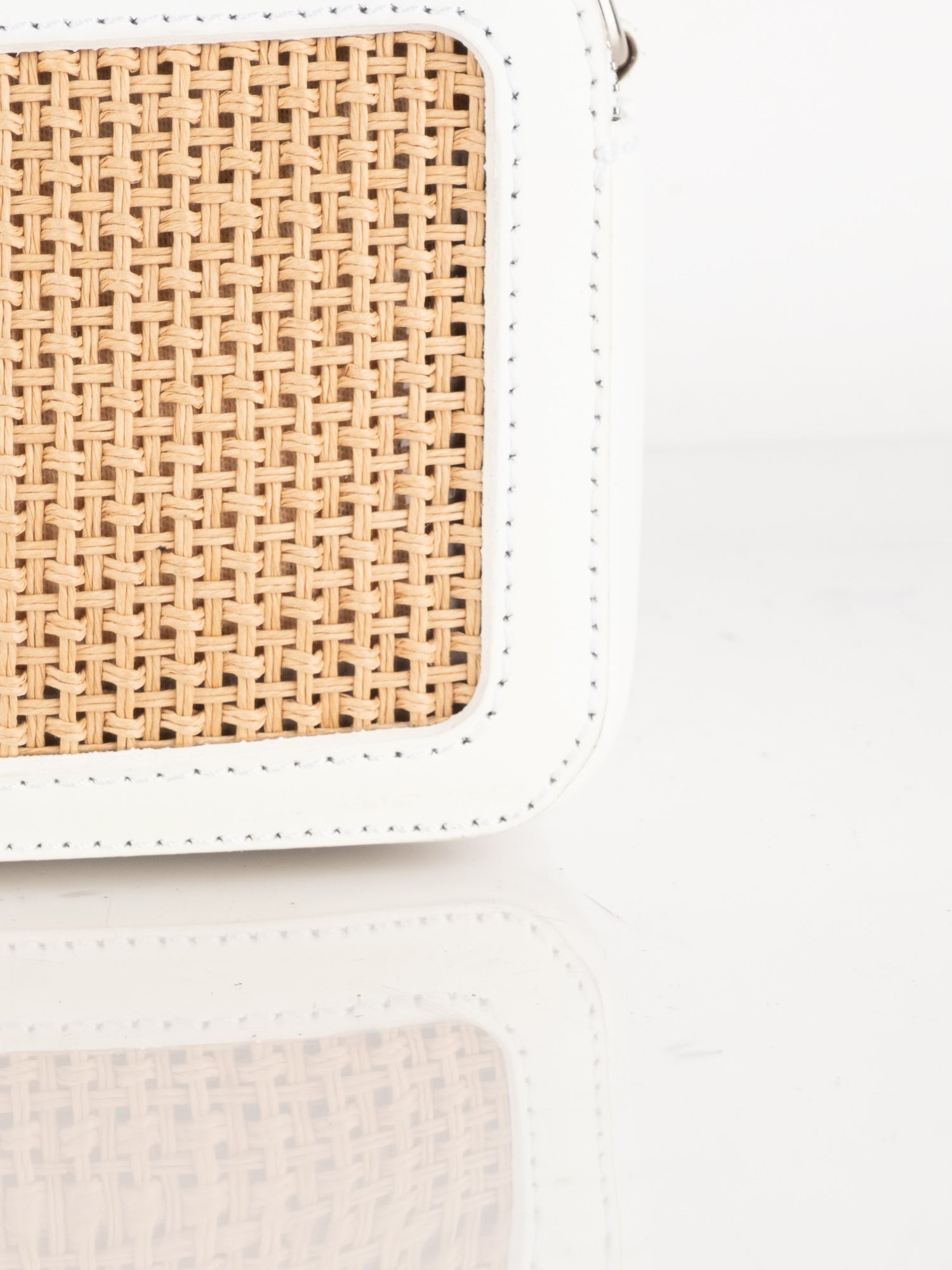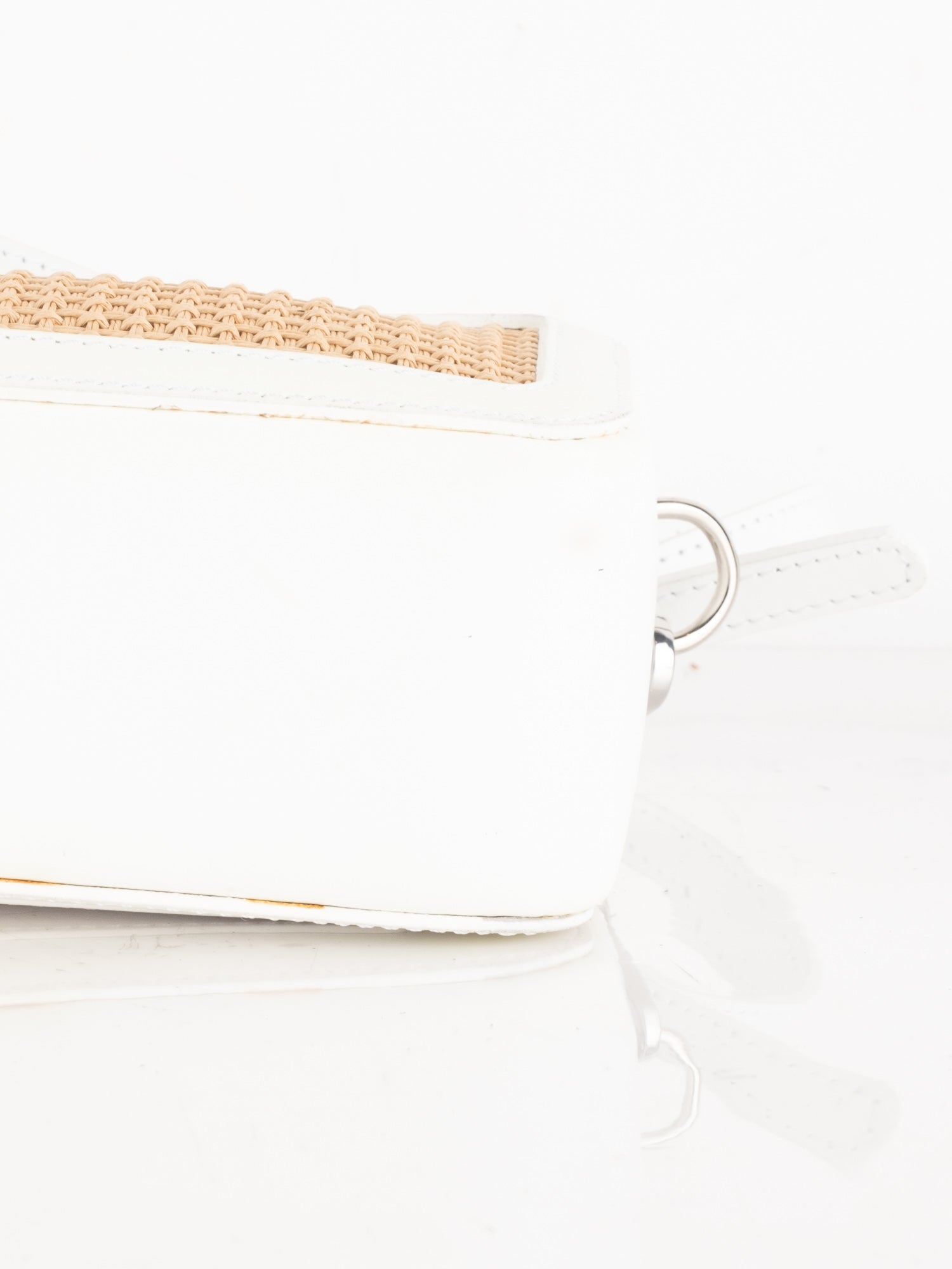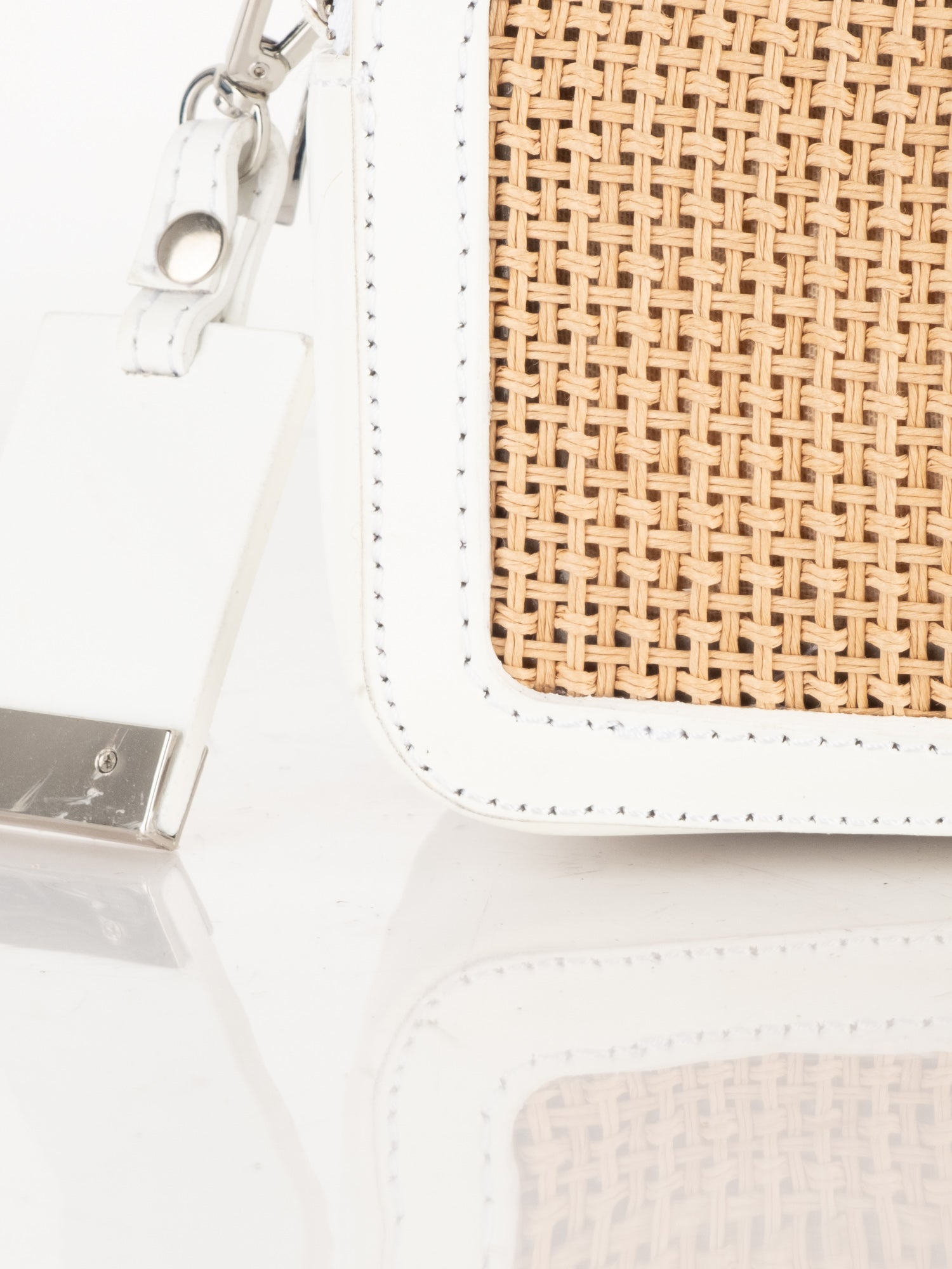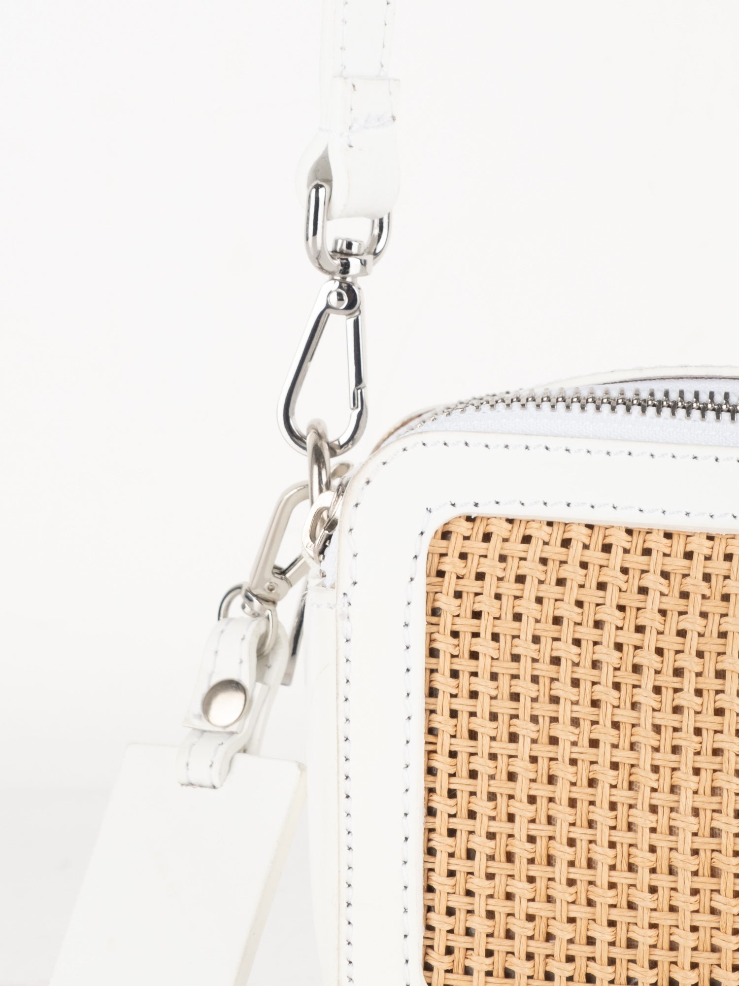 התיק עשוי שילוב של עור לבן (סינתטי) וראטן בחזית, רצועה ארוכה מתכווננת, סגירת רוכסן וגזרה מלבנית קומפקטית.
