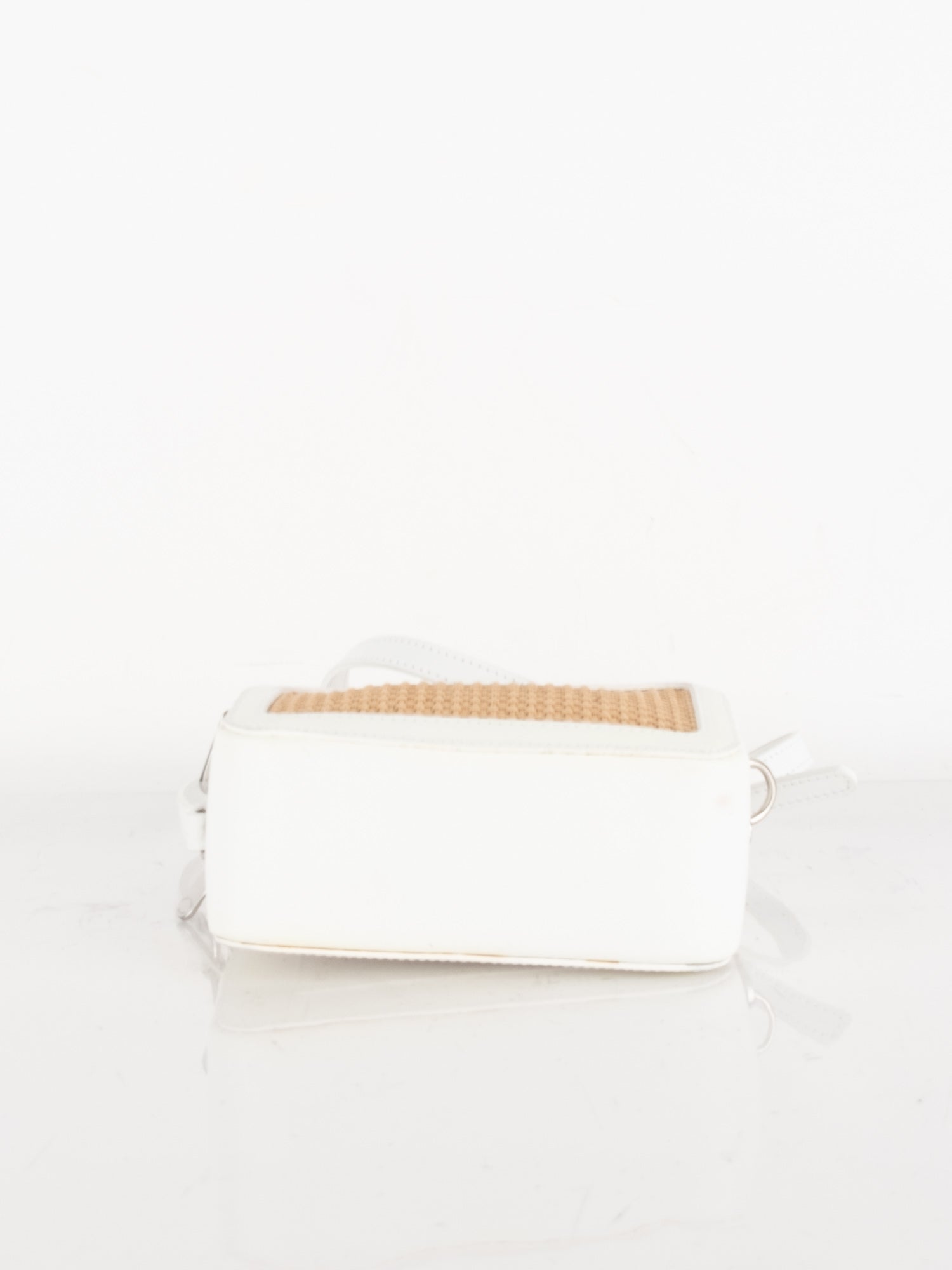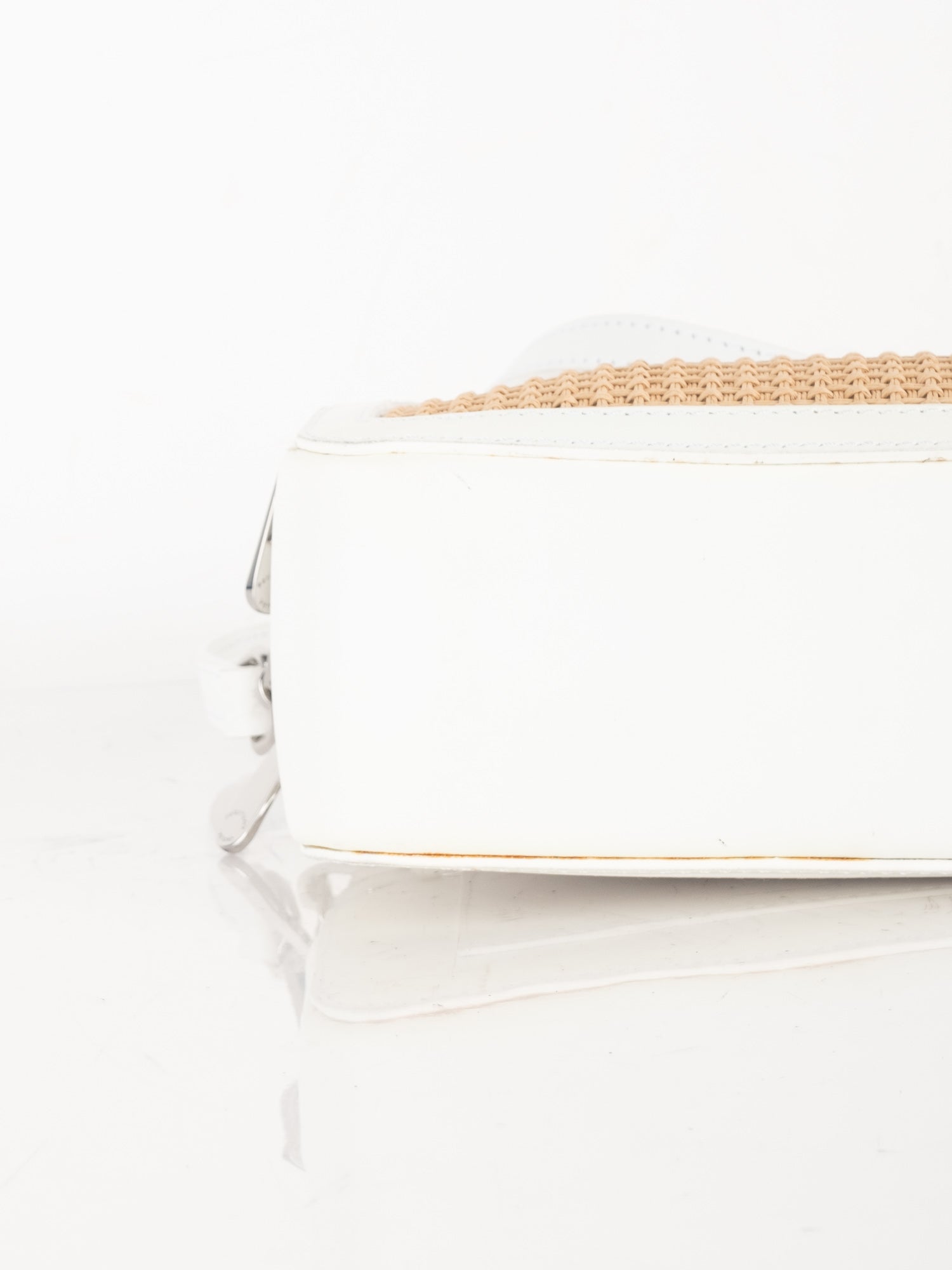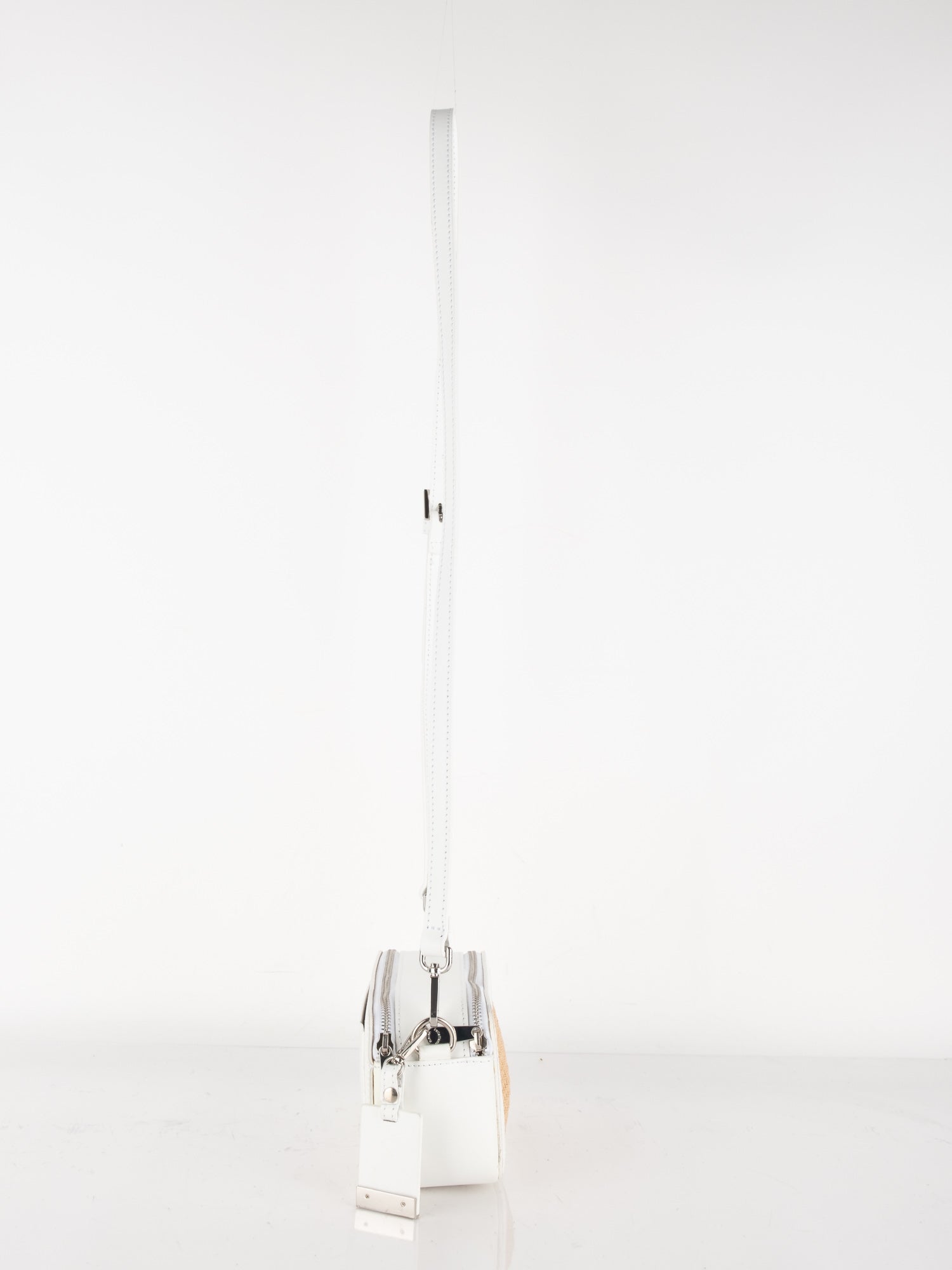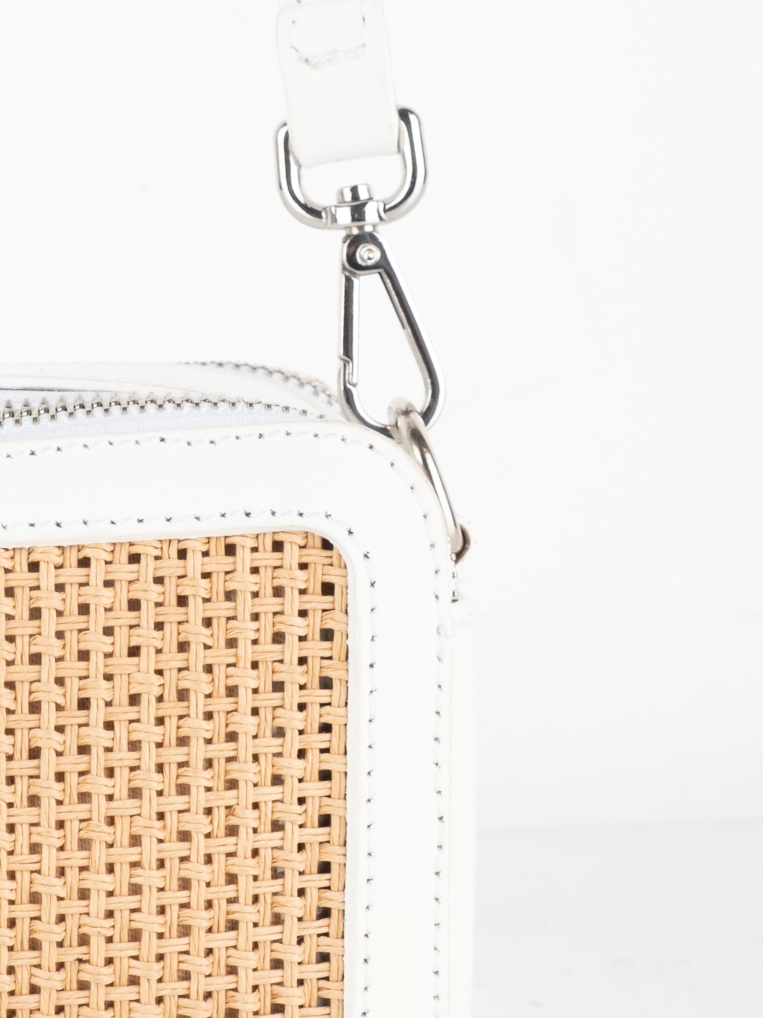 התיק עשוי שילוב של עור לבן (סינתטי) וראטן בחזית, רצועה ארוכה מתכווננת, סגירת רוכסן וגזרה מלבנית קומפקטית.