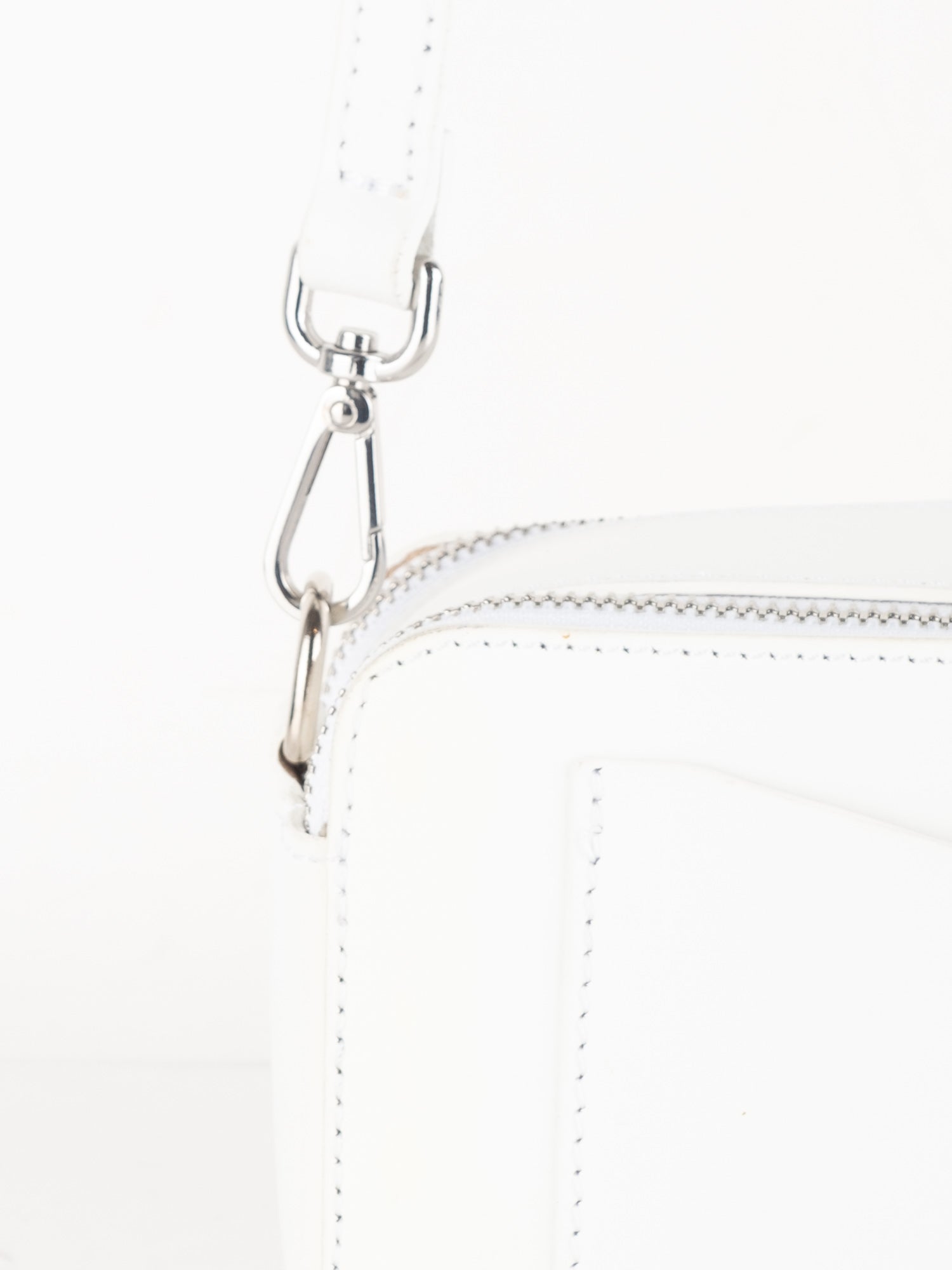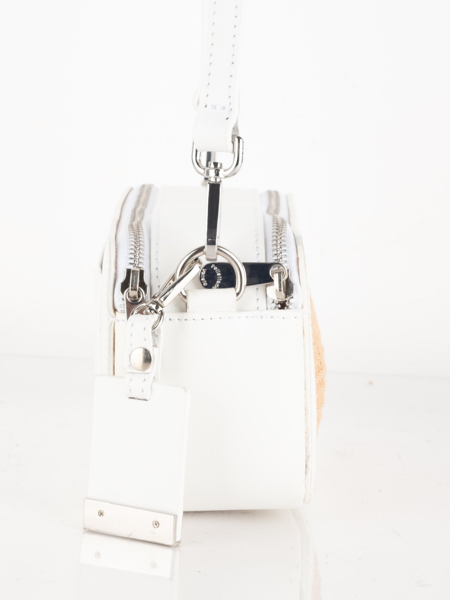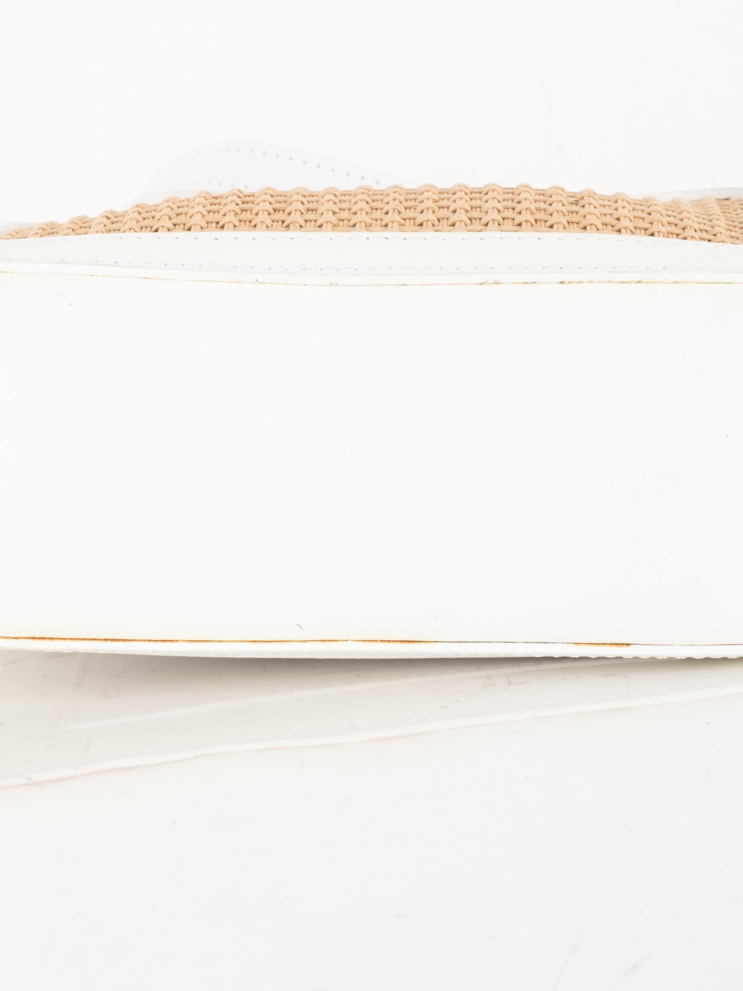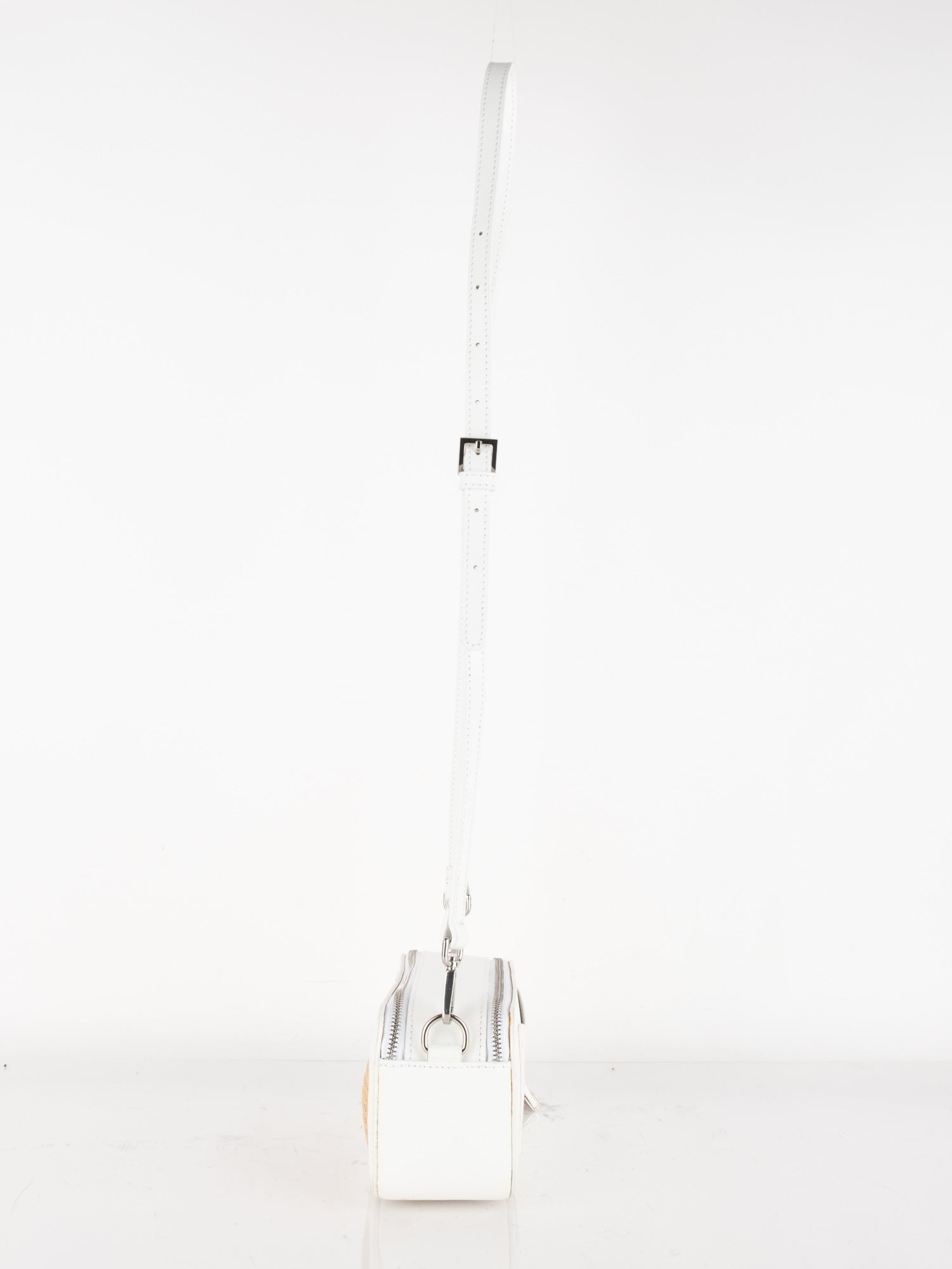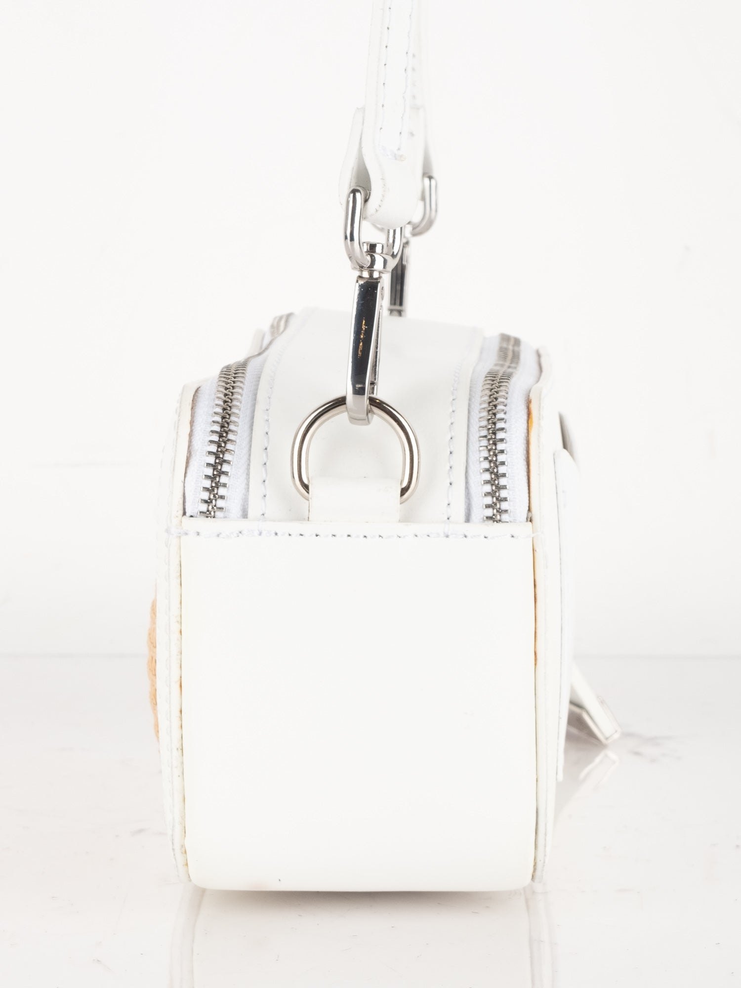 התיק עשוי שילוב של עור לבן (סינתטי) וראטן בחזית, רצועה ארוכה מתכווננת, סגירת רוכסן וגזרה מלבנית קומפקטית.