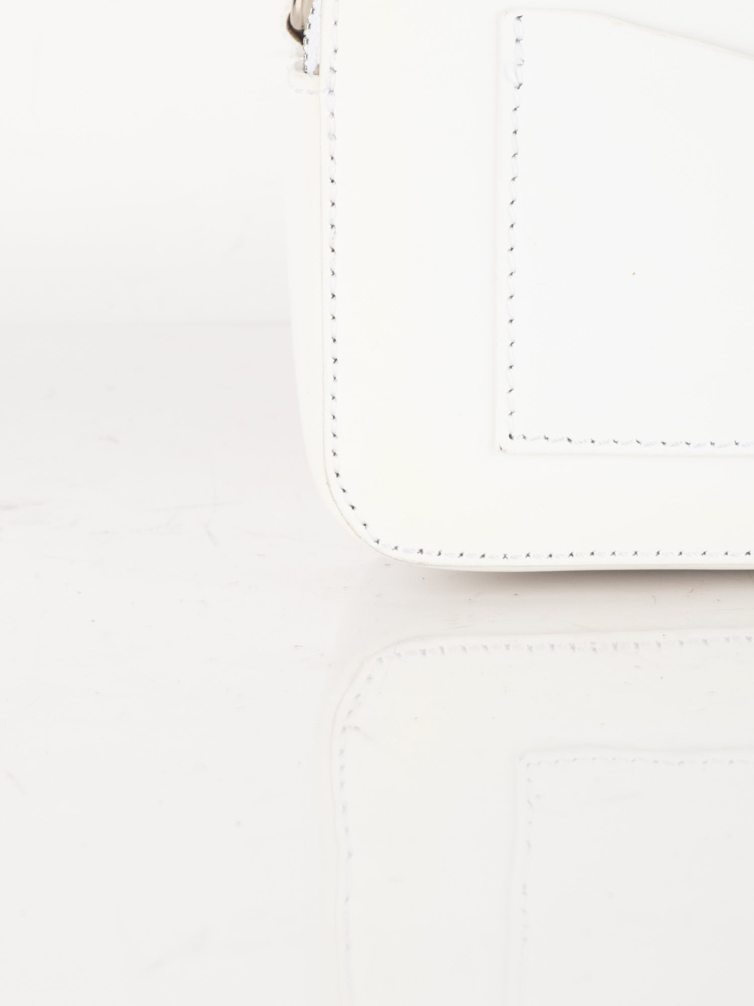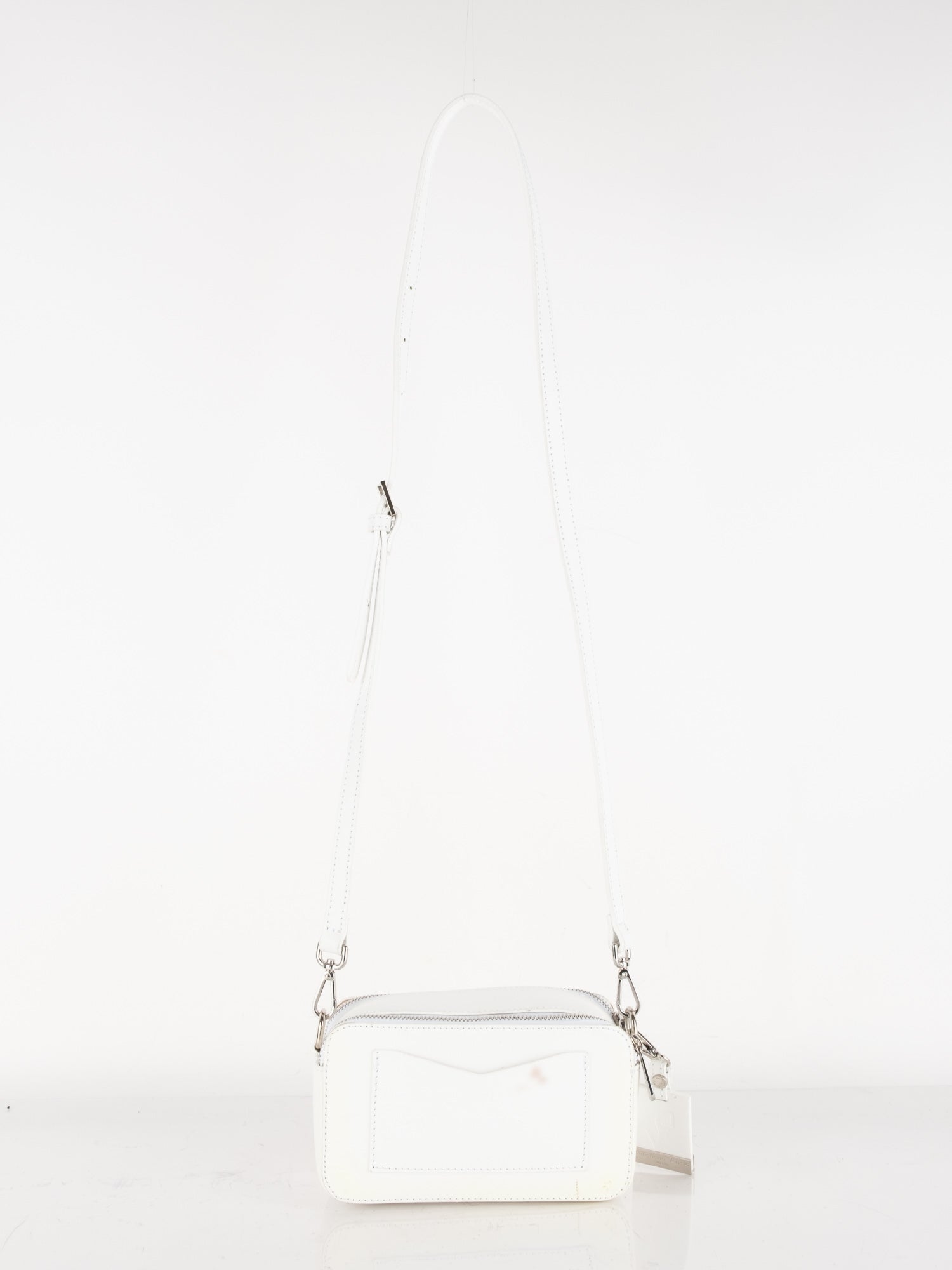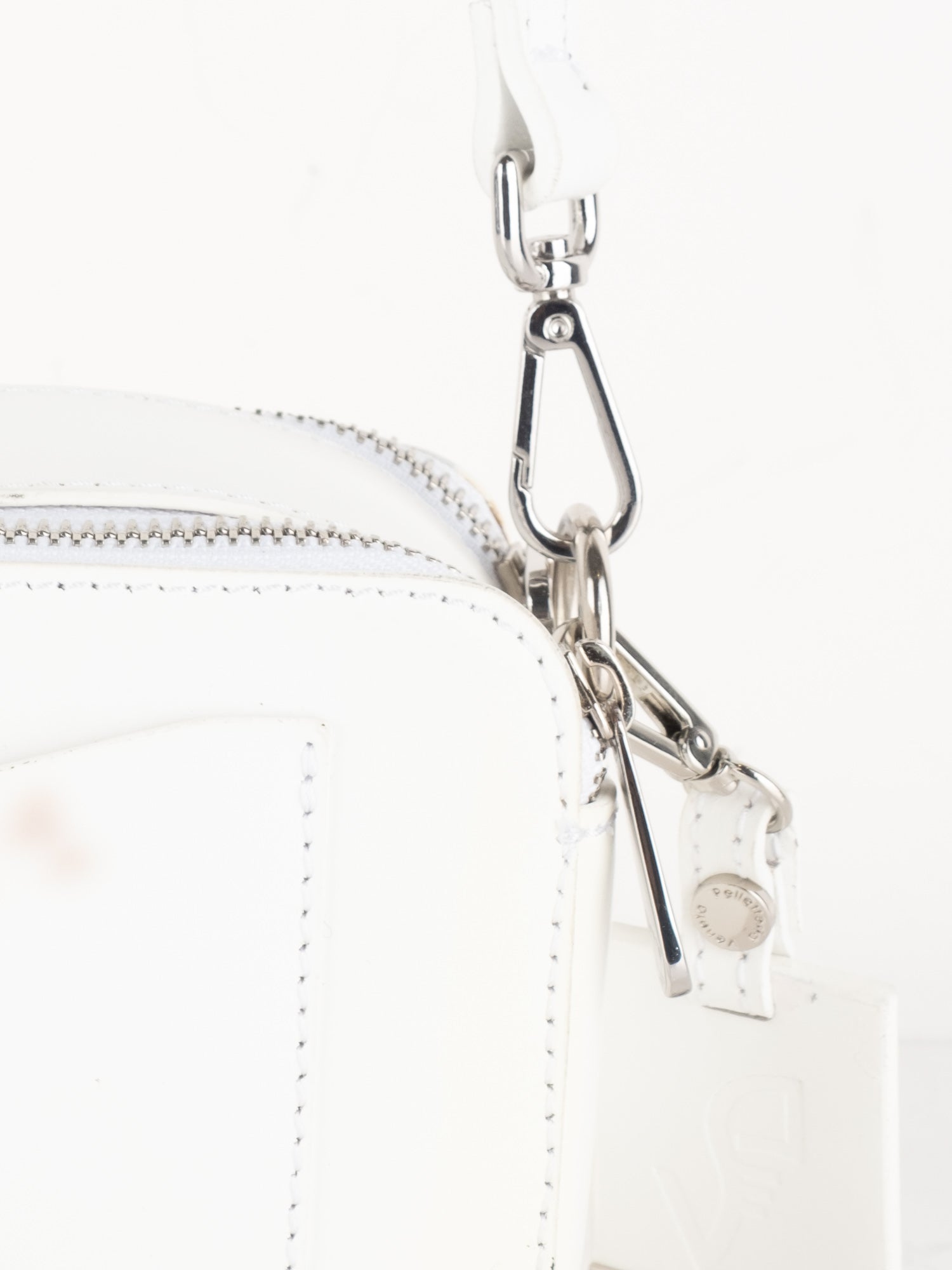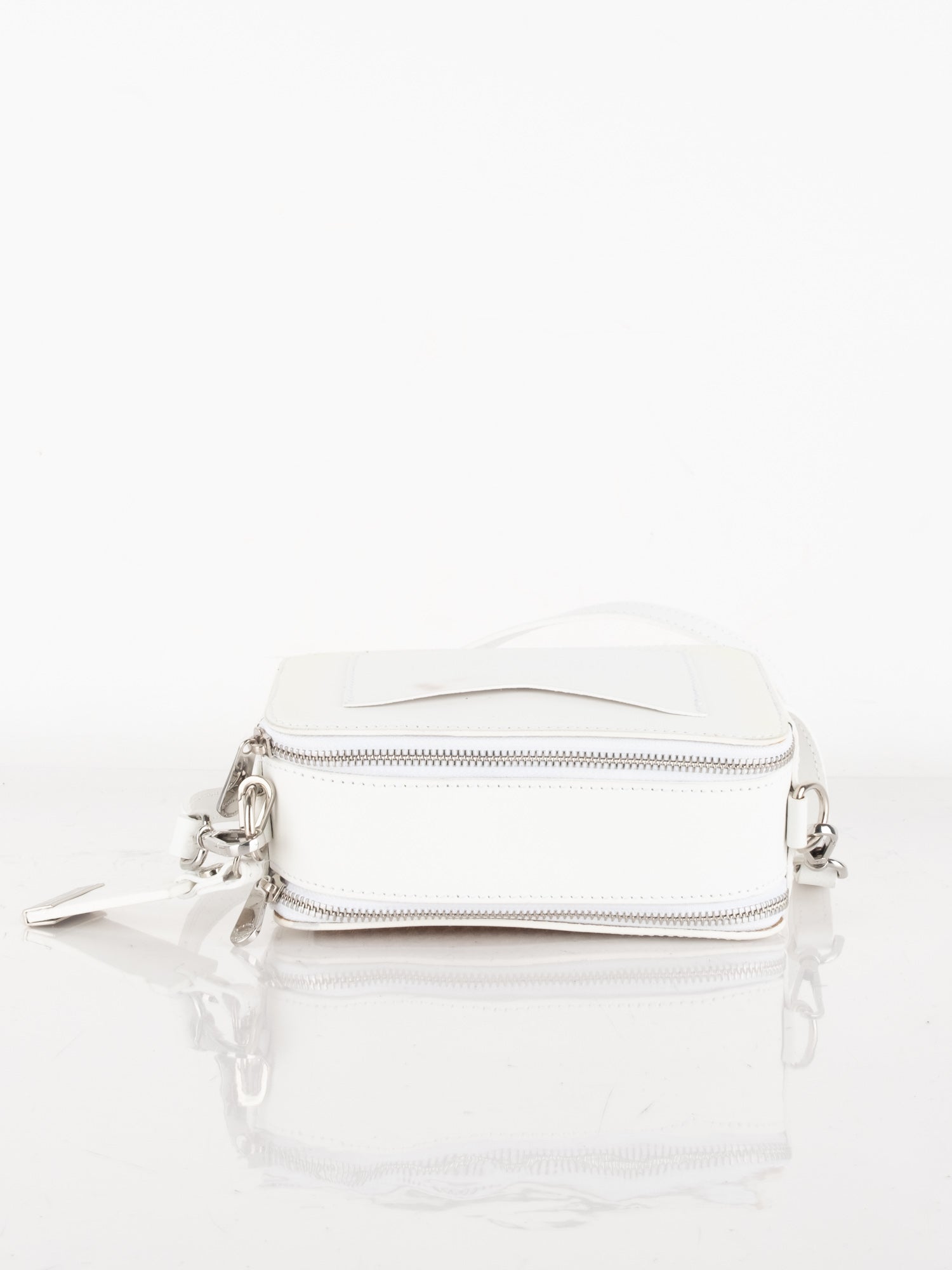 התיק עשוי שילוב של עור לבן (סינתטי) וראטן בחזית, רצועה ארוכה מתכווננת, סגירת רוכסן וגזרה מלבנית קומפקטית.