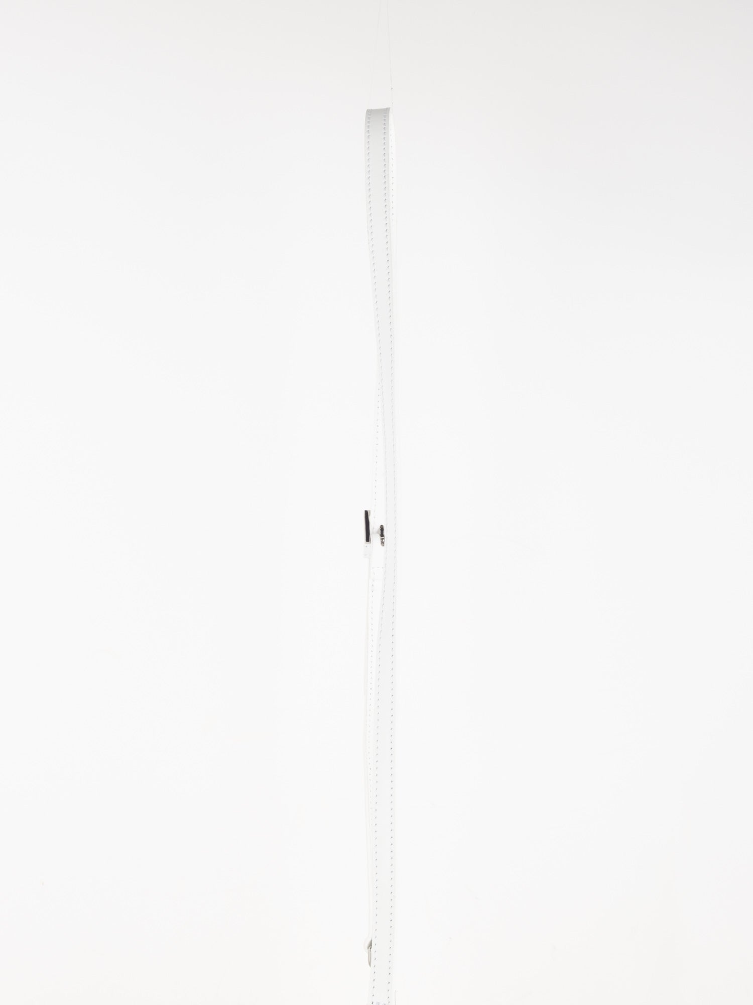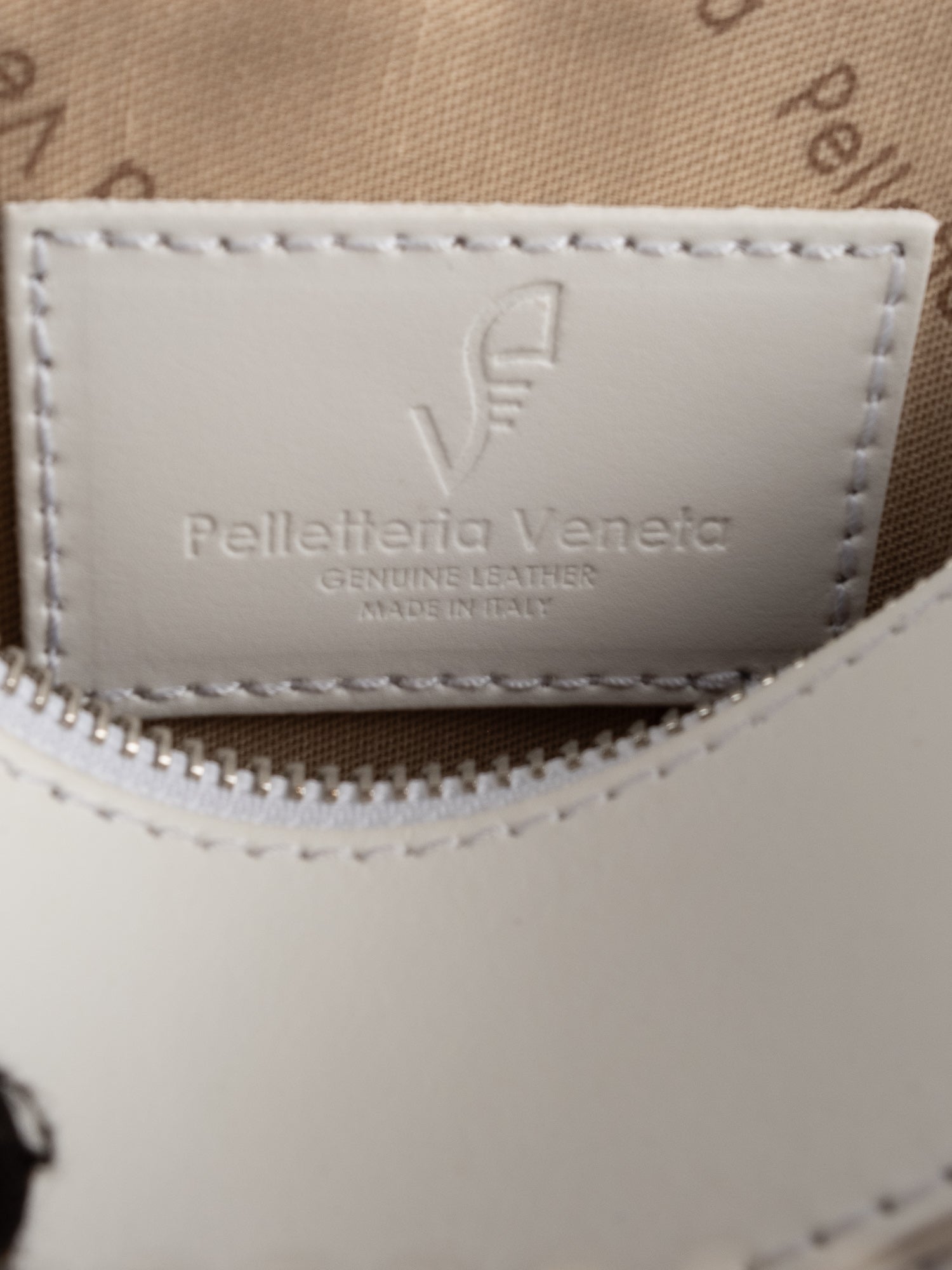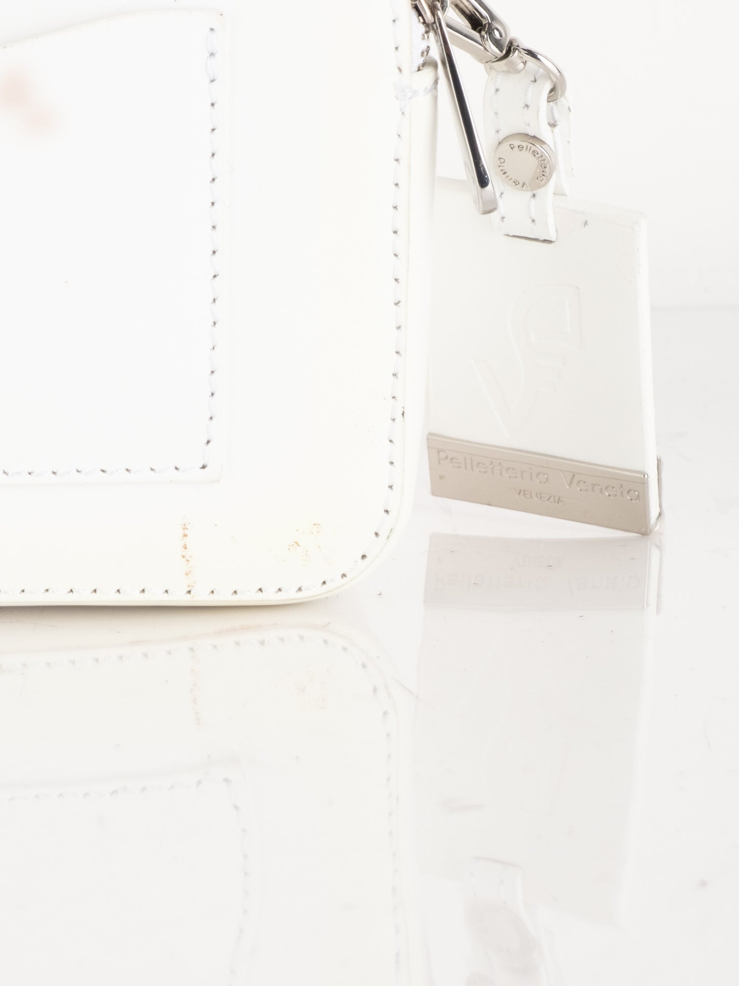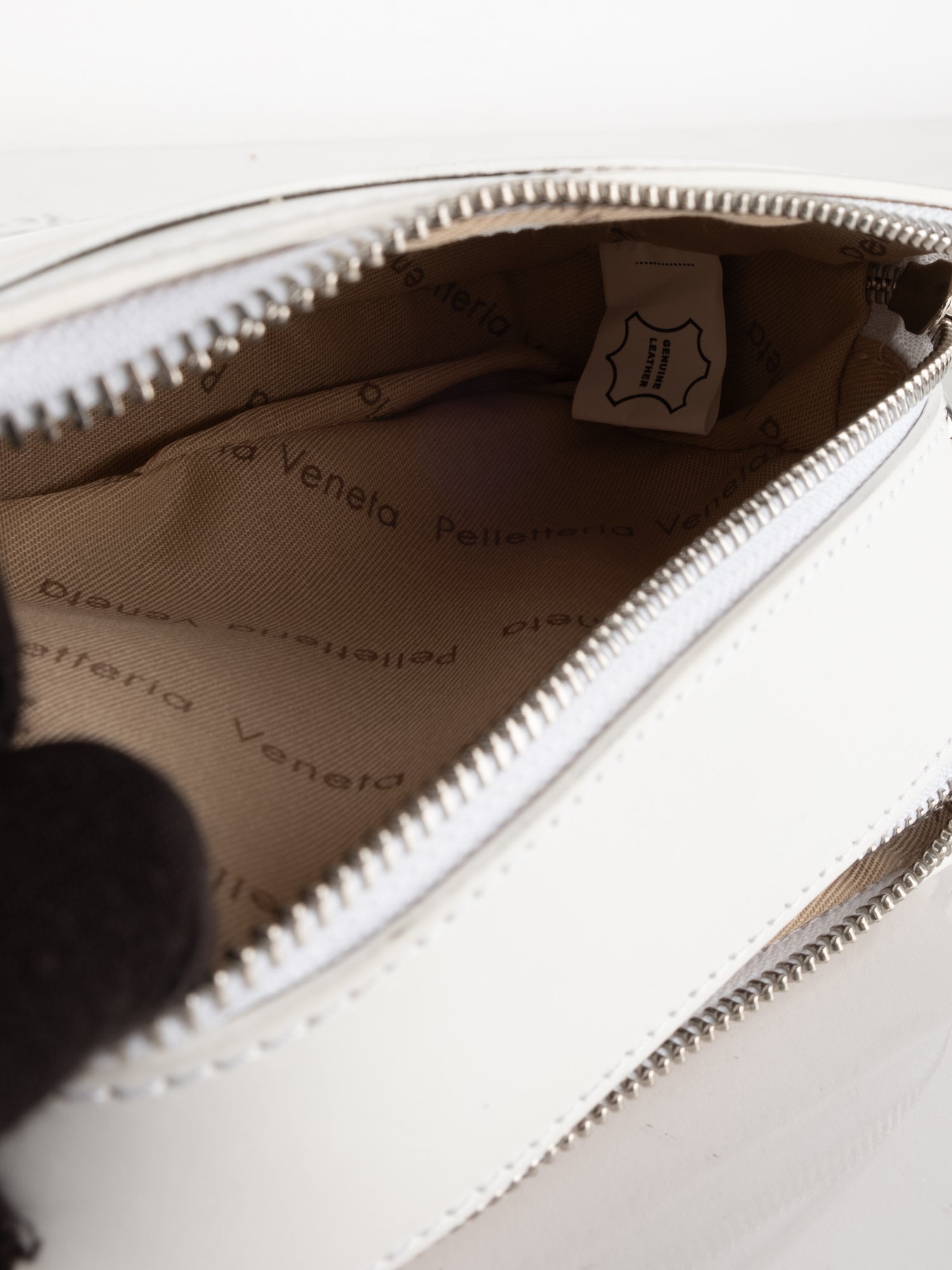 התיק עשוי שילוב של עור לבן (סינתטי) וראטן בחזית, רצועה ארוכה מתכווננת, סגירת רוכסן וגזרה מלבנית קומפקטית.