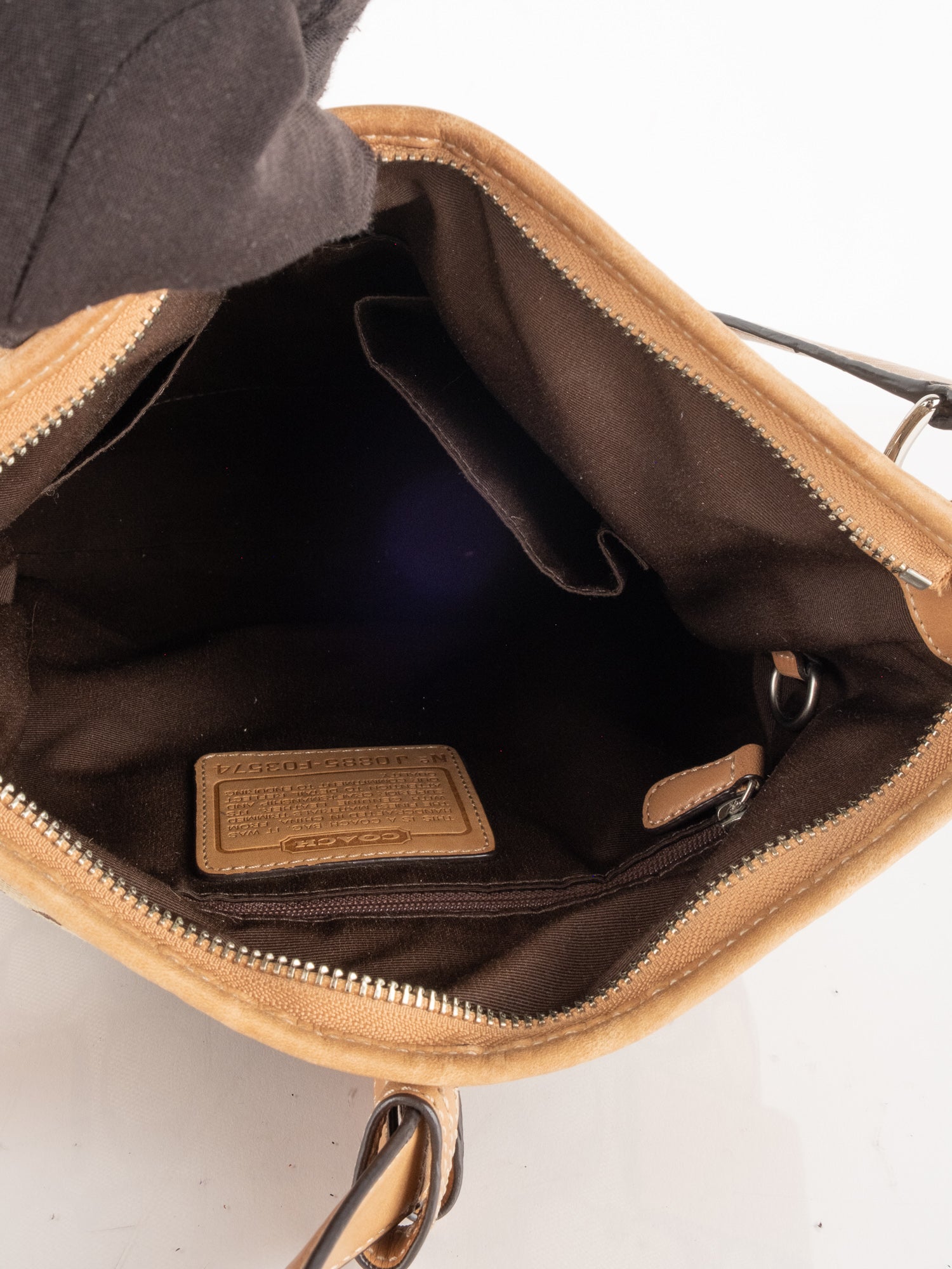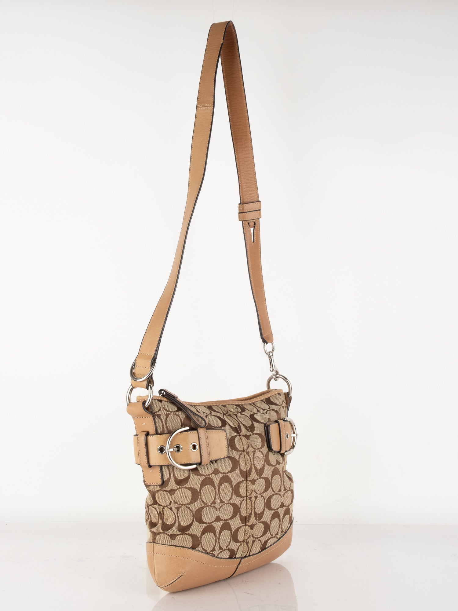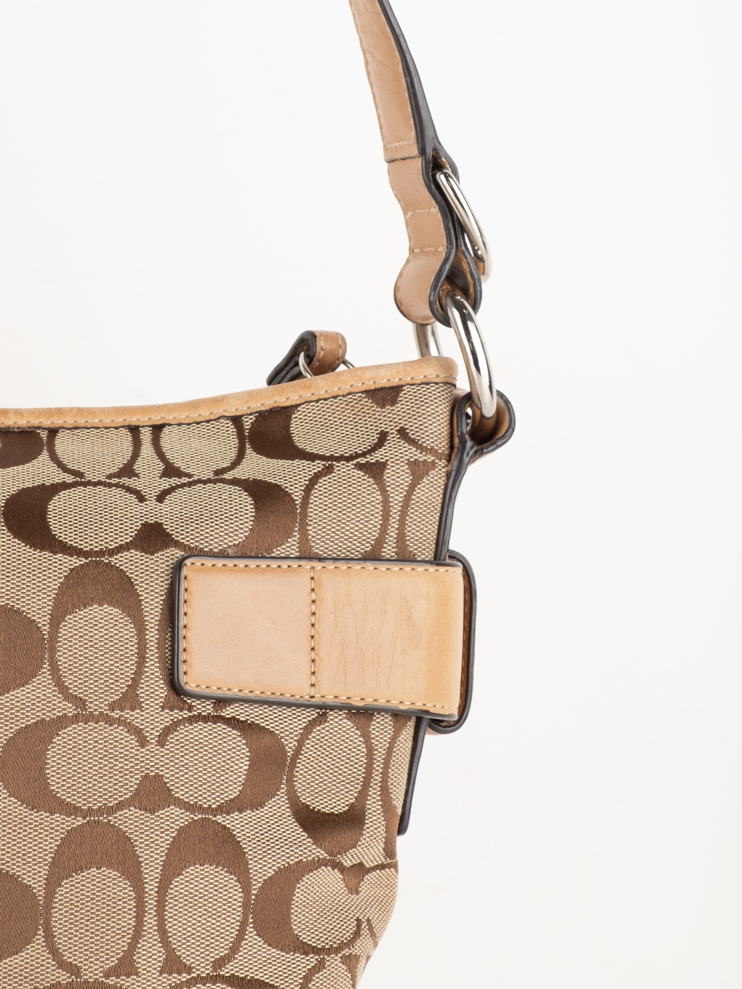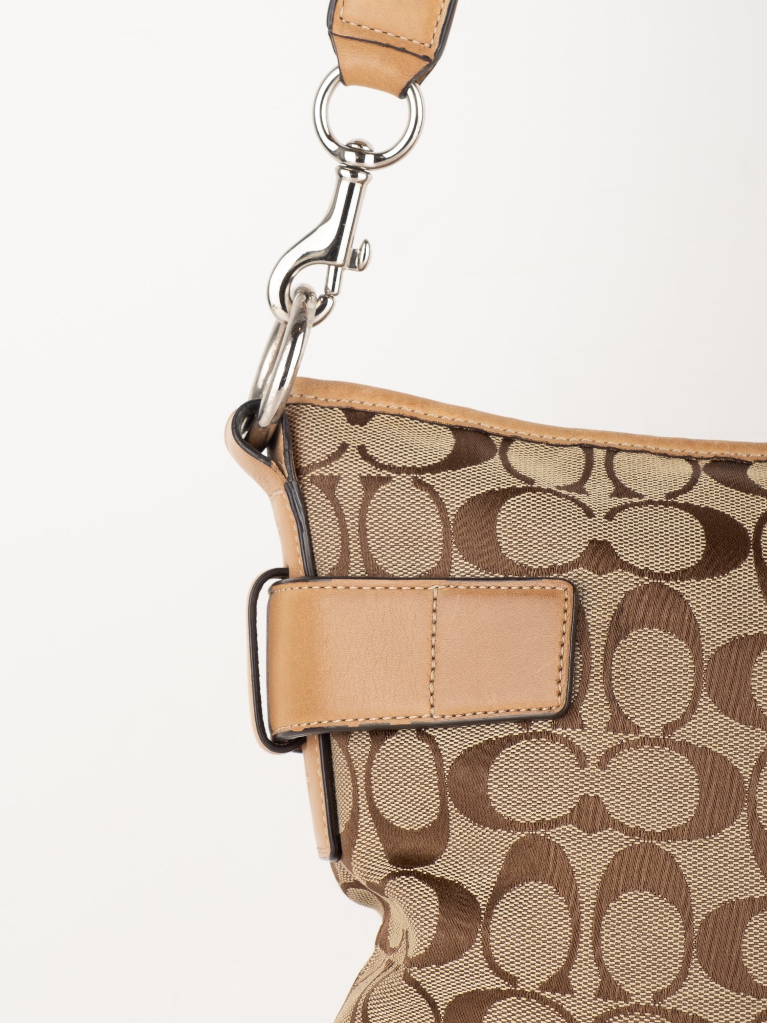 View Similar Productsתיק קואץ' COACH וינטג׳ יד שנייה בעיצוב קלאסי ומדויק, בדגם Signature Canvas בגווני בז׳-חום עם רצועת כתף מתכווננת ועיטורי אבזמים בצדדים. זהו דגם שהופך כל לוק למוקפד ורך, שילוב של פרקטיות יומיומית עם מראה אלגנטי ונקי. מבנהו האנכי יוצר מראה מחמיא על הגוף ומתאים בדיוק ליציאות, סידורים ויום־יום קליל.