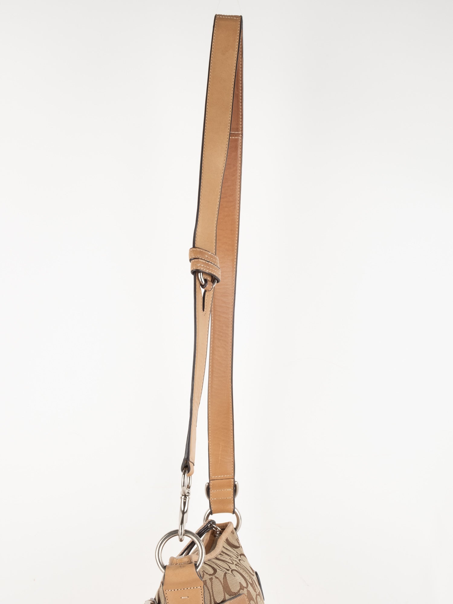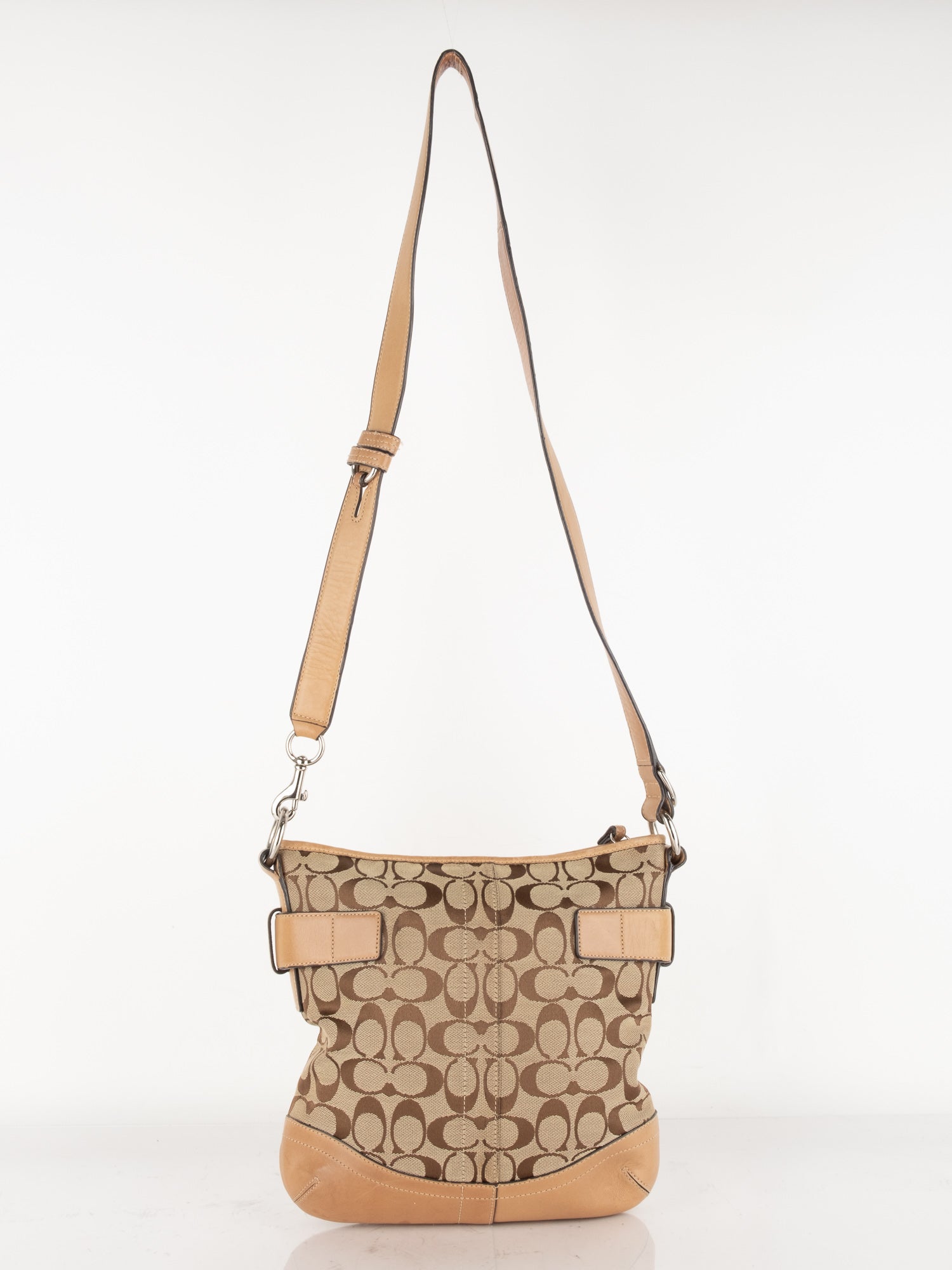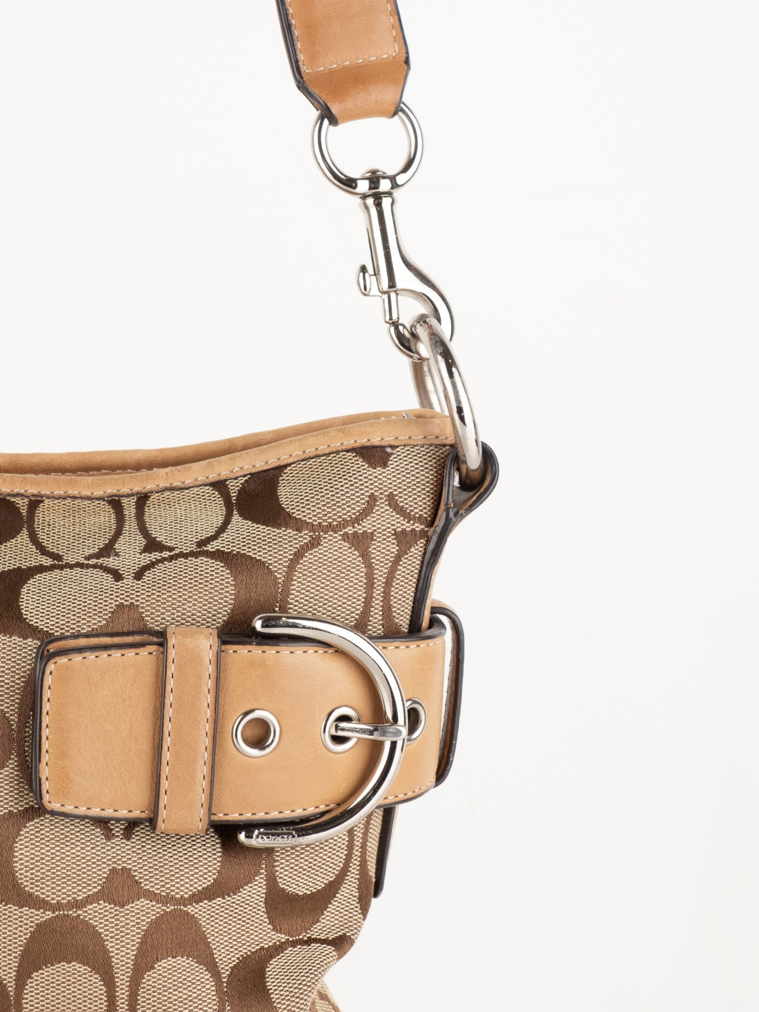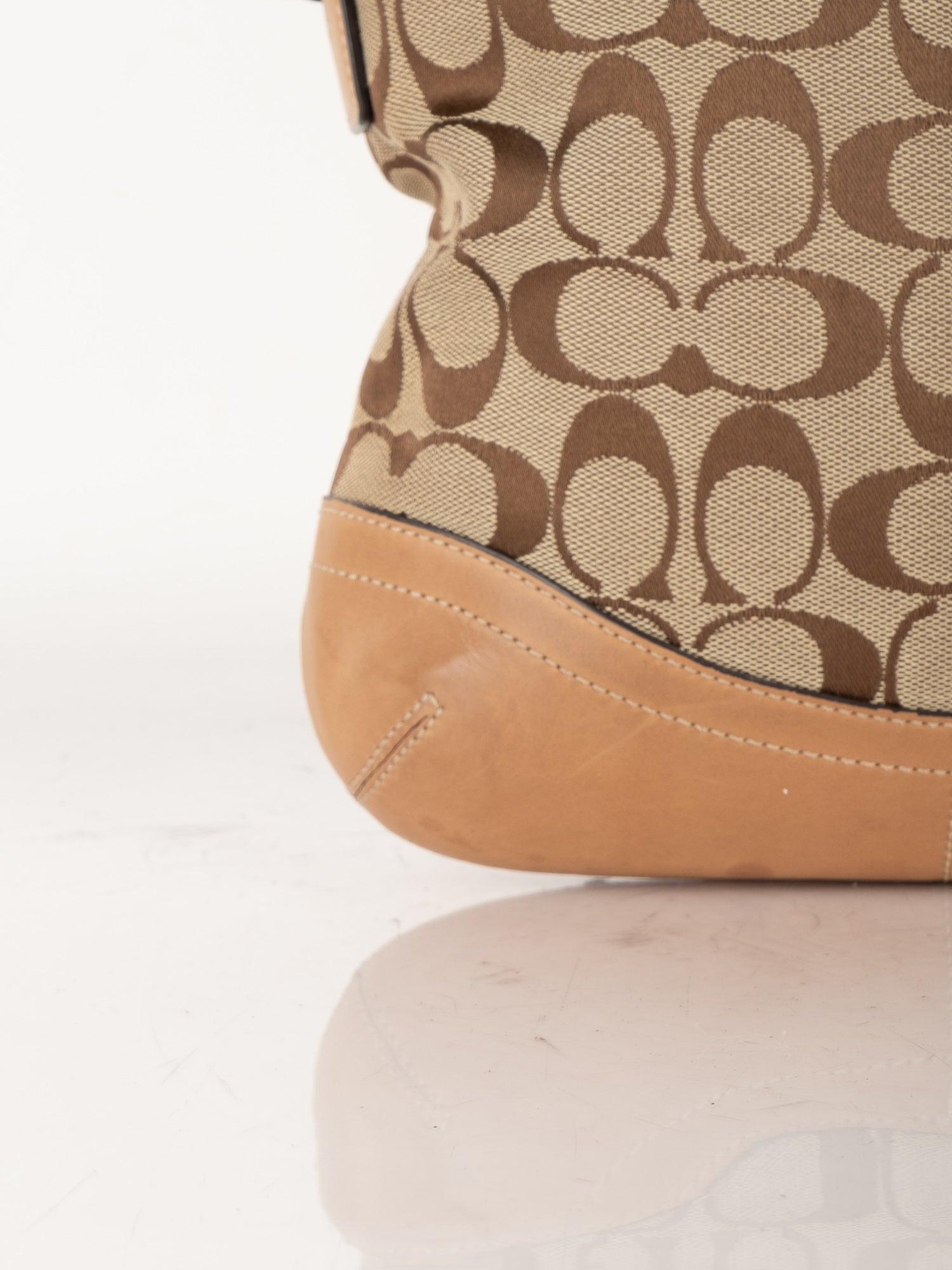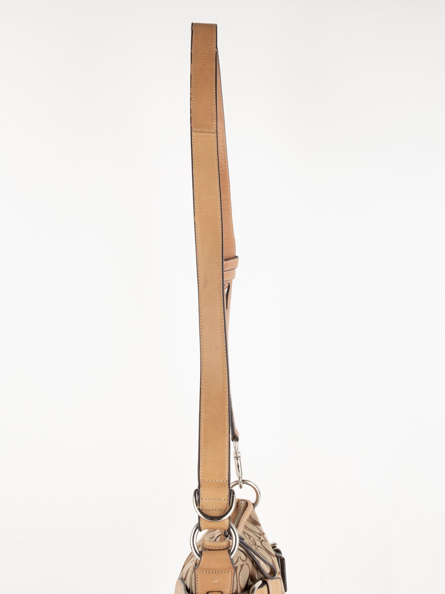 View Similar Productsתיק קואץ' COACH וינטג׳ יד שנייה בעיצוב קלאסי ומדויק, בדגם Signature Canvas בגווני בז׳-חום עם רצועת כתף מתכווננת ועיטורי אבזמים בצדדים. זהו דגם שהופך כל לוק למוקפד ורך, שילוב של פרקטיות יומיומית עם מראה אלגנטי ונקי. מבנהו האנכי יוצר מראה מחמיא על הגוף ומתאים בדיוק ליציאות, סידורים ויום־יום קליל.