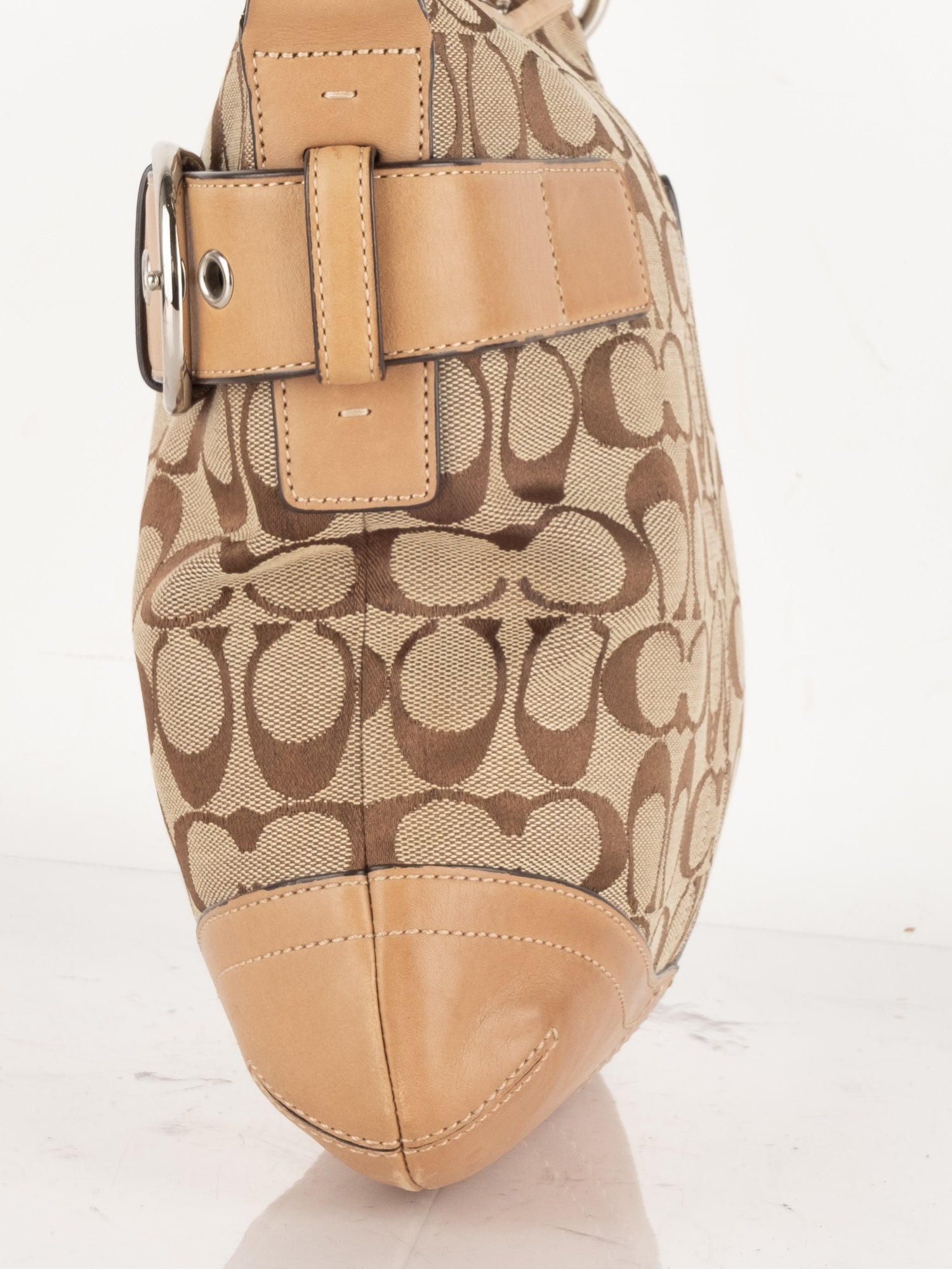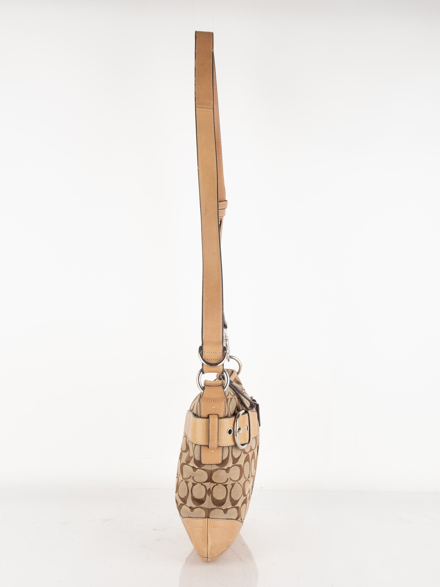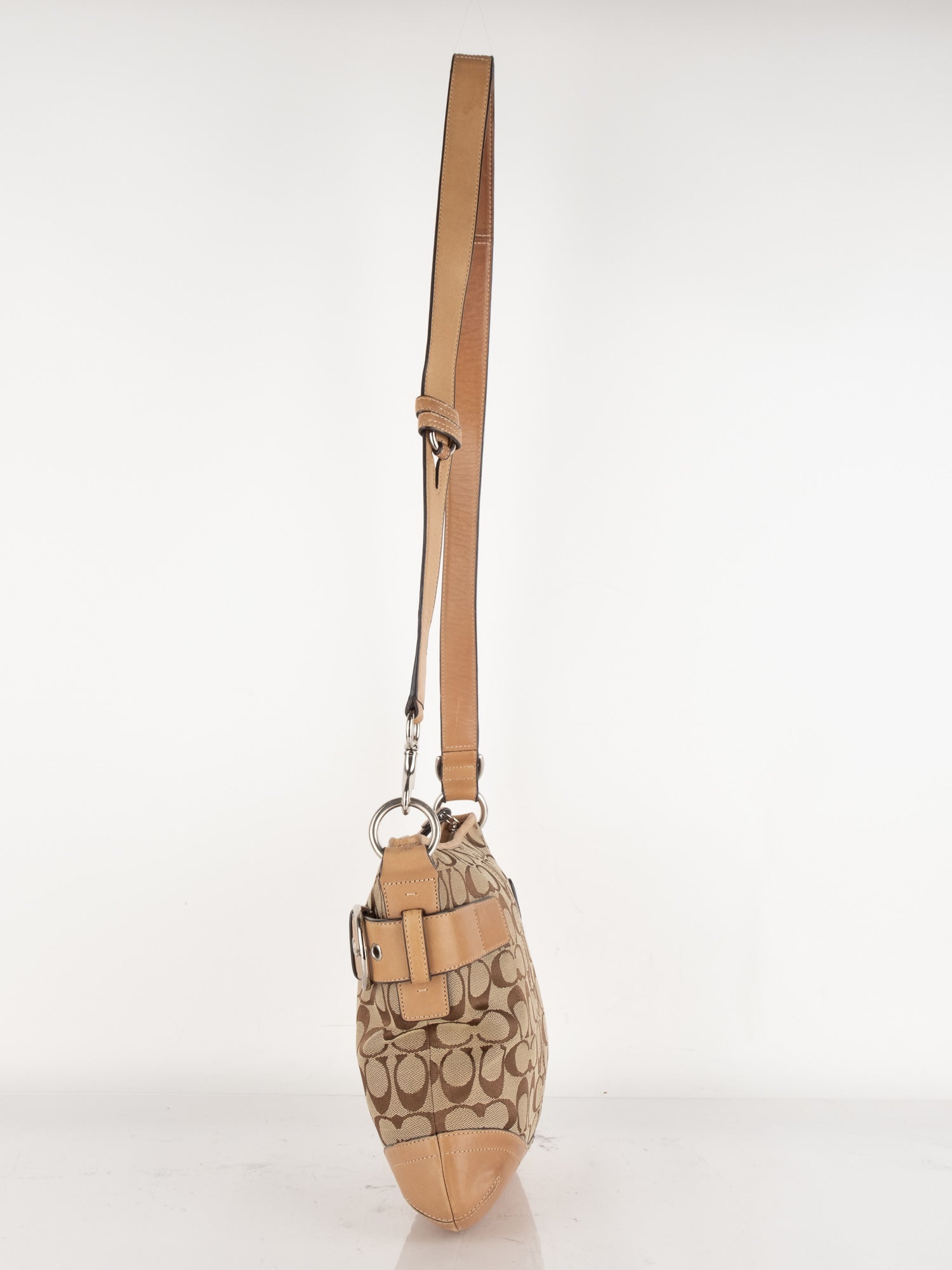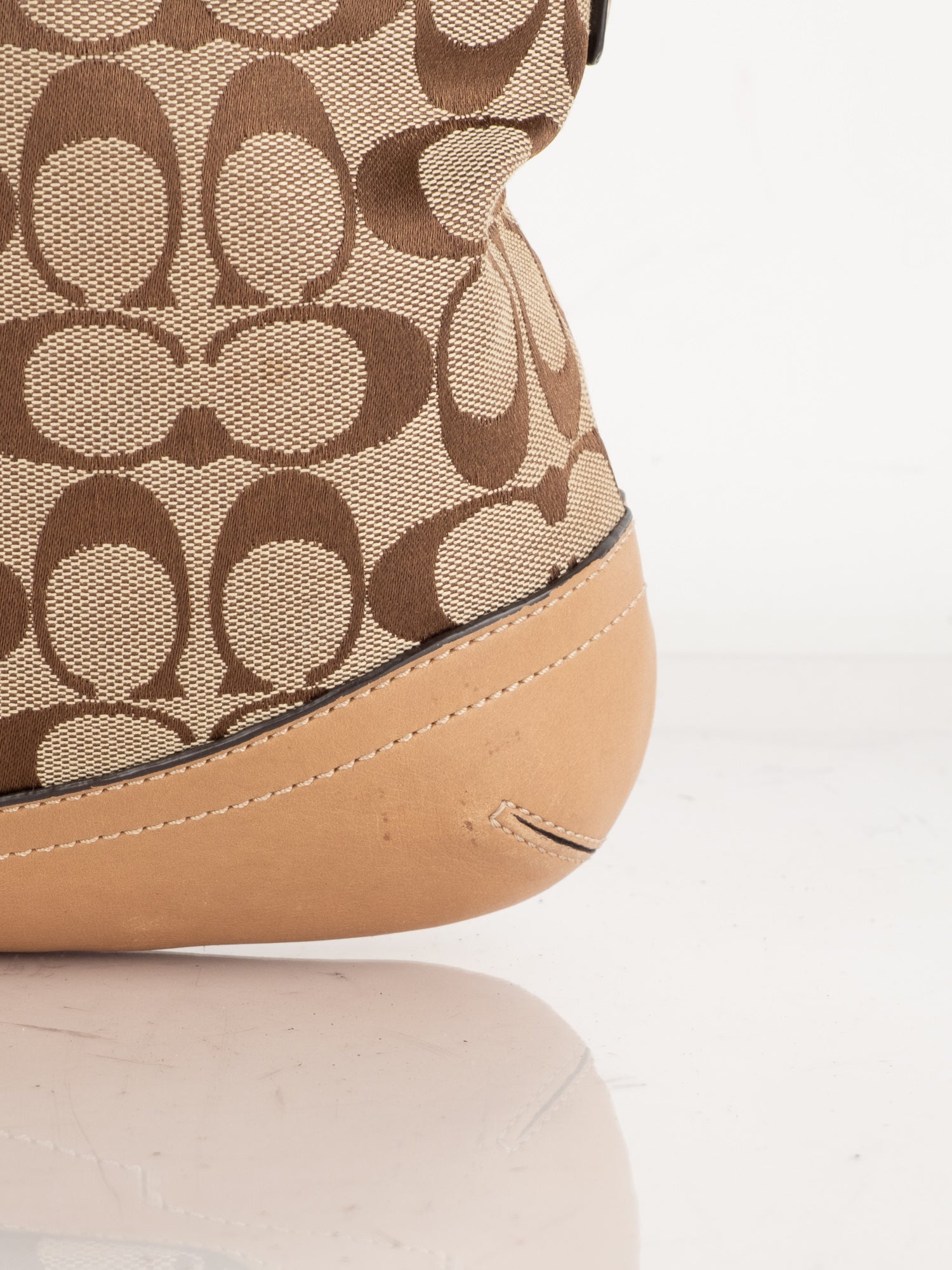 View Similar Productsתיק קואץ' COACH וינטג׳ יד שנייה בעיצוב קלאסי ומדויק, בדגם Signature Canvas בגווני בז׳-חום עם רצועת כתף מתכווננת ועיטורי אבזמים בצדדים. זהו דגם שהופך כל לוק למוקפד ורך, שילוב של פרקטיות יומיומית עם מראה אלגנטי ונקי. מבנהו האנכי יוצר מראה מחמיא על הגוף ומתאים בדיוק ליציאות, סידורים ויום־יום קליל.