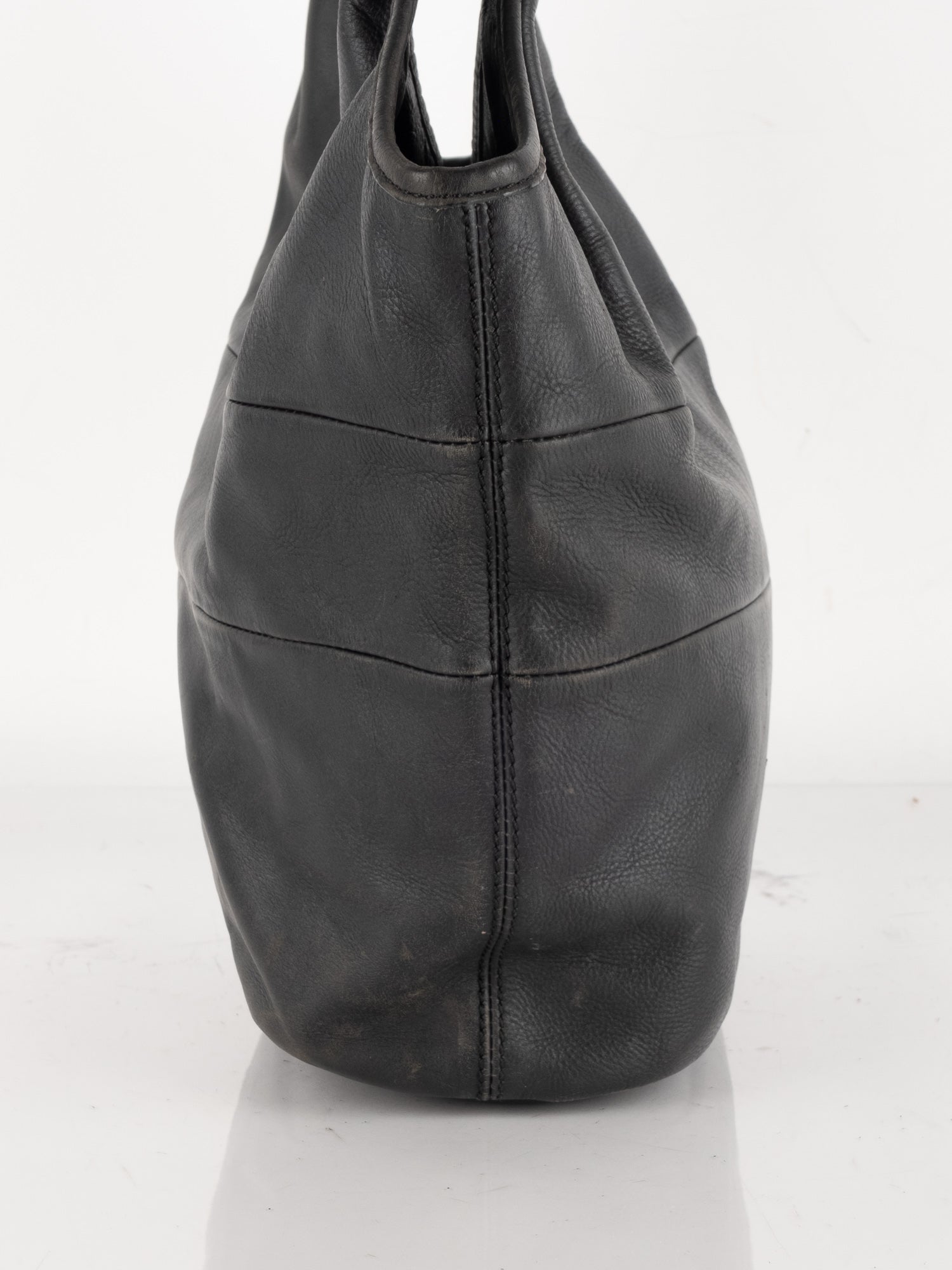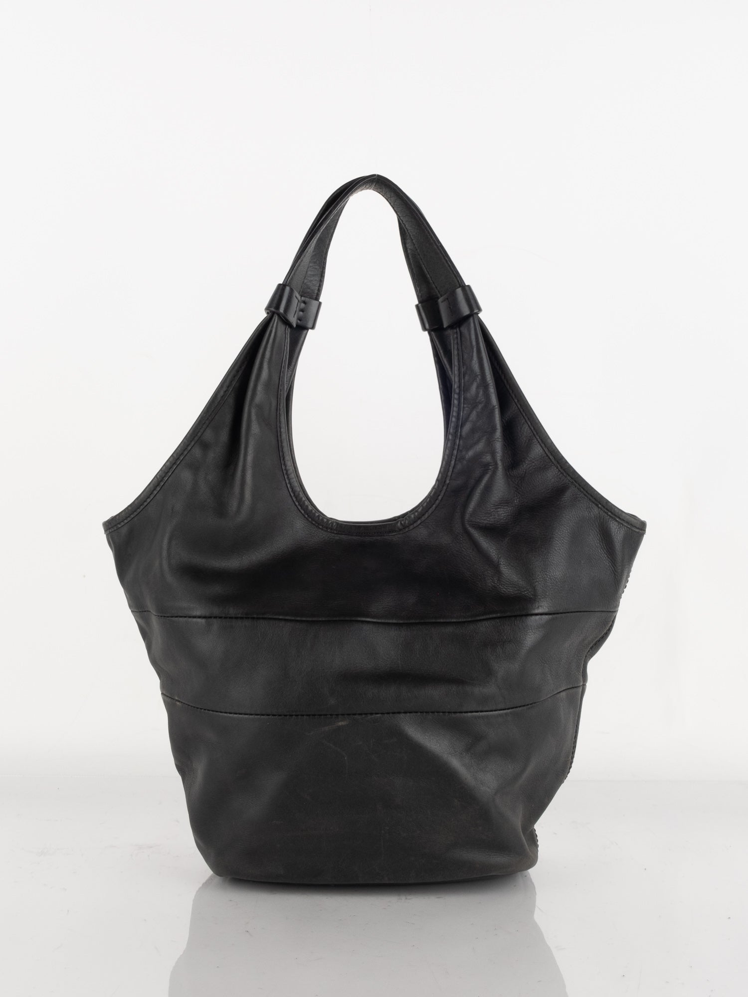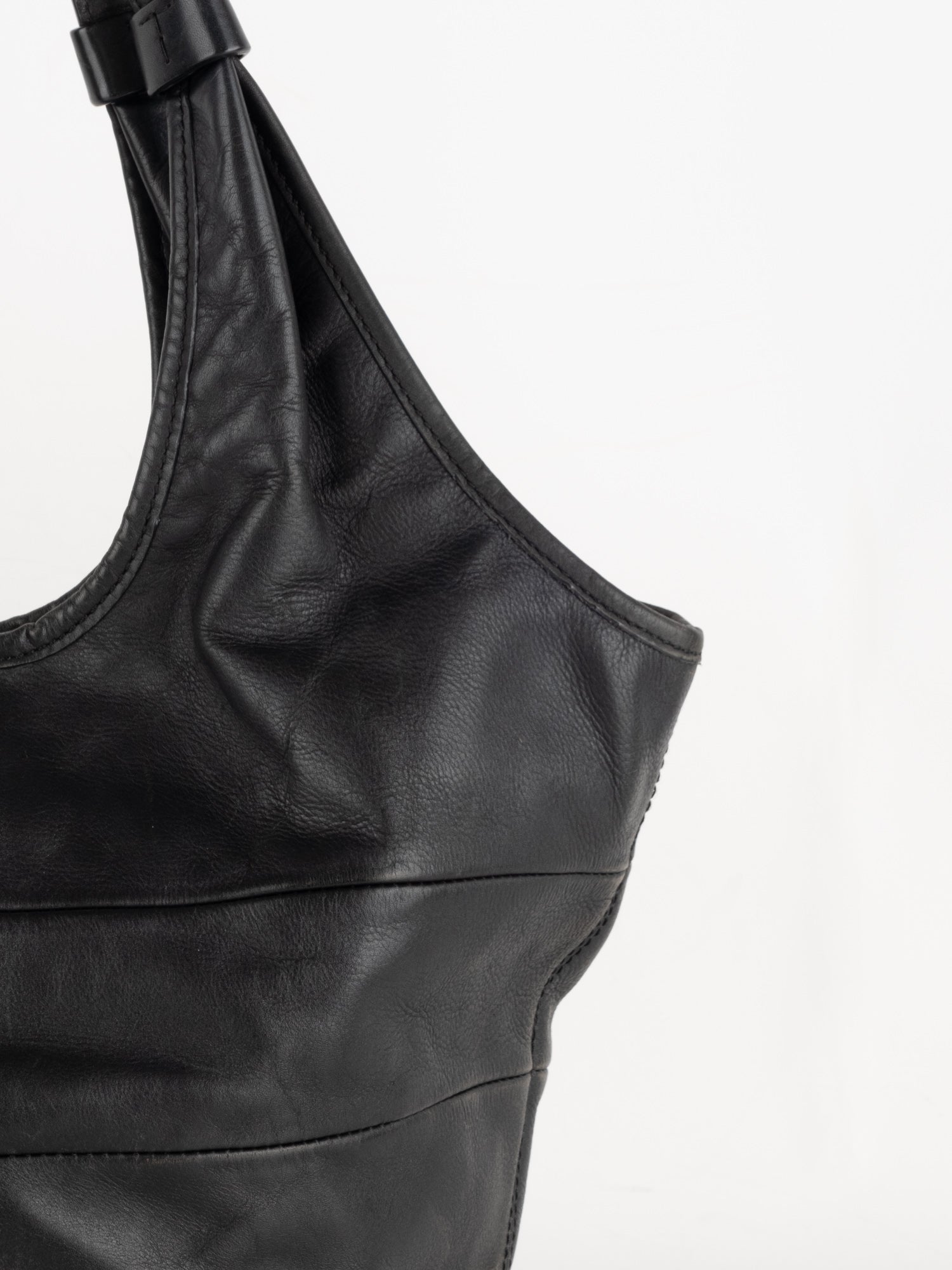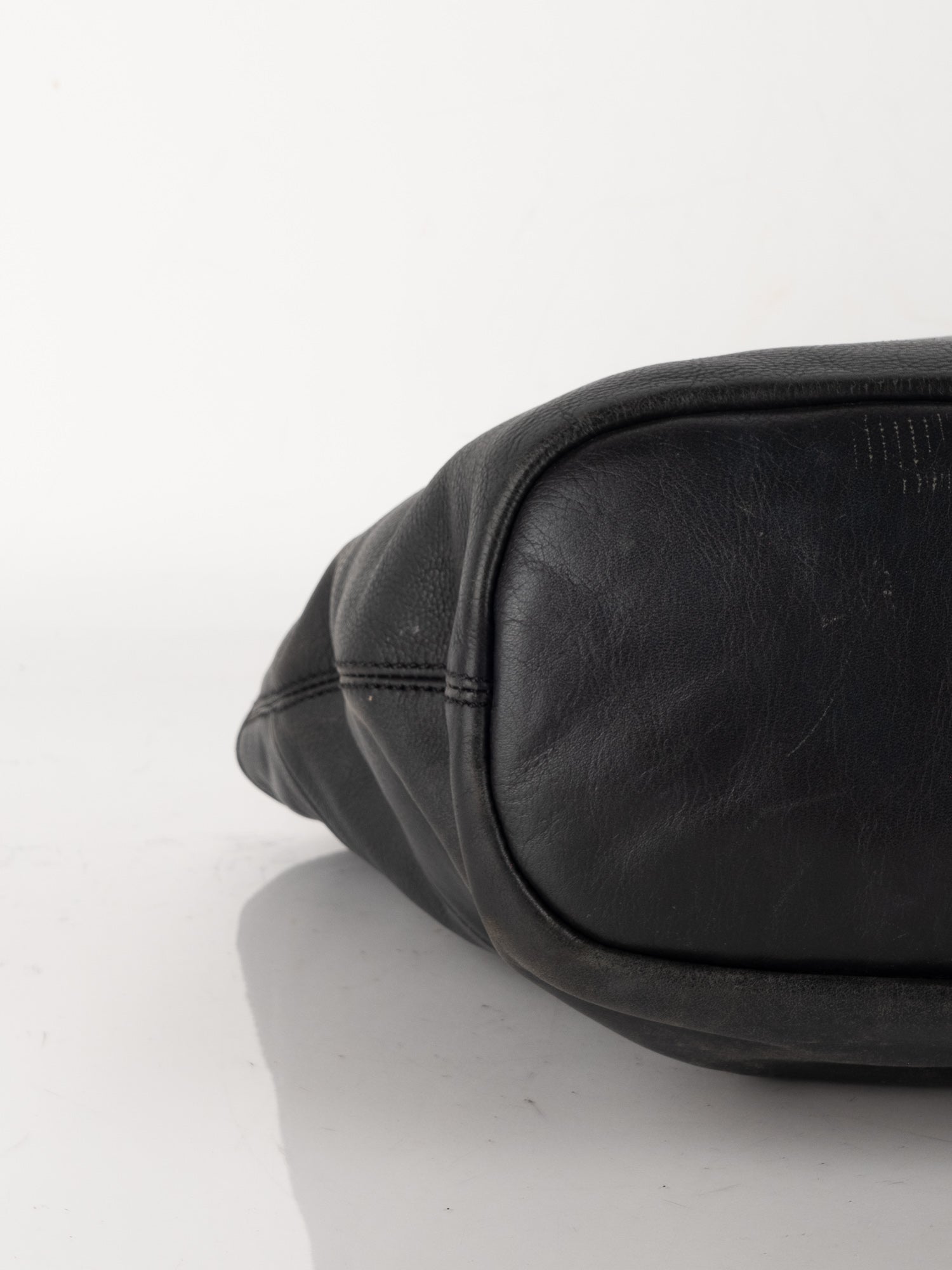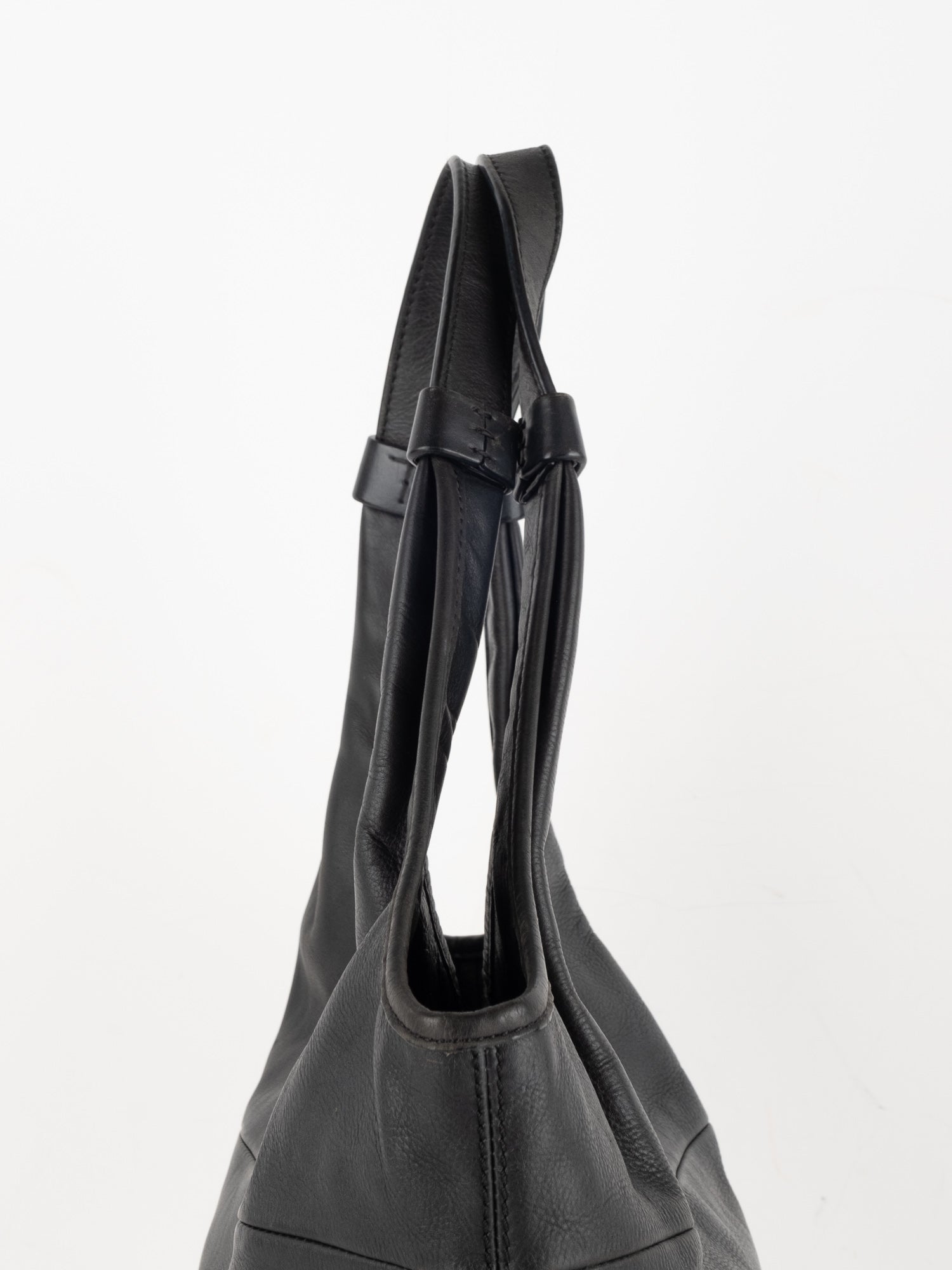 התיק עשוי עור שחור בעל מרקם טבעי ורך. בעל רצועות כפולות לנשיאה על הכתף, גזרה אובו עגולה ומרווחת, וסמל זהוב קטן בחזית. החלק התחתון רחב ויציב, והפרופורציה הכללית מתאימה לתיק יום יומי גדול.