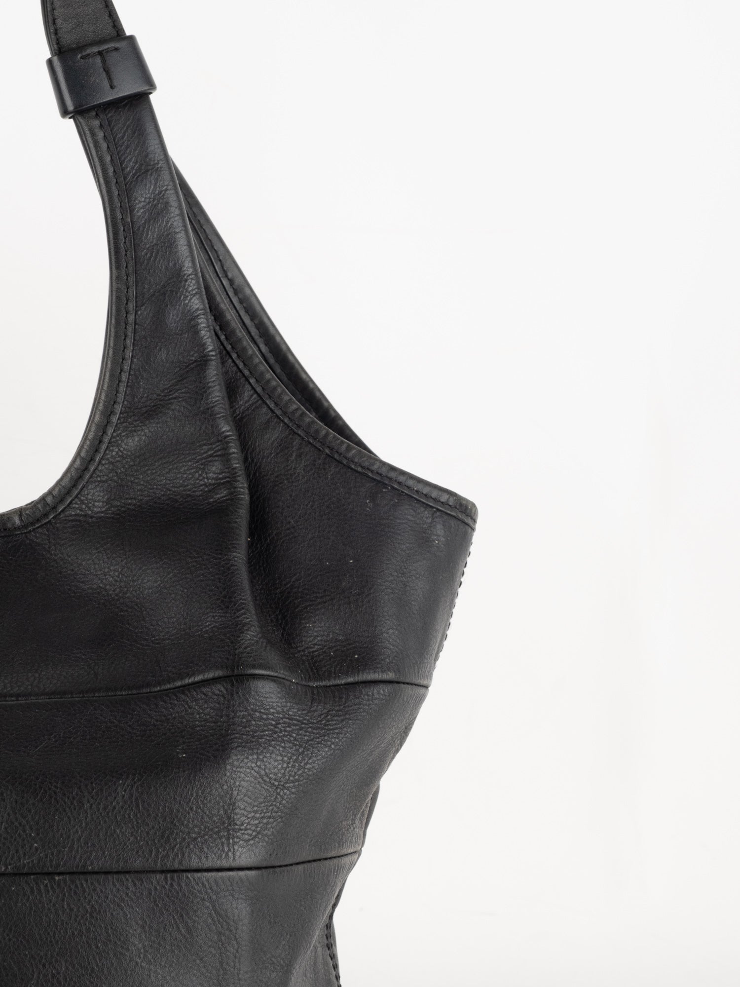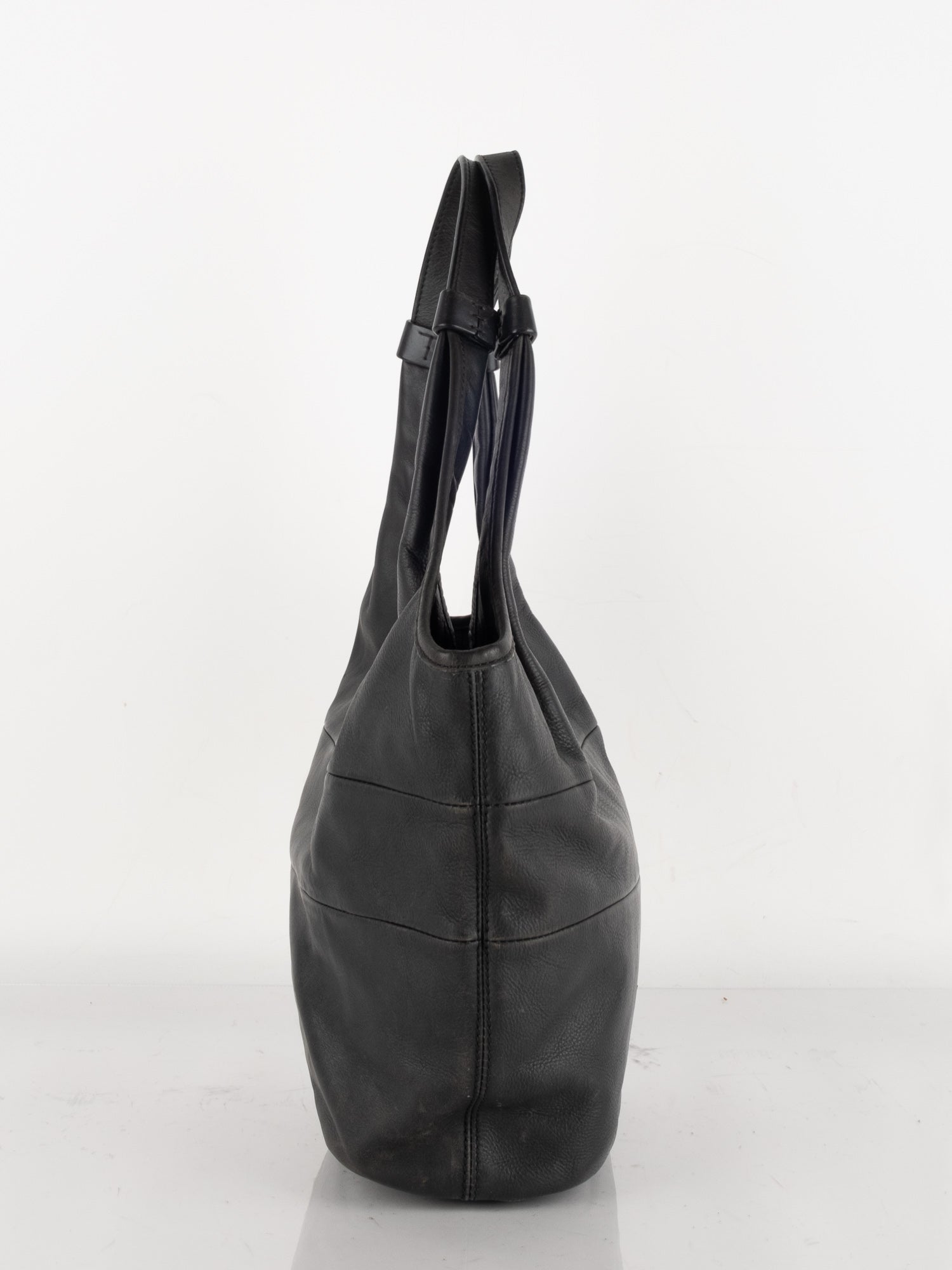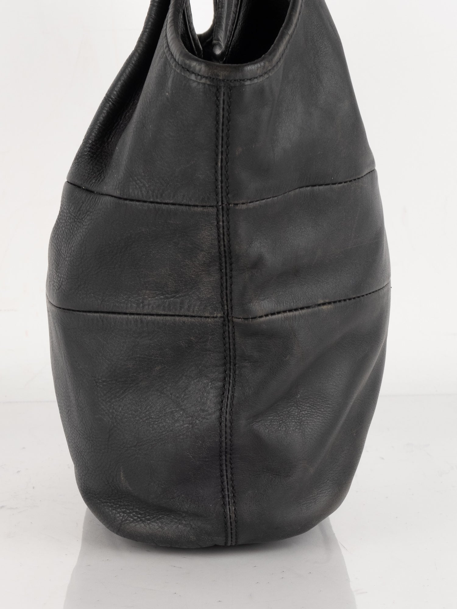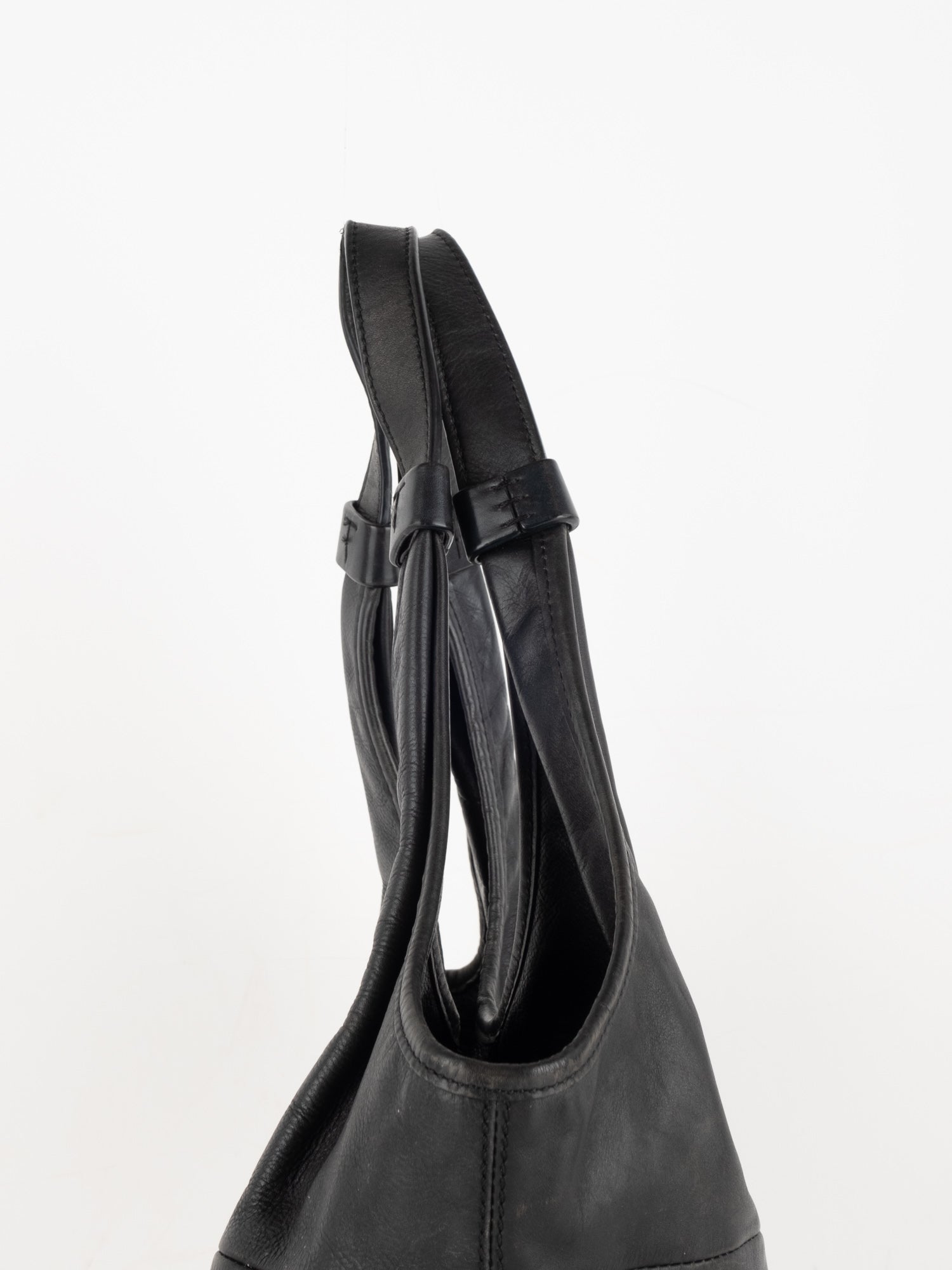 התיק עשוי עור שחור בעל מרקם טבעי ורך. בעל רצועות כפולות לנשיאה על הכתף, גזרה אובו עגולה ומרווחת, וסמל זהוב קטן בחזית. החלק התחתון רחב ויציב, והפרופורציה הכללית מתאימה לתיק יום יומי גדול.