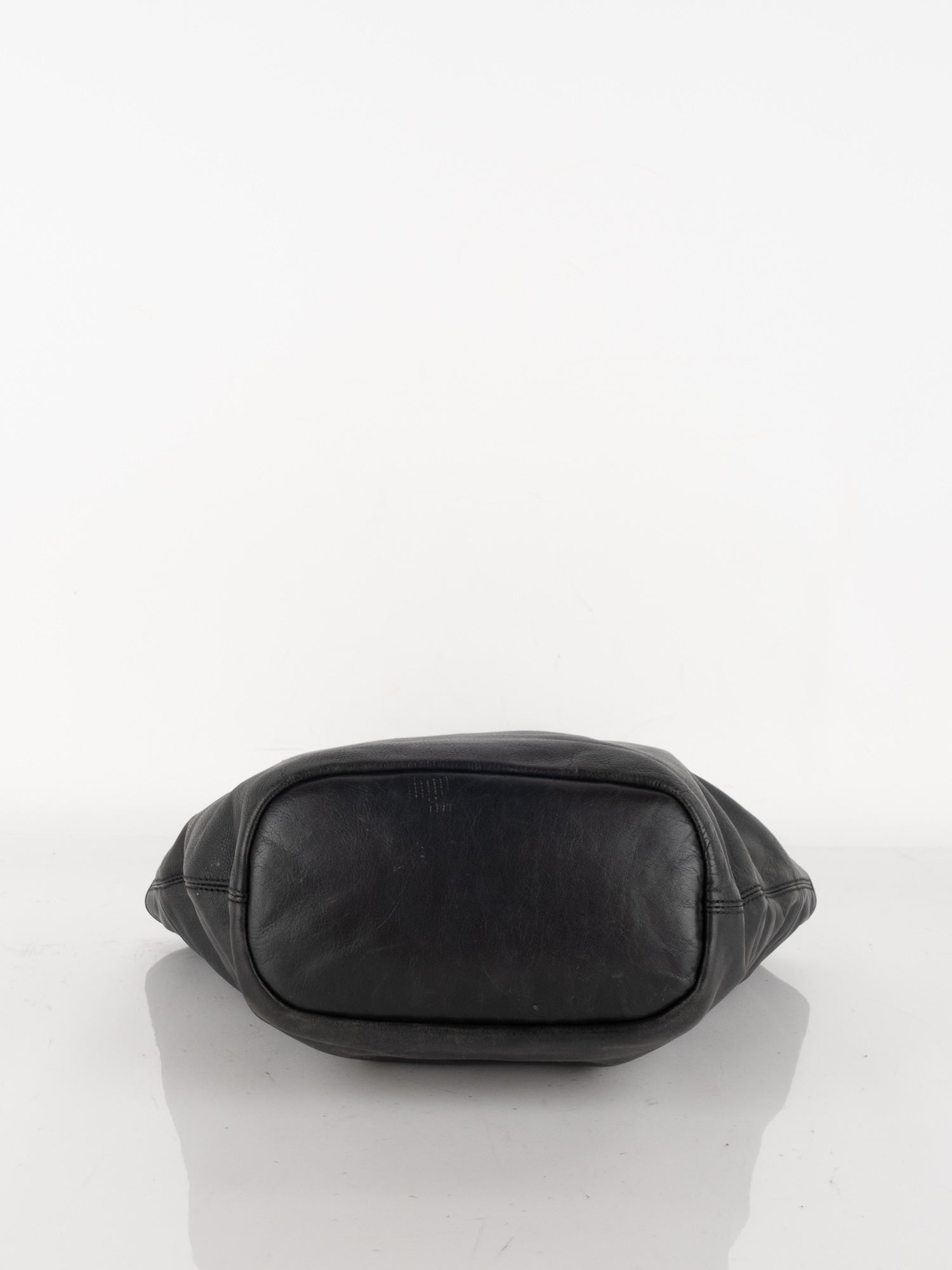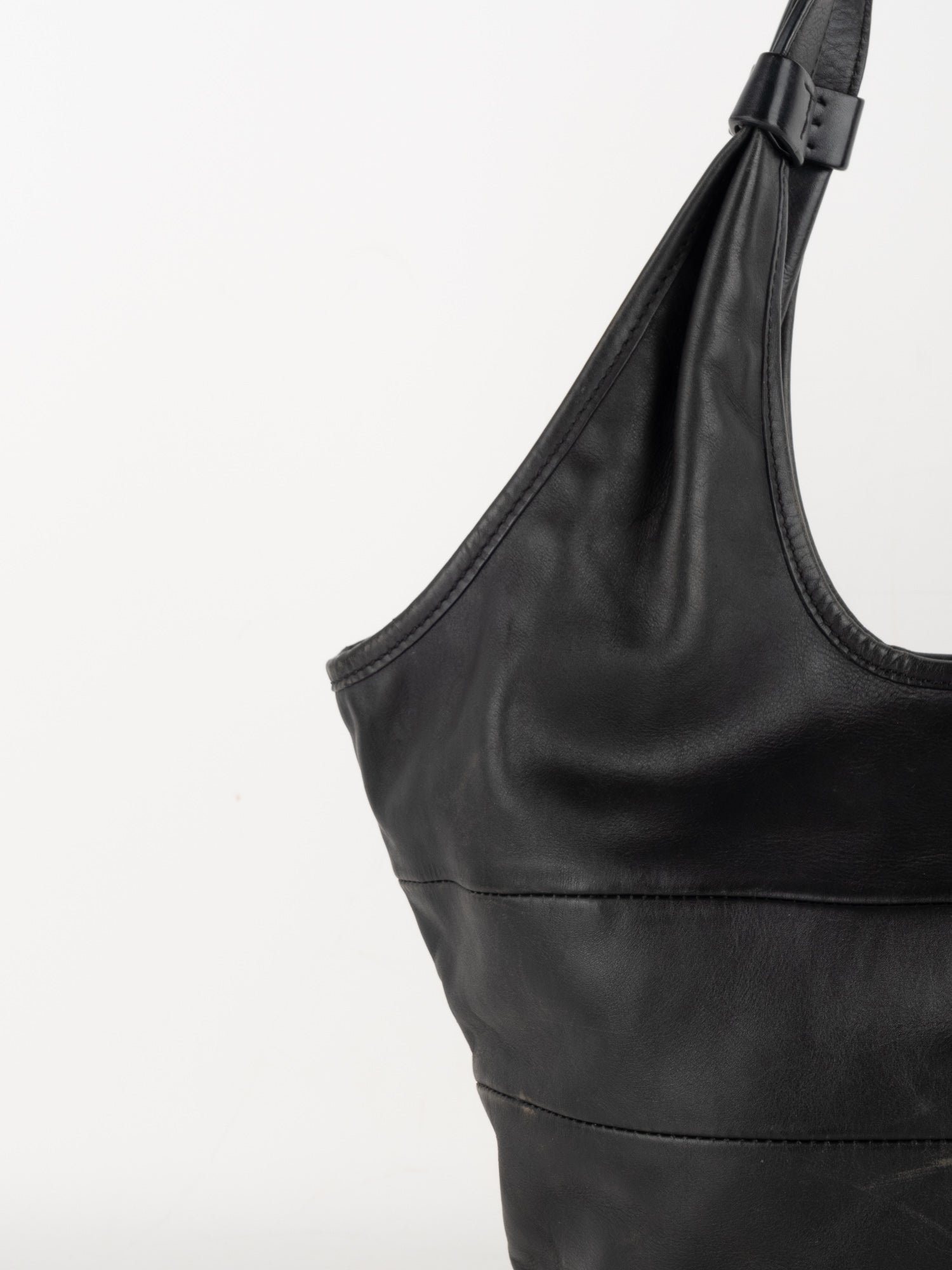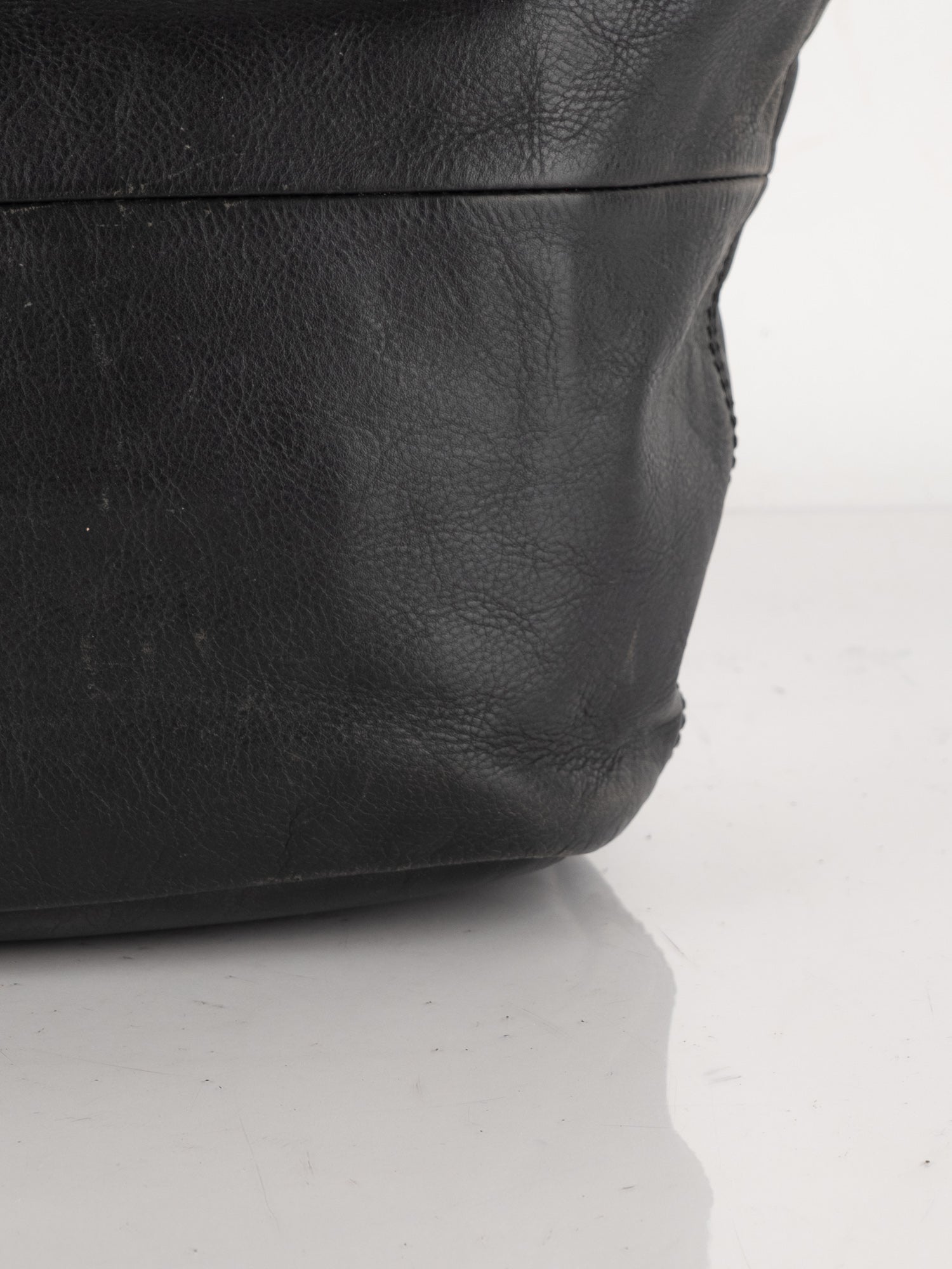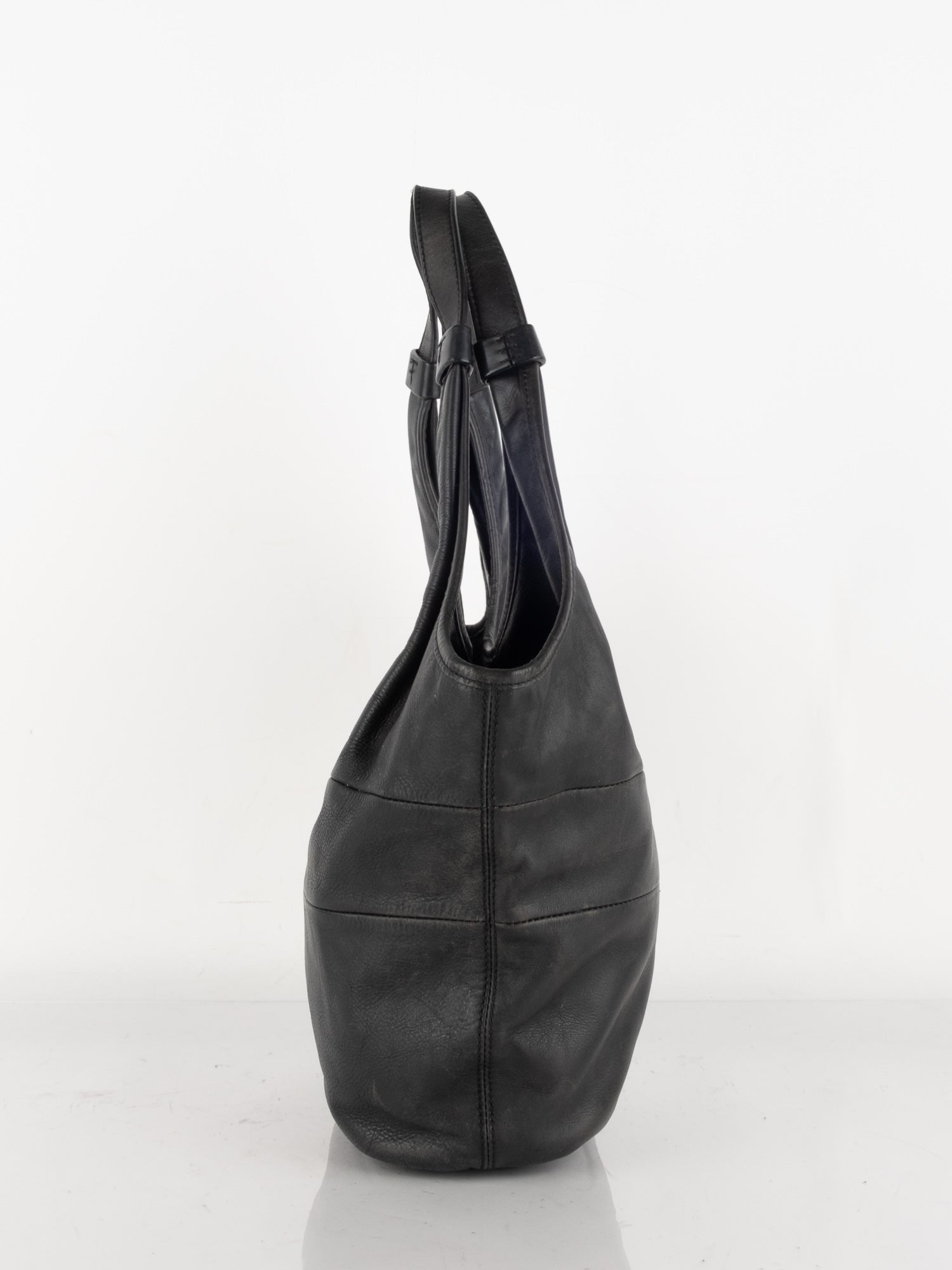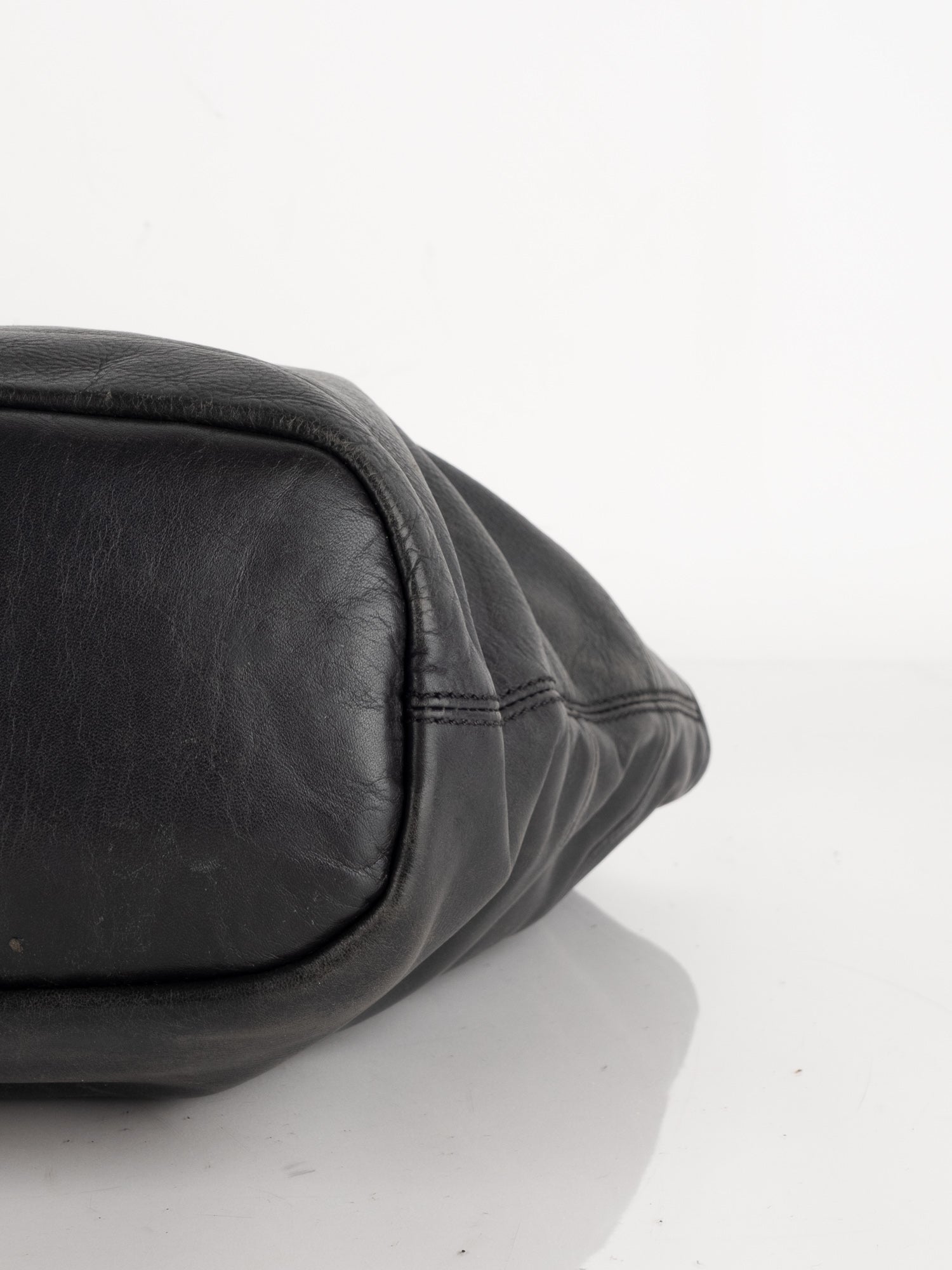 התיק עשוי עור שחור בעל מרקם טבעי ורך. בעל רצועות כפולות לנשיאה על הכתף, גזרה אובו עגולה ומרווחת, וסמל זהוב קטן בחזית. החלק התחתון רחב ויציב, והפרופורציה הכללית מתאימה לתיק יום יומי גדול.