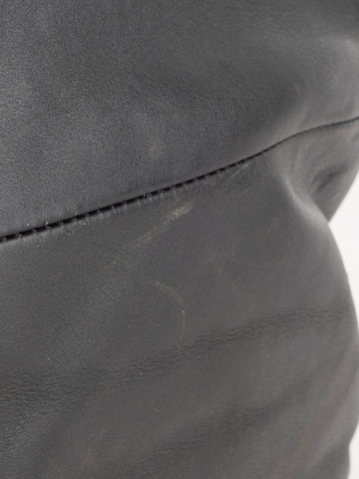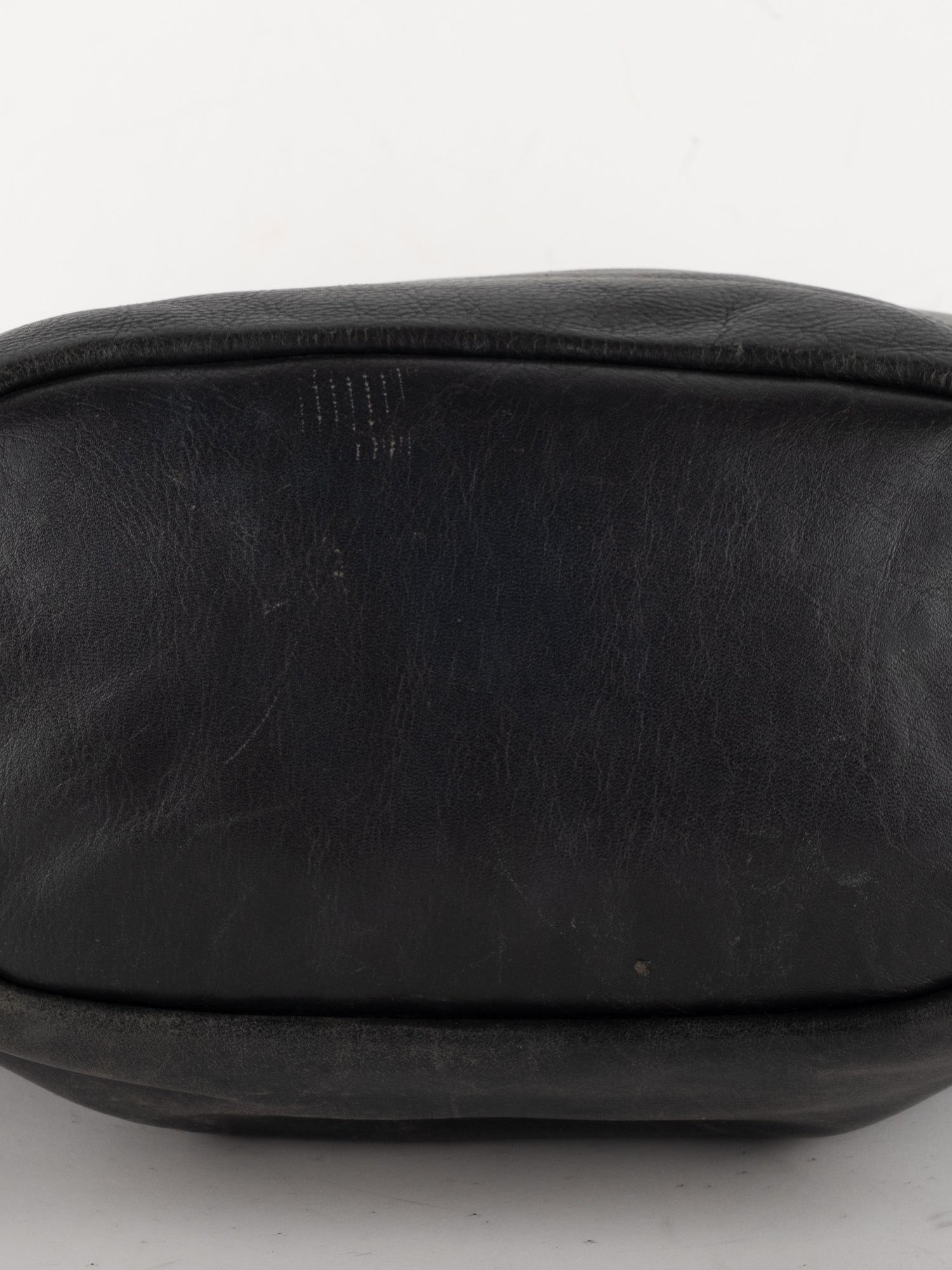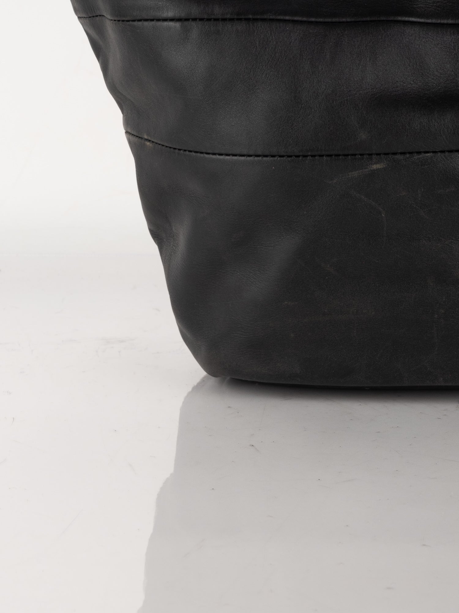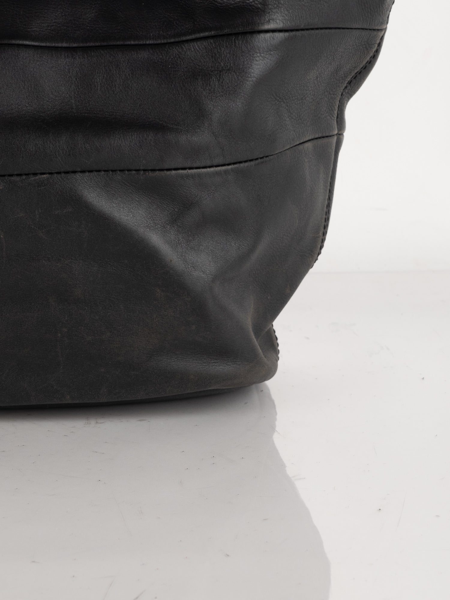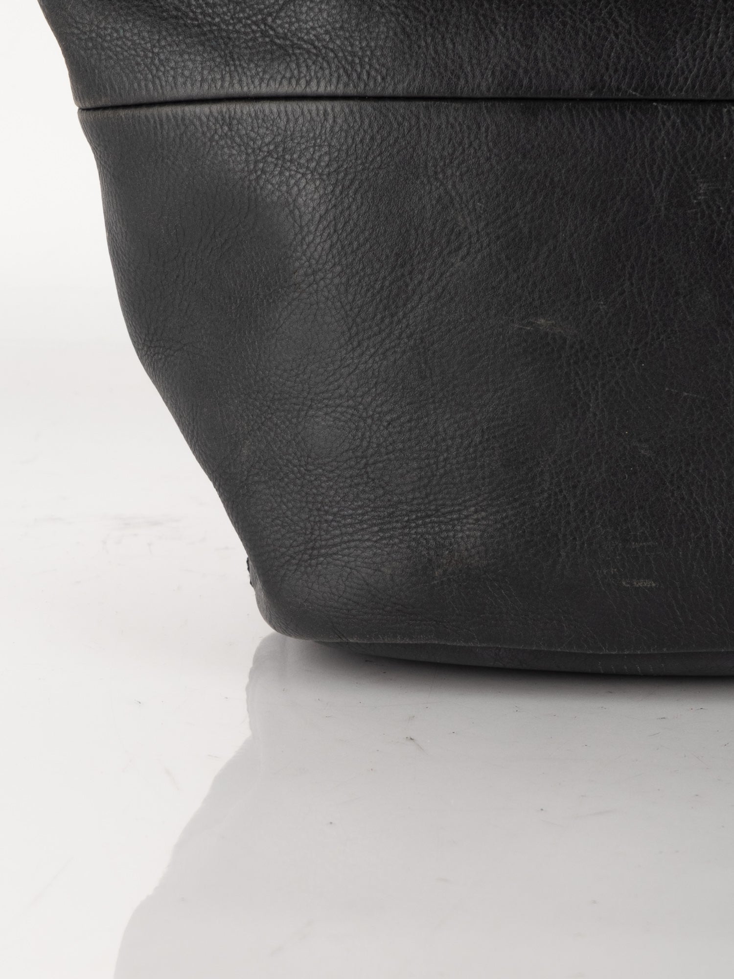 התיק עשוי עור שחור בעל מרקם טבעי ורך. בעל רצועות כפולות לנשיאה על הכתף, גזרה אובו עגולה ומרווחת, וסמל זהוב קטן בחזית. החלק התחתון רחב ויציב, והפרופורציה הכללית מתאימה לתיק יום יומי גדול.