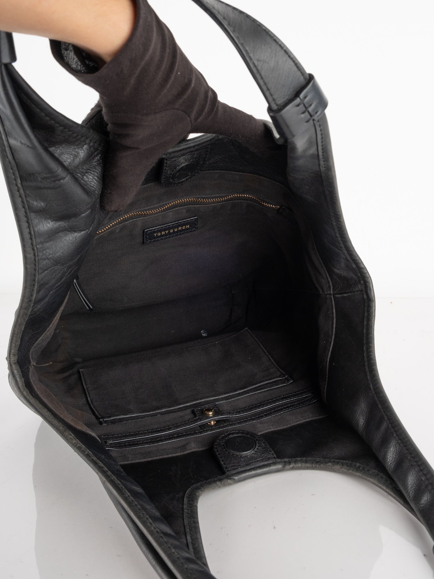 View Similar Productsתיק כתף יוקרתי של טורי ברץ' (Tory Burch), וינטג׳ יד שנייה, בעיצוב אובו רך ונשי. התיק עשוי עור שחור טבעי ונעים למגע, עם רצועות כתף רחבות ונוחות שמעניקות תחושת יציבות וסטייל effortless.