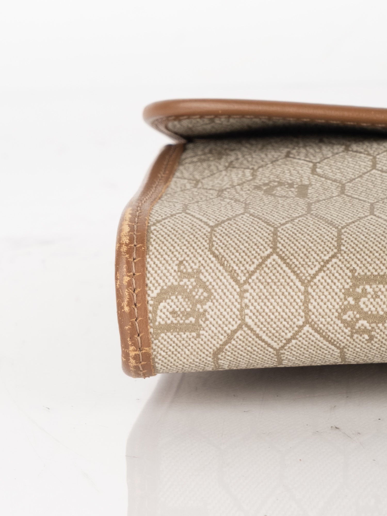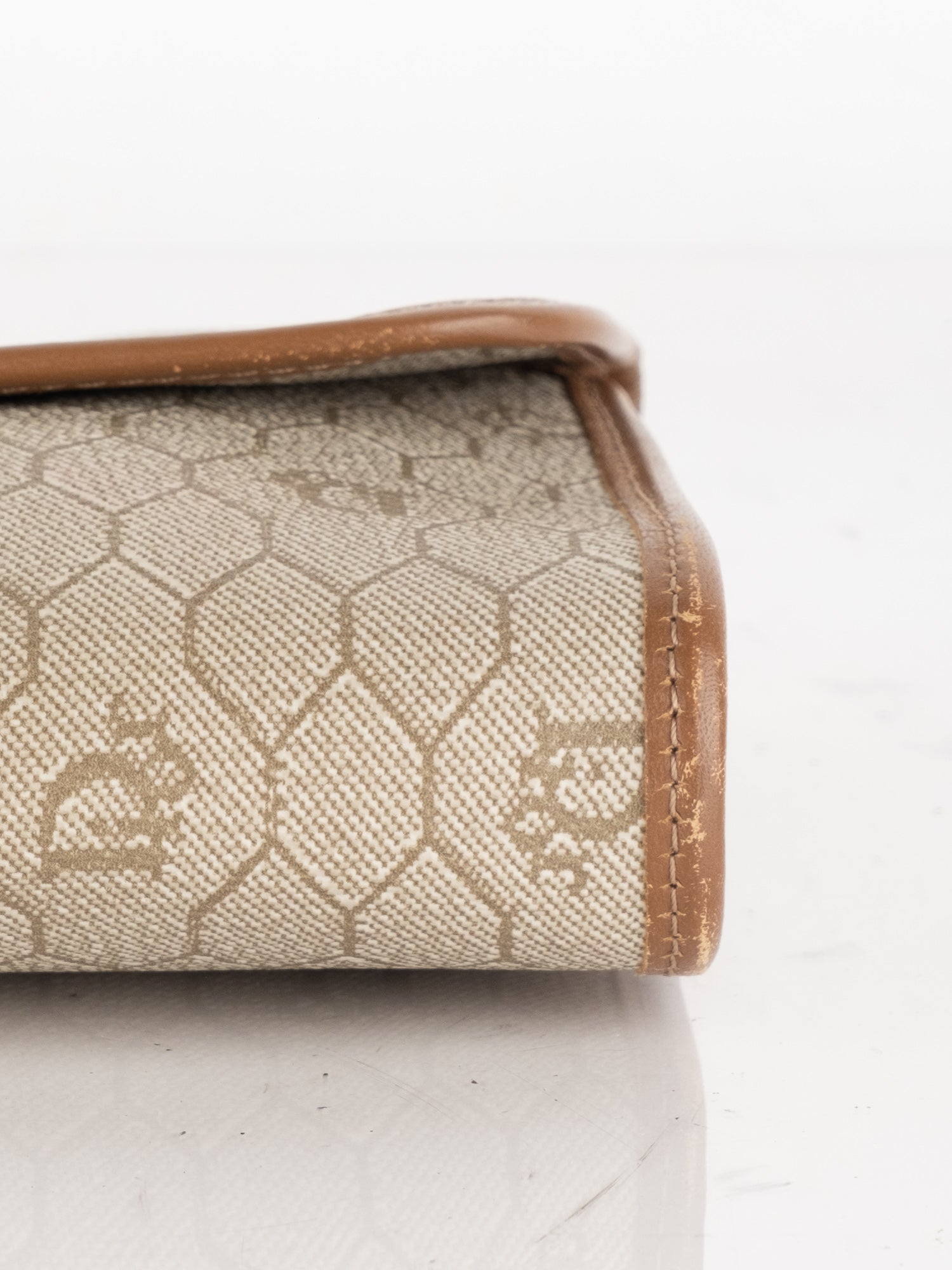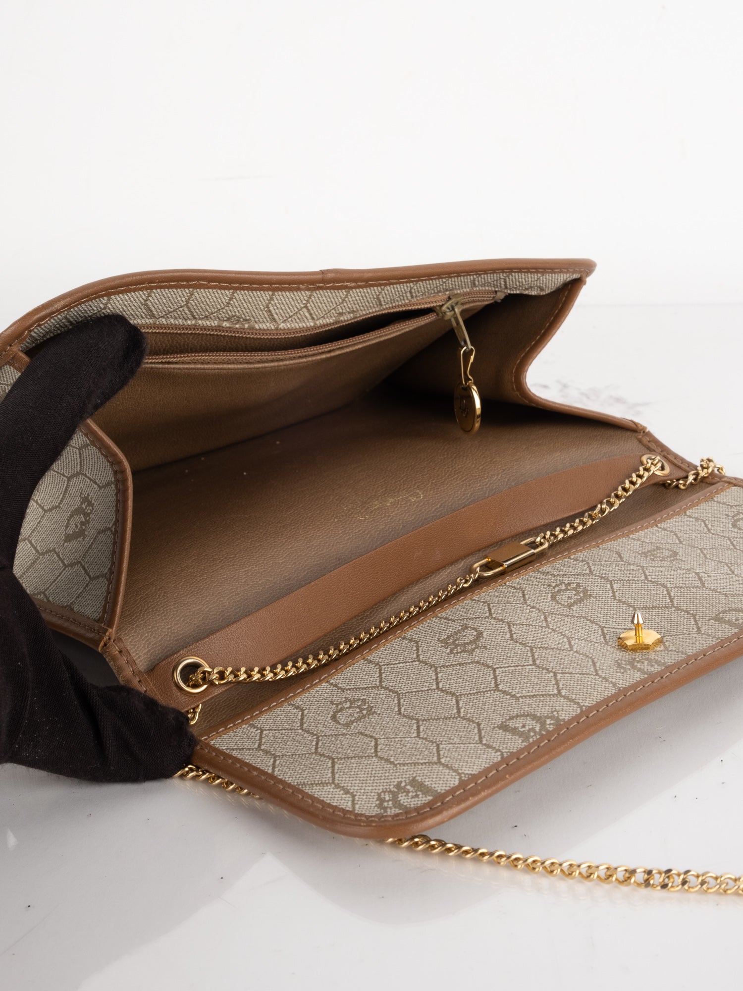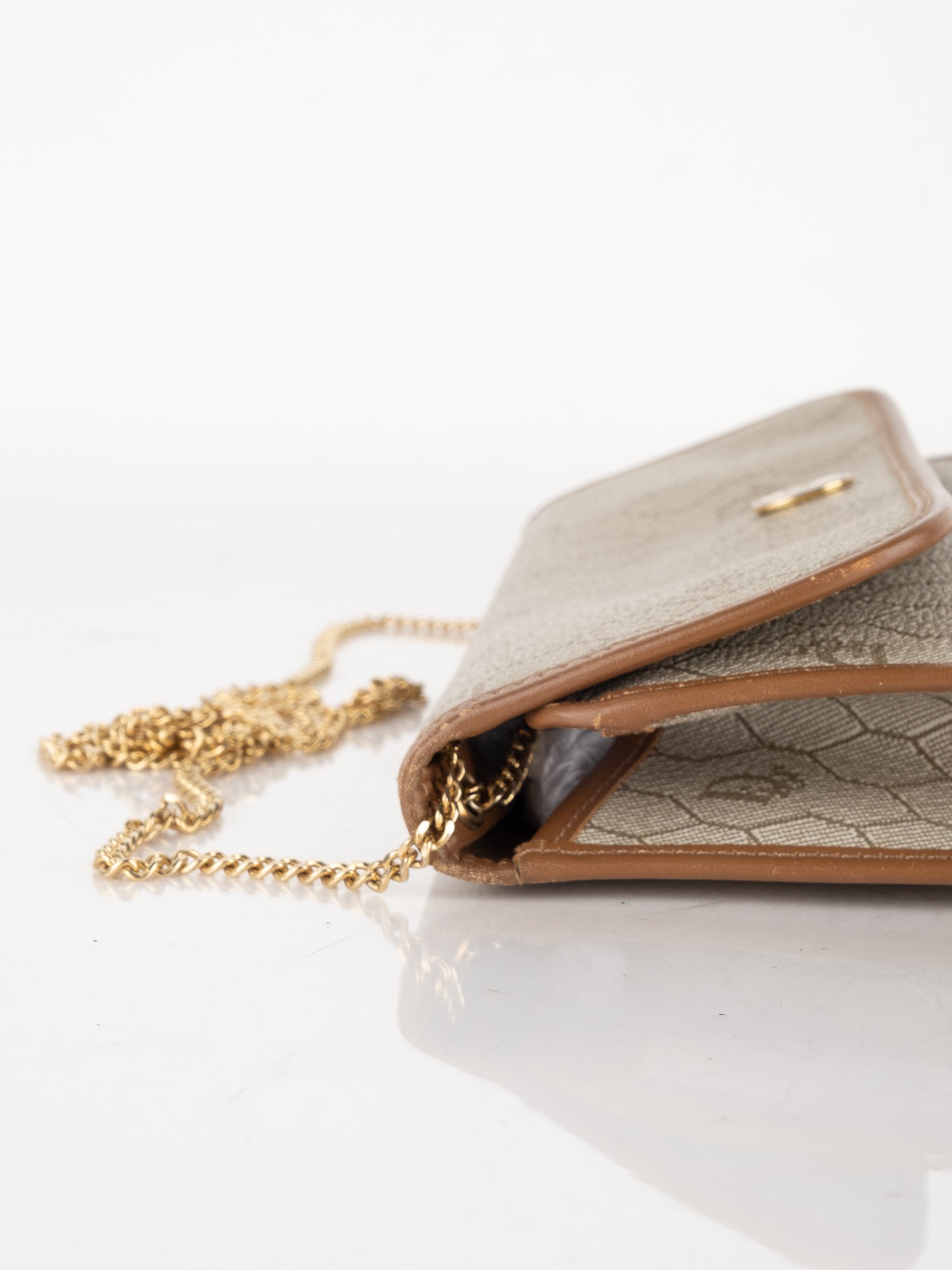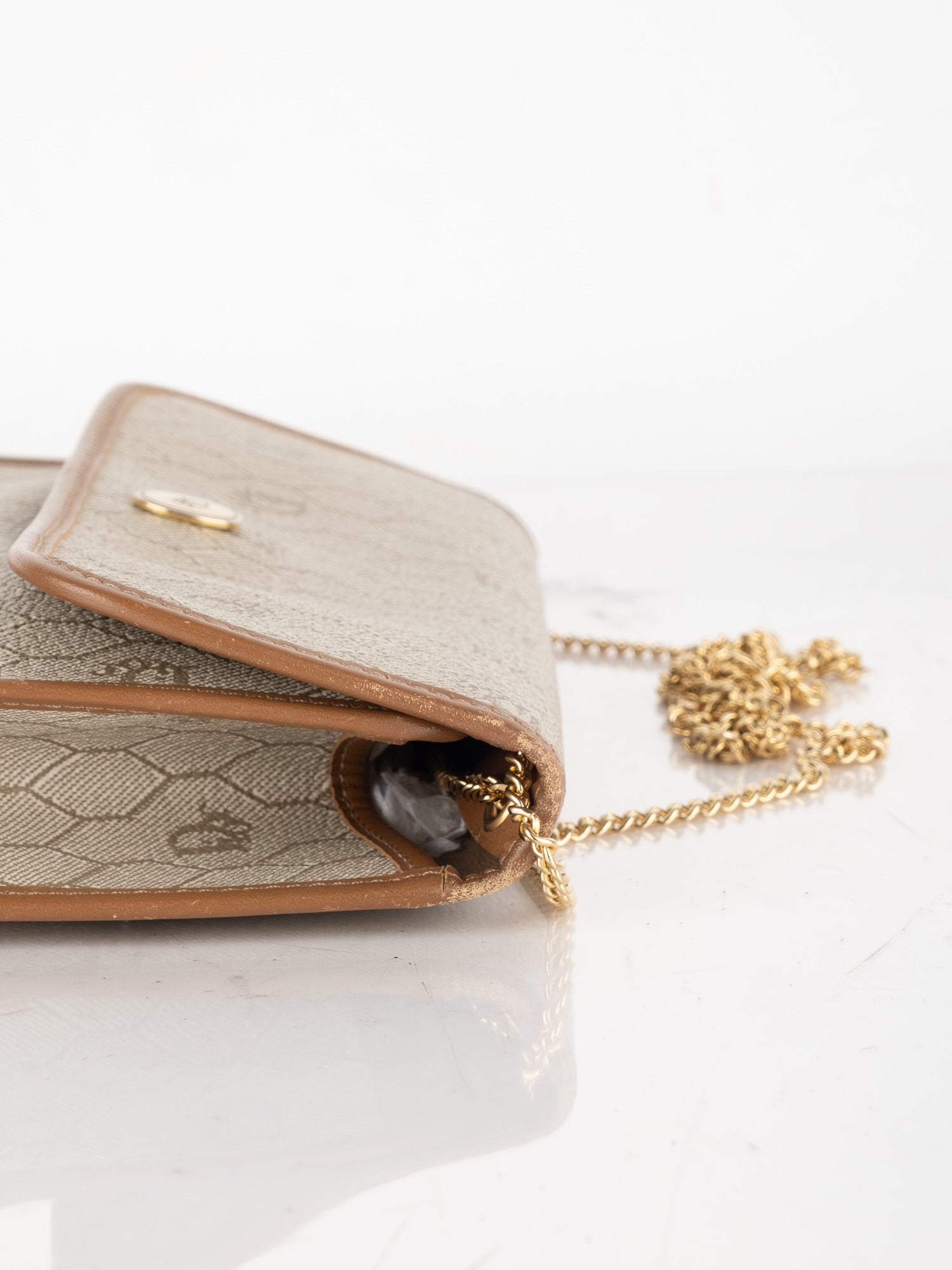התיק עשוי קנבס מונוגרם בגוון בז׳ בהיר, בשילוב פרטי עור חומים דקים, פלפה קדמית, רצועת שרשרת מוזהבת וקווי עיצוב נקיים ועדינים.