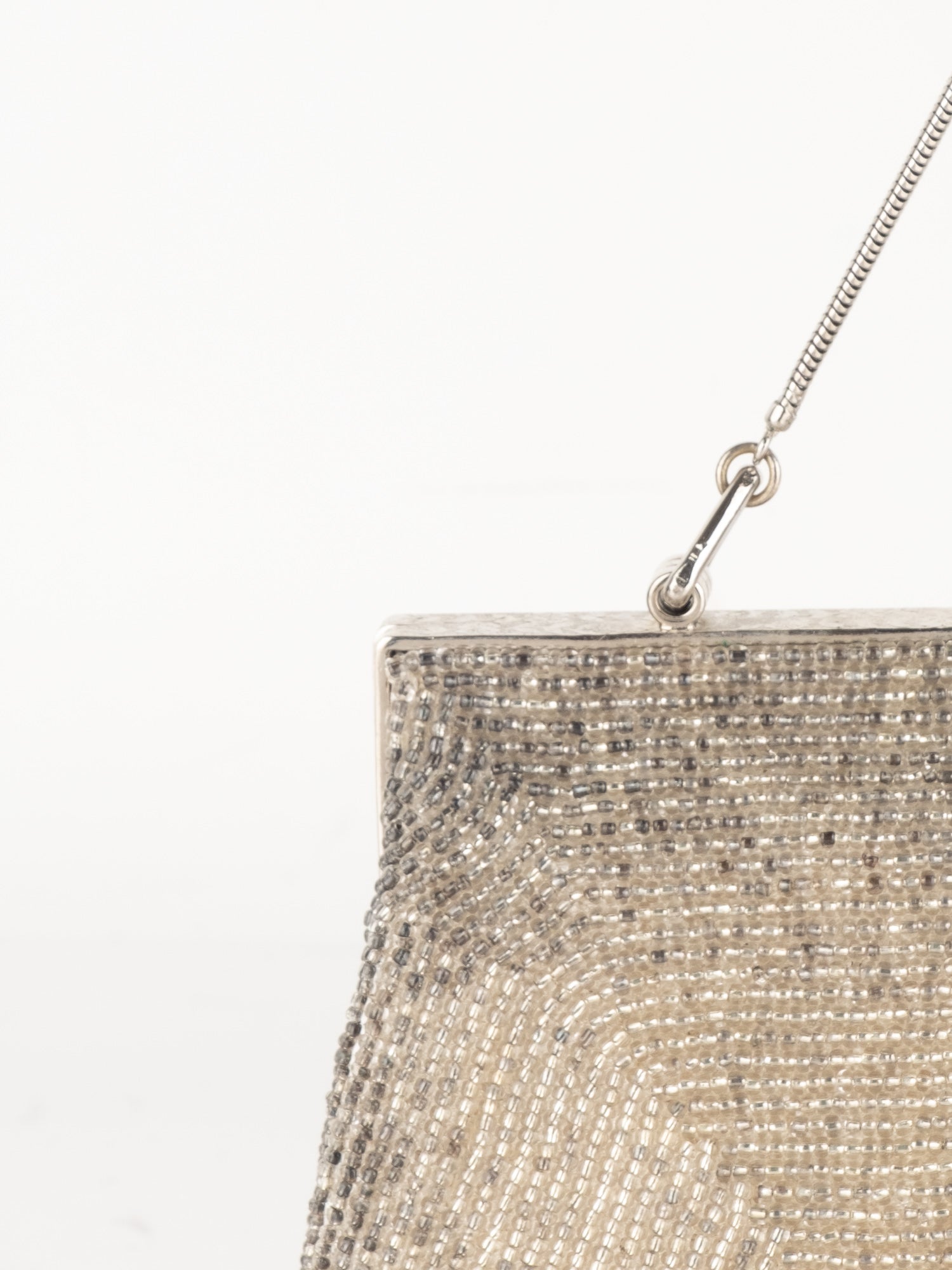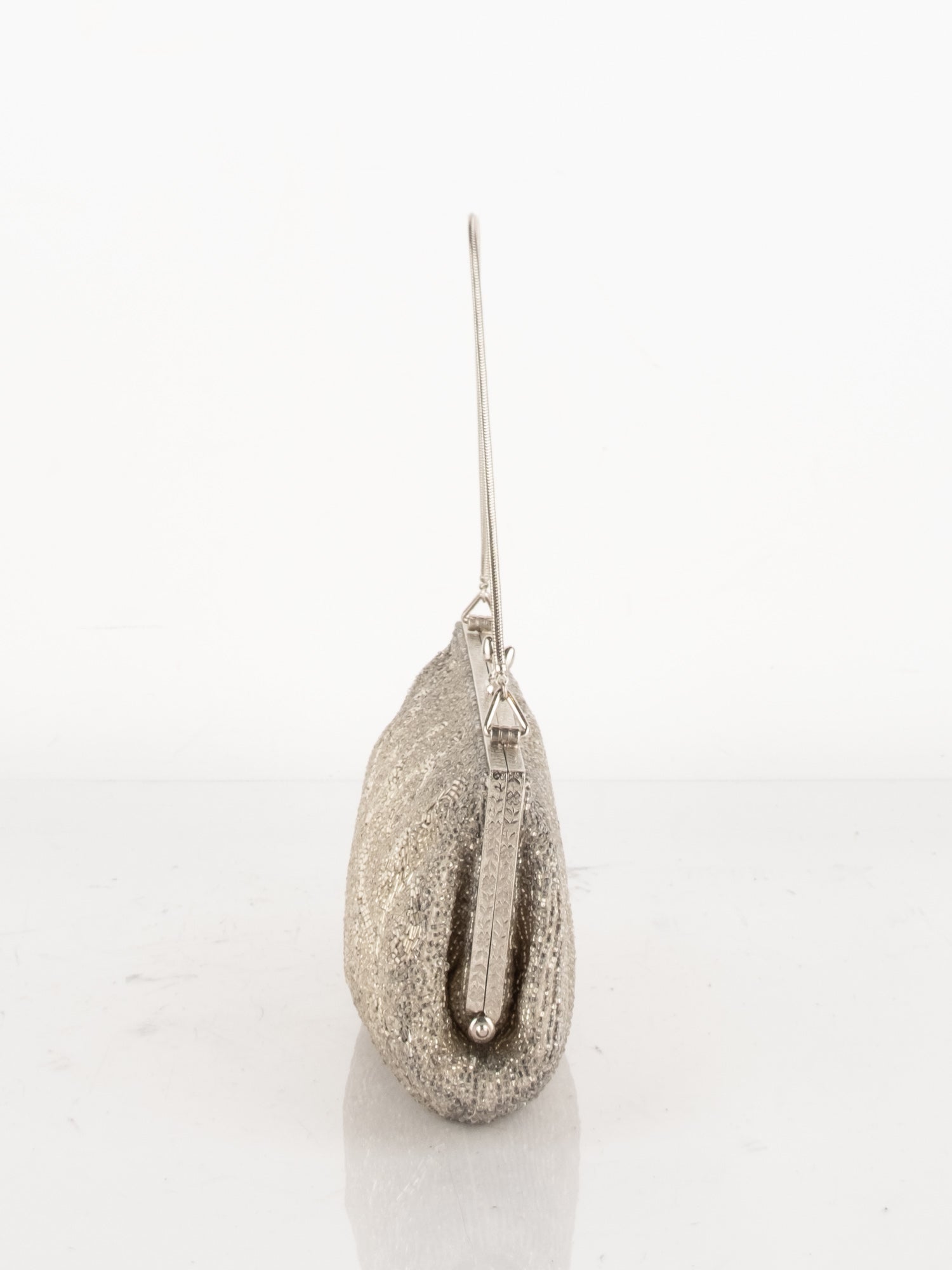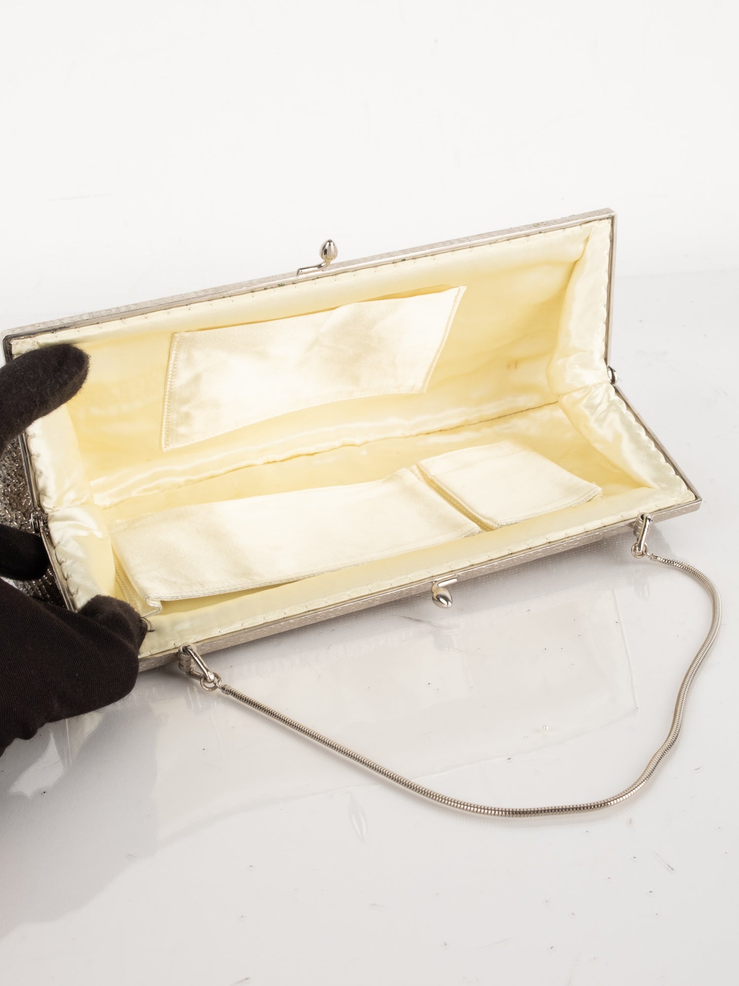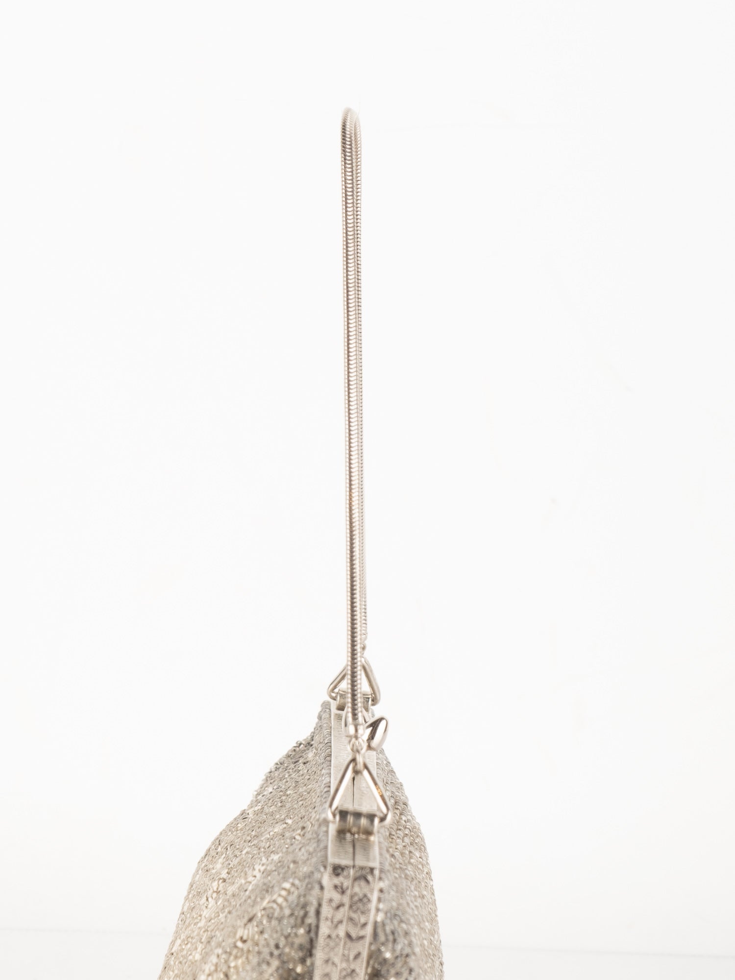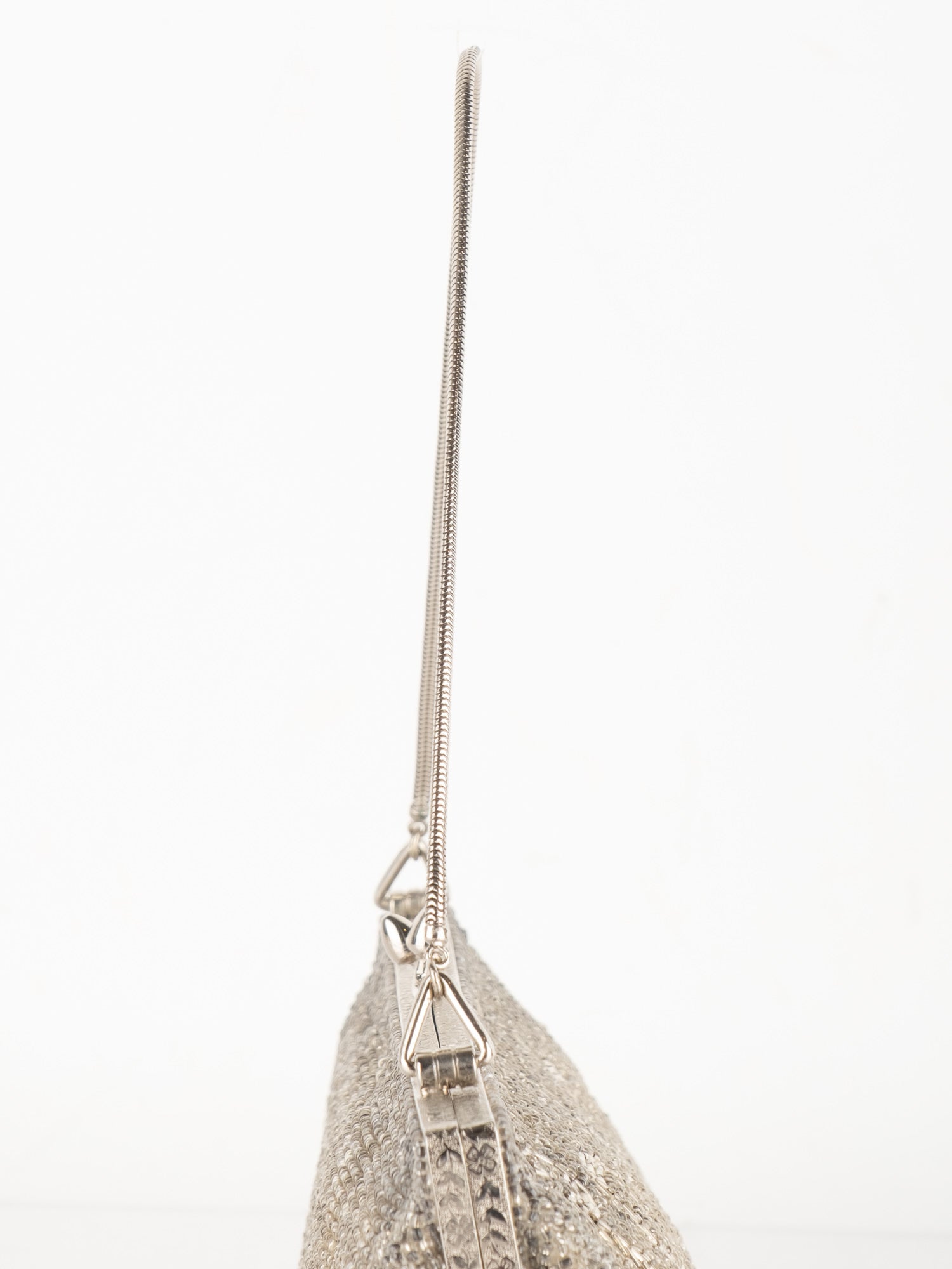 רשת כסף מבריקה, סגירת מתכת, ידית קצרה, תיק קטן תואם.
