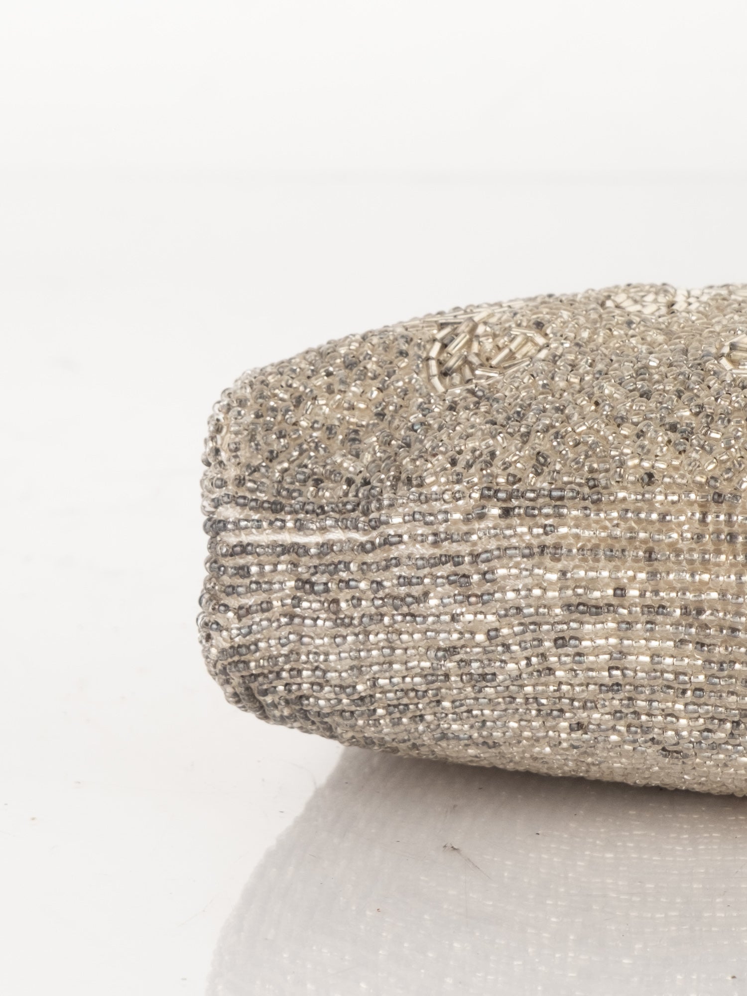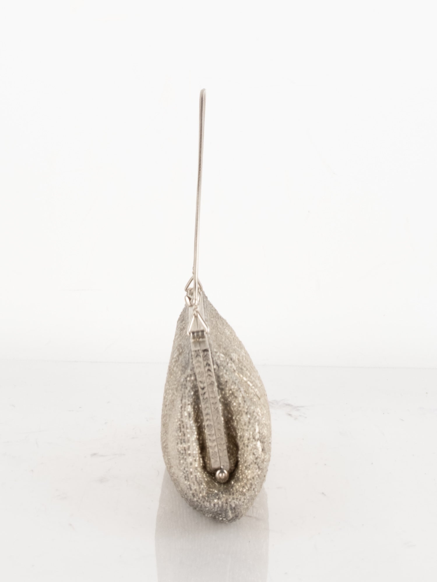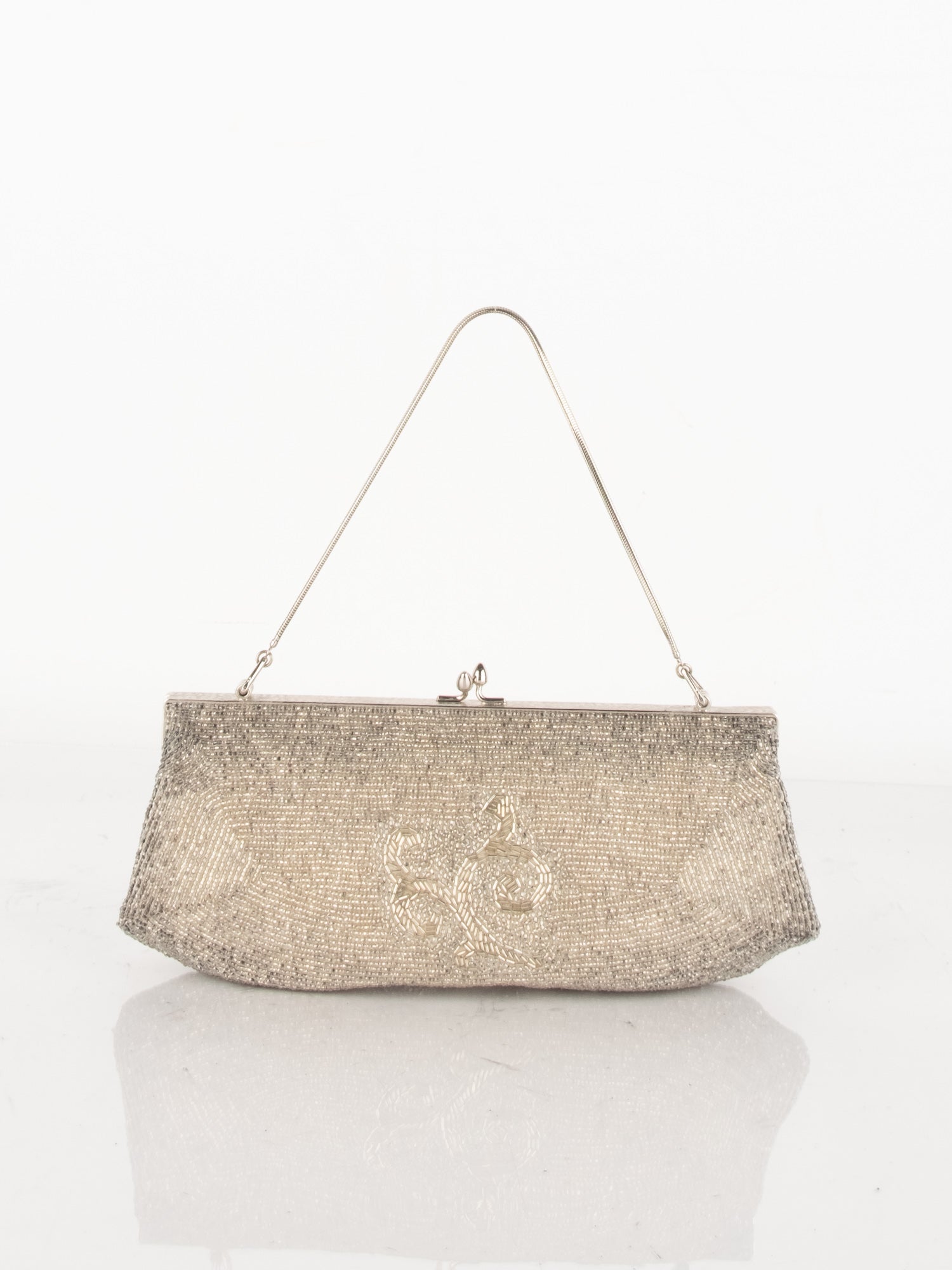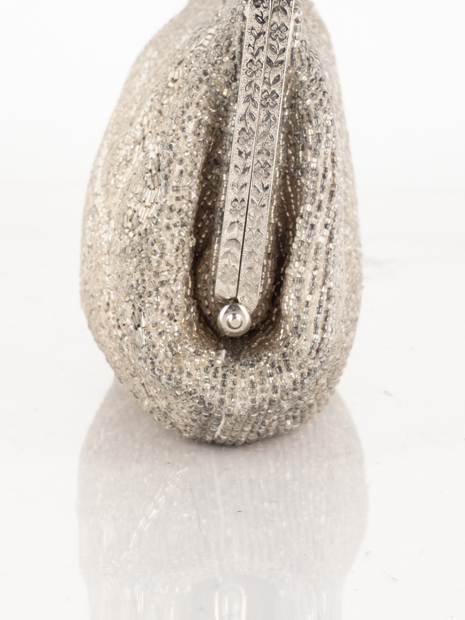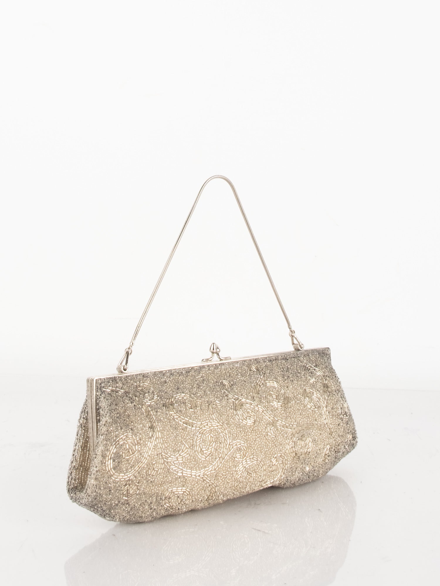 רשת כסף מבריקה, סגירת מתכת, ידית קצרה, תיק קטן תואם.