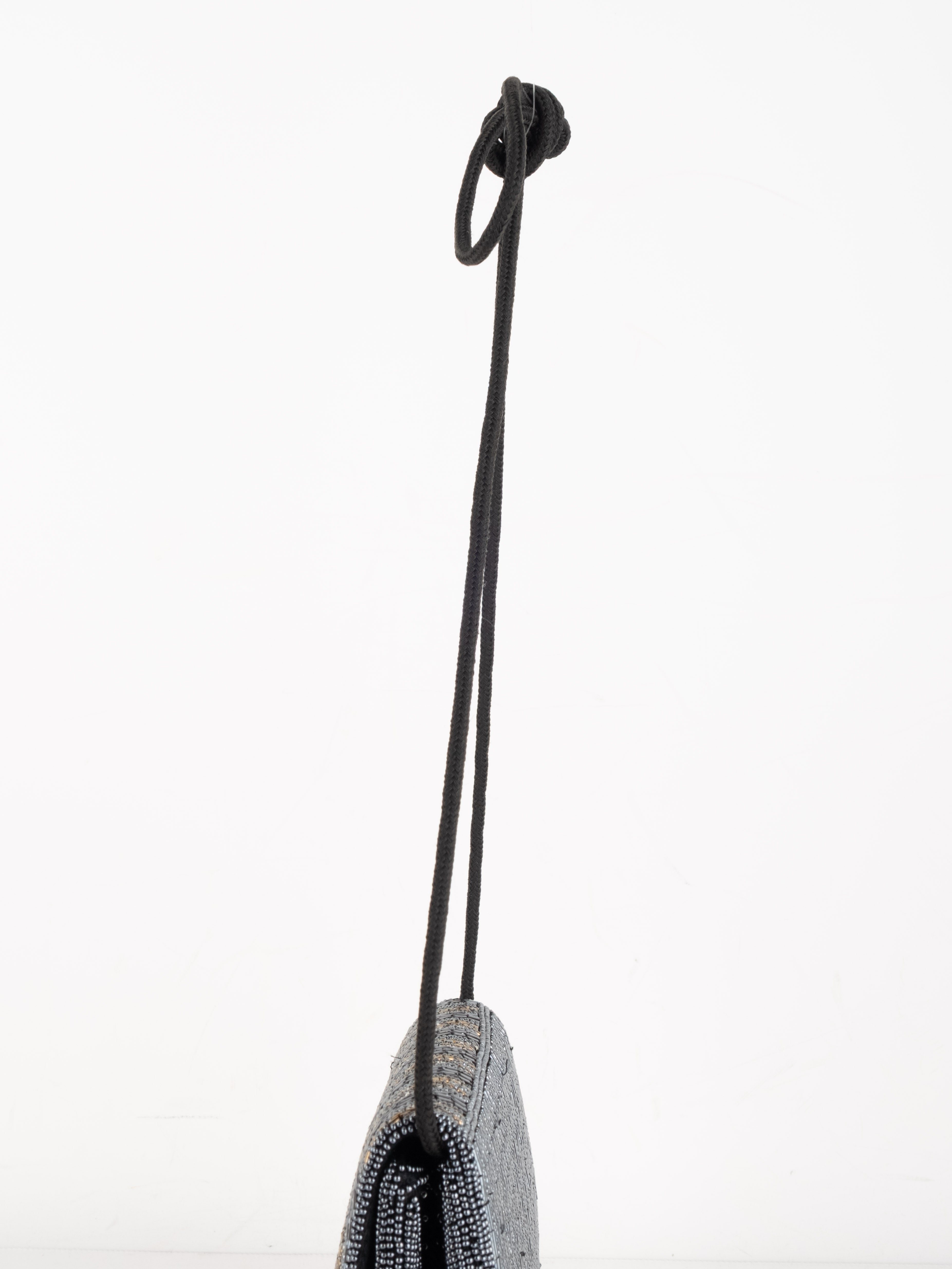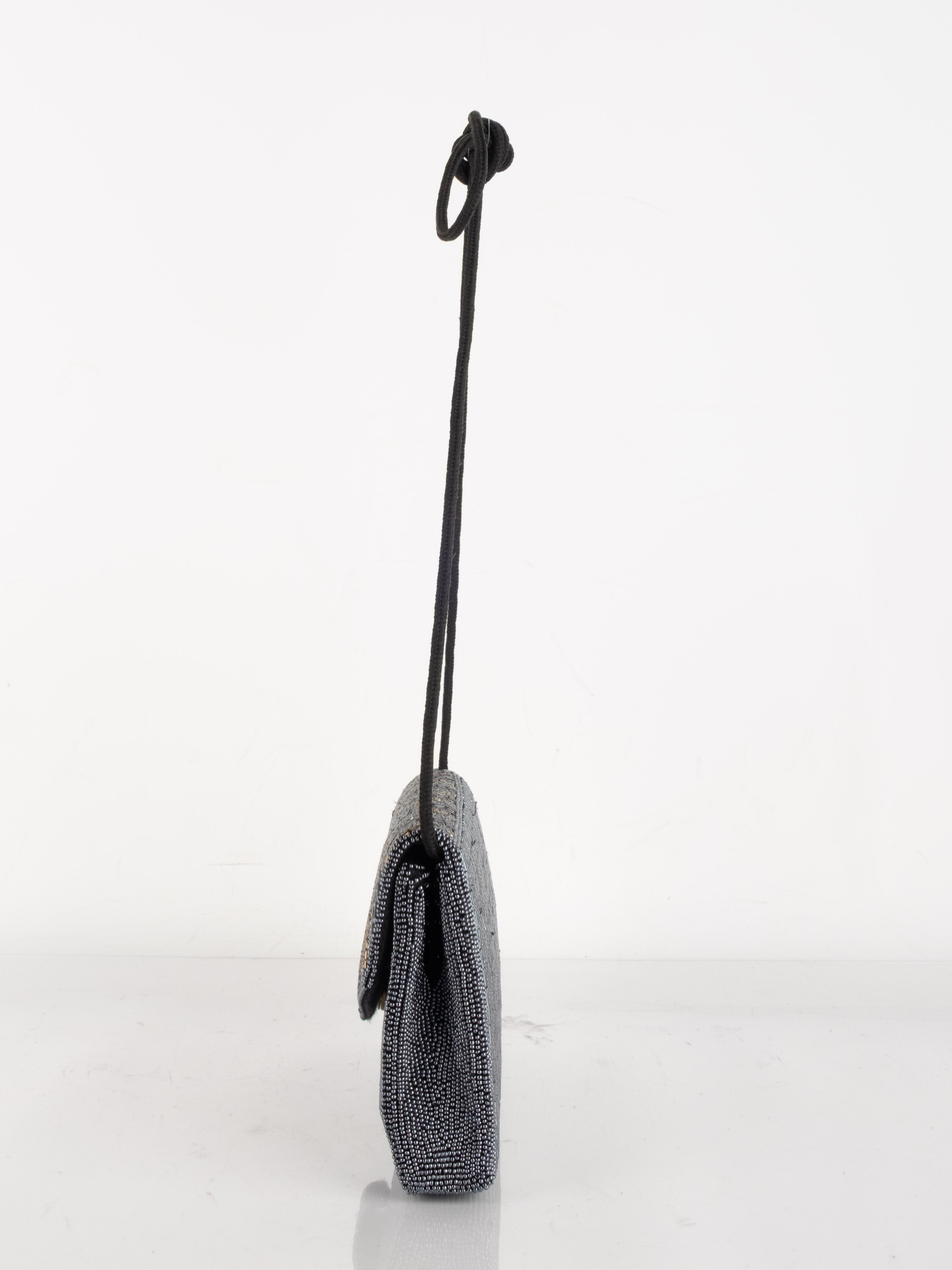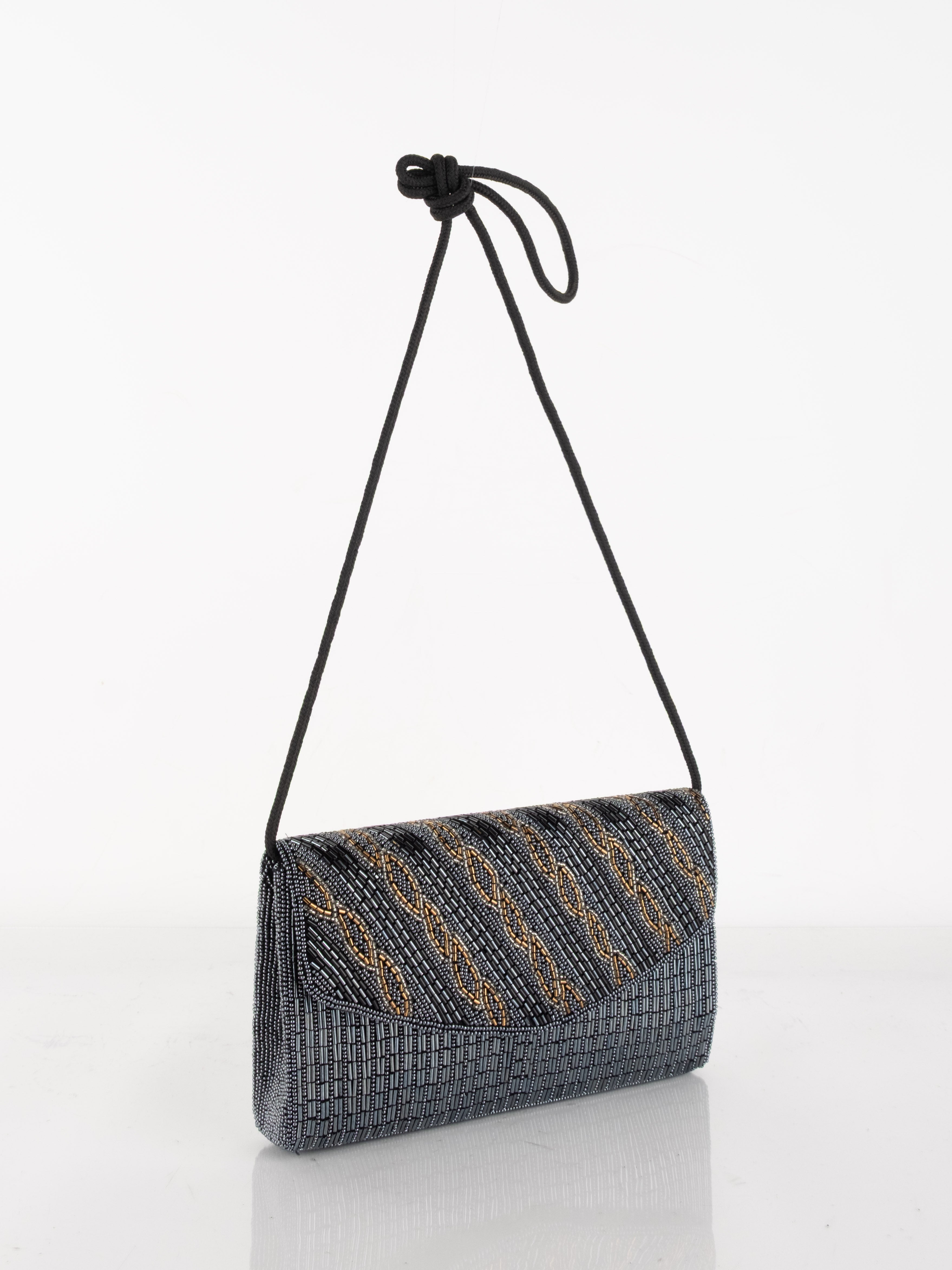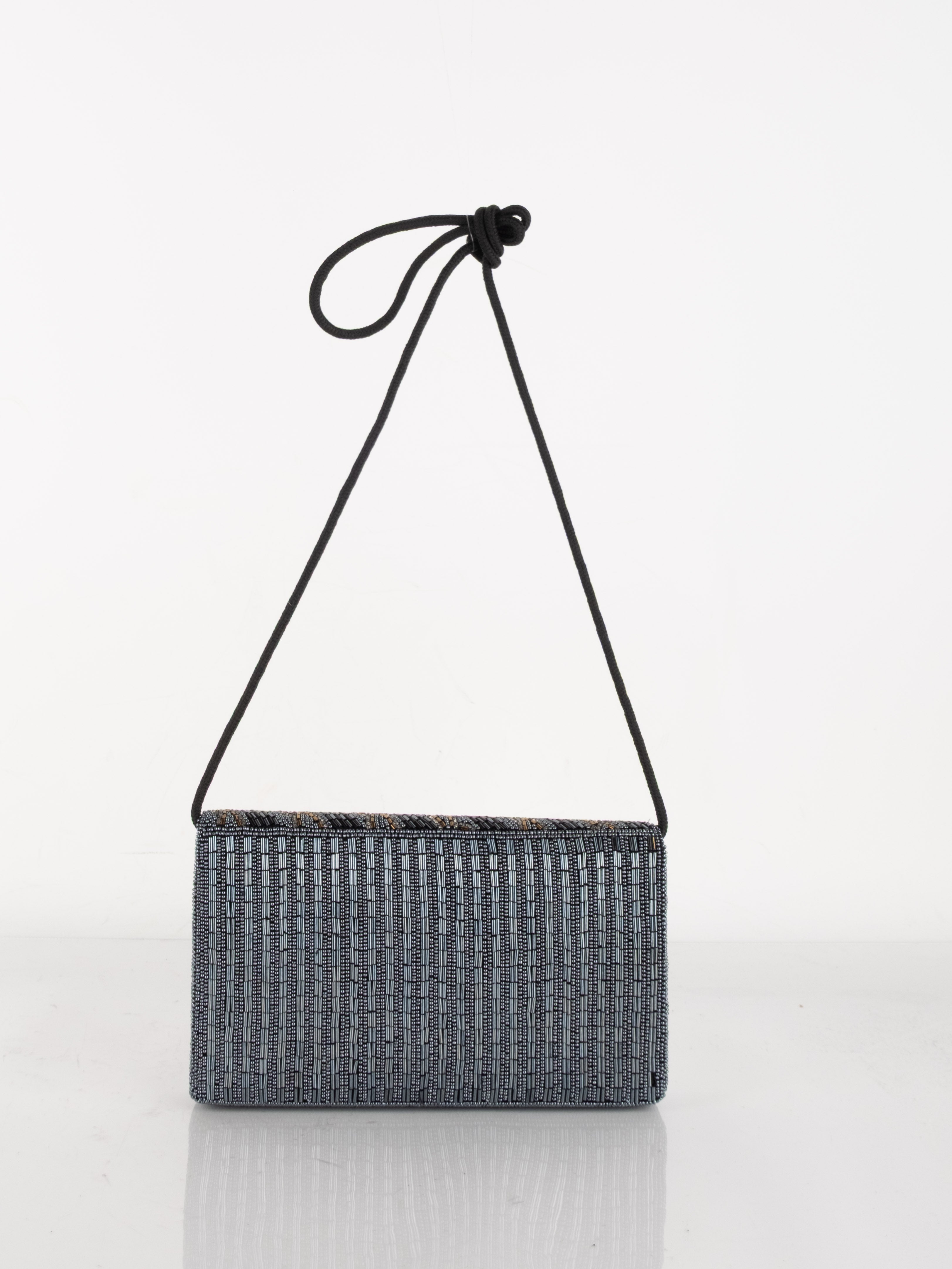 התיק עשוי עבודת חריזה מרהיבה, עם דש קדמי וקו עיצוב מעוגל ועדין. כולל רצועת כתף דקה בצבע שחור ותא פנימי אחד לנשיאת פריטים קטנים.