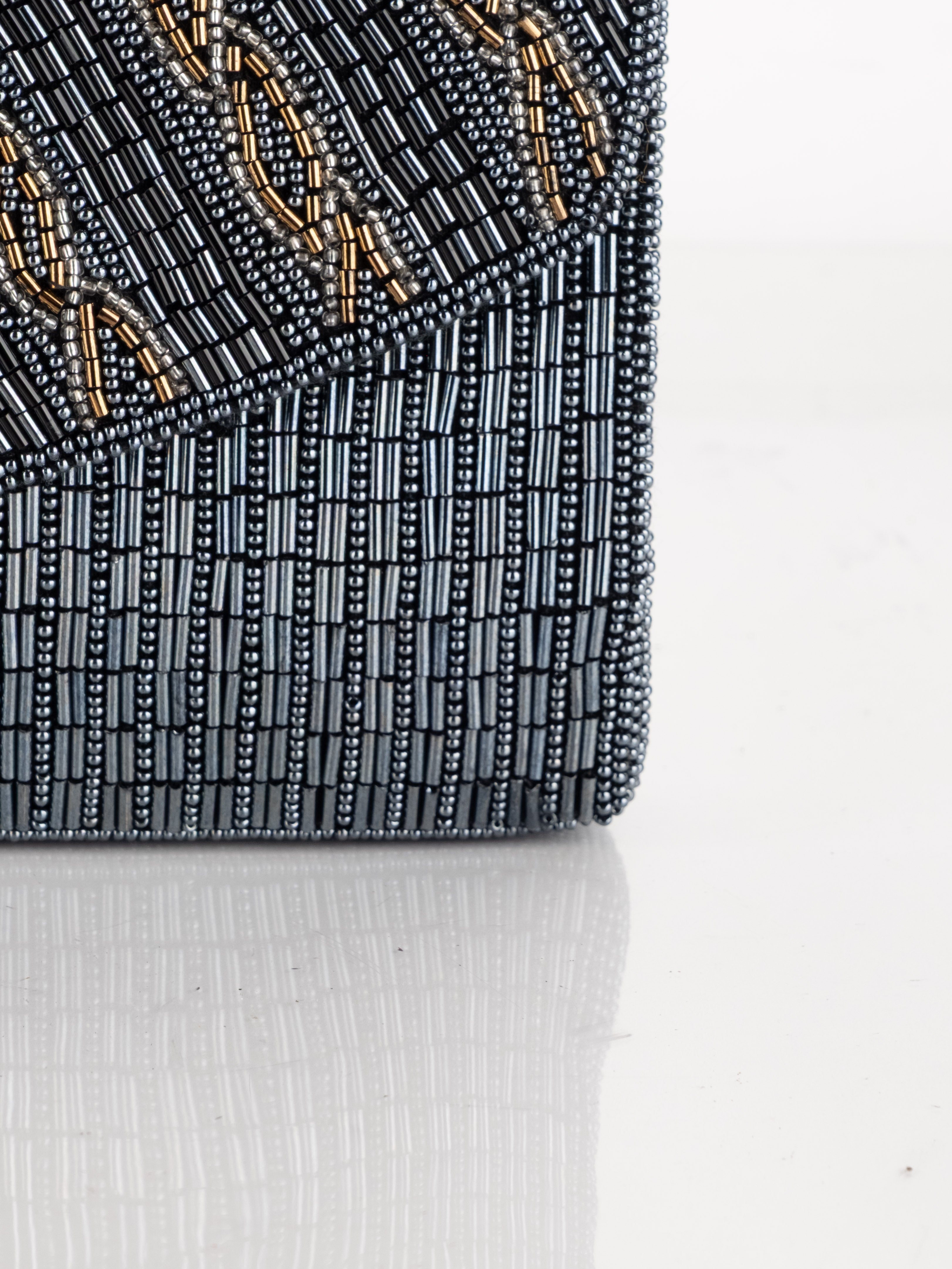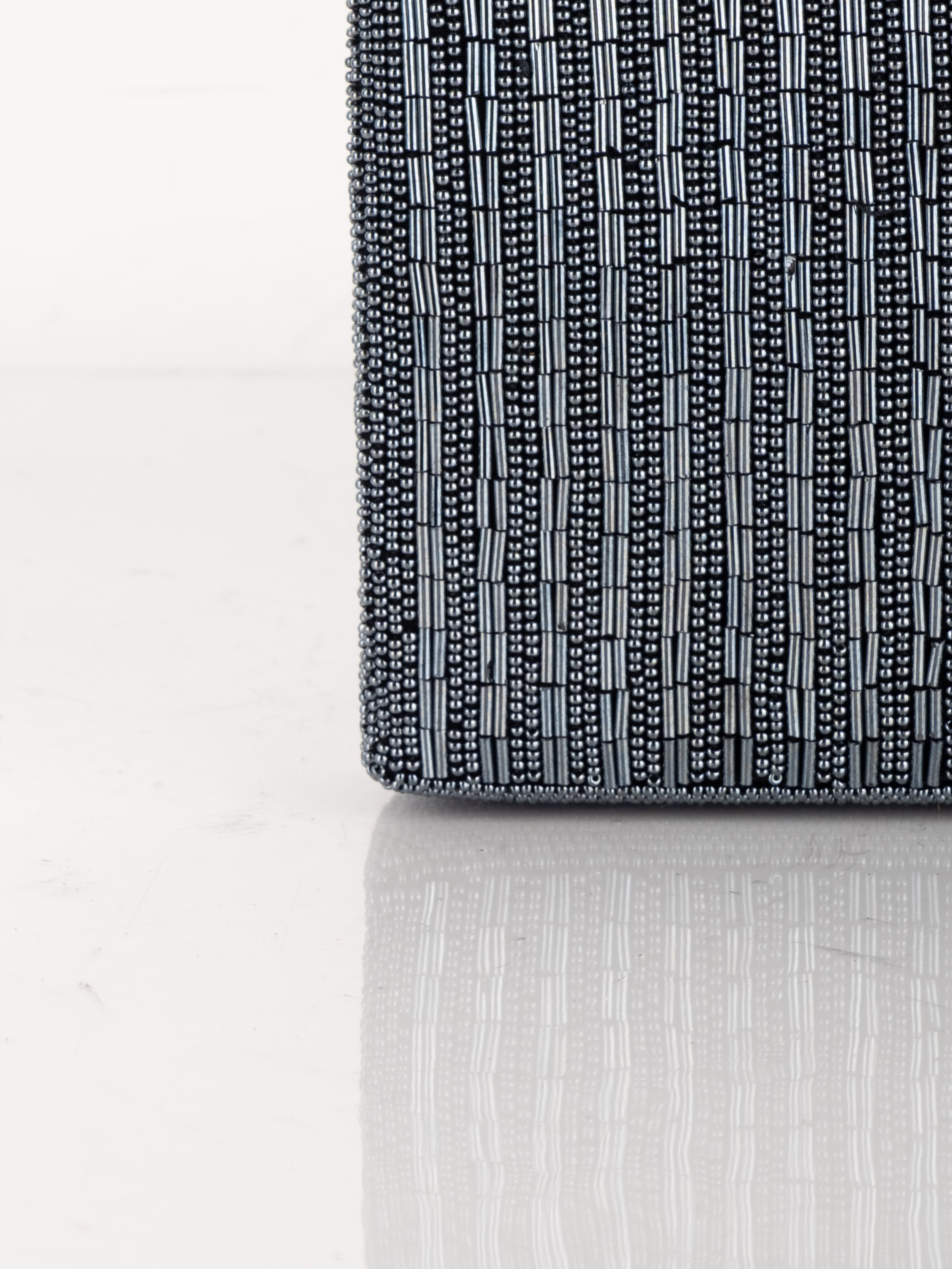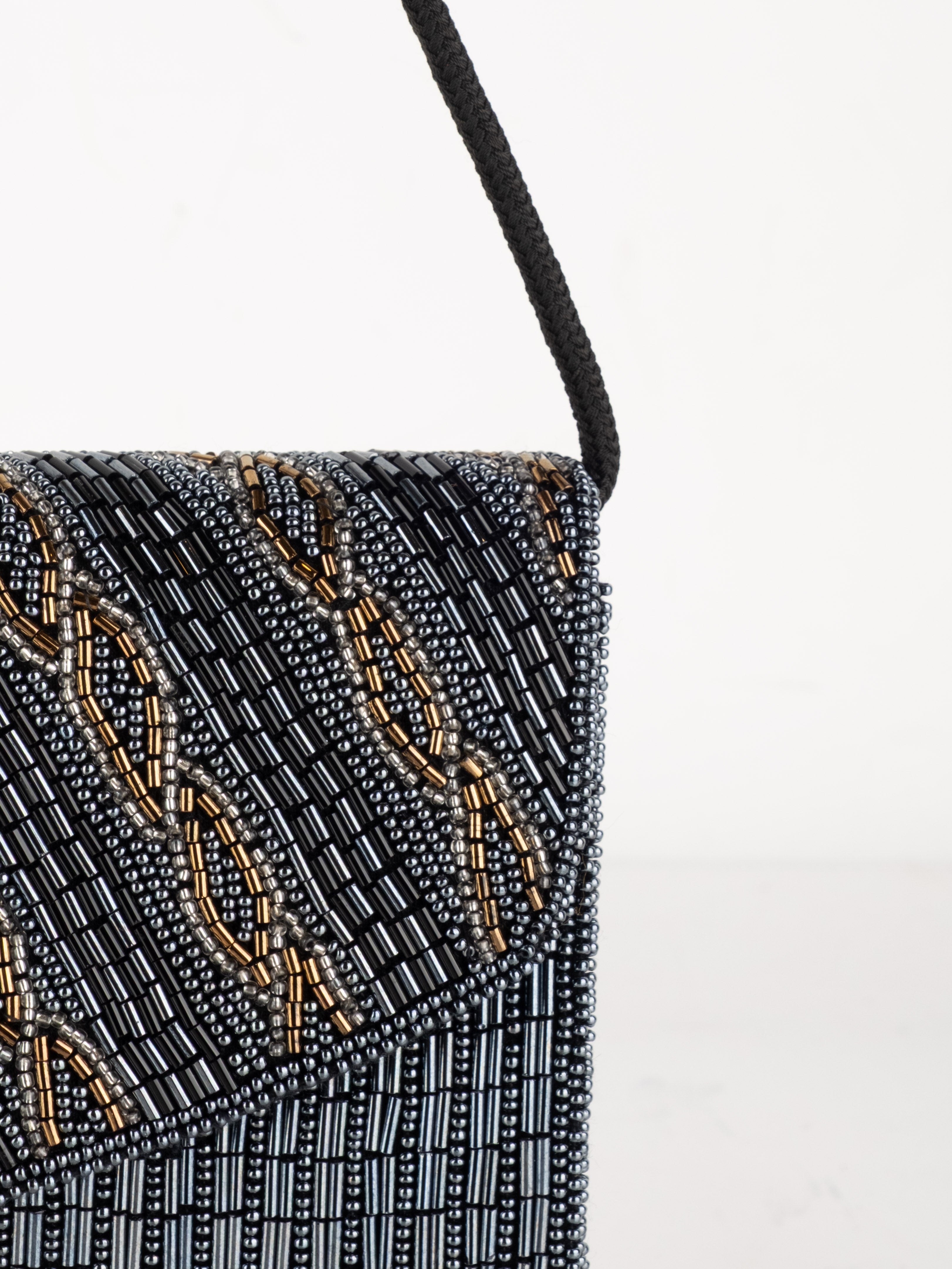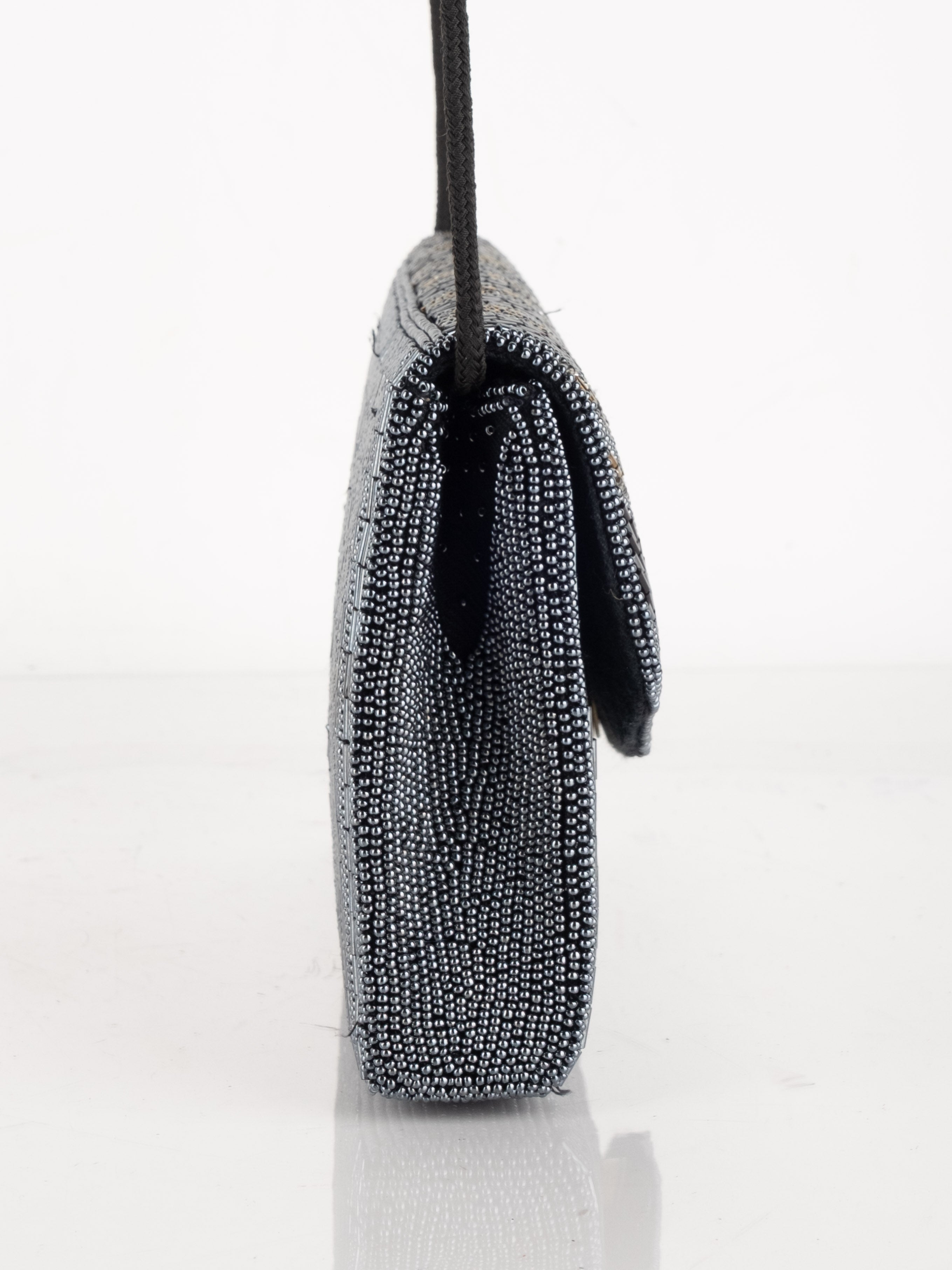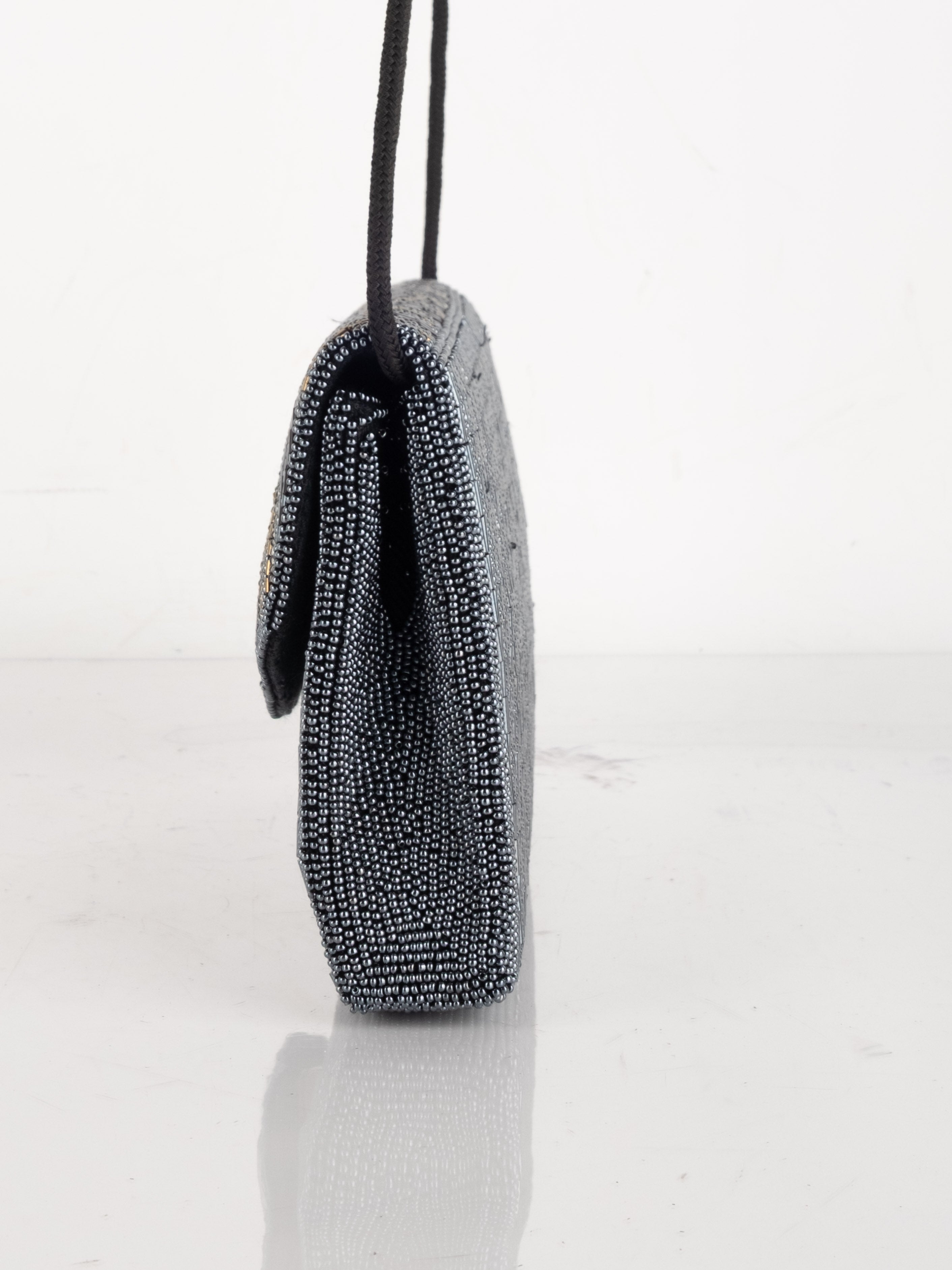 התיק עשוי עבודת חריזה מרהיבה, עם דש קדמי וקו עיצוב מעוגל ועדין. כולל רצועת כתף דקה בצבע שחור ותא פנימי אחד לנשיאת פריטים קטנים.