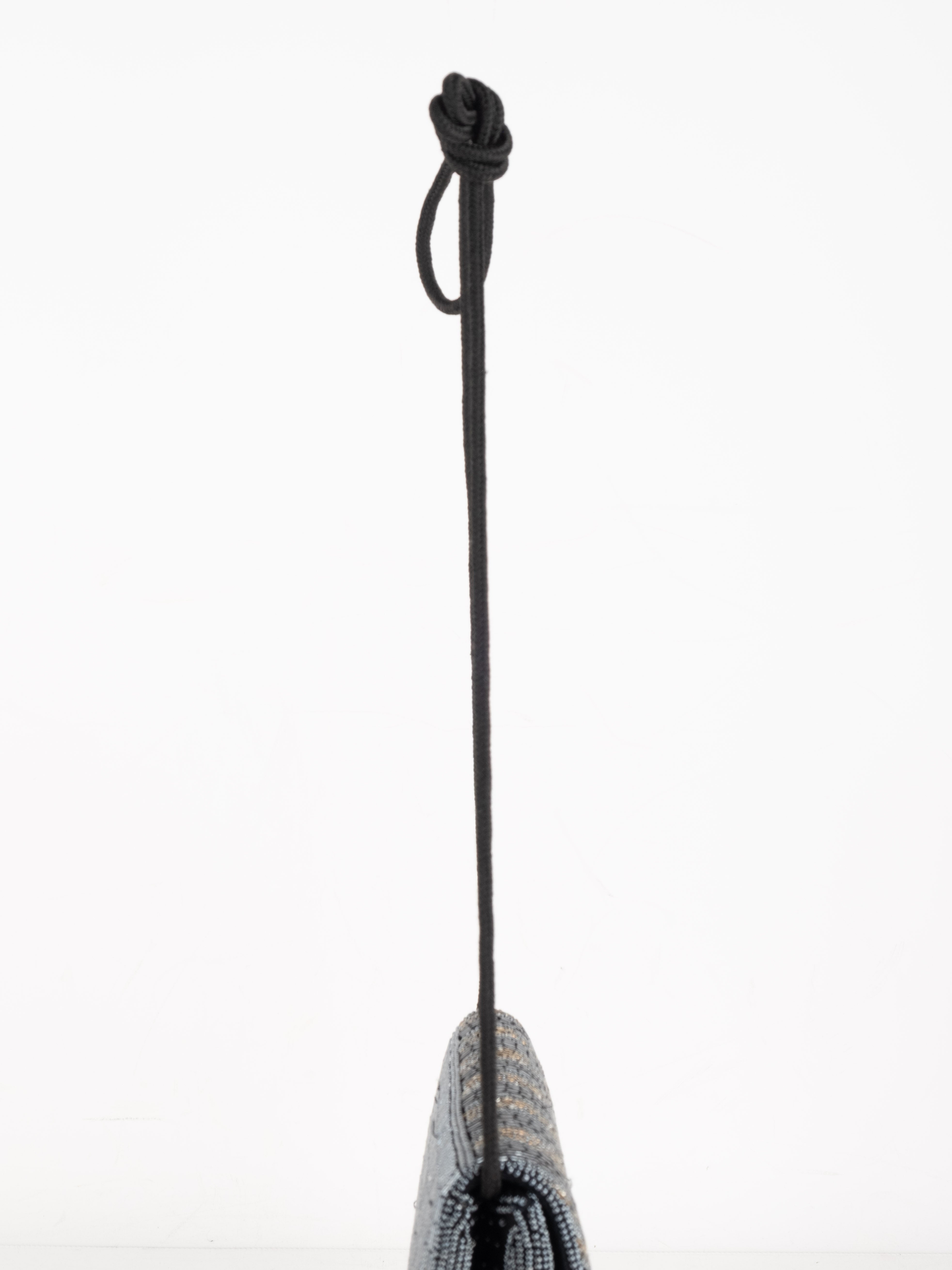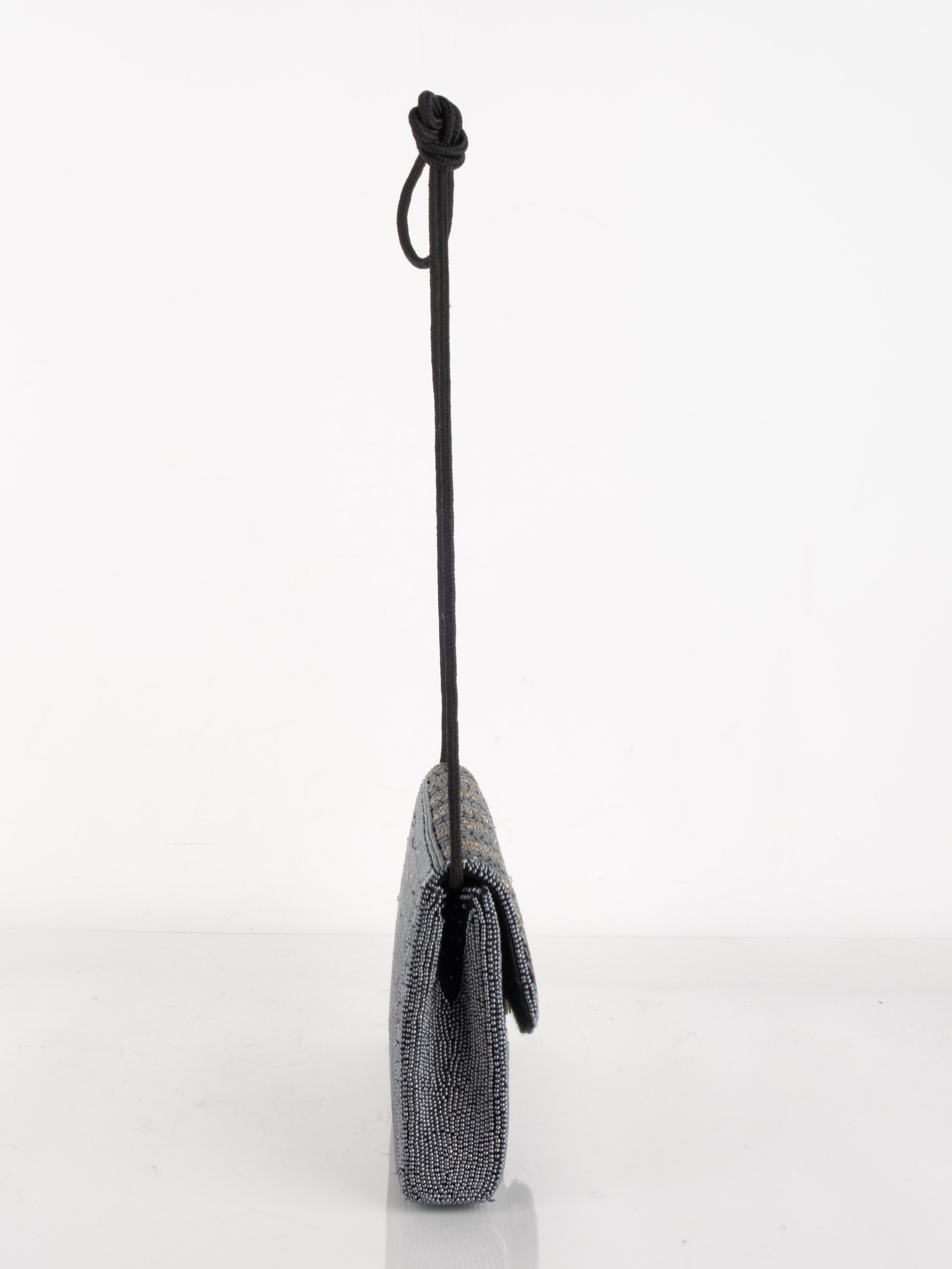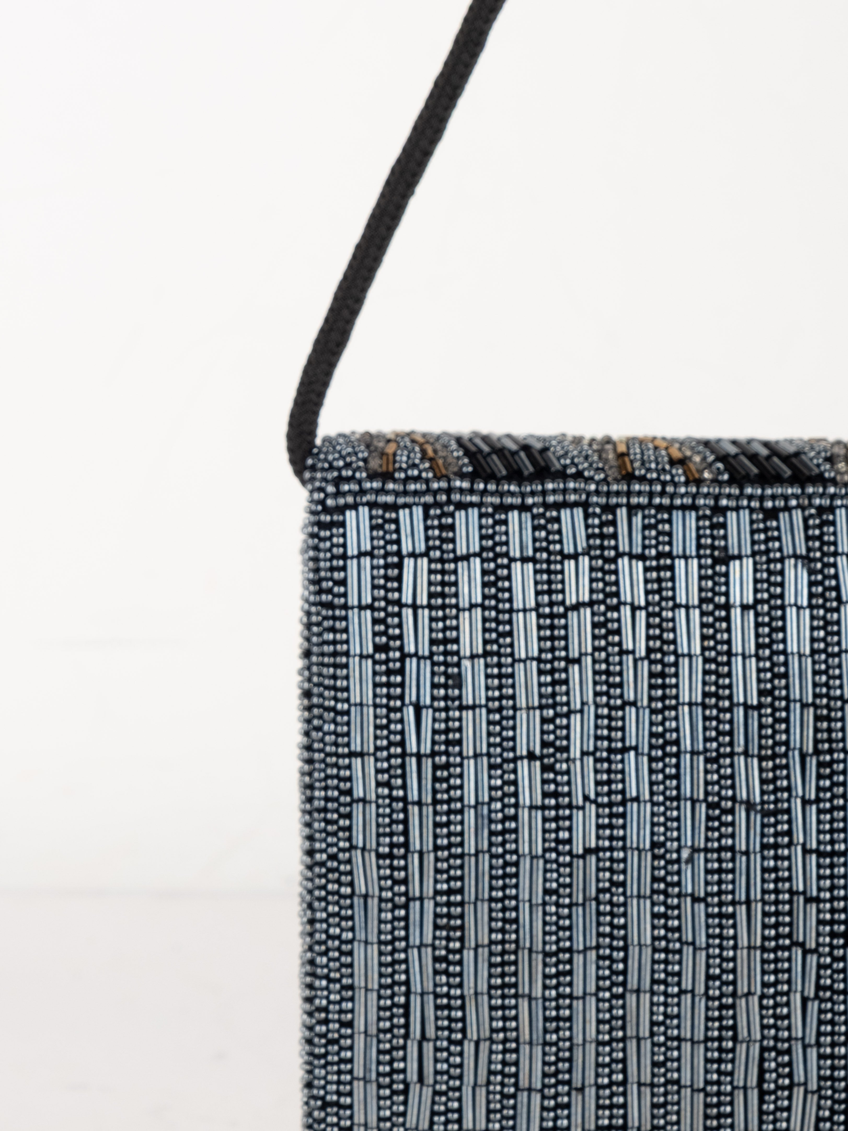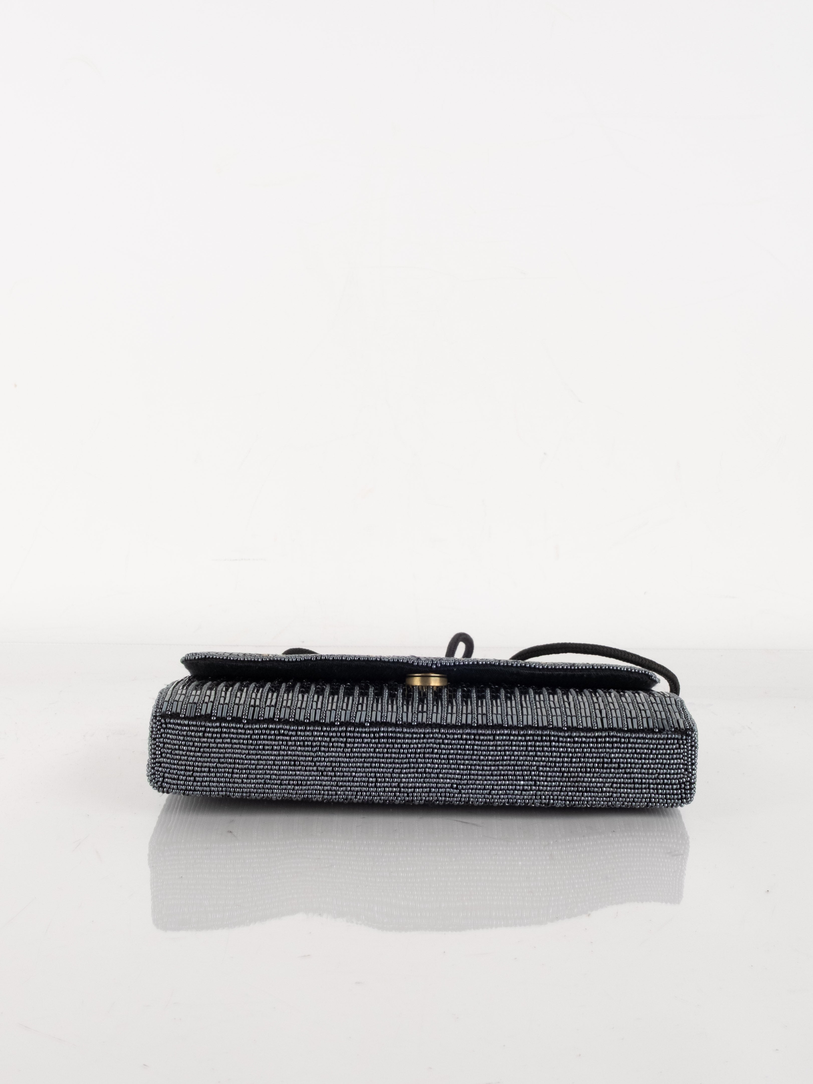 התיק עשוי עבודת חריזה מרהיבה, עם דש קדמי וקו עיצוב מעוגל ועדין. כולל רצועת כתף דקה בצבע שחור ותא פנימי אחד לנשיאת פריטים קטנים.