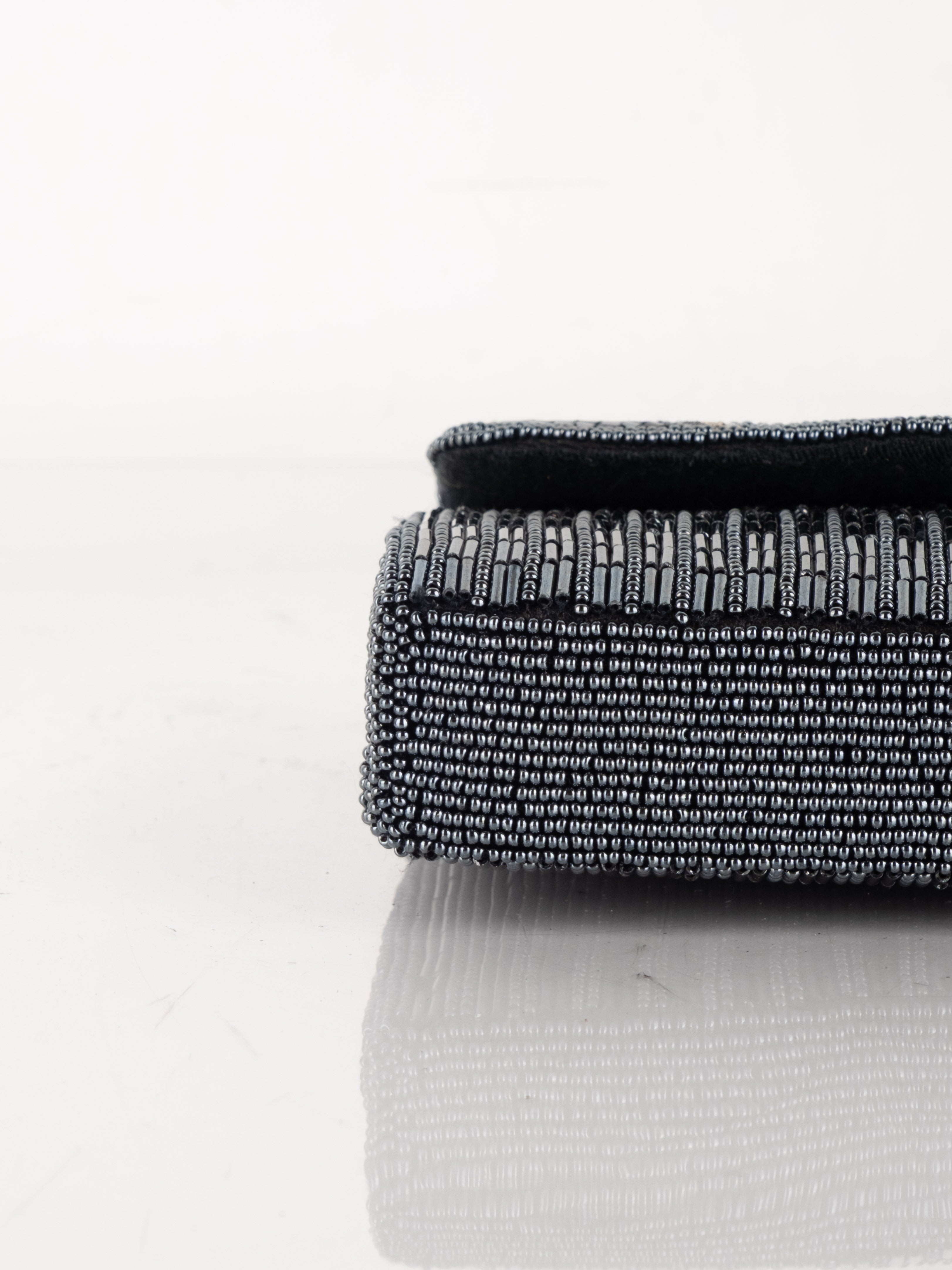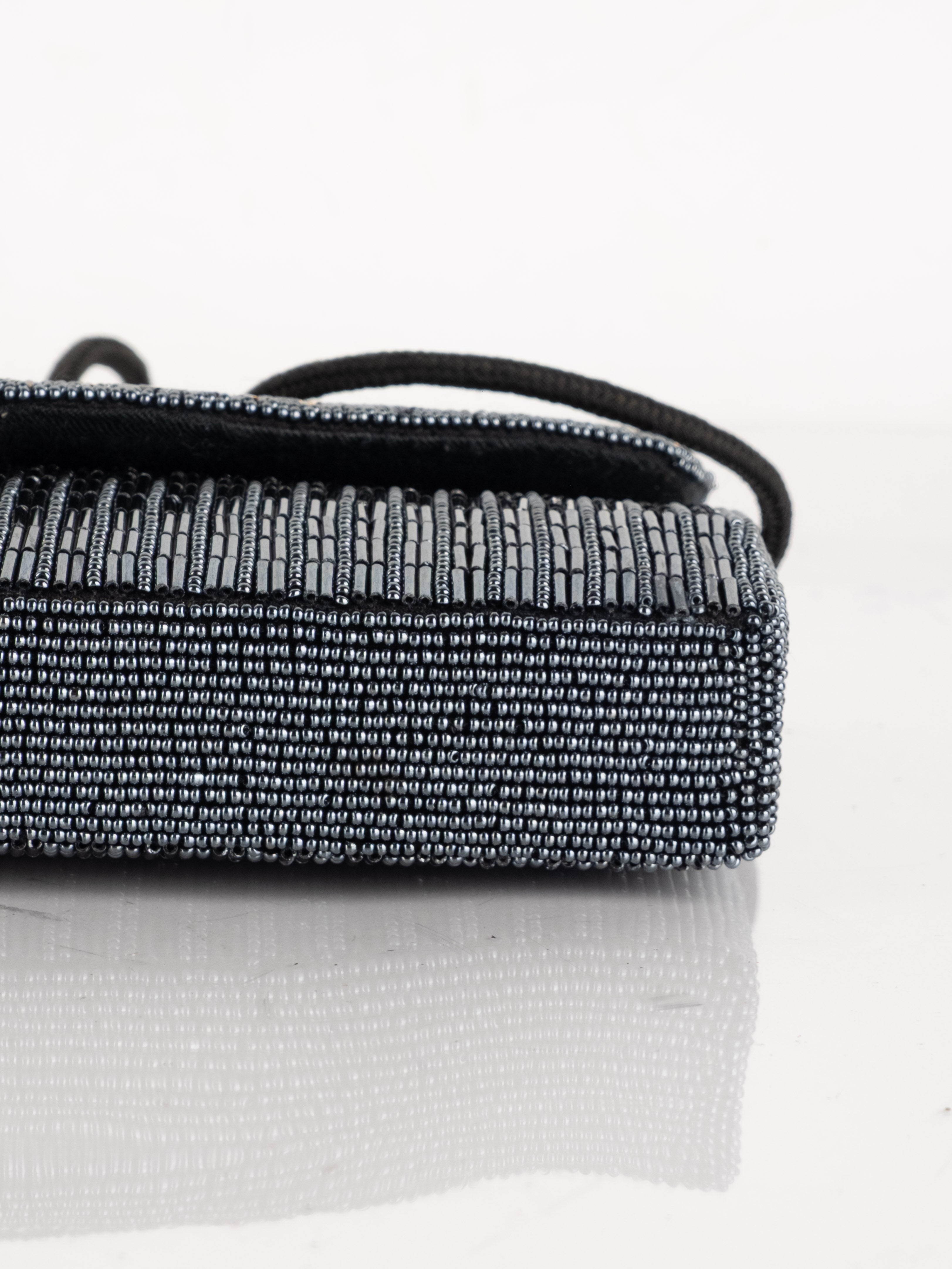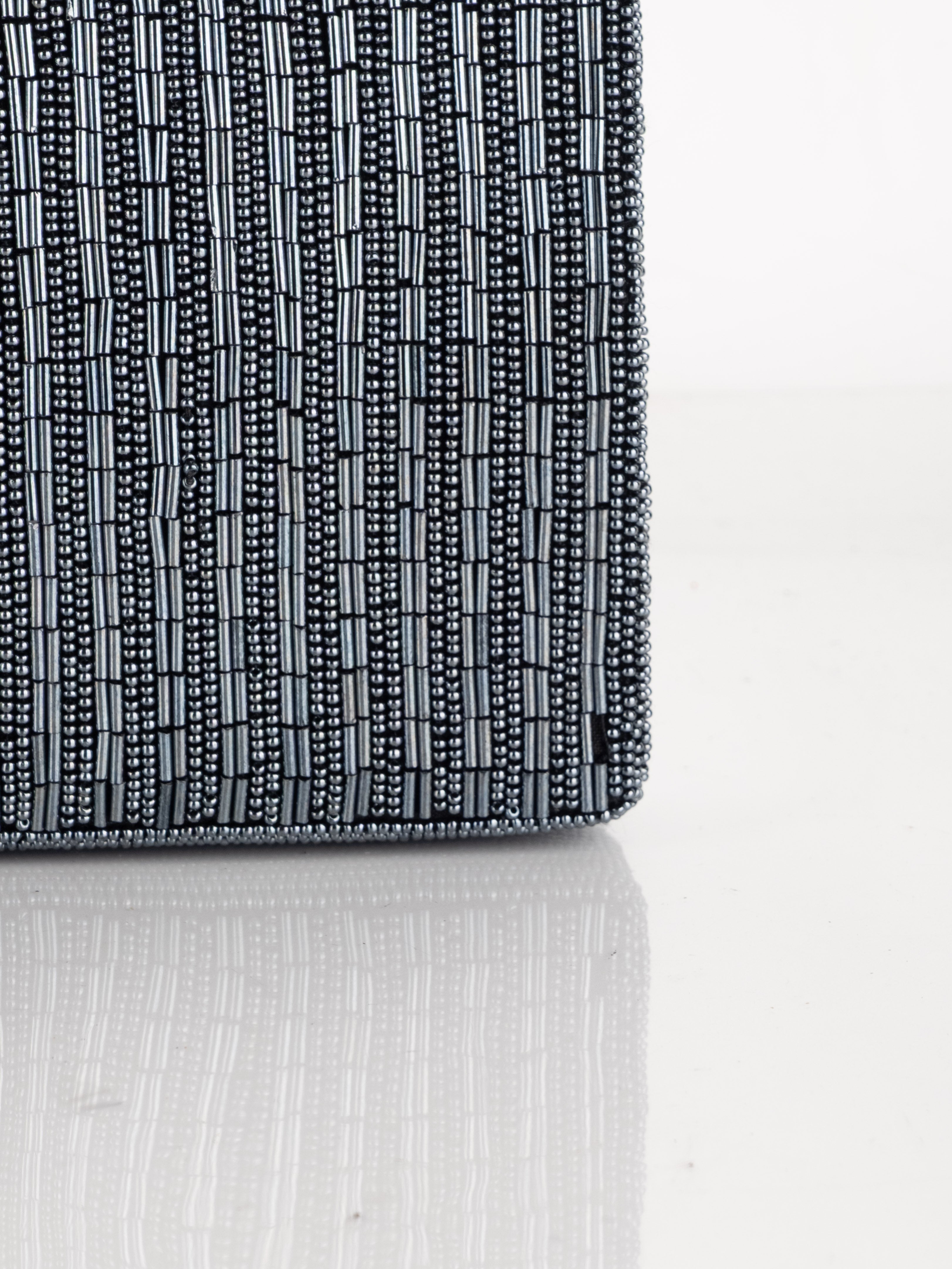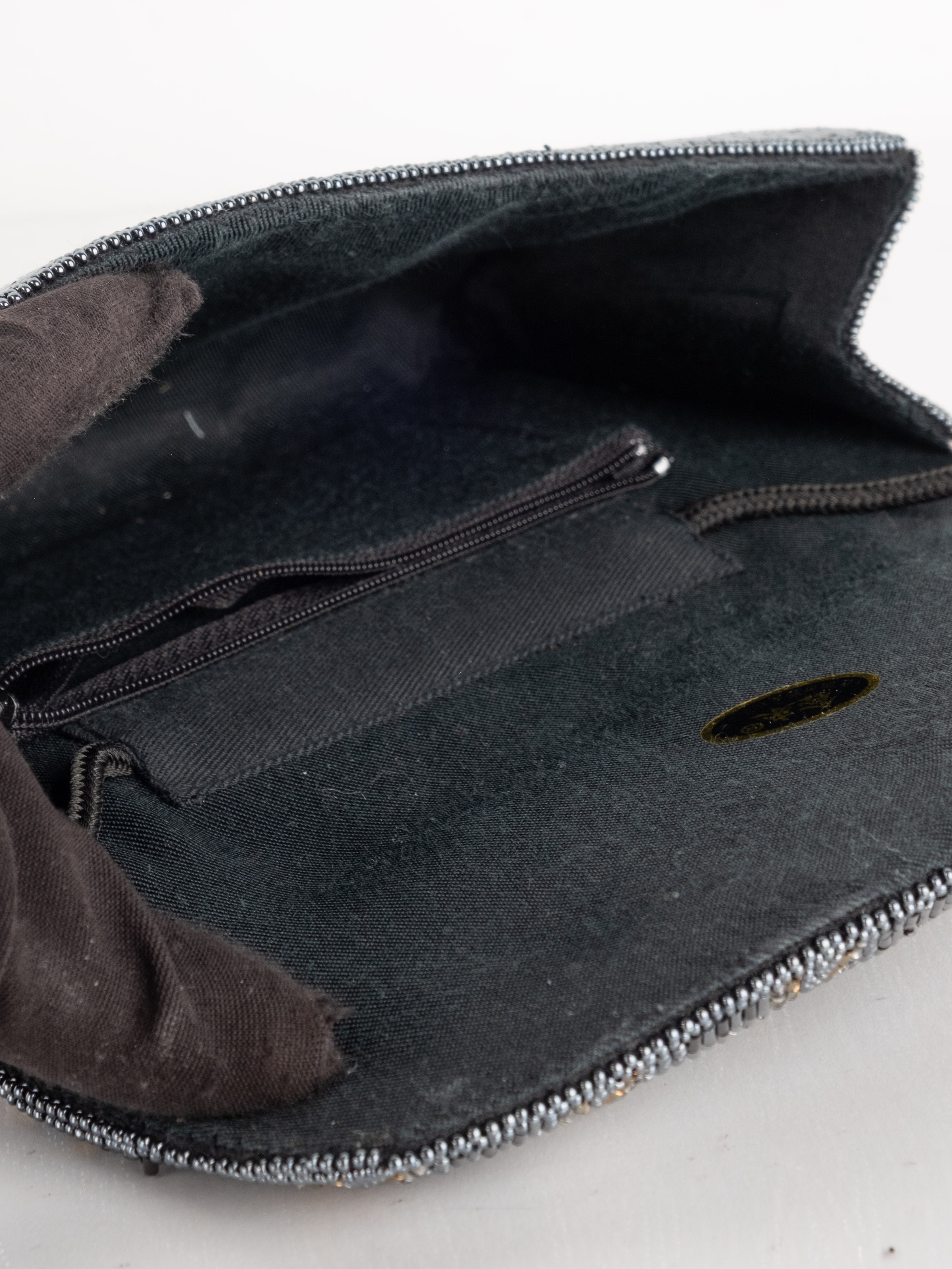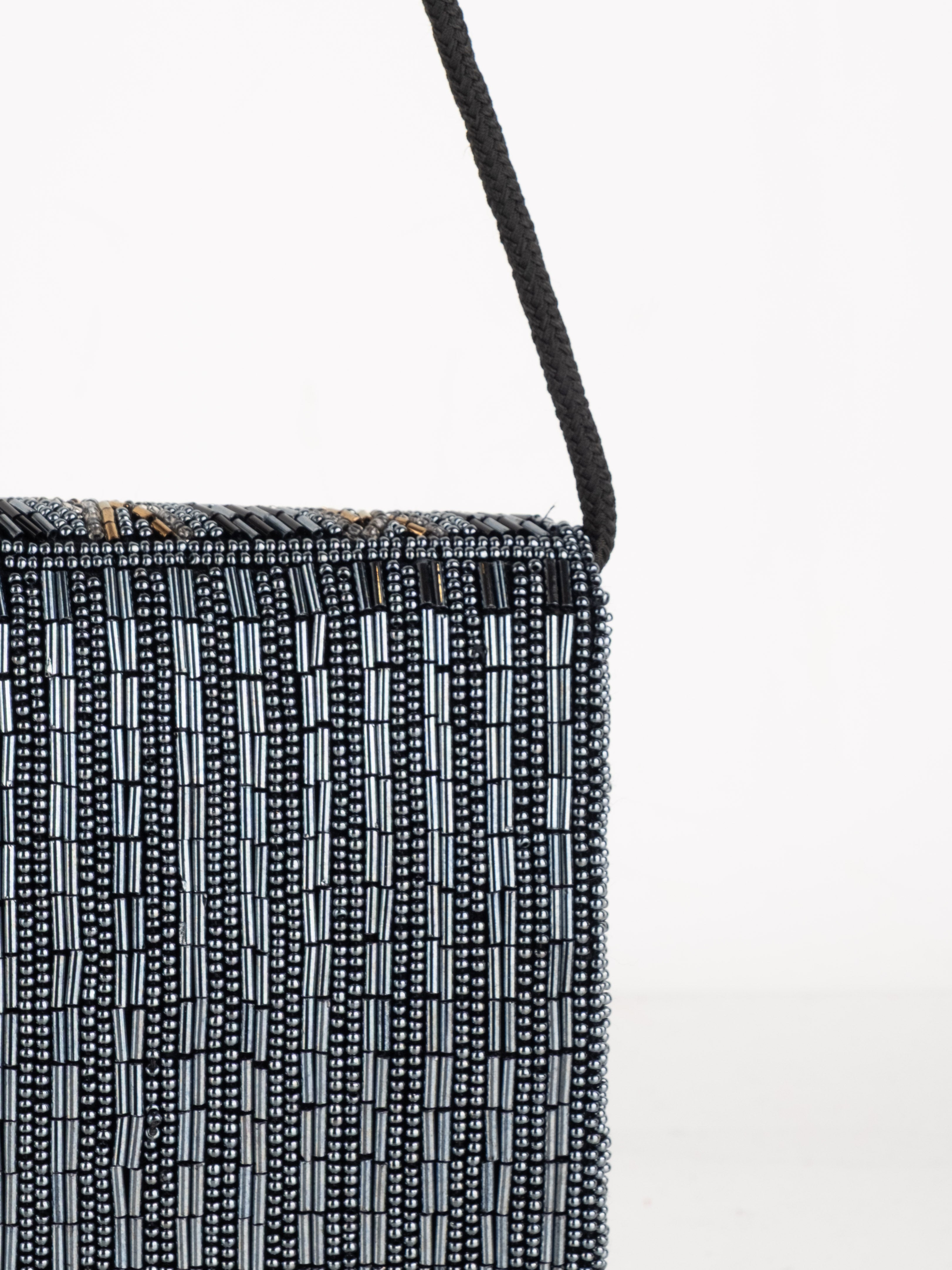 התיק עשוי עבודת חריזה מרהיבה, עם דש קדמי וקו עיצוב מעוגל ועדין. כולל רצועת כתף דקה בצבע שחור ותא פנימי אחד לנשיאת פריטים קטנים.