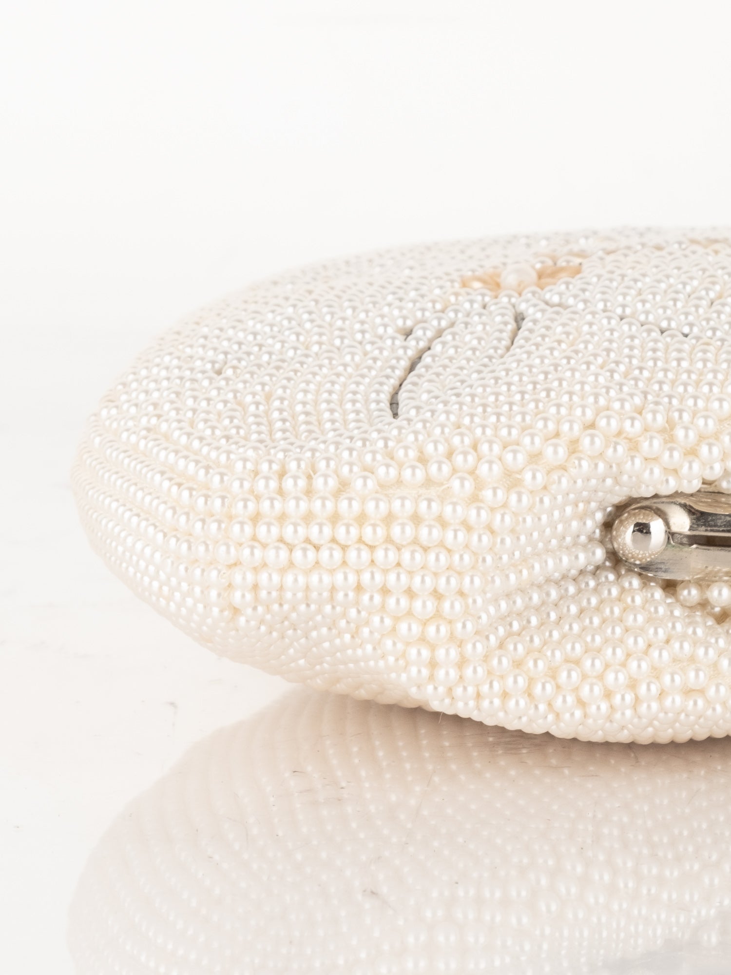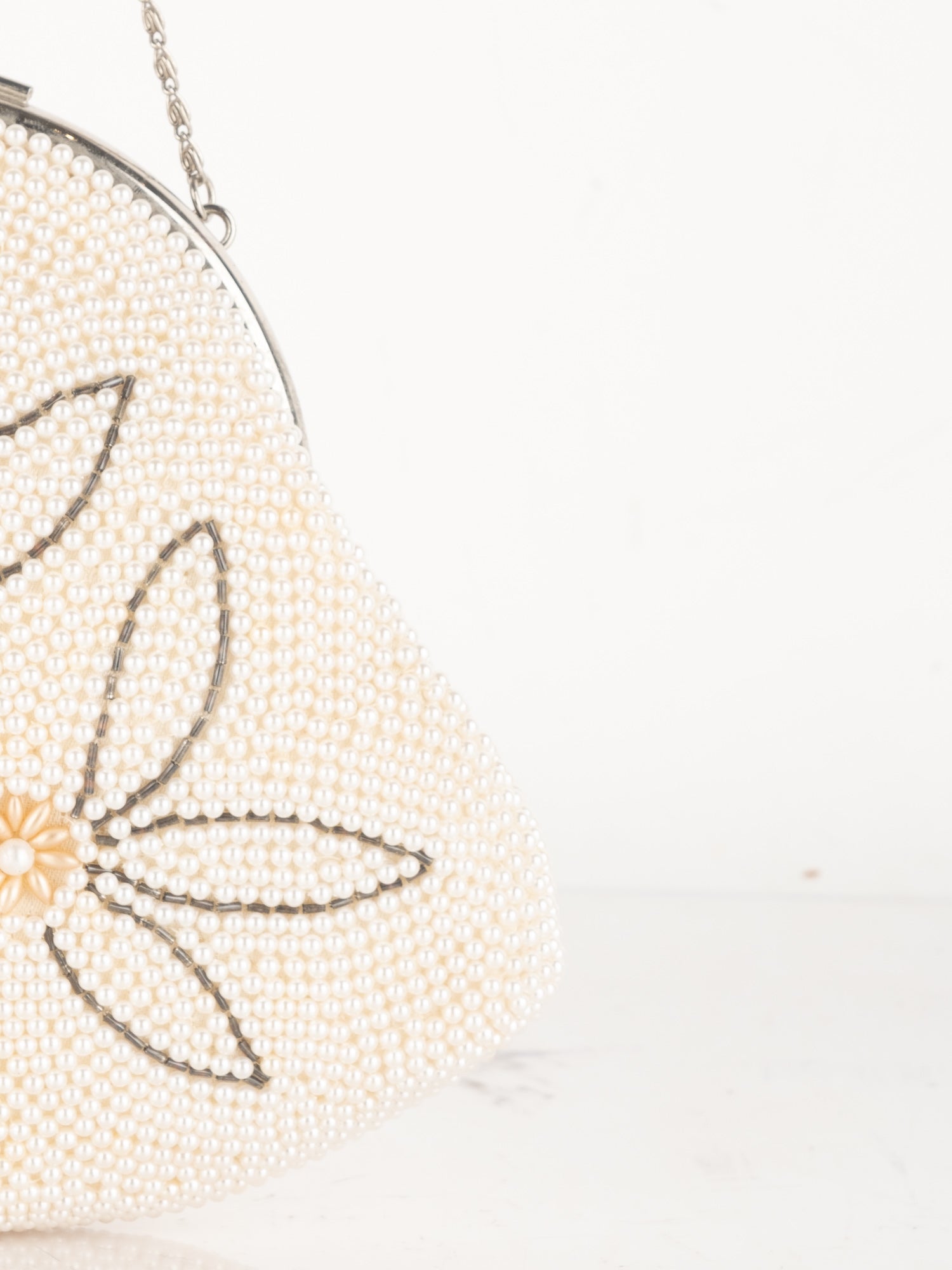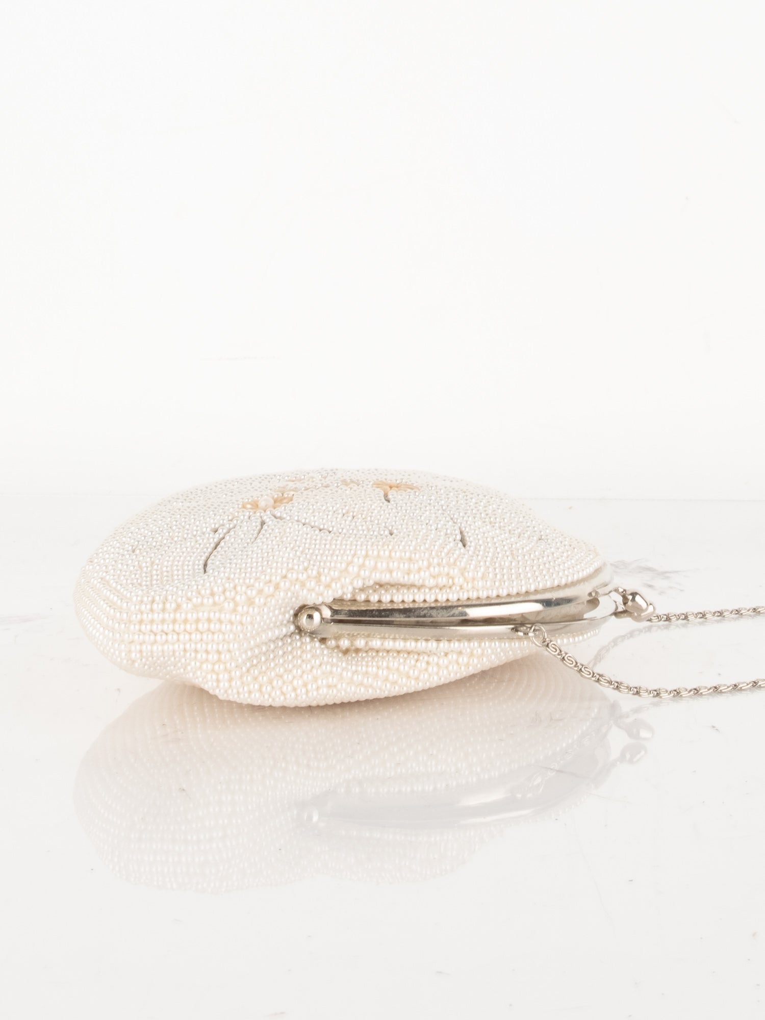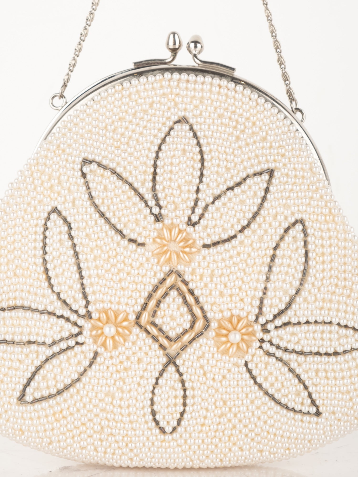 חרוזי שמנת דקים, דוגמת פרח בחזית, סגירת קליפס, ידית מתכת קצרה.