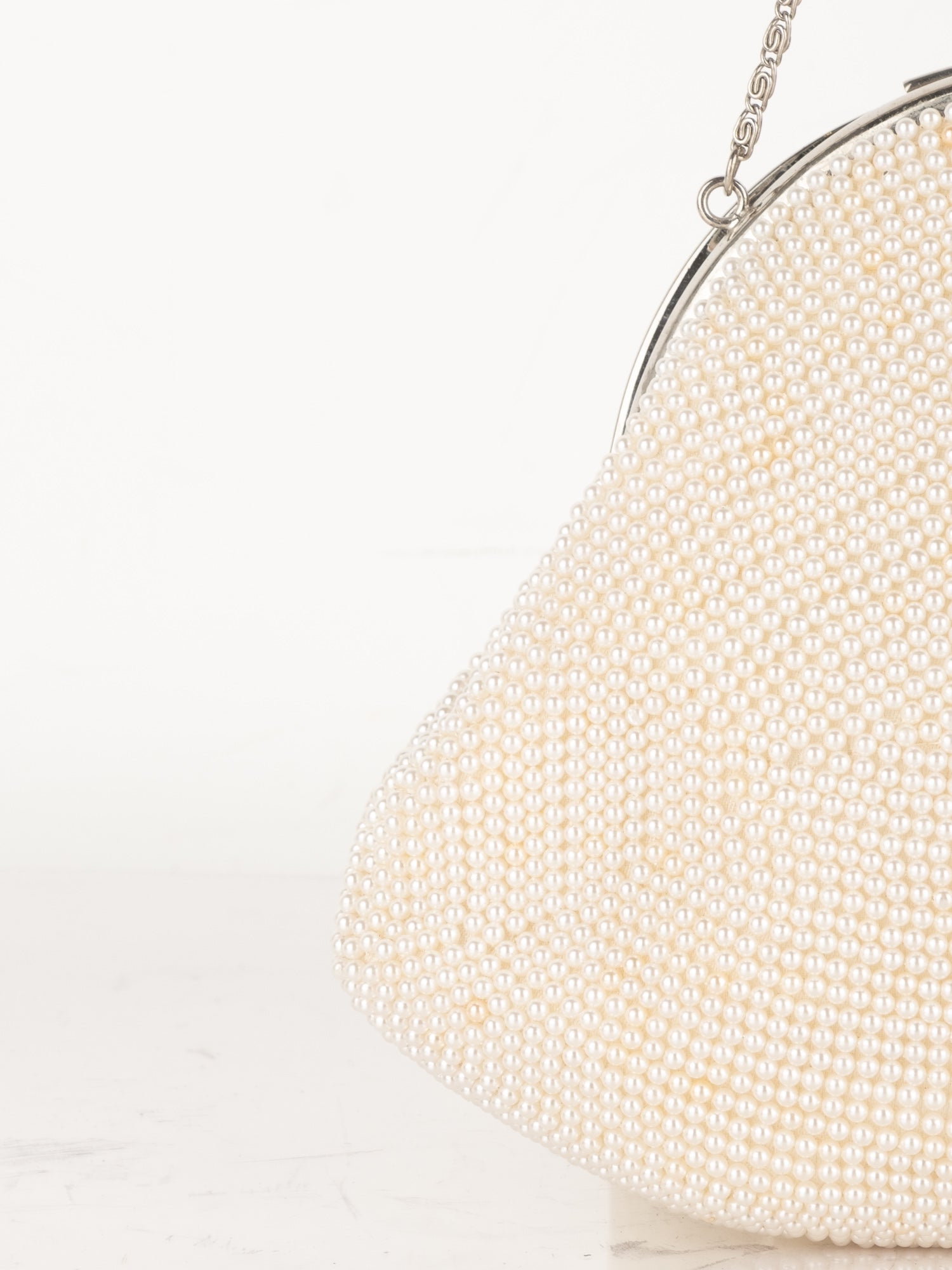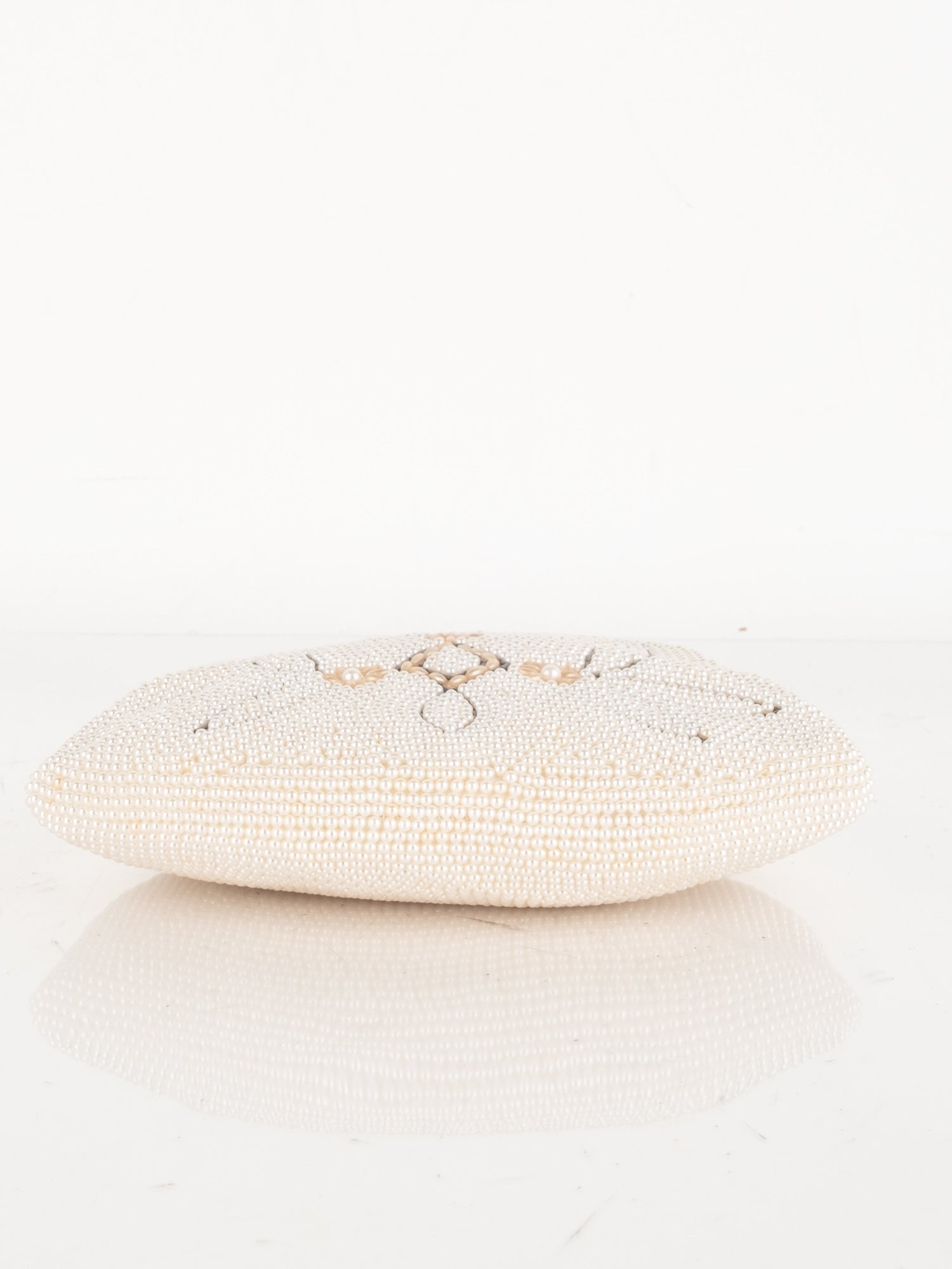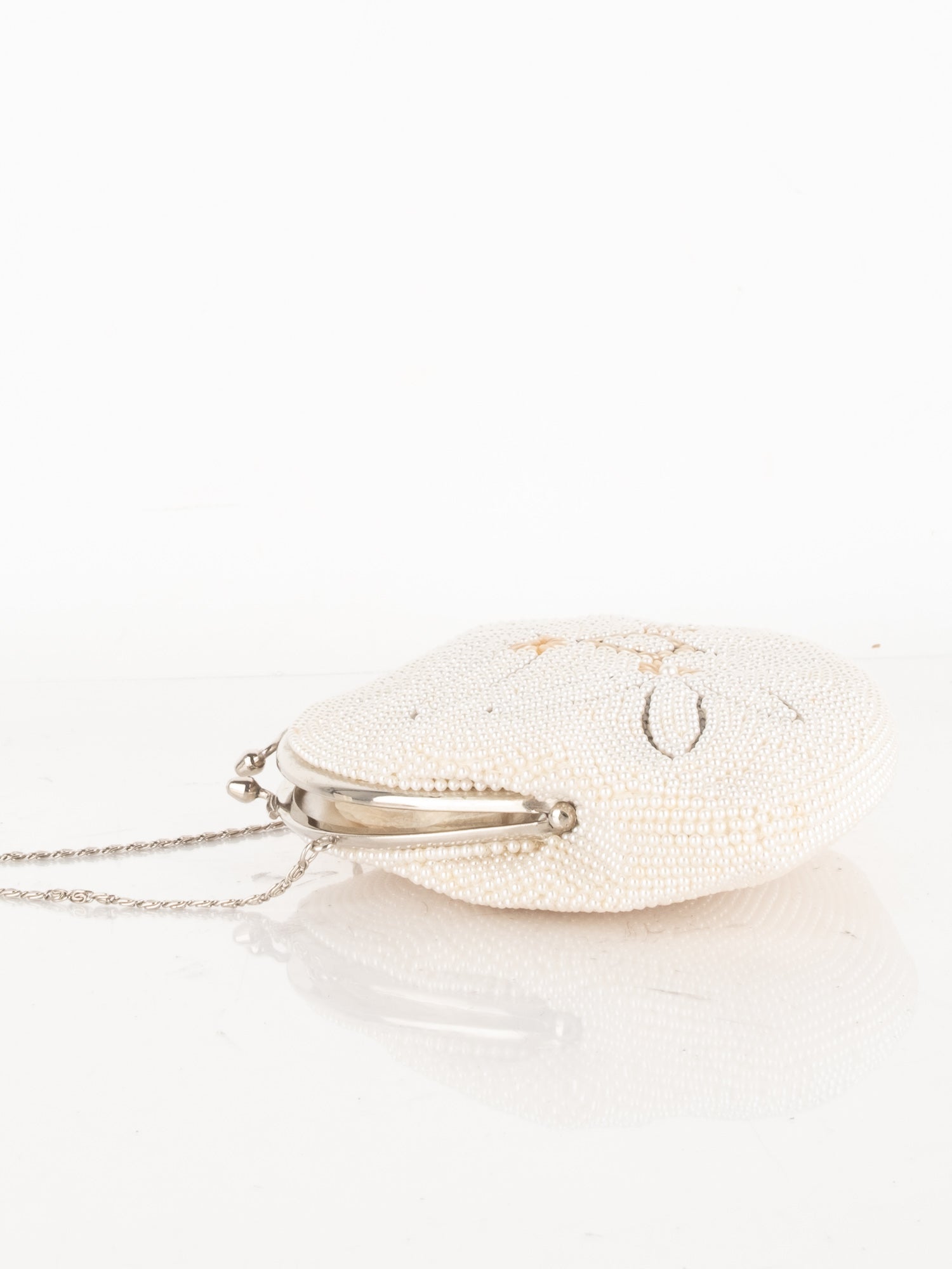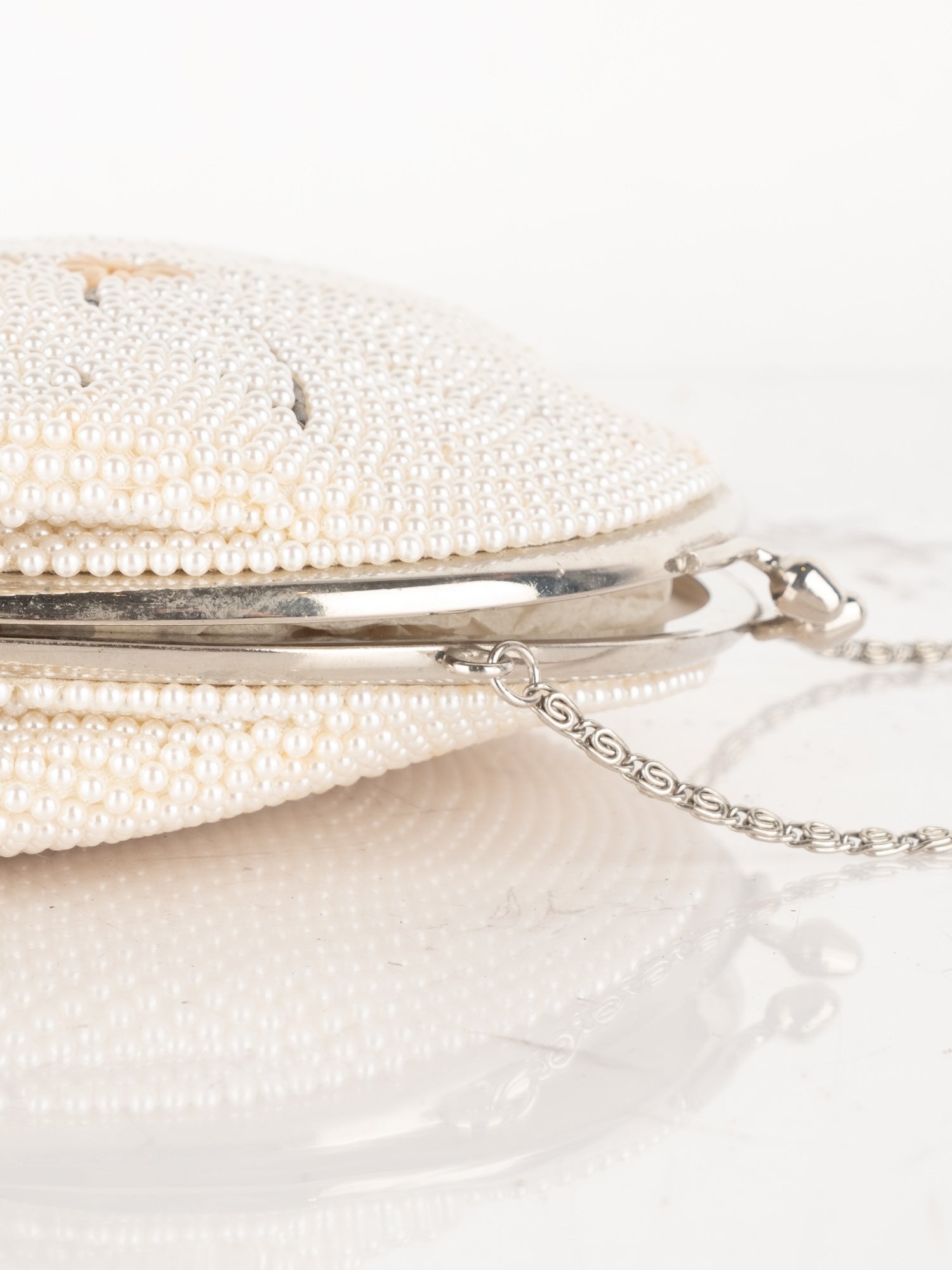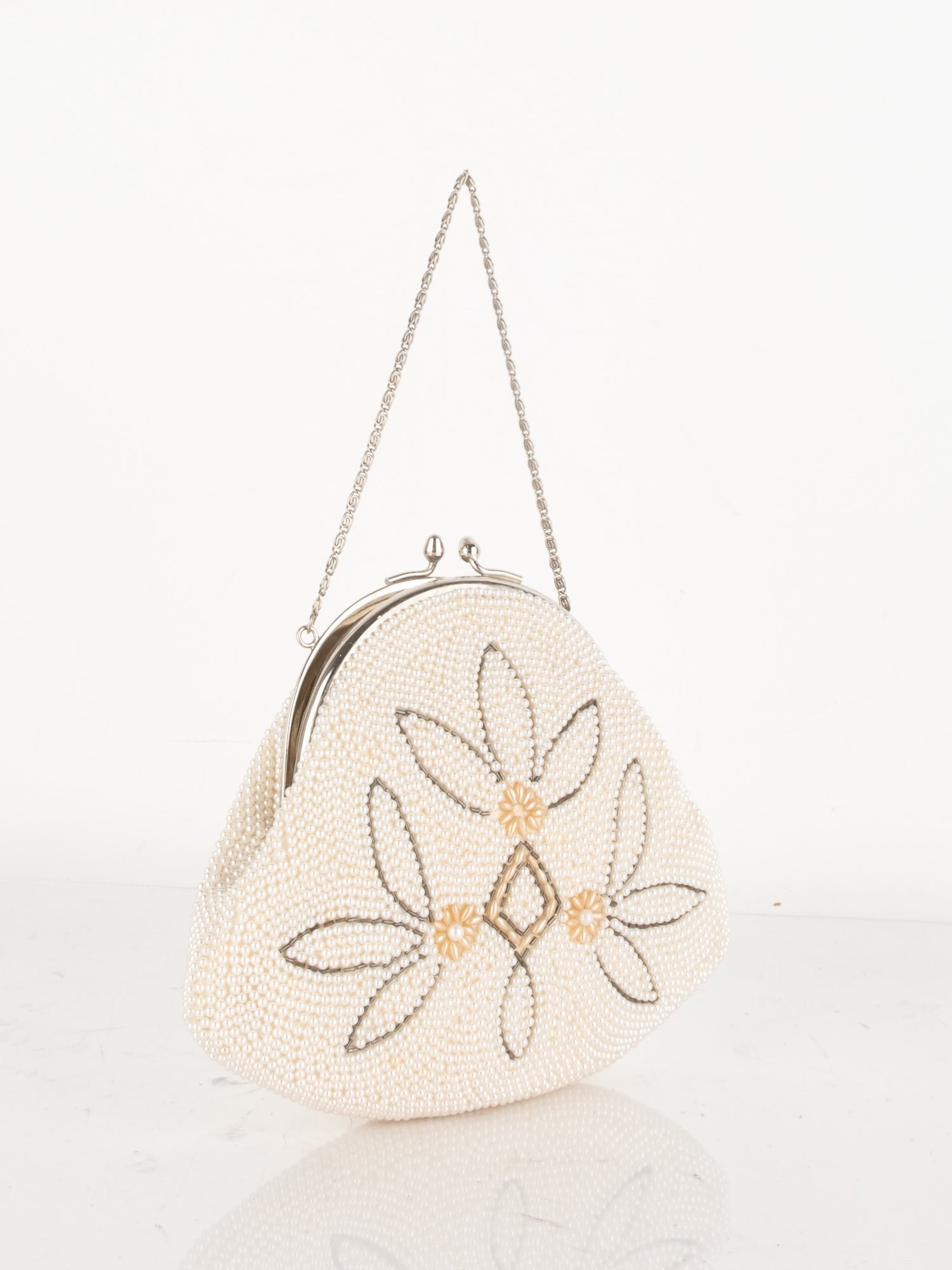 חרוזי שמנת דקים, דוגמת פרח בחזית, סגירת קליפס, ידית מתכת קצרה.