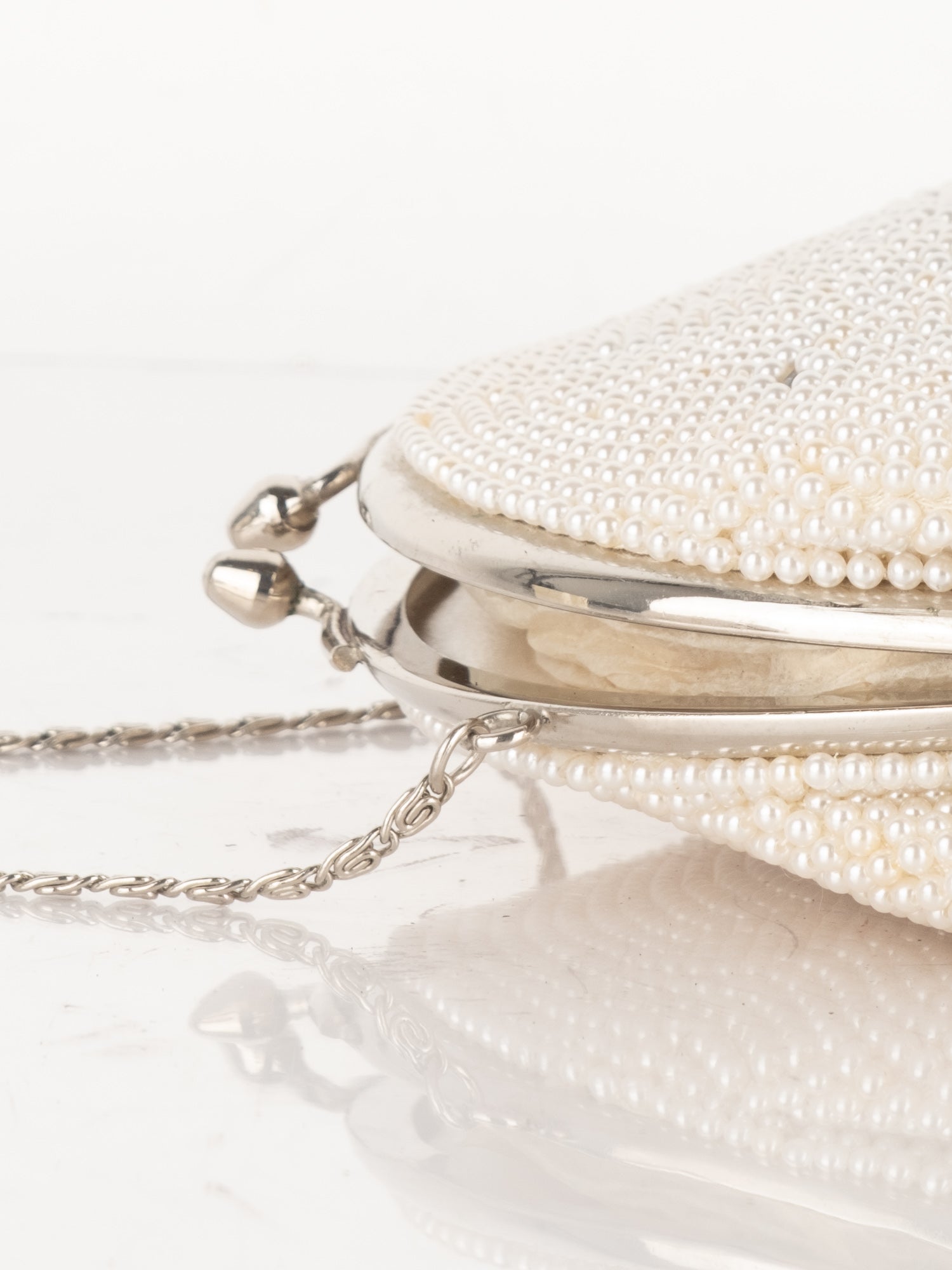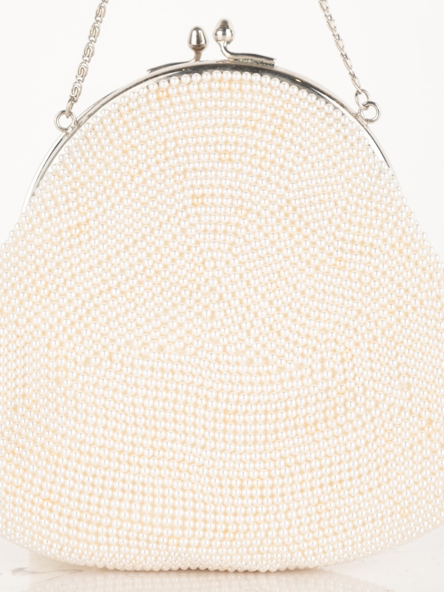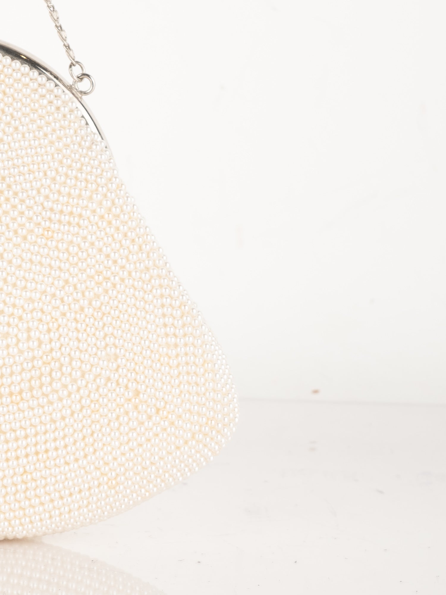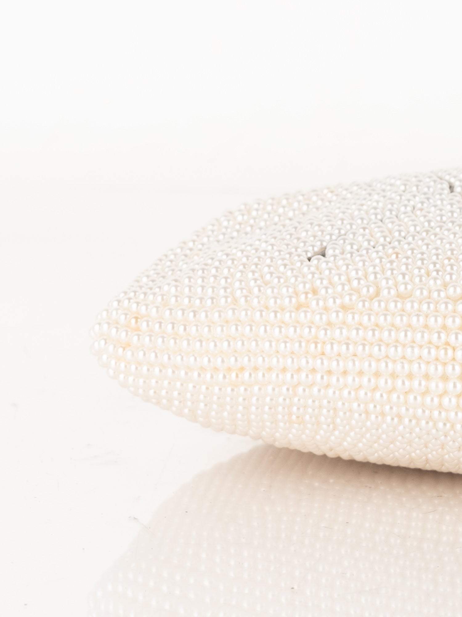 חרוזי שמנת דקים, דוגמת פרח בחזית, סגירת קליפס, ידית מתכת קצרה.