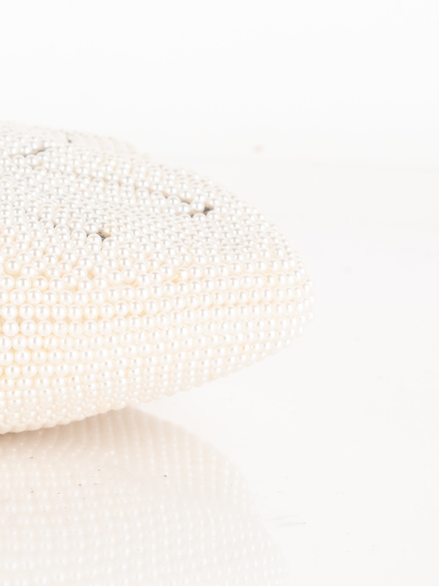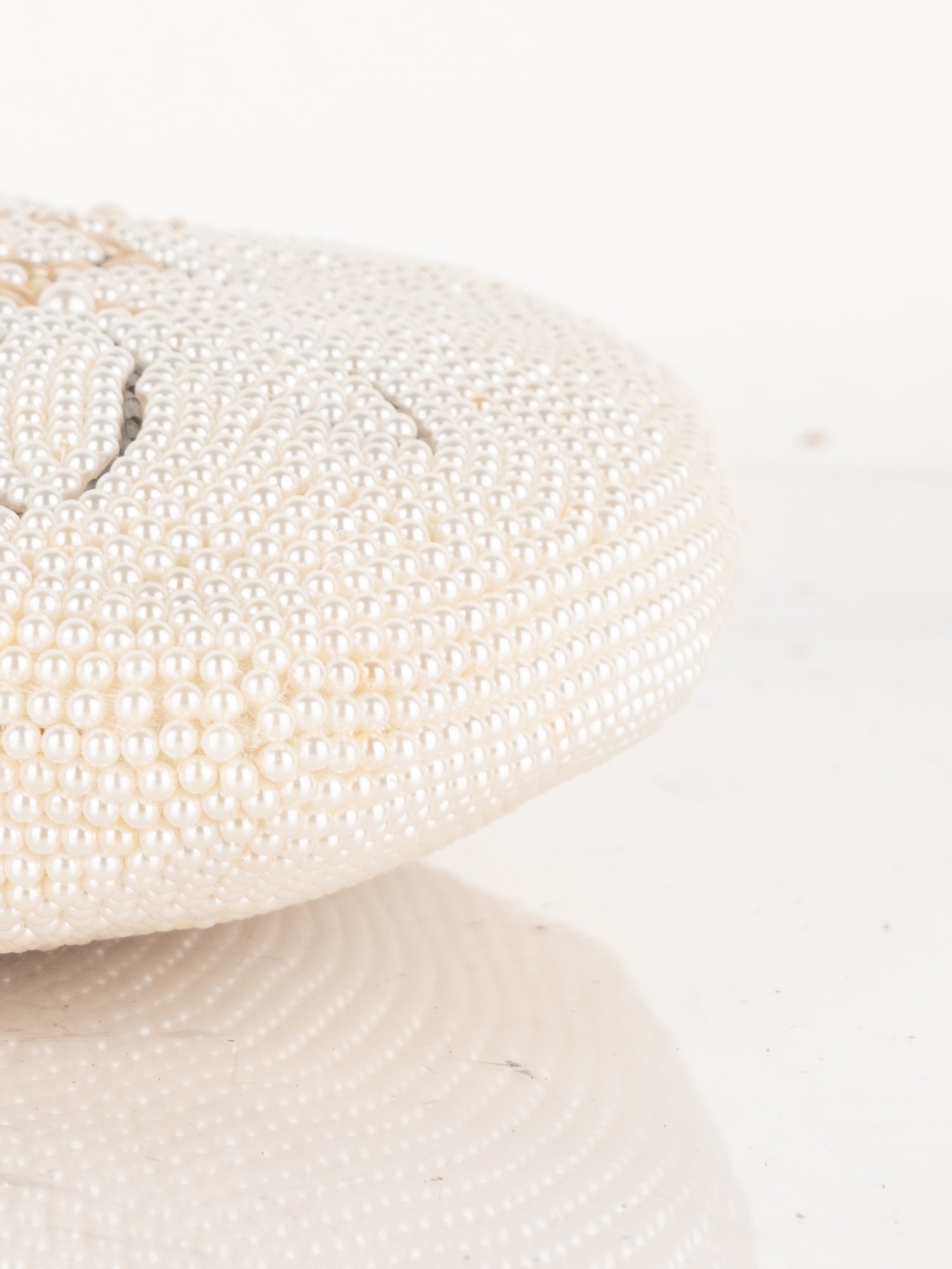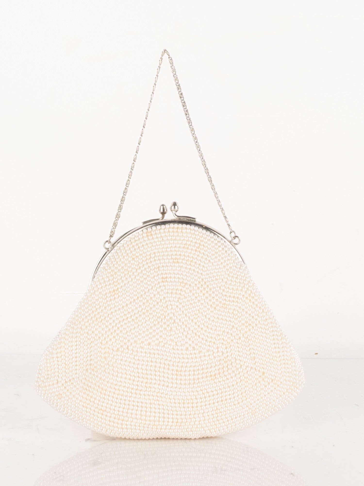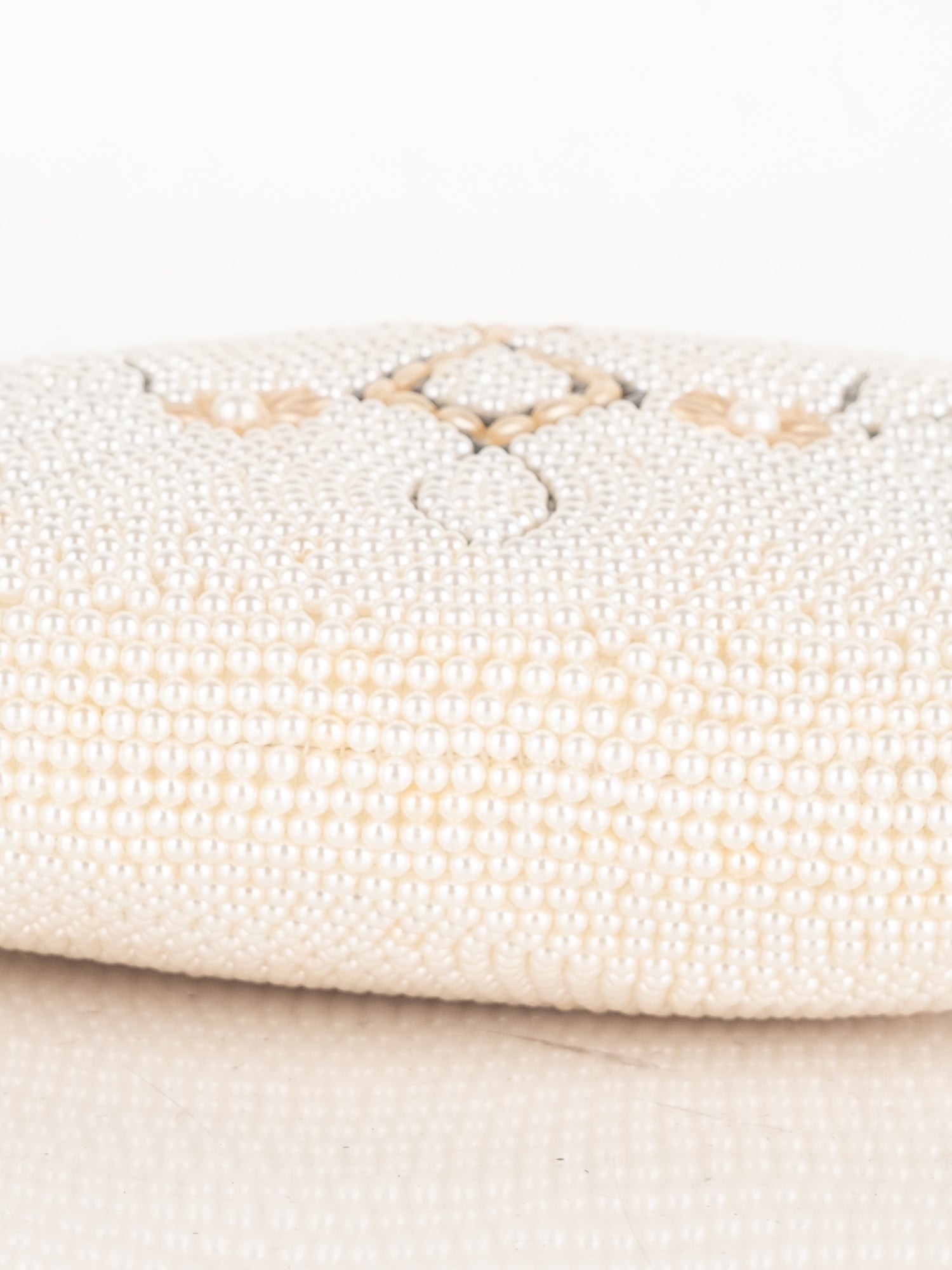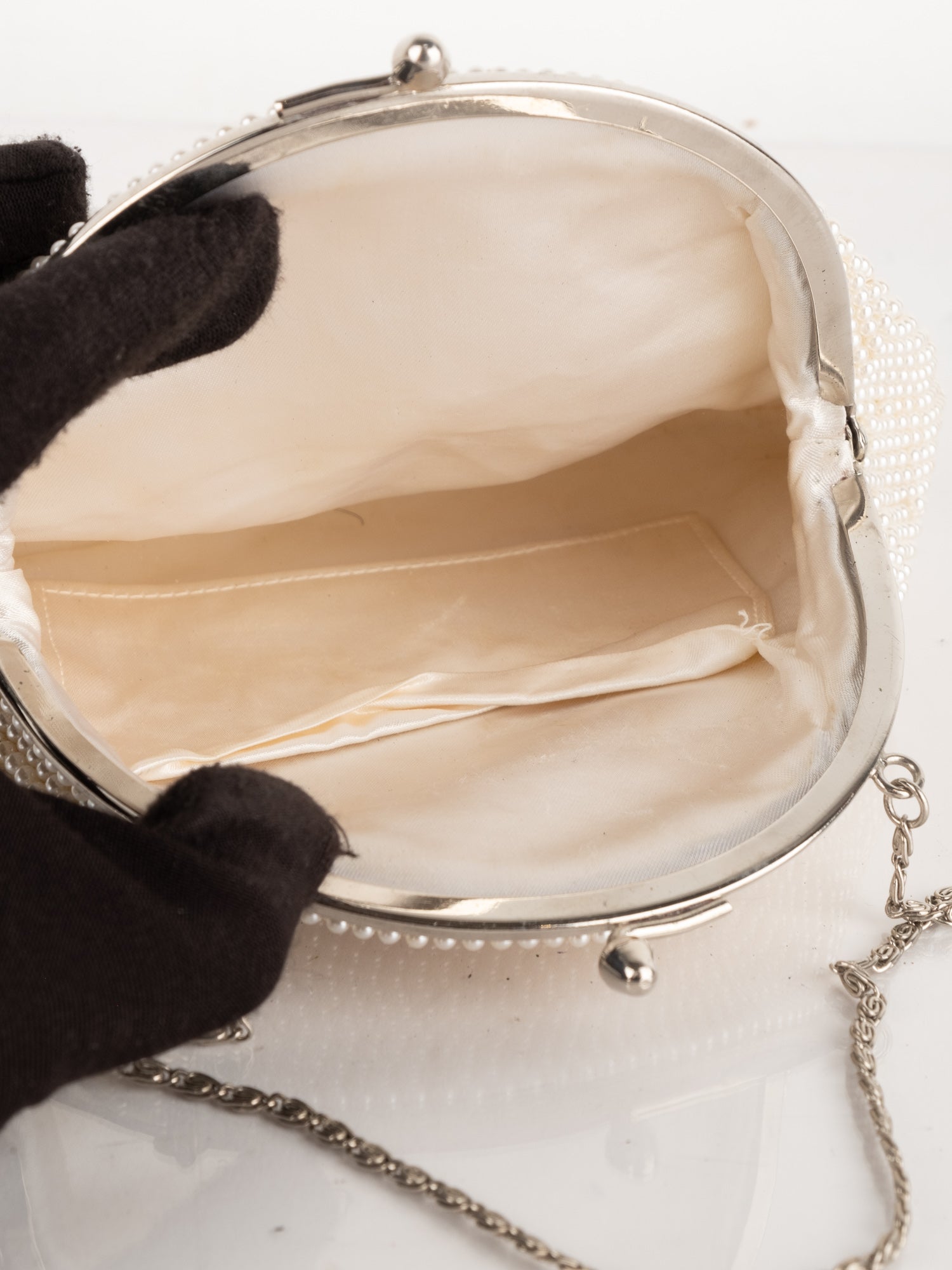 חרוזי שמנת דקים, דוגמת פרח בחזית, סגירת קליפס, ידית מתכת קצרה.