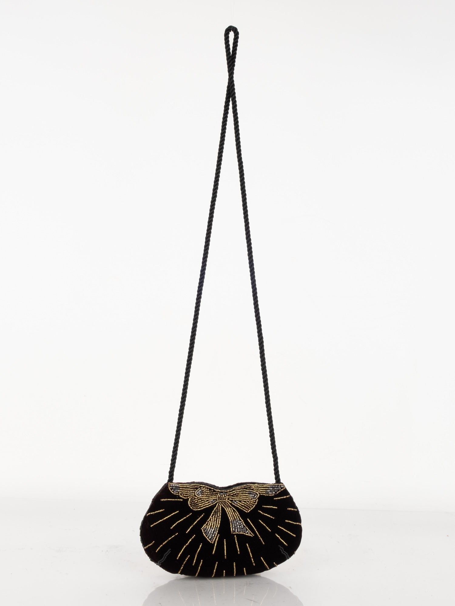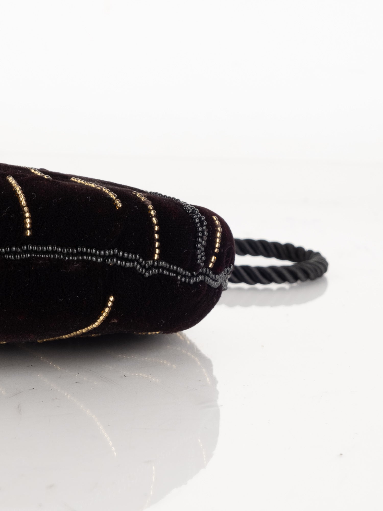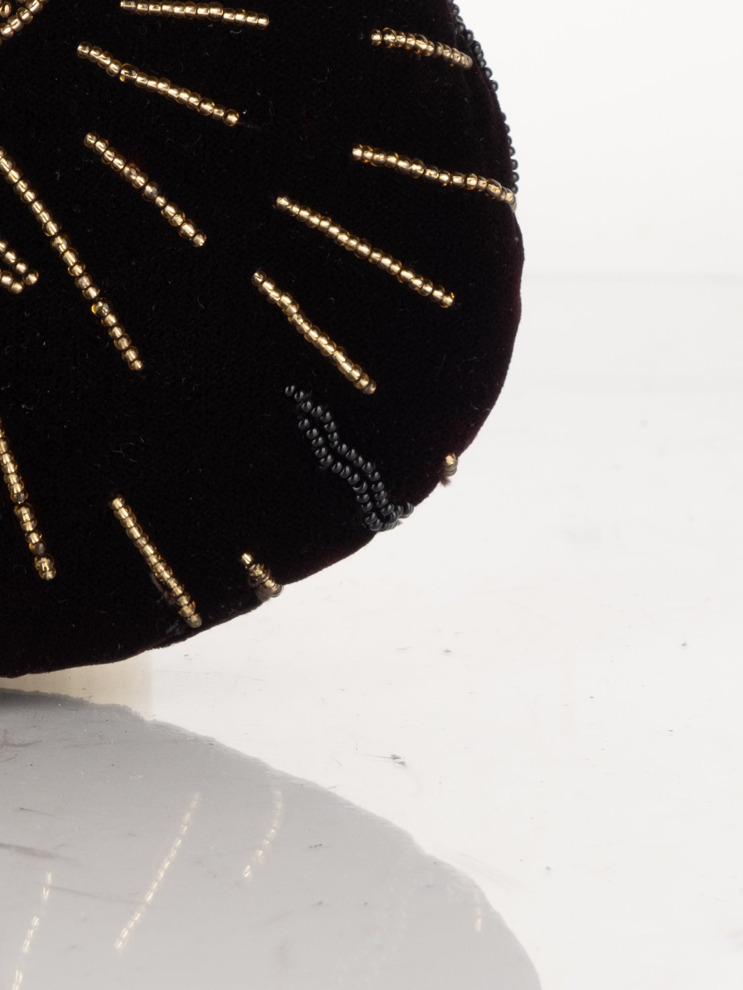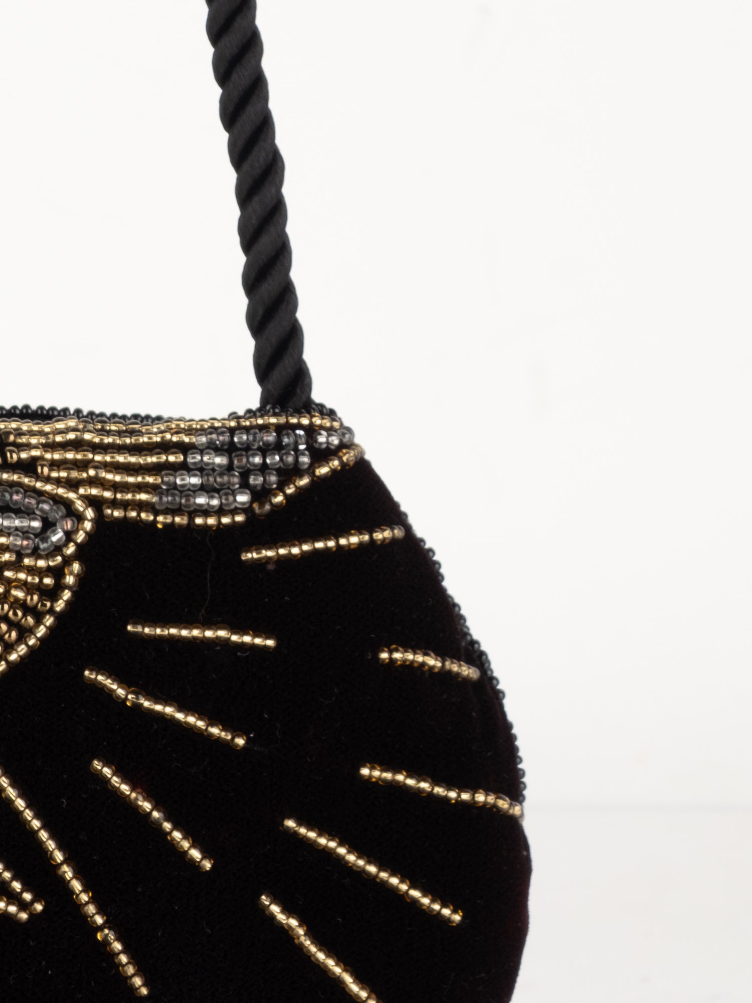 קטיפה שחורה, חרוזי זהב בדוגמה מעוגלת, רצועת כתף ארוכה, מבנה עגול רך.