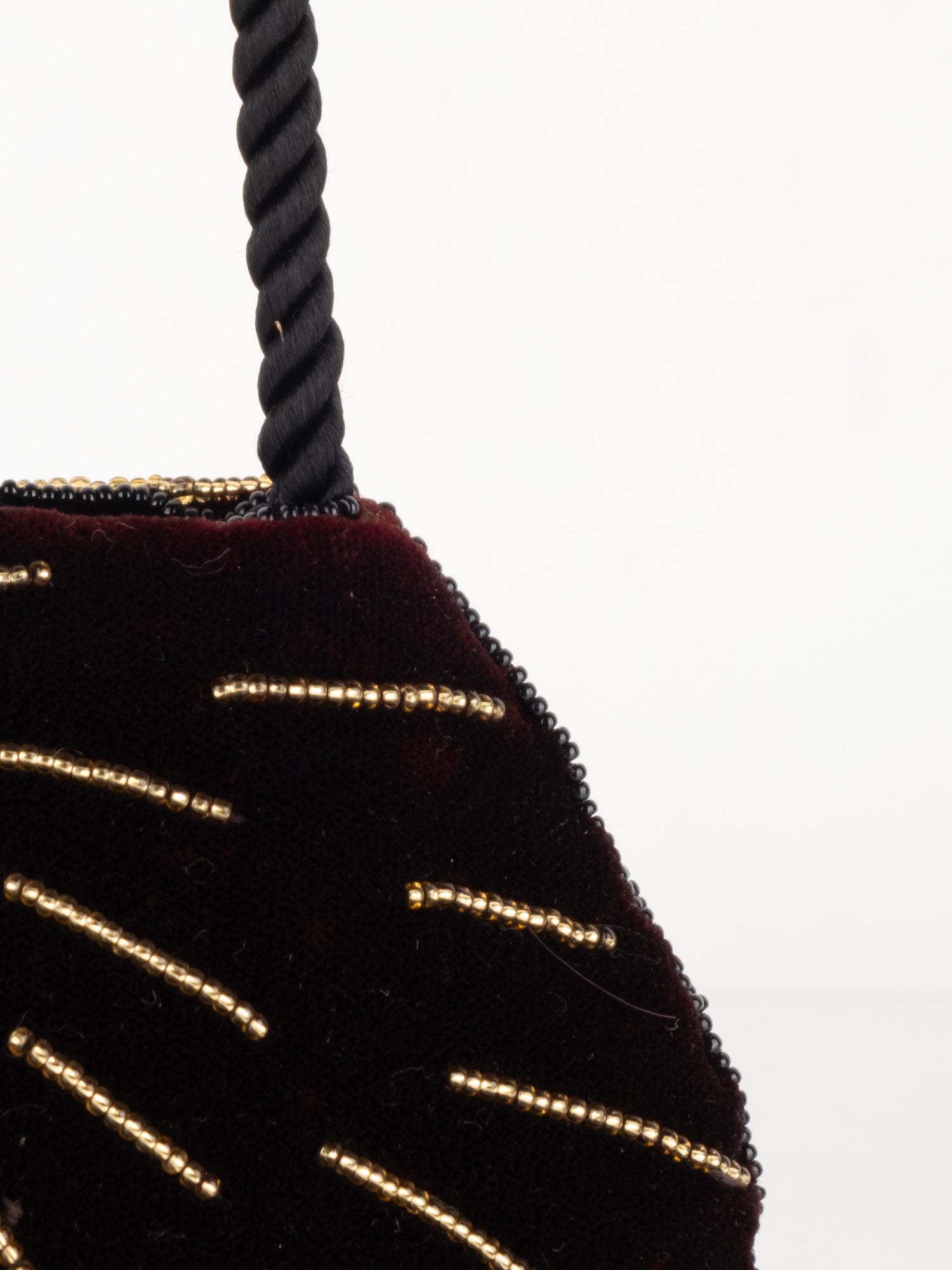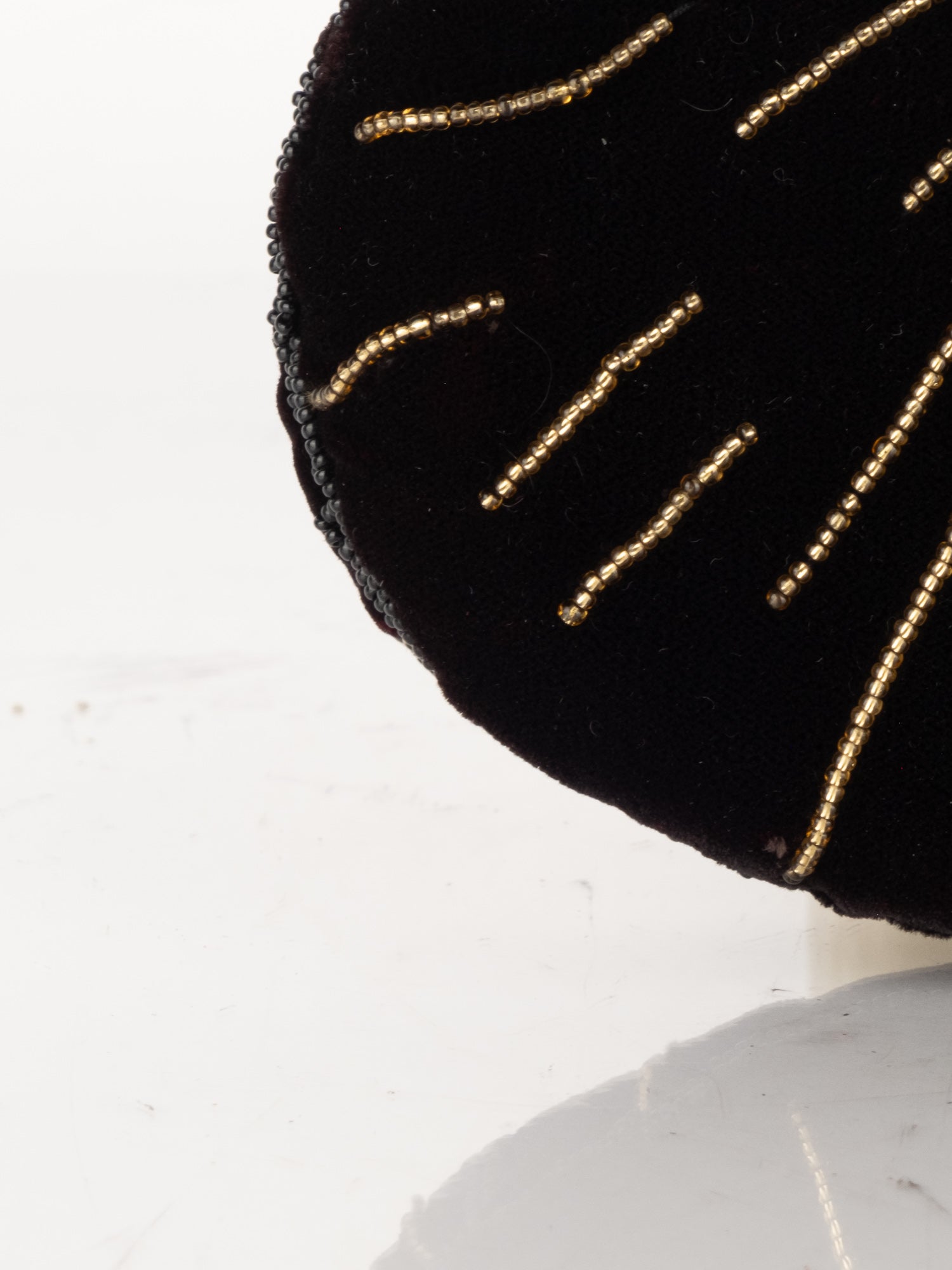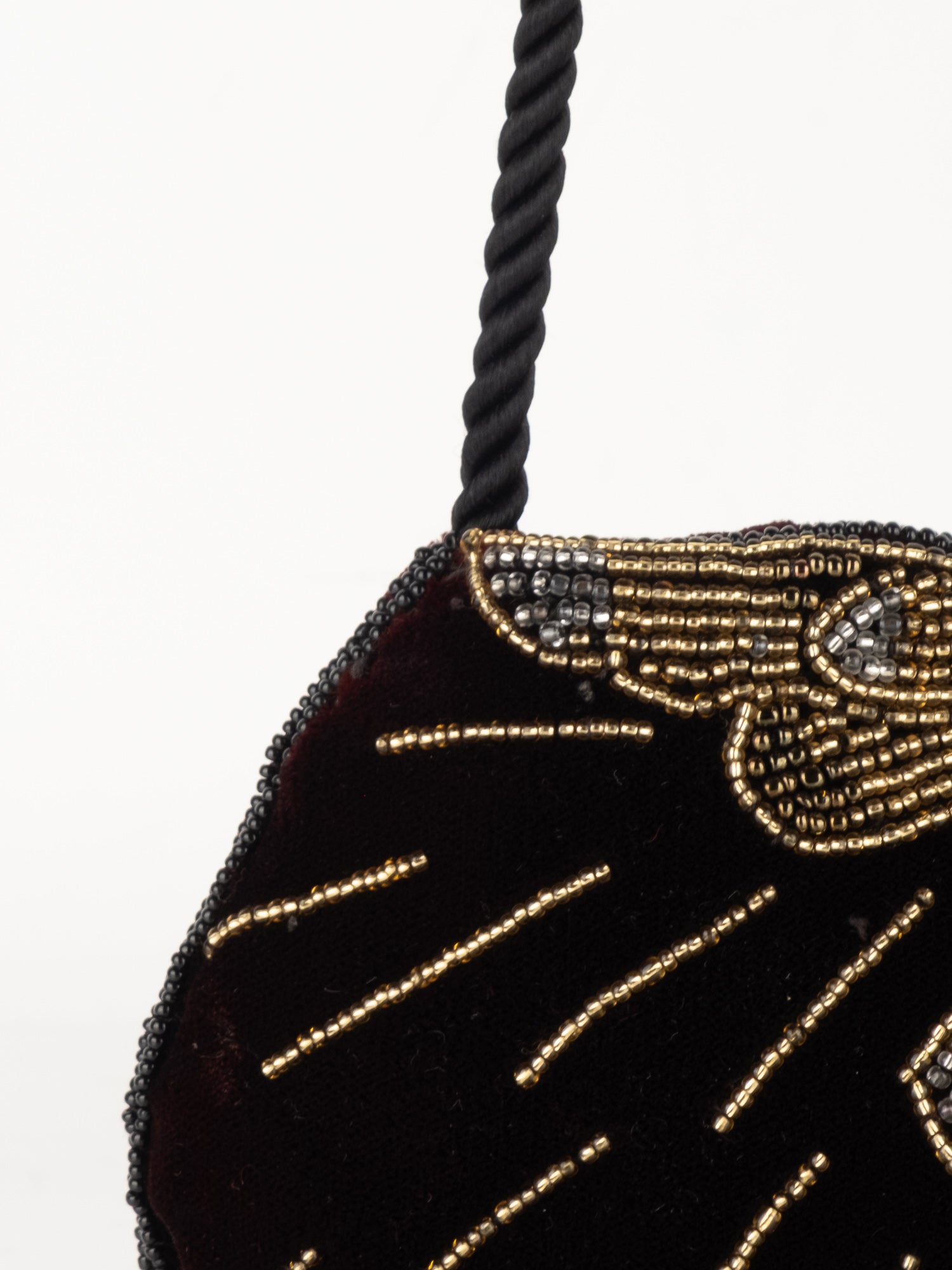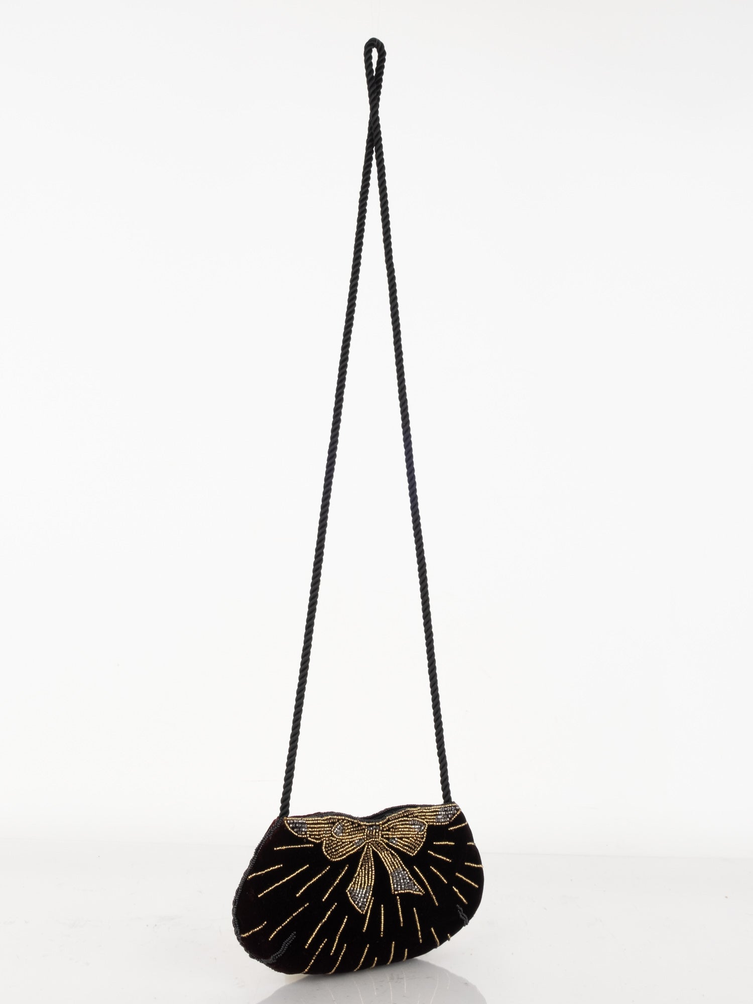 קטיפה שחורה, חרוזי זהב בדוגמה מעוגלת, רצועת כתף ארוכה, מבנה עגול רך.