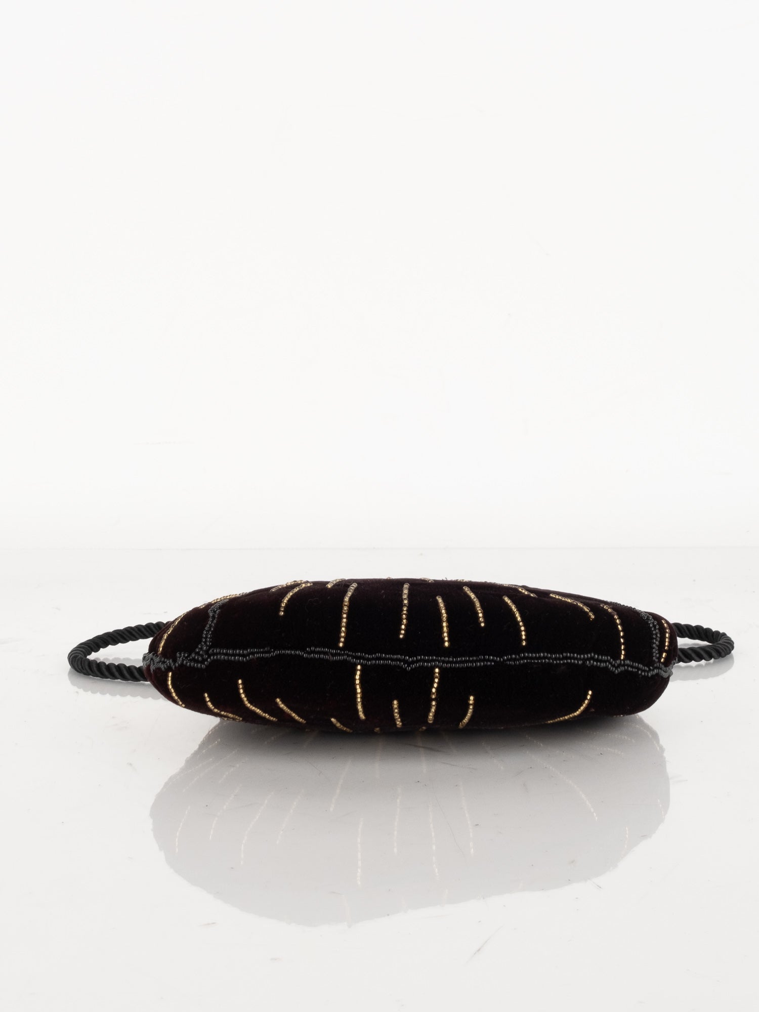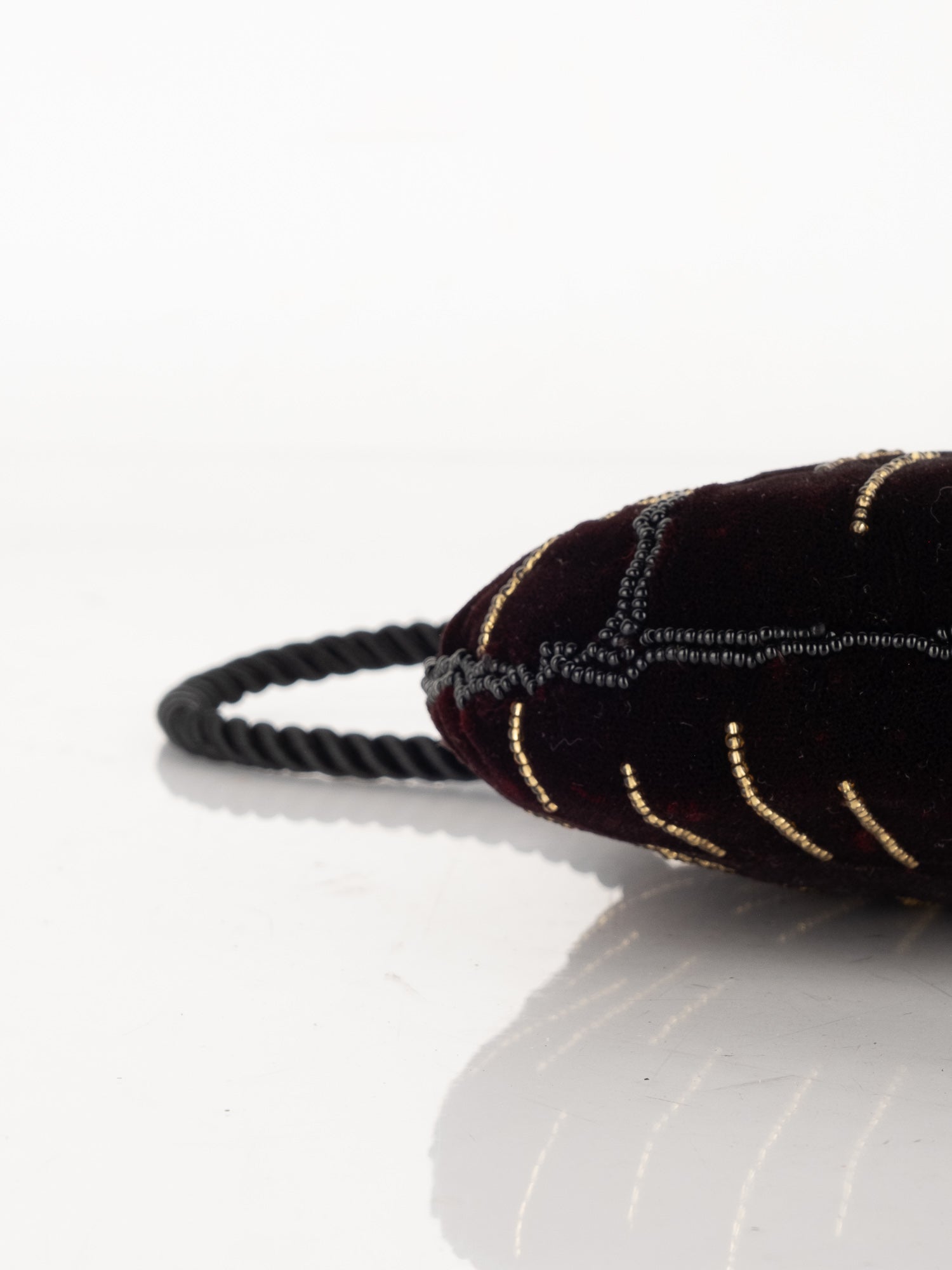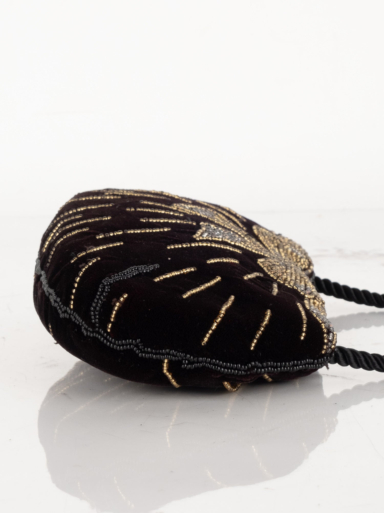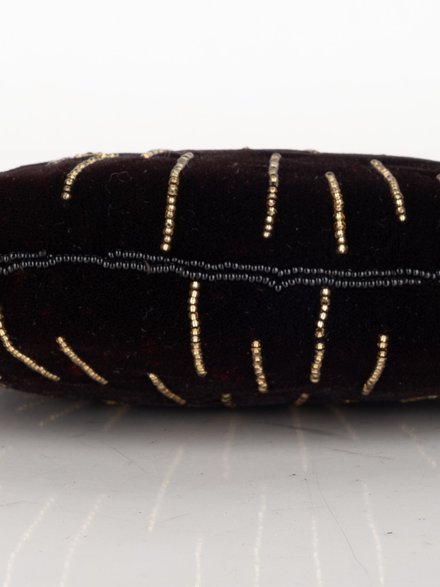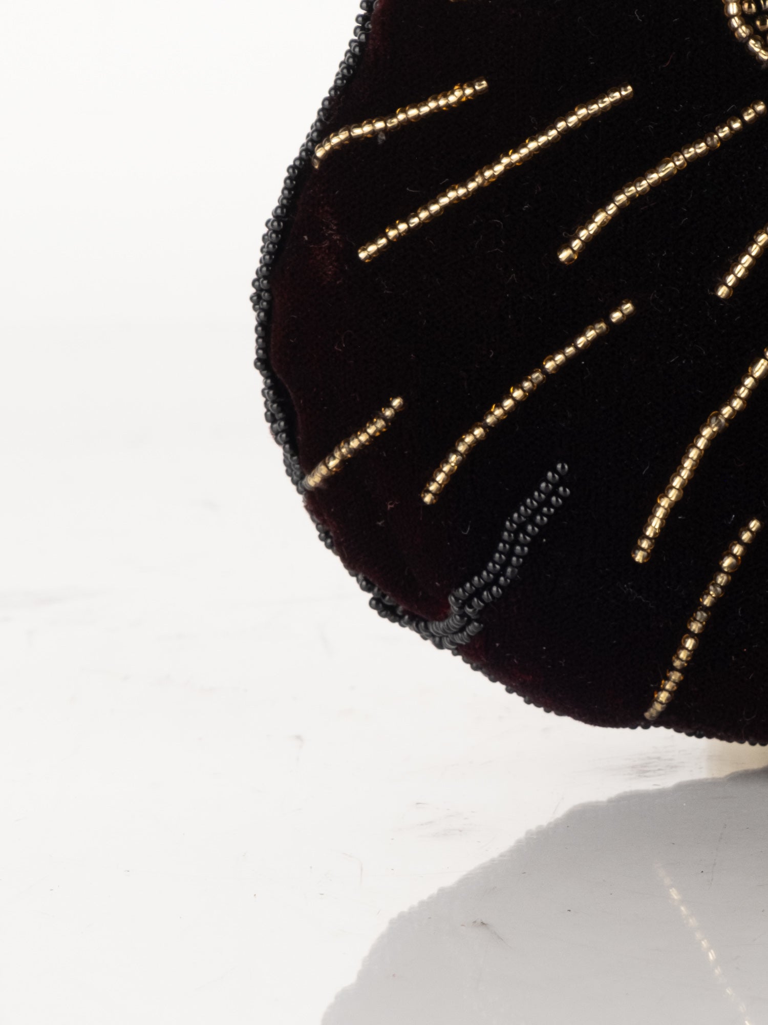 קטיפה שחורה, חרוזי זהב בדוגמה מעוגלת, רצועת כתף ארוכה, מבנה עגול רך.