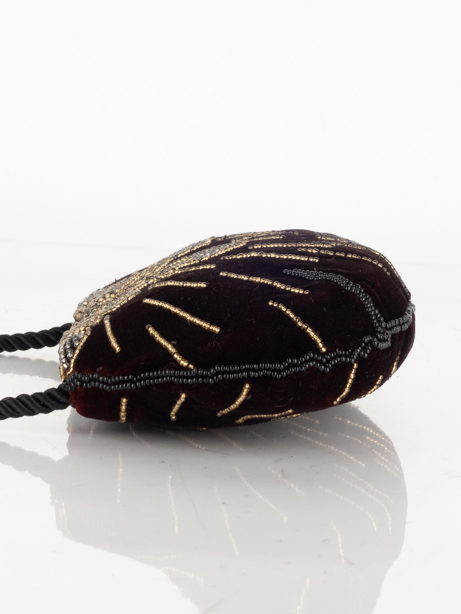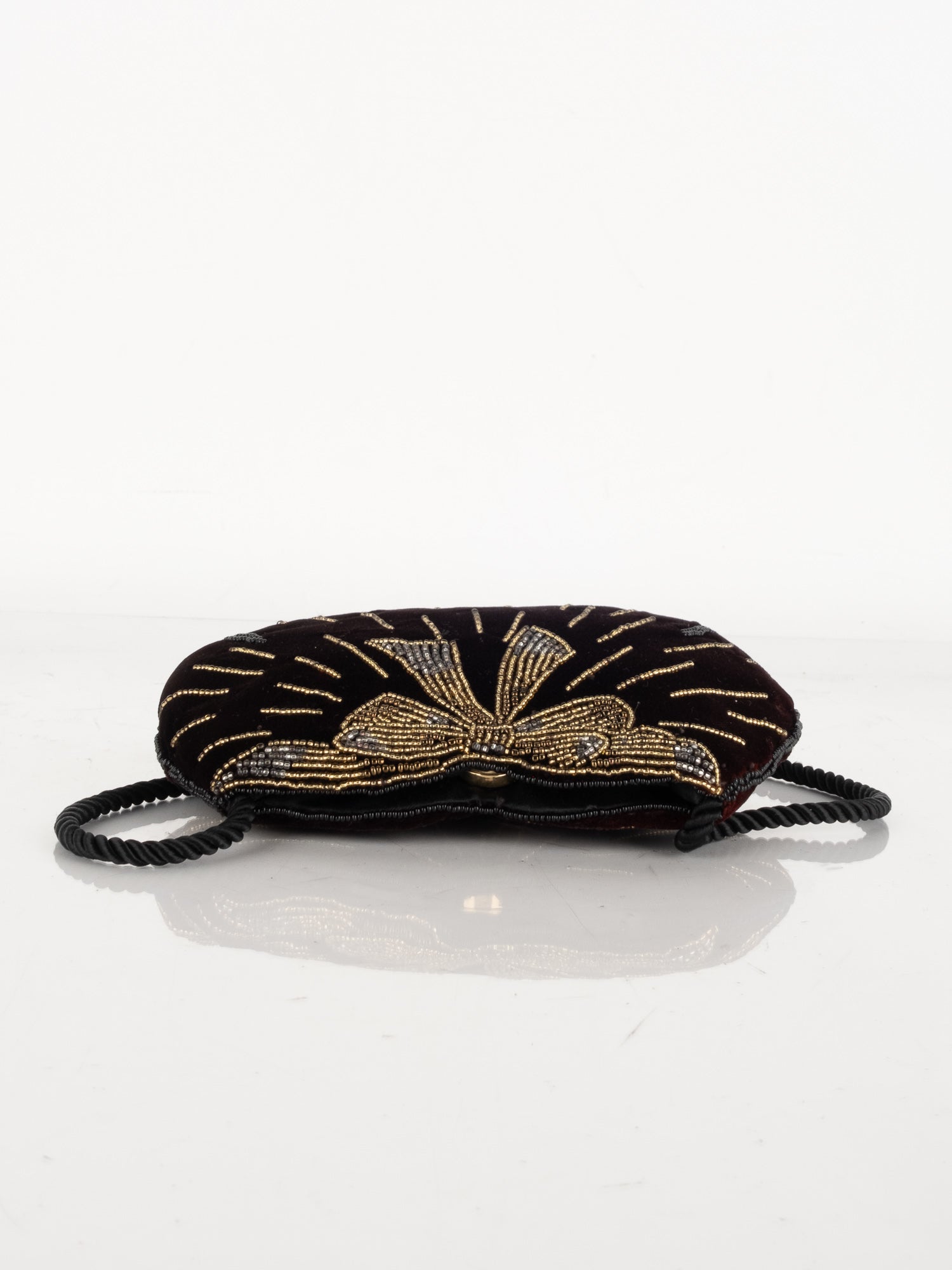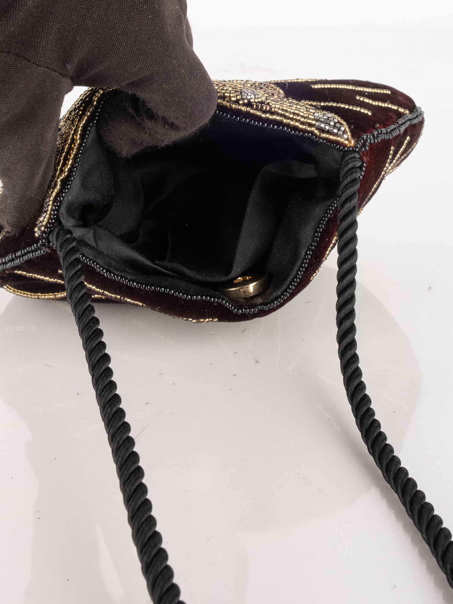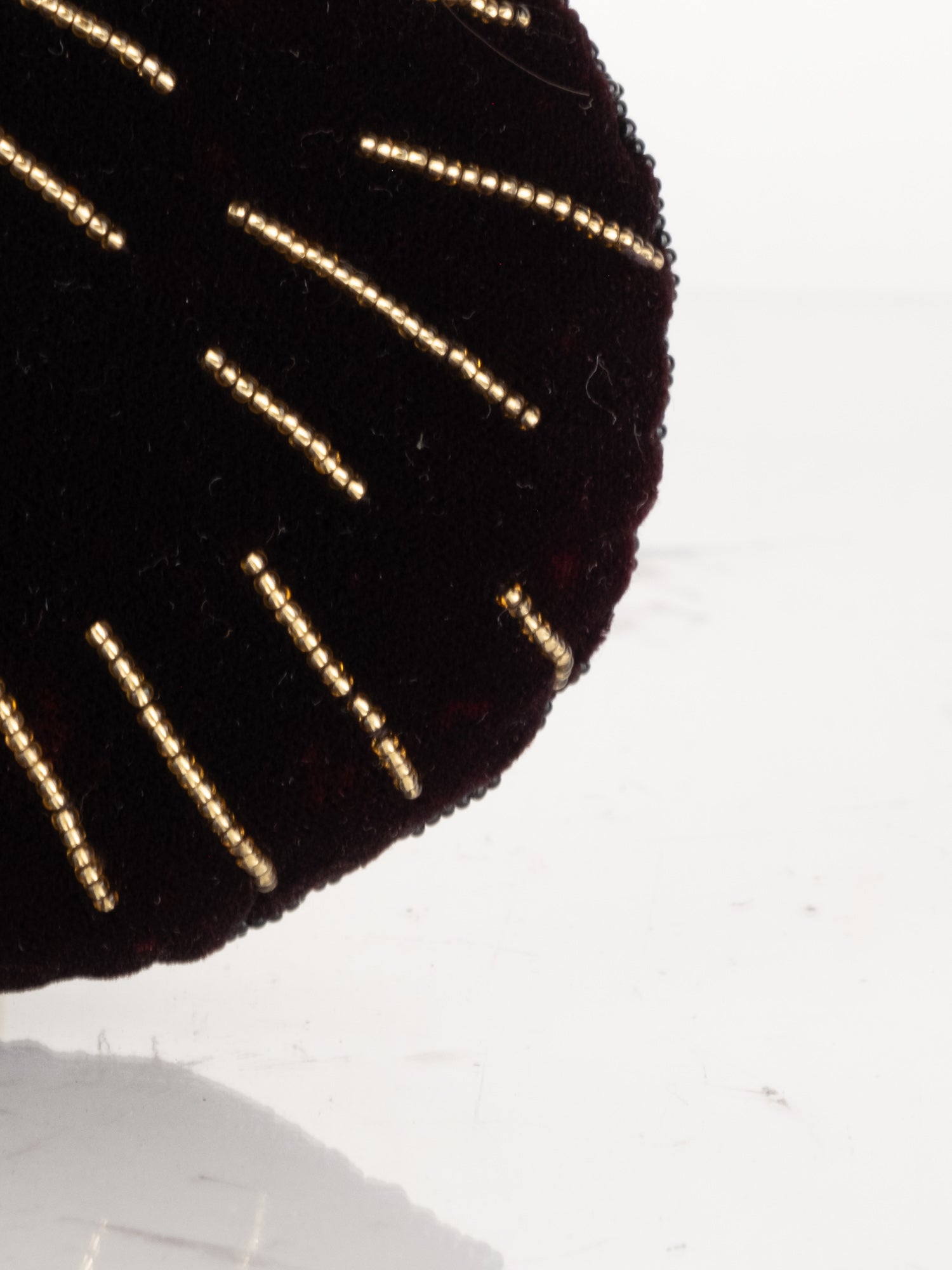 קטיפה שחורה, חרוזי זהב בדוגמה מעוגלת, רצועת כתף ארוכה, מבנה עגול רך.