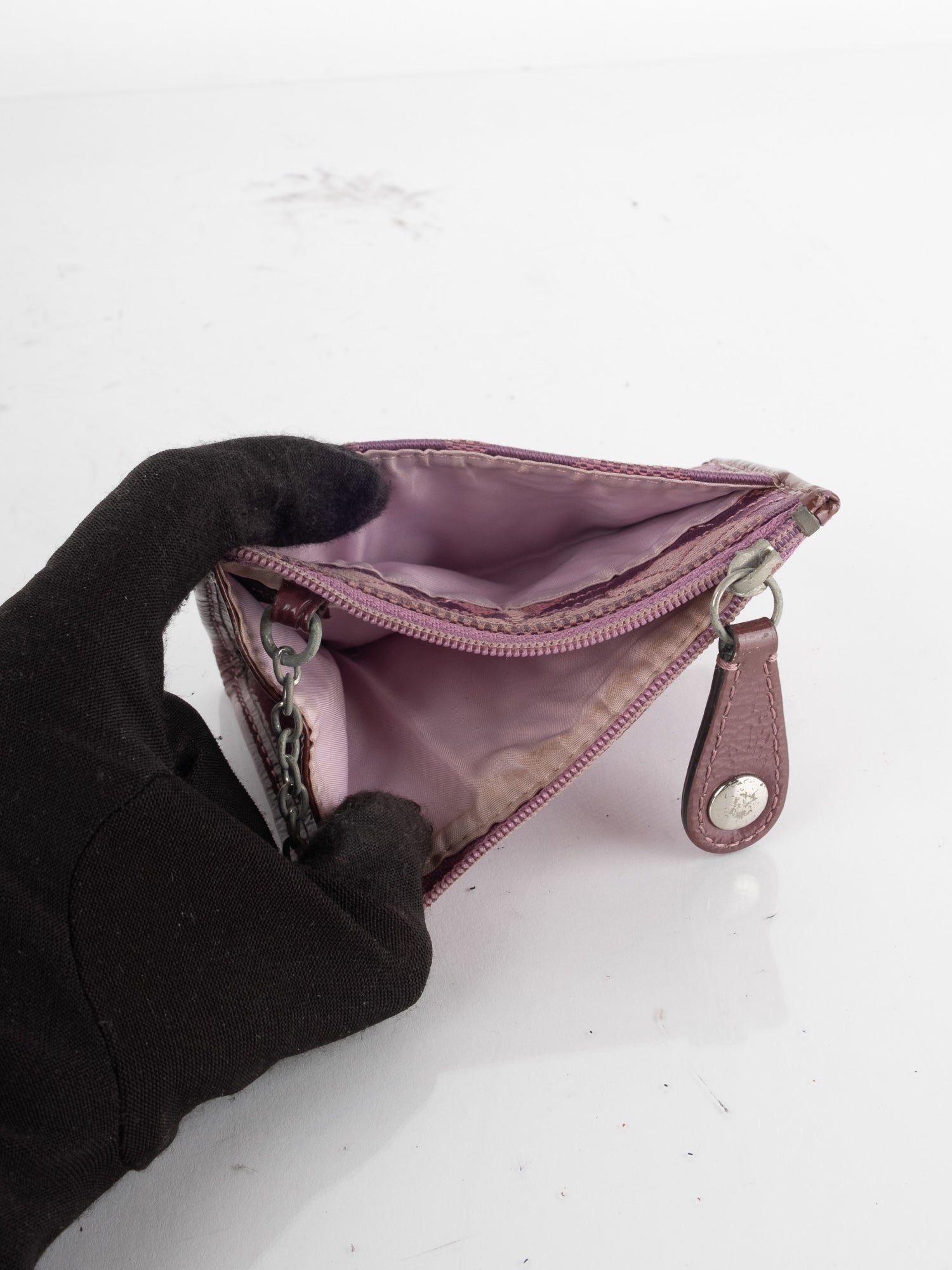 הארנק עשוי קנבס מונוגרמי סגול, כולל תא עליון וסגירת רוכסן.