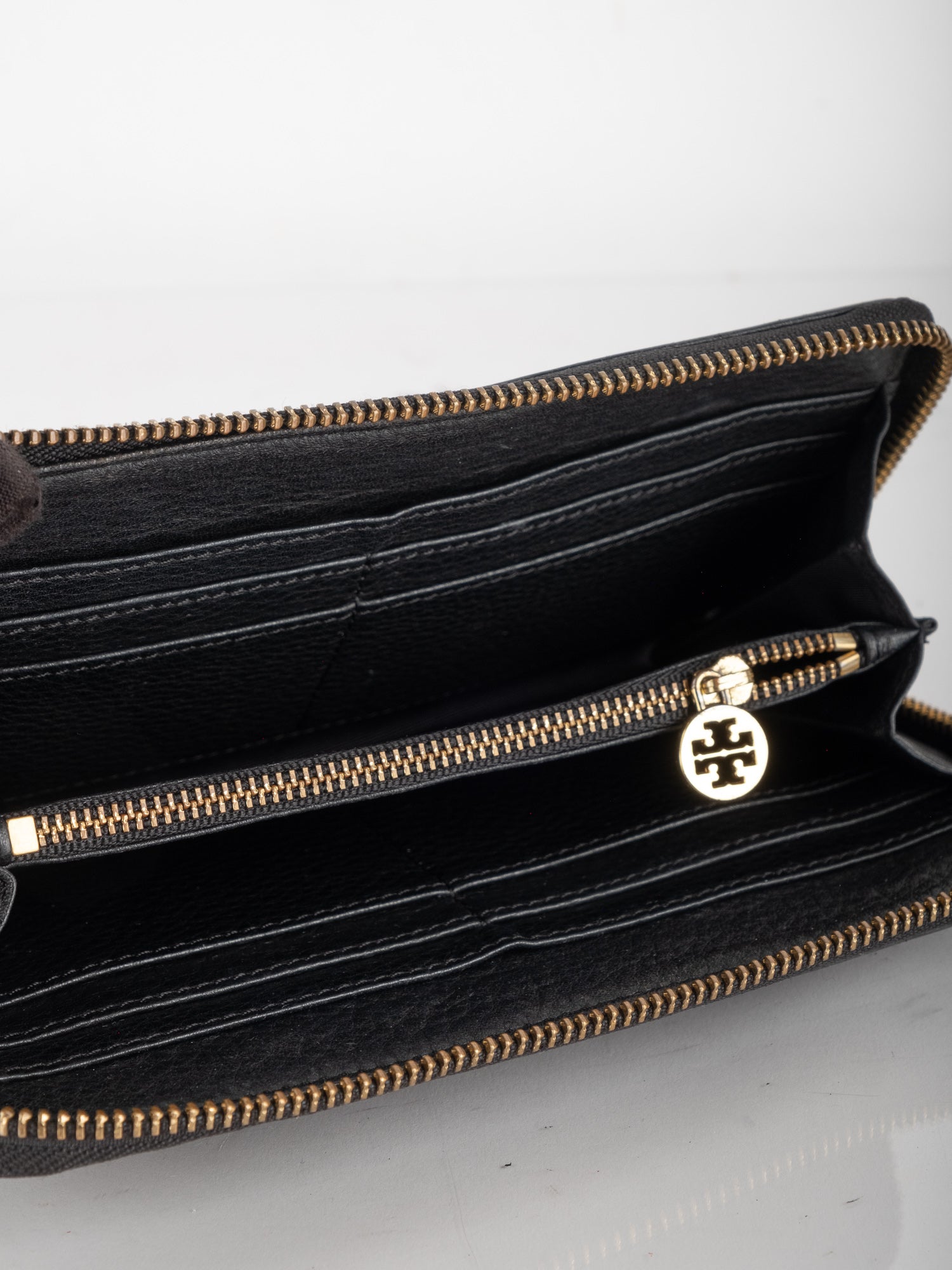 הארנק עשוי חומר דמוי־עור איכותי במרקם חלק ונעים למגע. חזית הארנק כוללת את לוגו טורי ברץ׳ המוטבע במרכז. סגירת Zip-Around מוזהבת מלאה, ופתיחה רחבה ונוחה. פנים הארנק כולל תאים לכרטיסים, שטרות ומטבעות.
