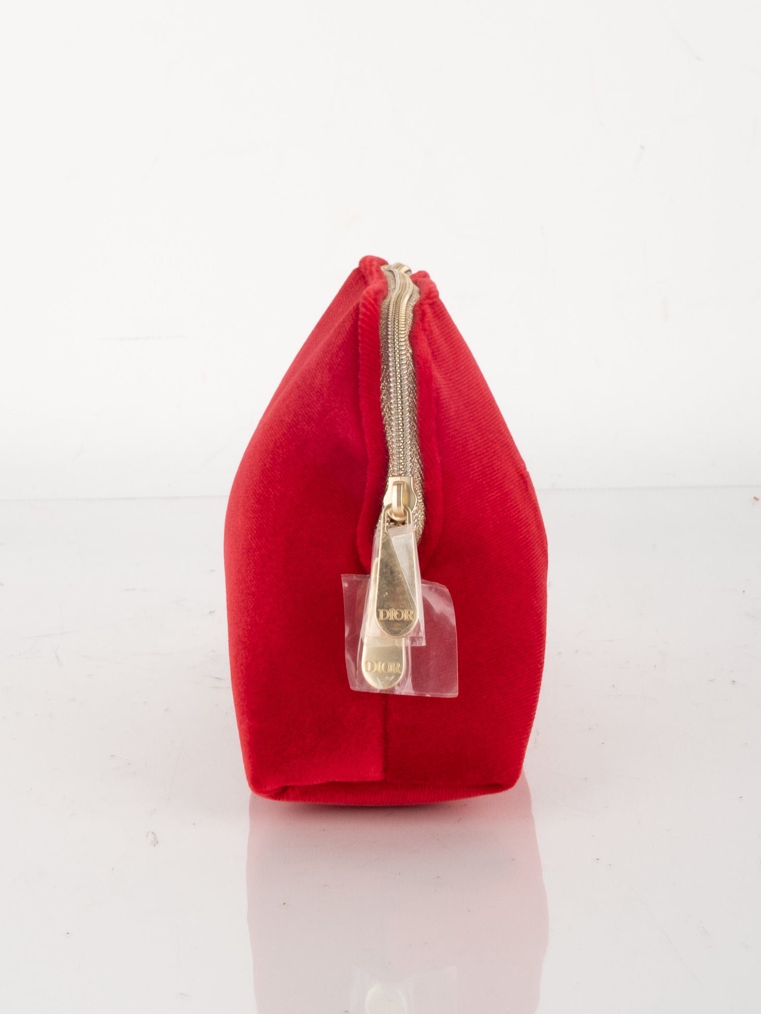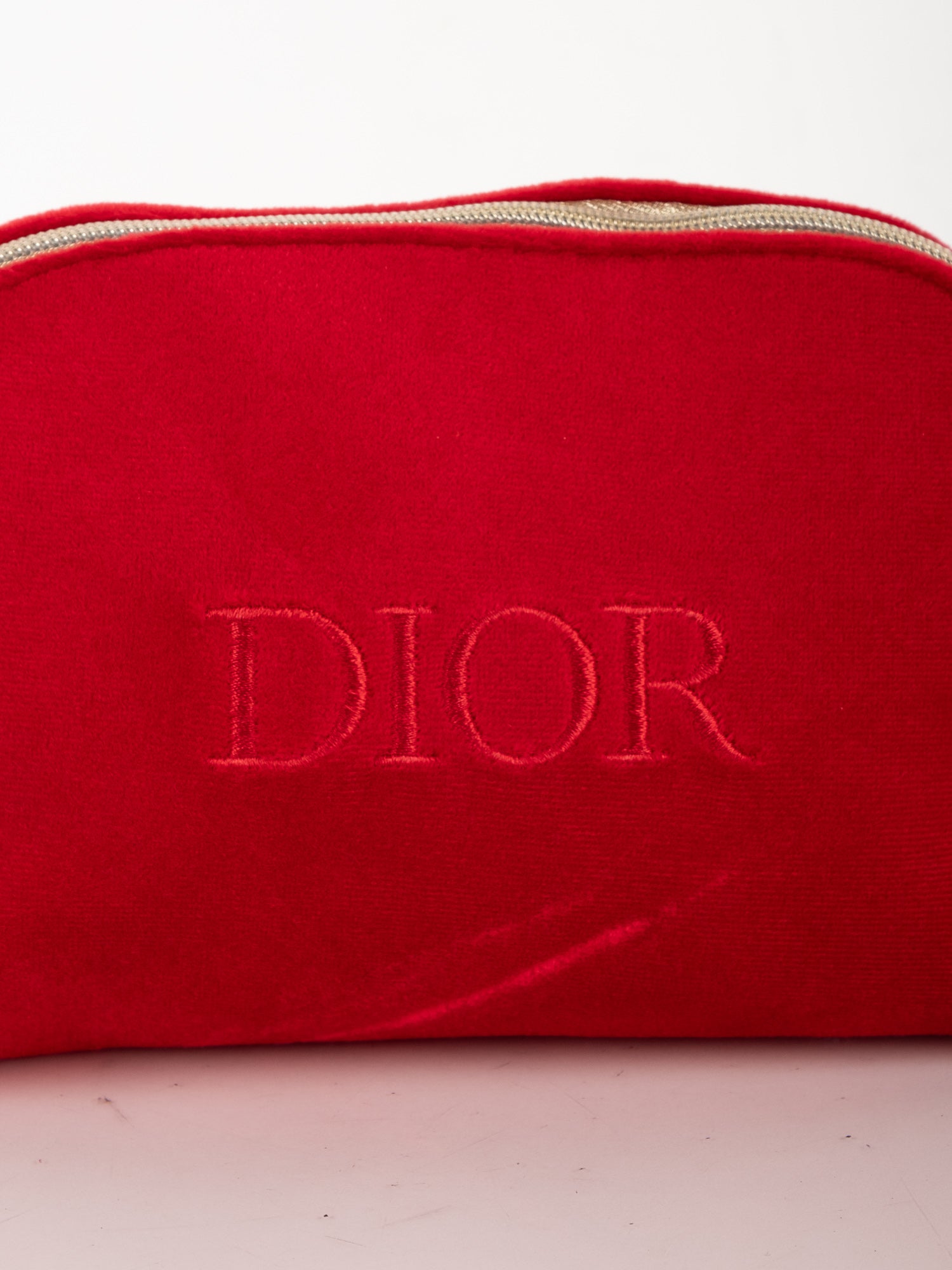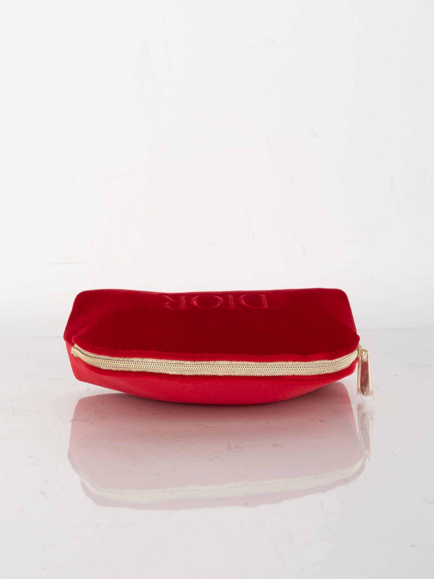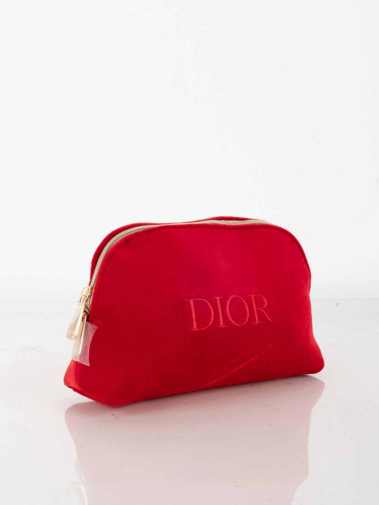 התיק עשוי בד אדום עשיר, עם רקמת לוגו DIOR בחזית, רוכסן עליון ונפח נוח לאחסון מוצרי יופי ויום־יום. כנראה מקניית בושם