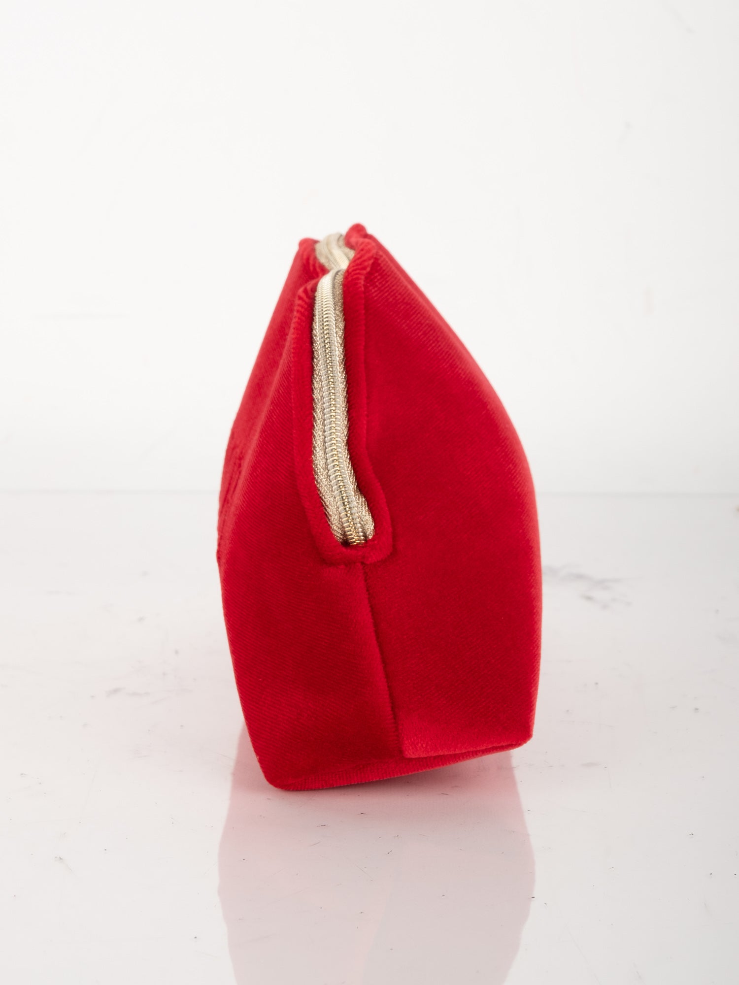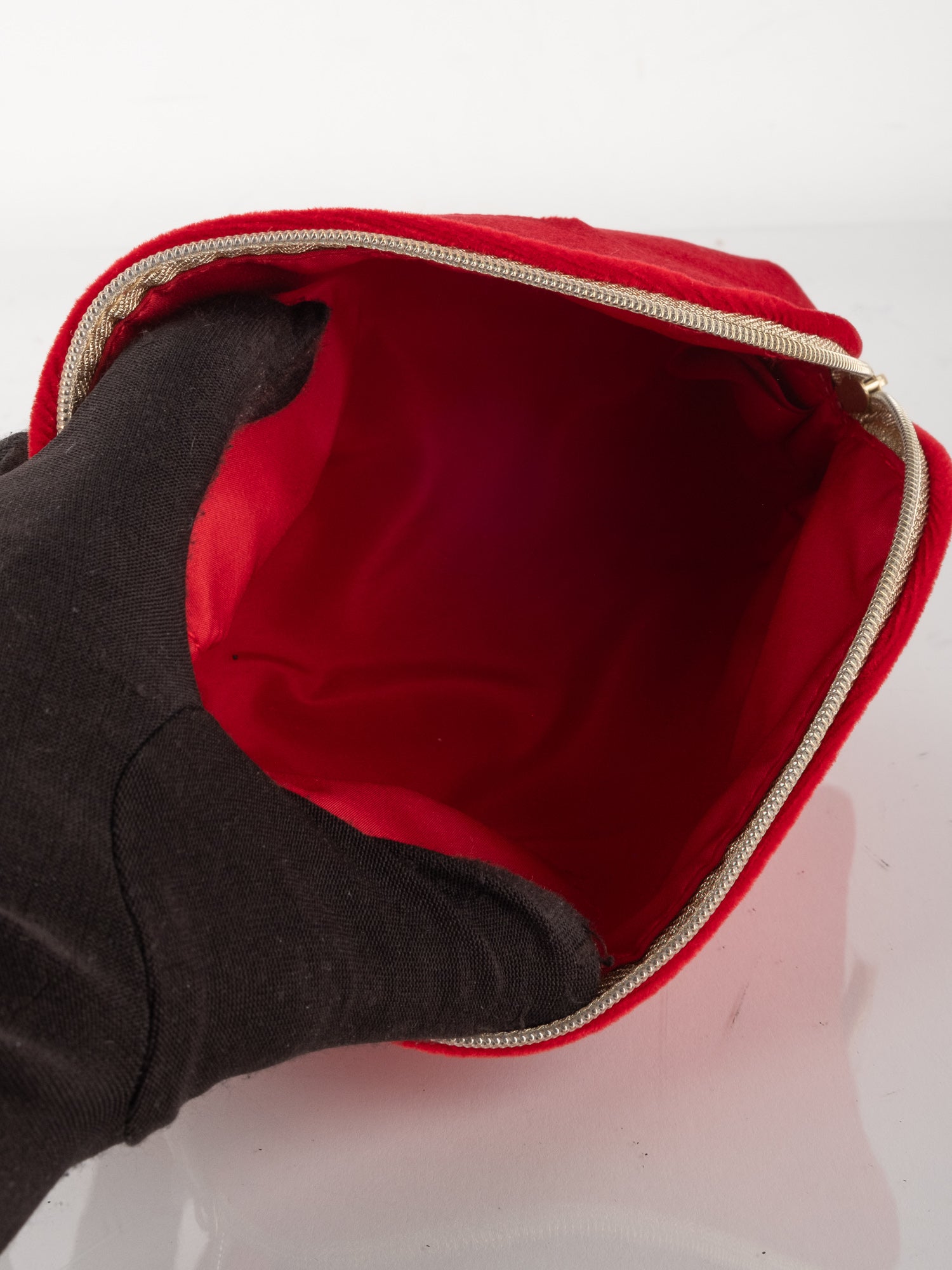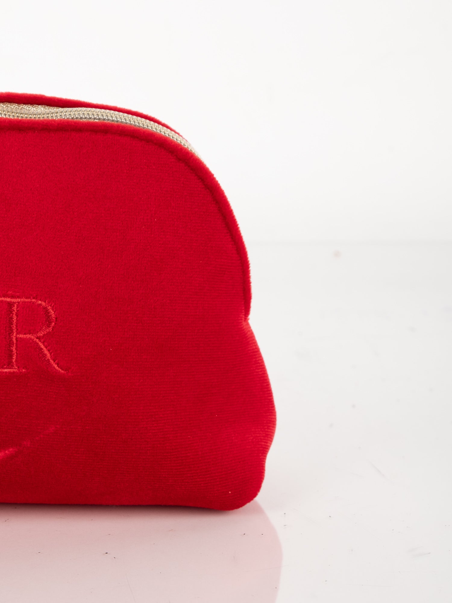 התיק עשוי בד אדום עשיר, עם רקמת לוגו DIOR בחזית, רוכסן עליון ונפח נוח לאחסון מוצרי יופי ויום־יום. כנראה מקניית בושם
