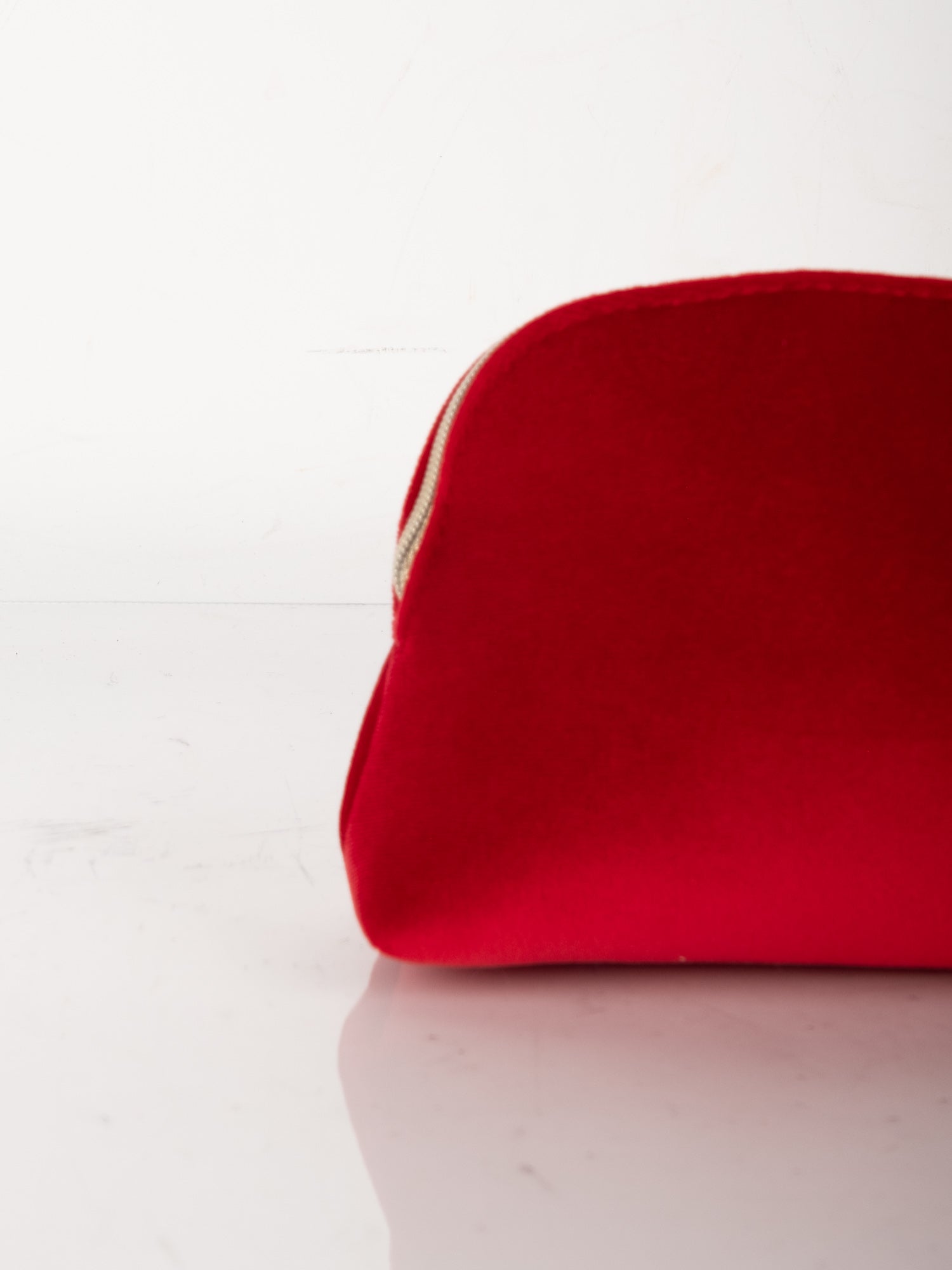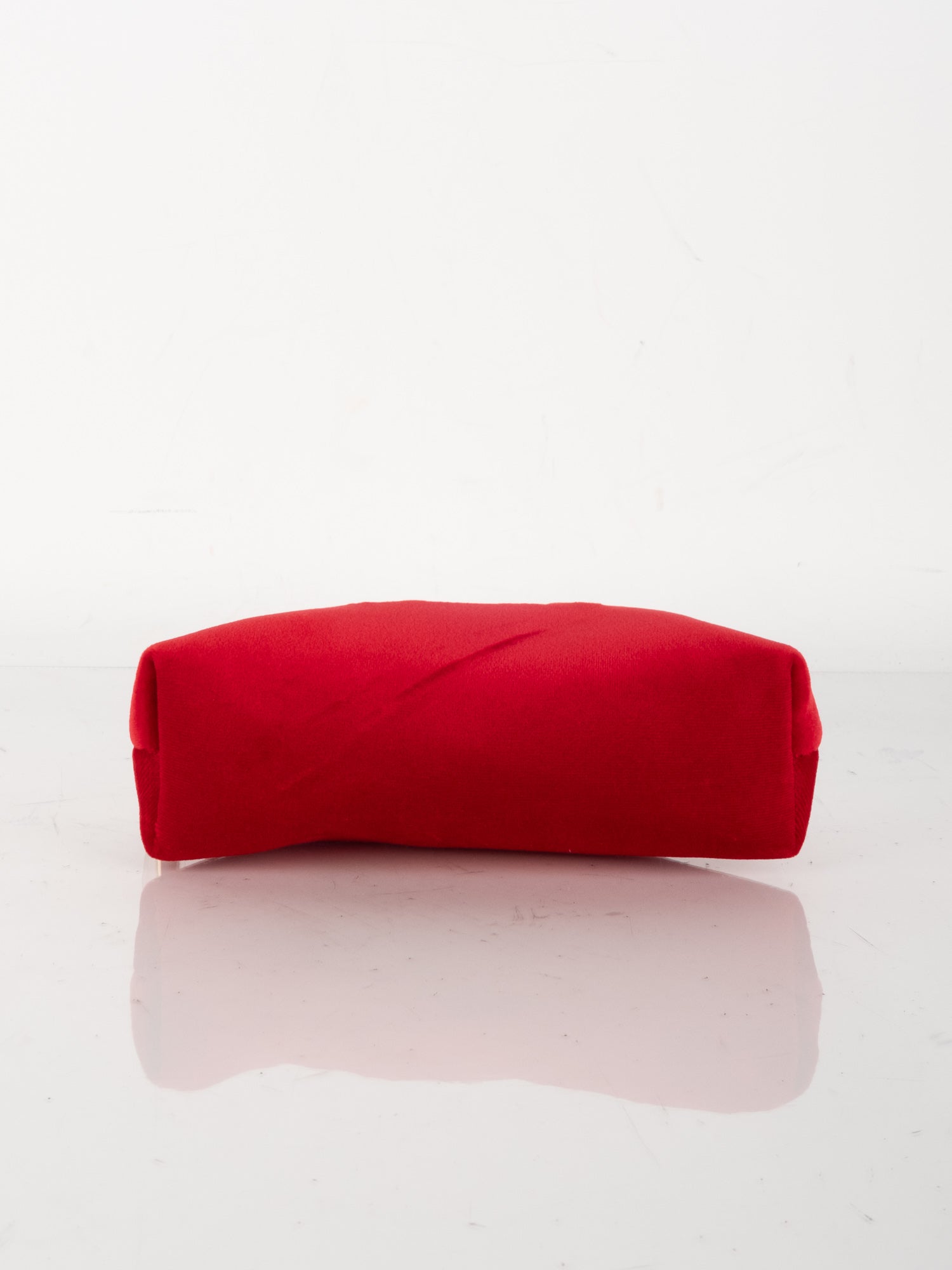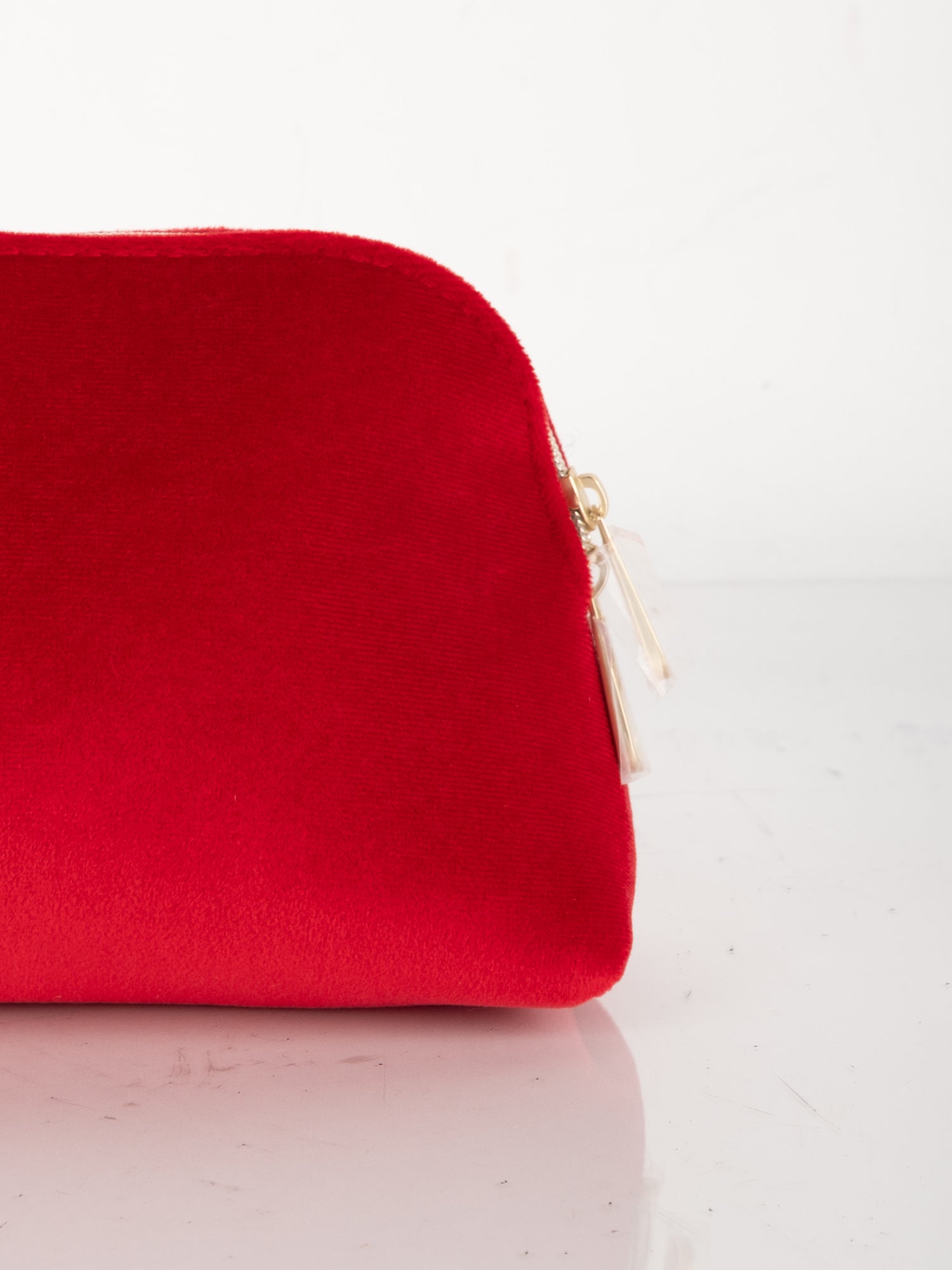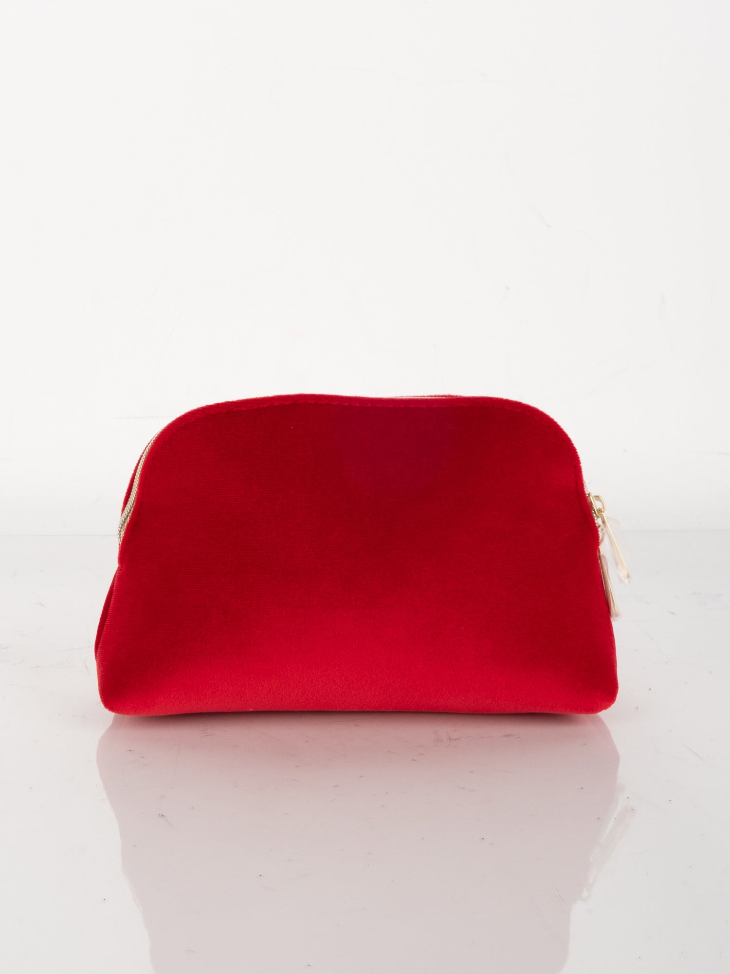 התיק עשוי בד אדום עשיר, עם רקמת לוגו DIOR בחזית, רוכסן עליון ונפח נוח לאחסון מוצרי יופי ויום־יום. כנראה מקניית בושם