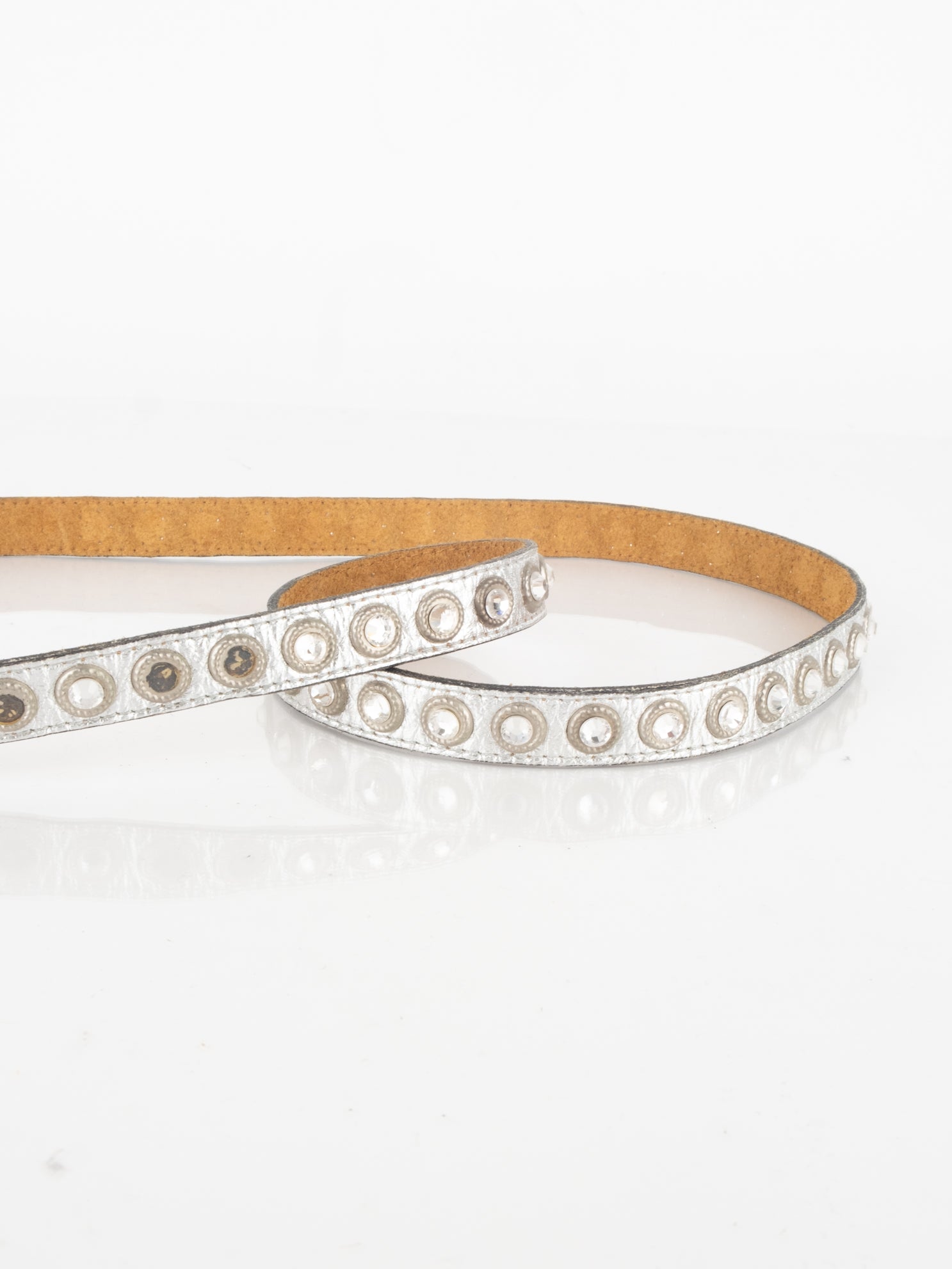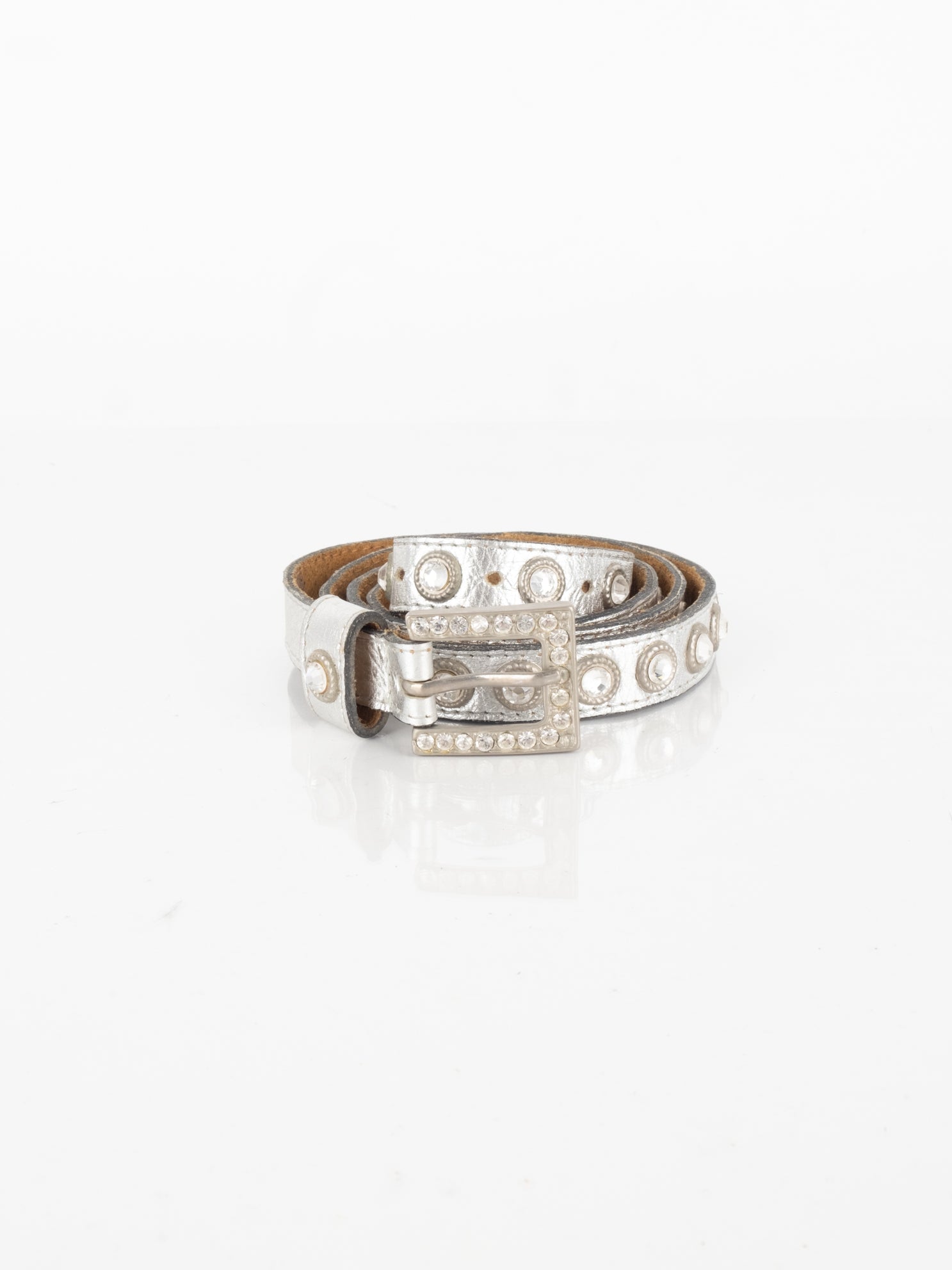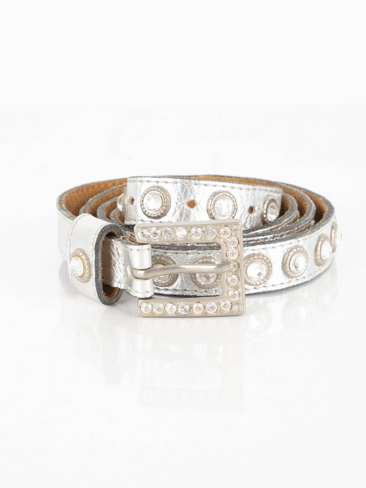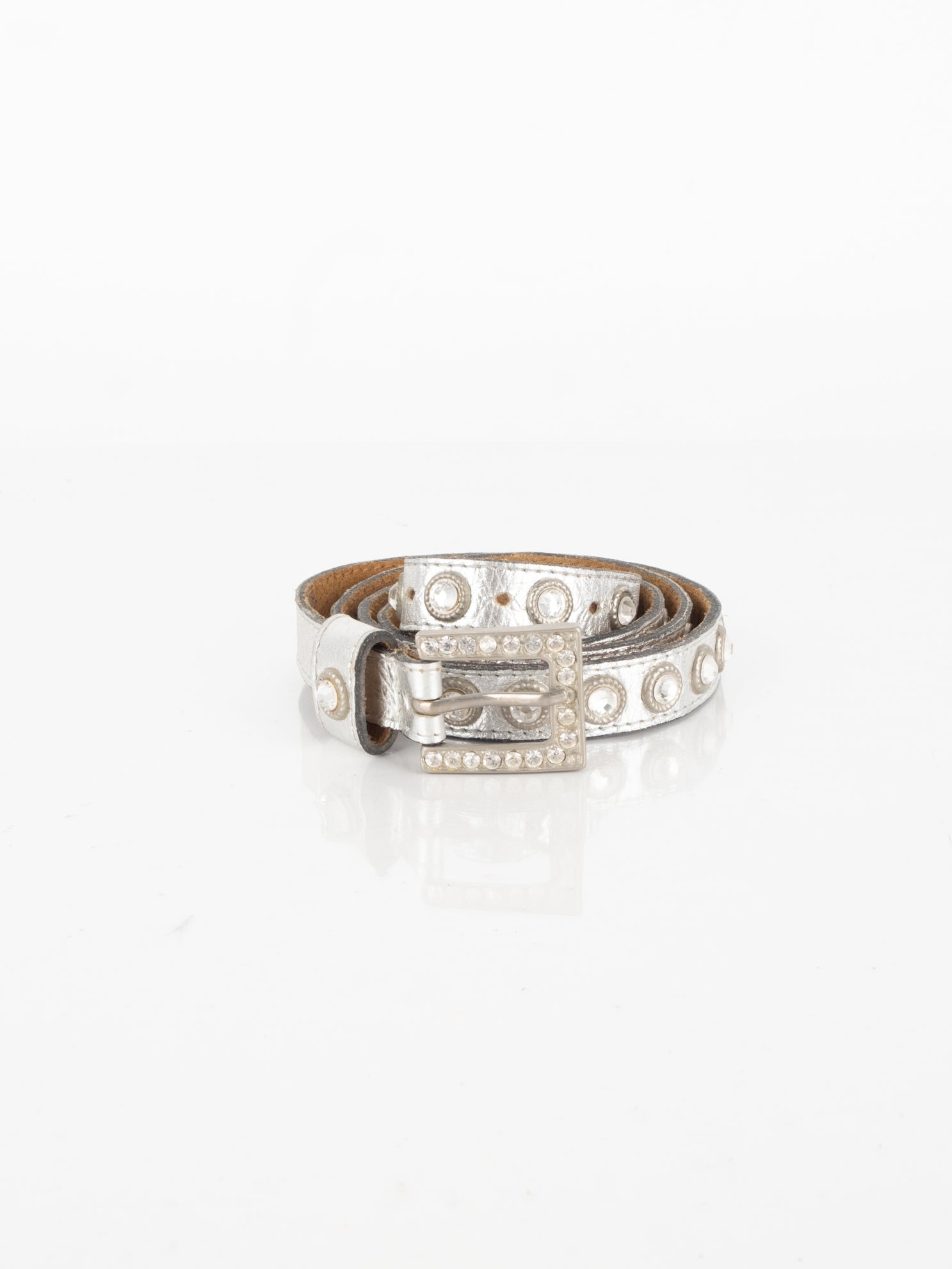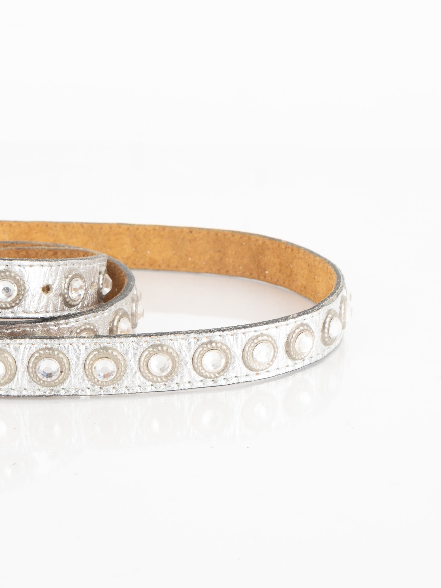 חגורה דקה העשויה מעור בצבע כסוף בעלת דיטיילים מוזהבים ואבנים.