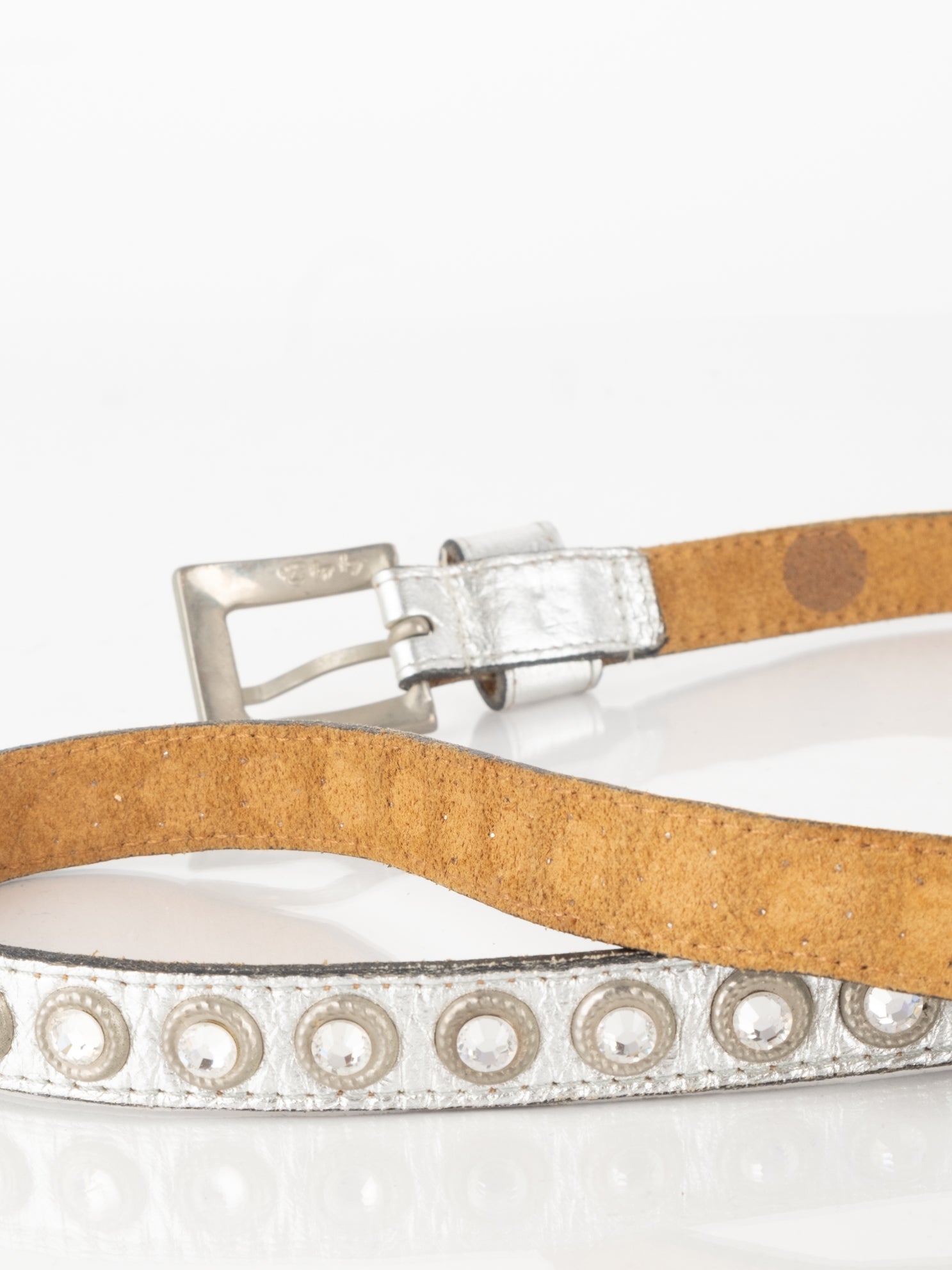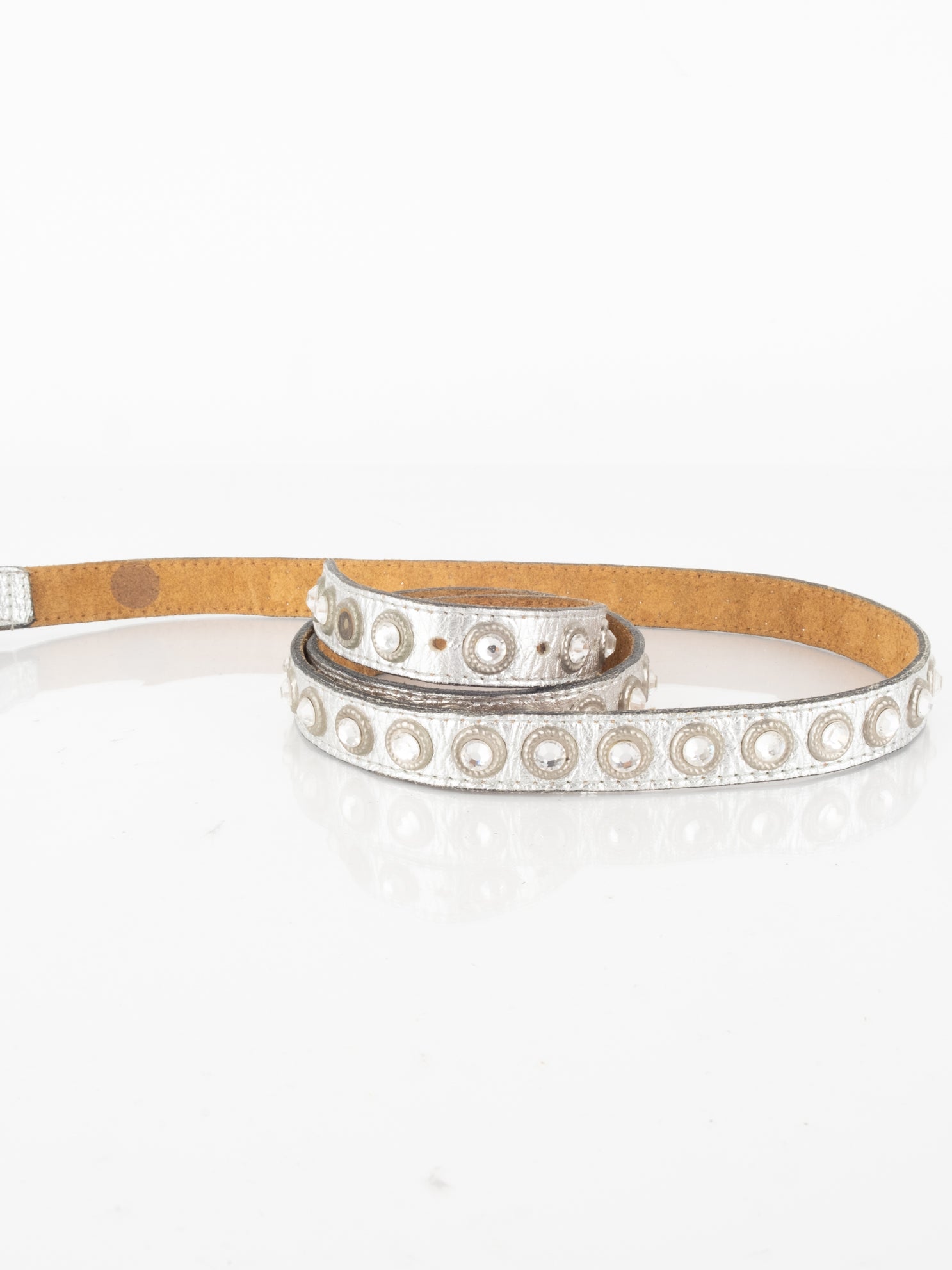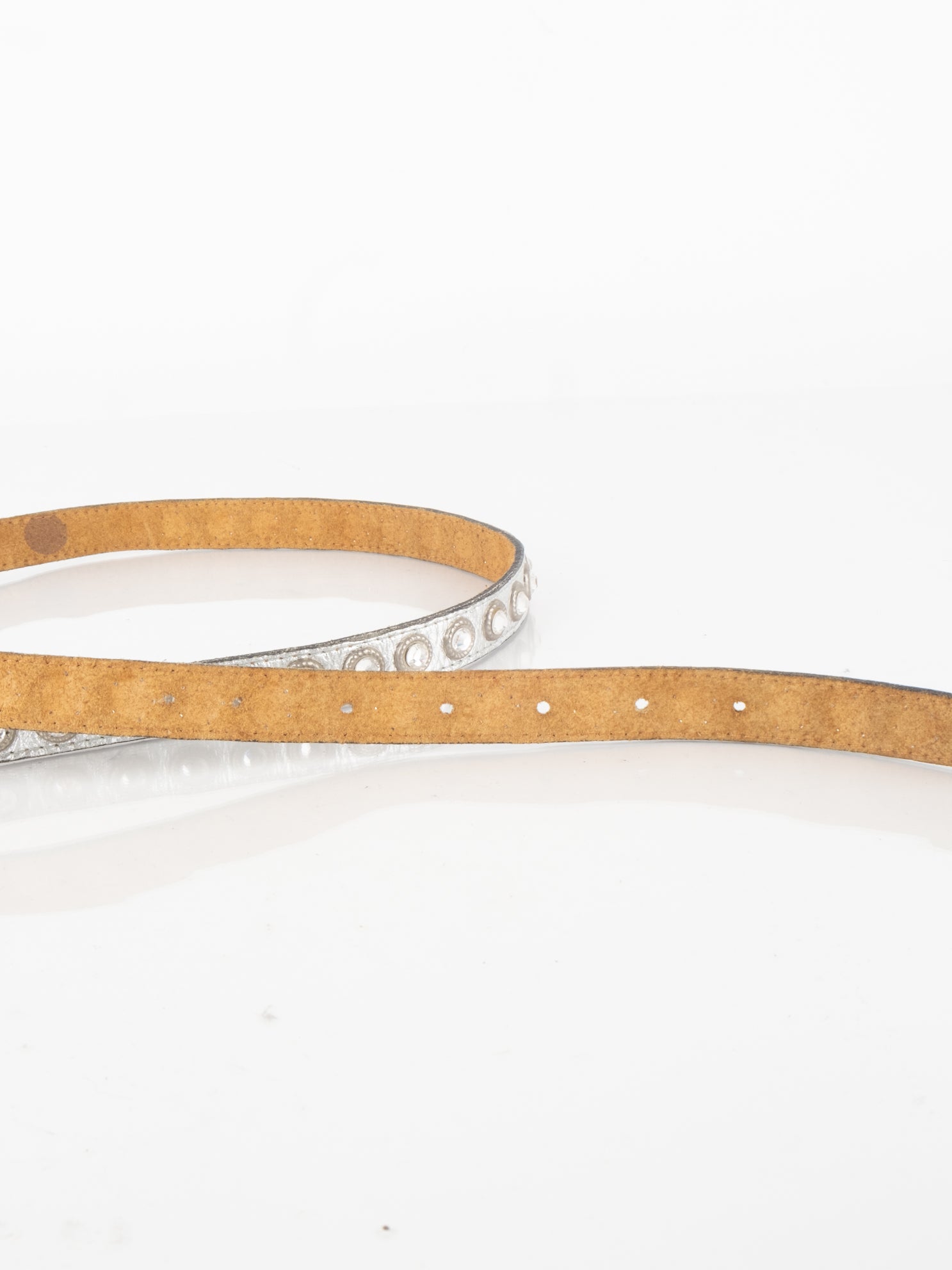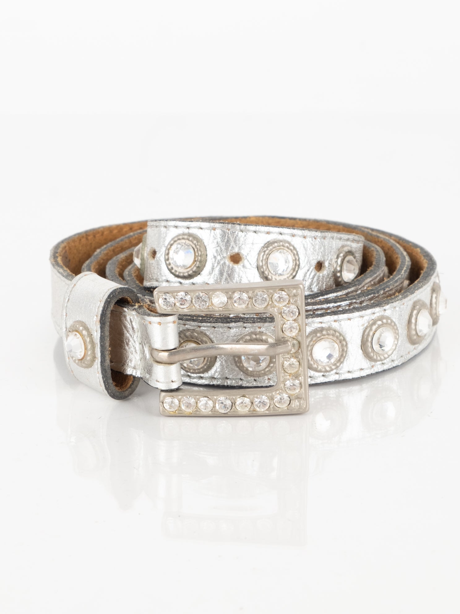 חגורה דקה העשויה מעור בצבע כסוף בעלת דיטיילים מוזהבים ואבנים.