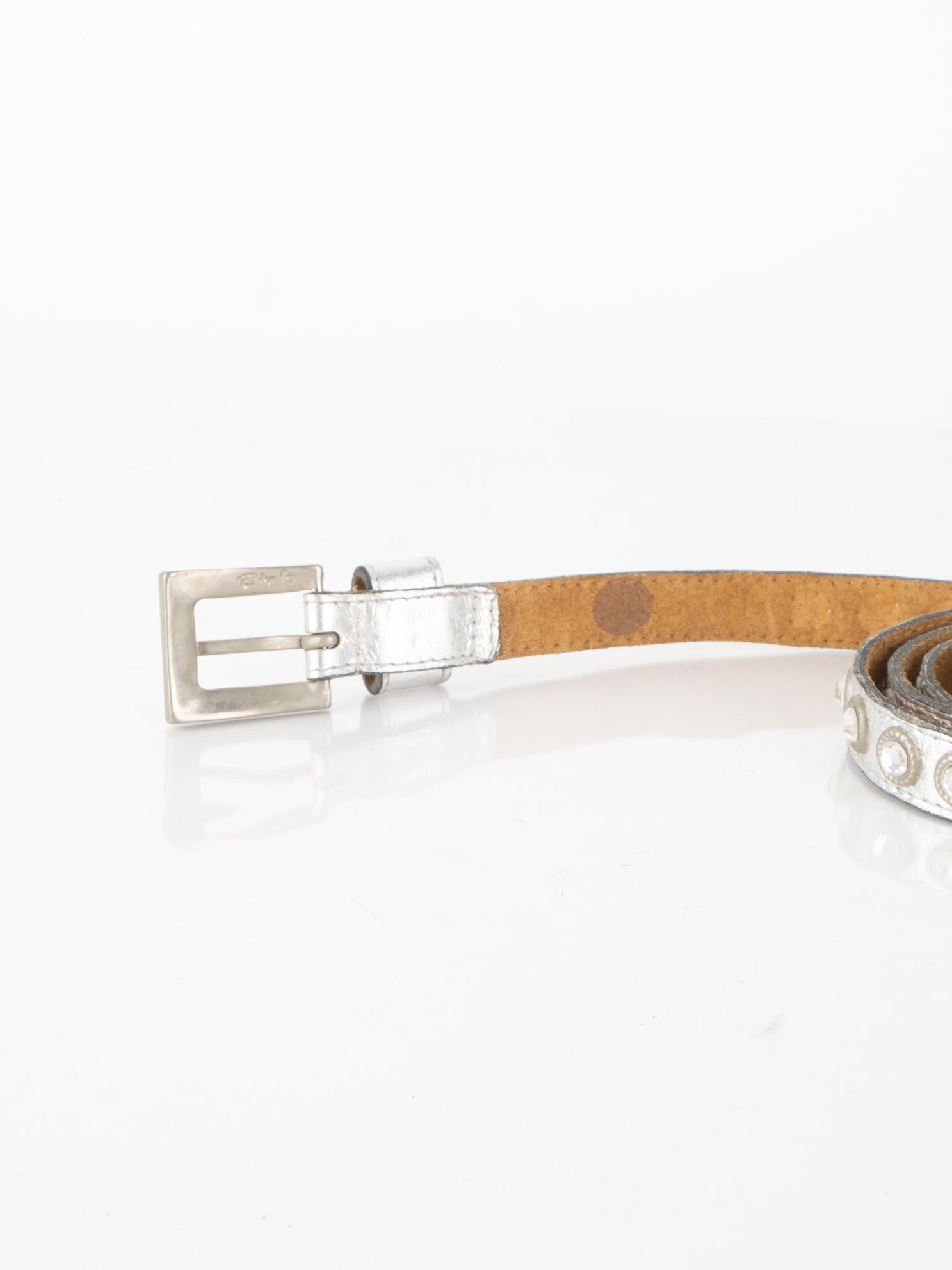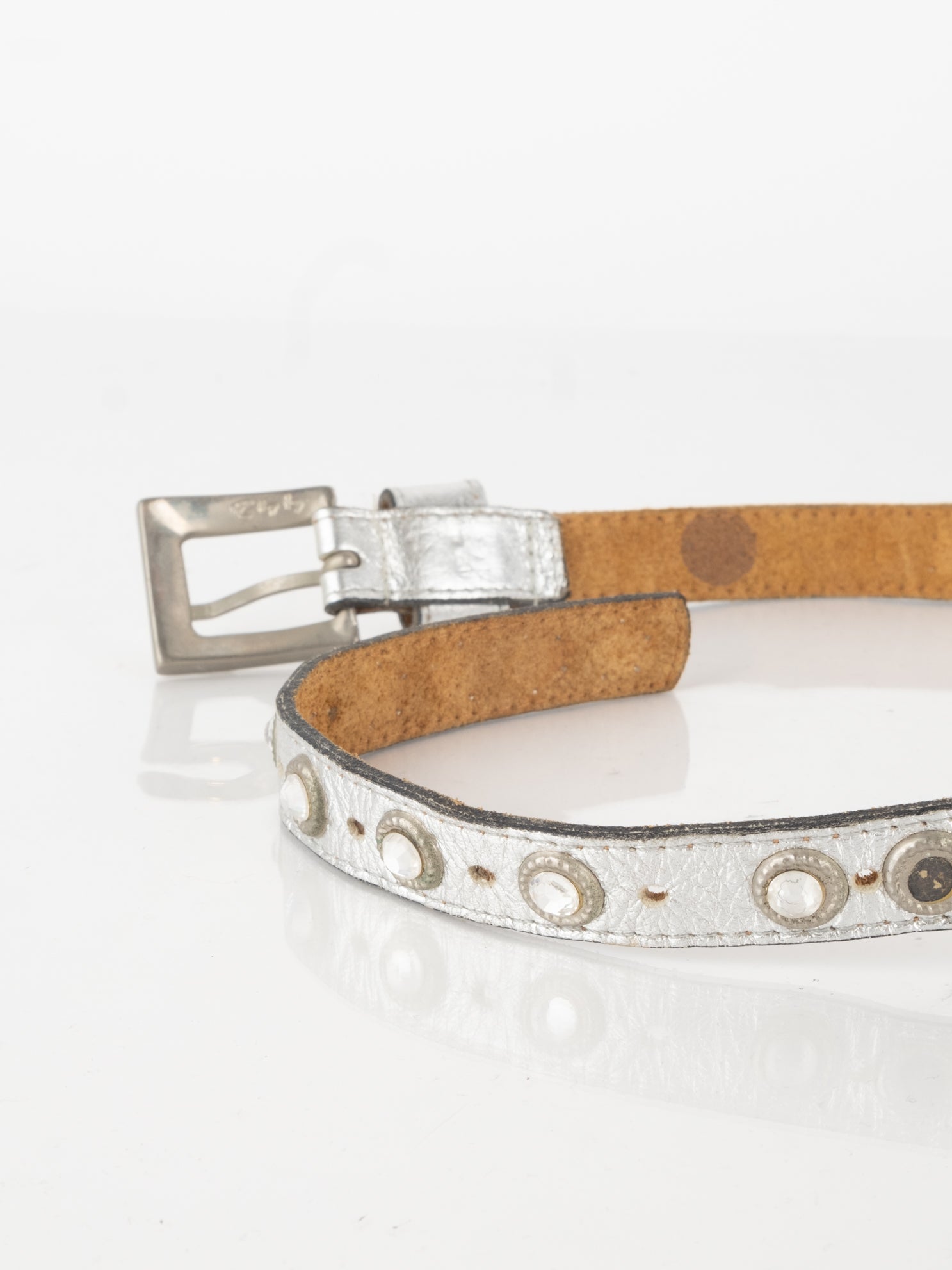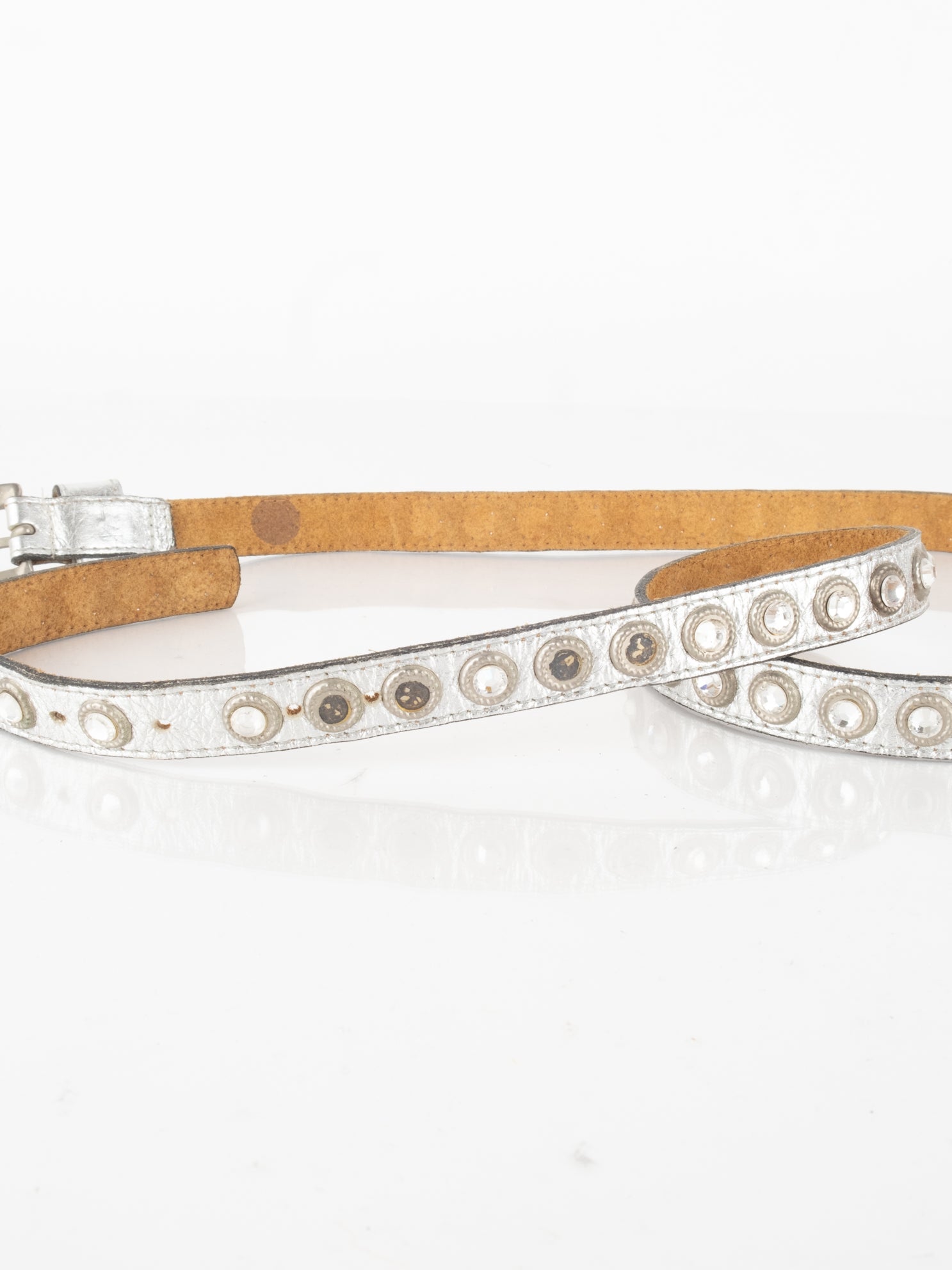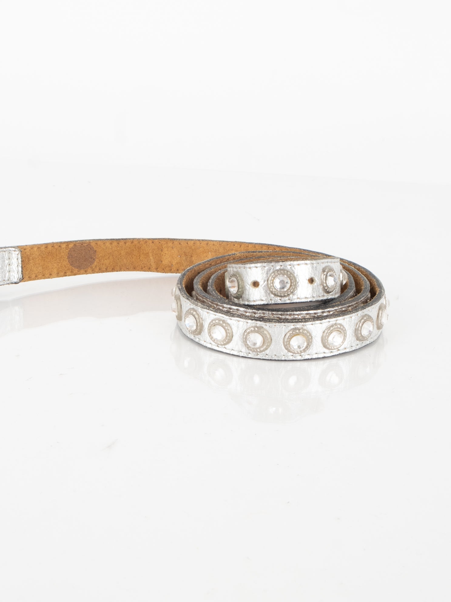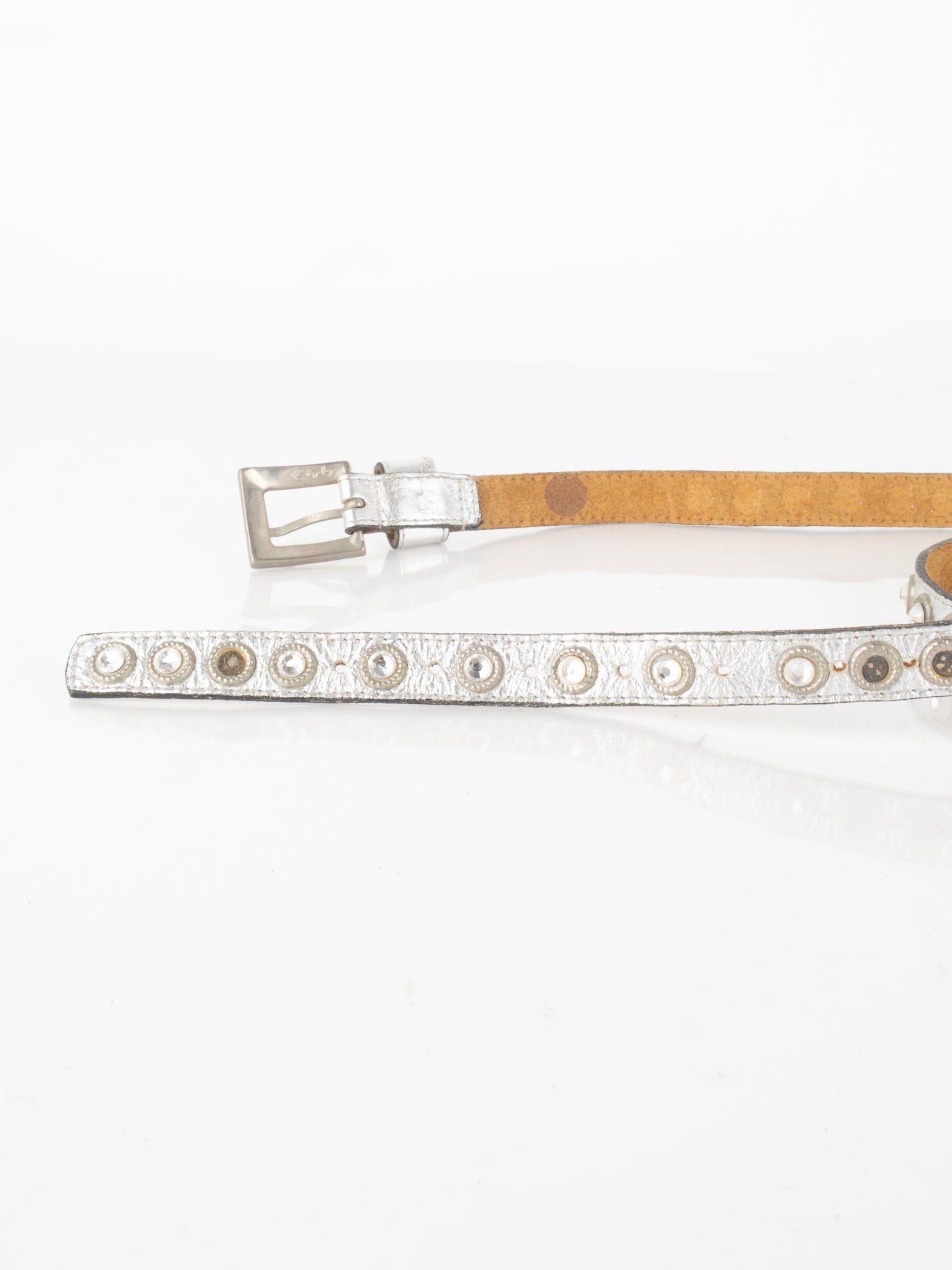 חגורה דקה העשויה מעור בצבע כסוף בעלת דיטיילים מוזהבים ואבנים.