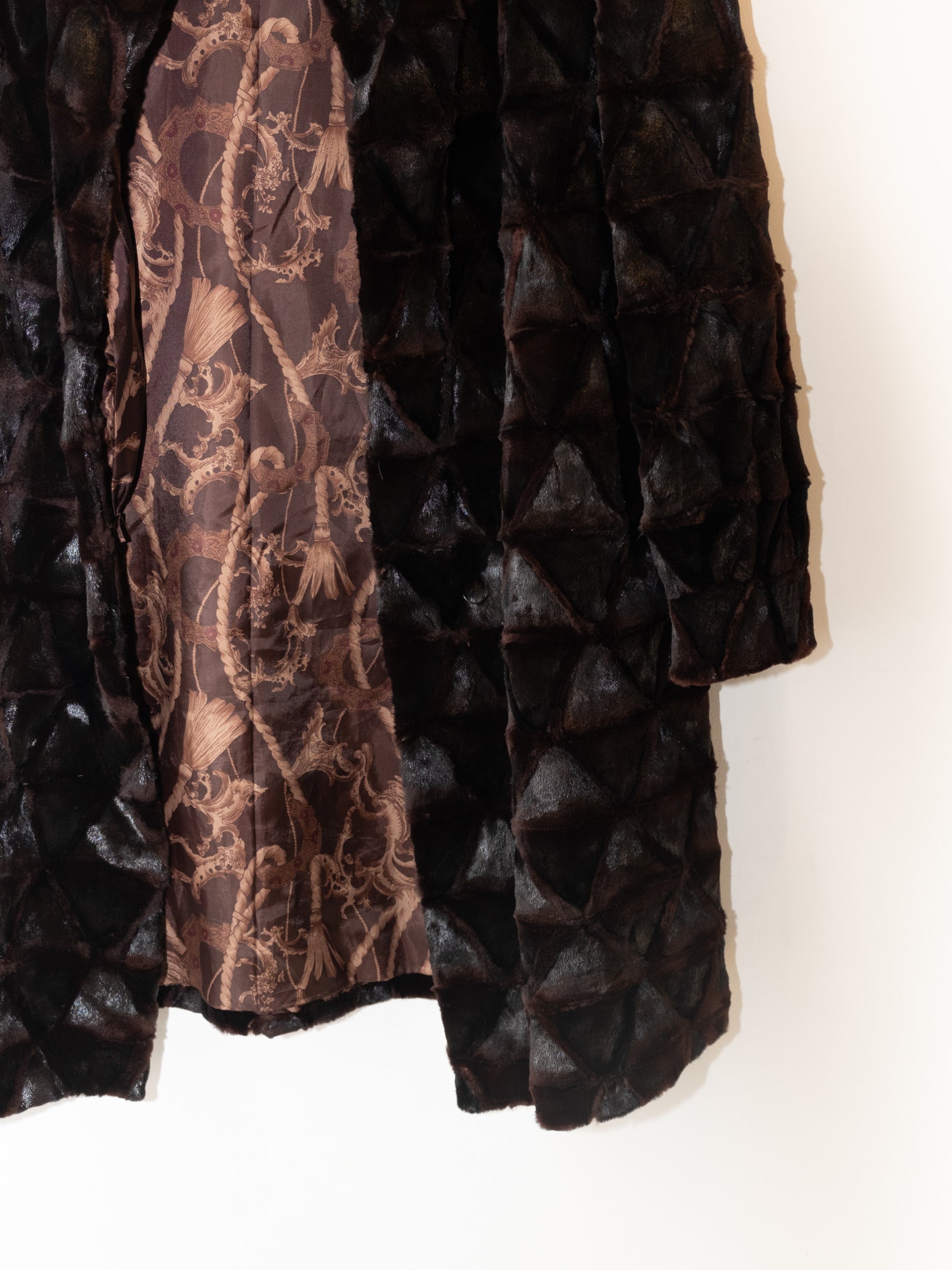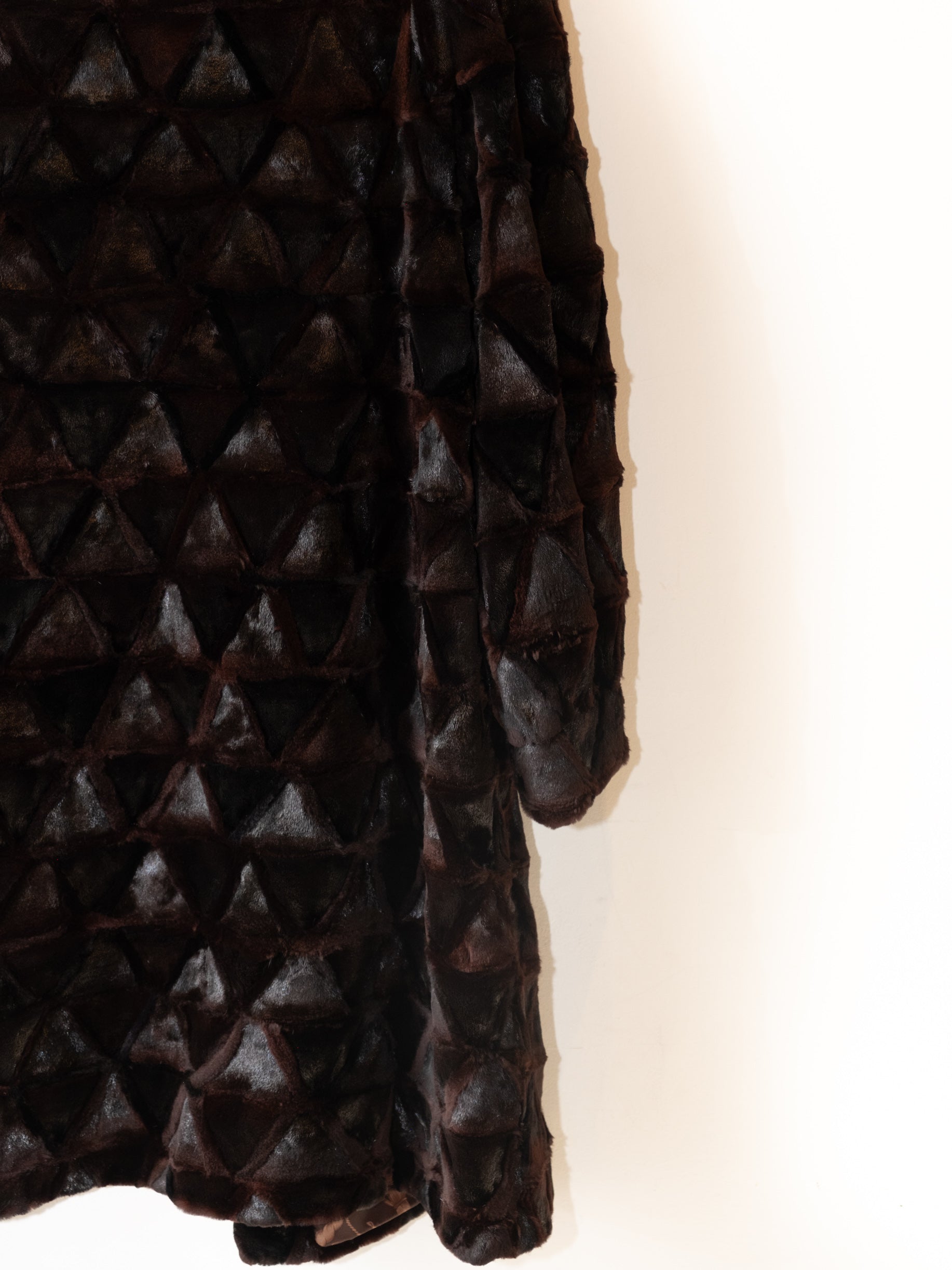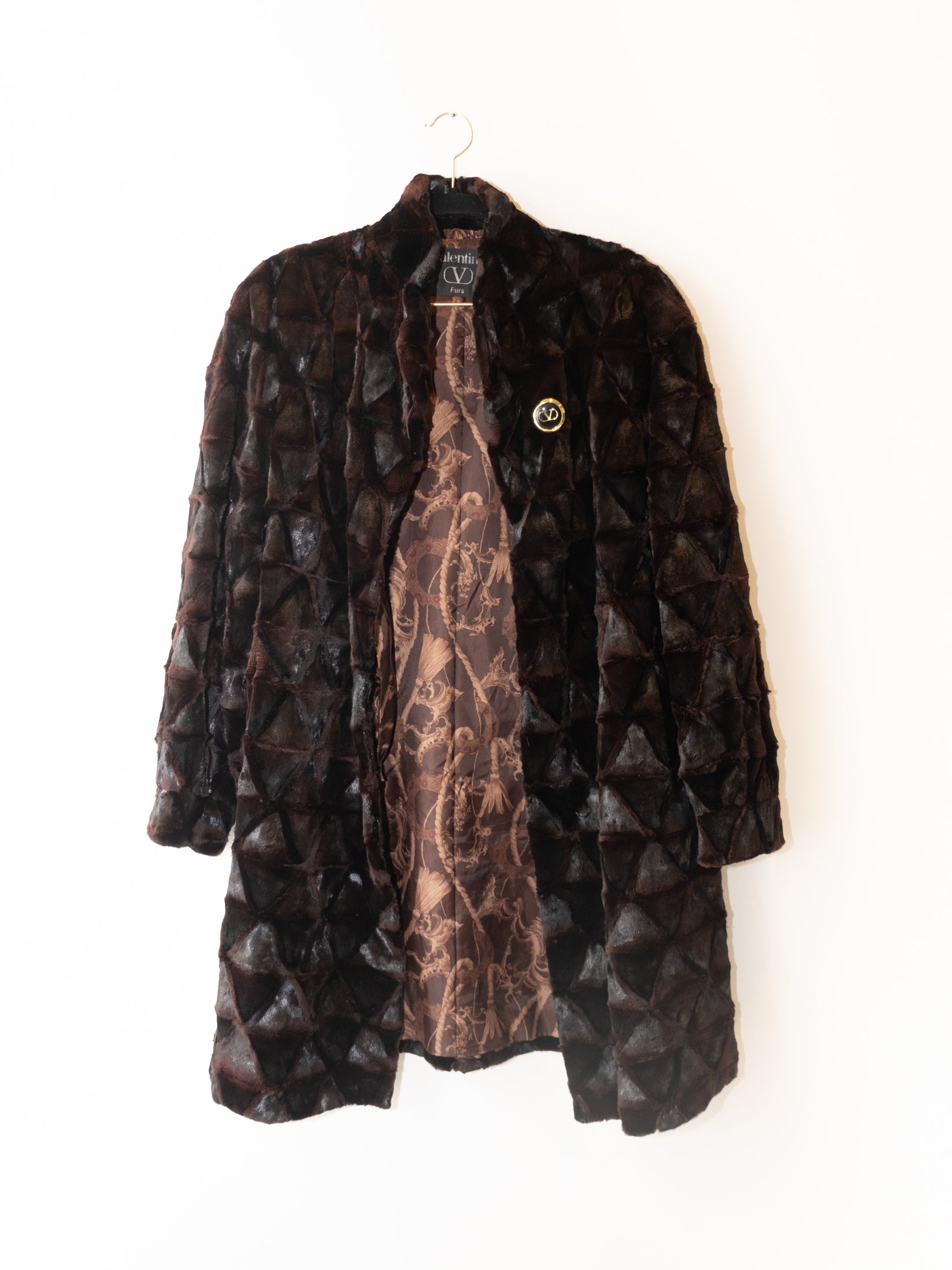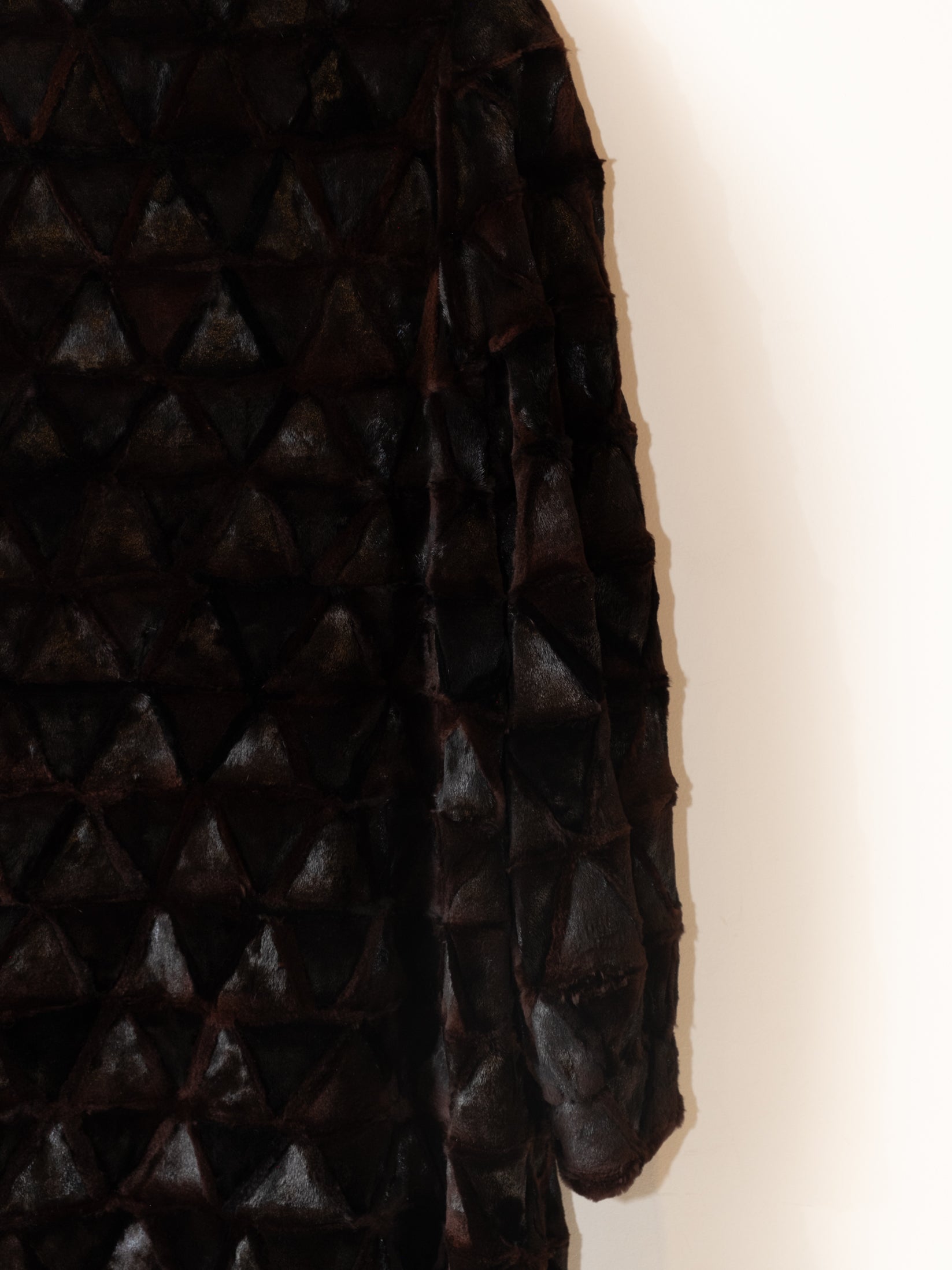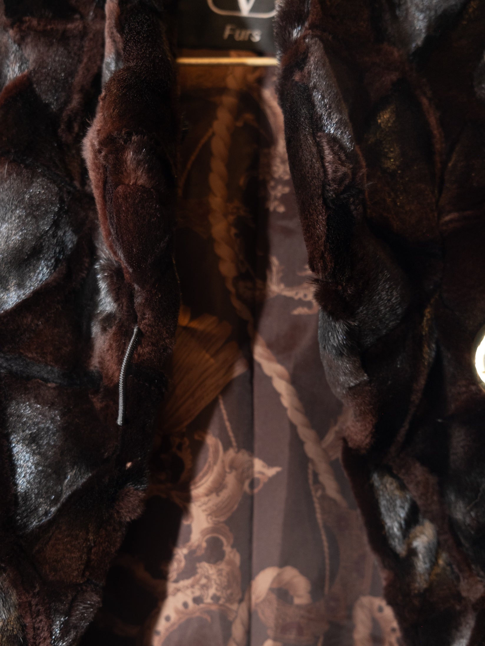 מעיל העשוי מפרווה בצבע חום הנסגר באמצעות ווים מוסתרים וכפתור ממות גדול, בעל שני כיסים צדדים ללא סגירה. הבטנה של המעיל בעלת ציורים המיוחדים של המותג וישנם שני לולאות המאפשרות להניח את המעיל על הכתפיים על מנת להראות את הבטנה.