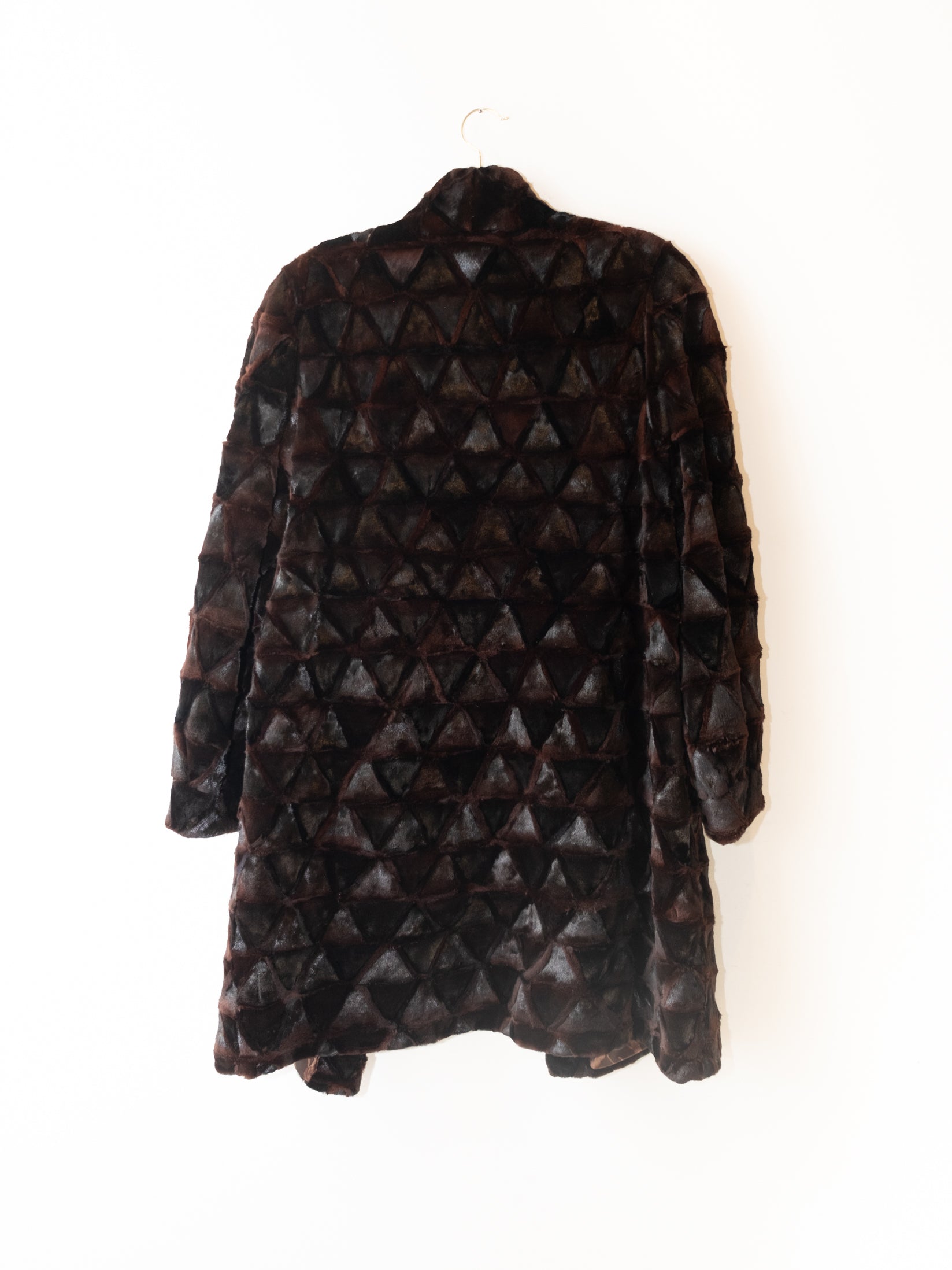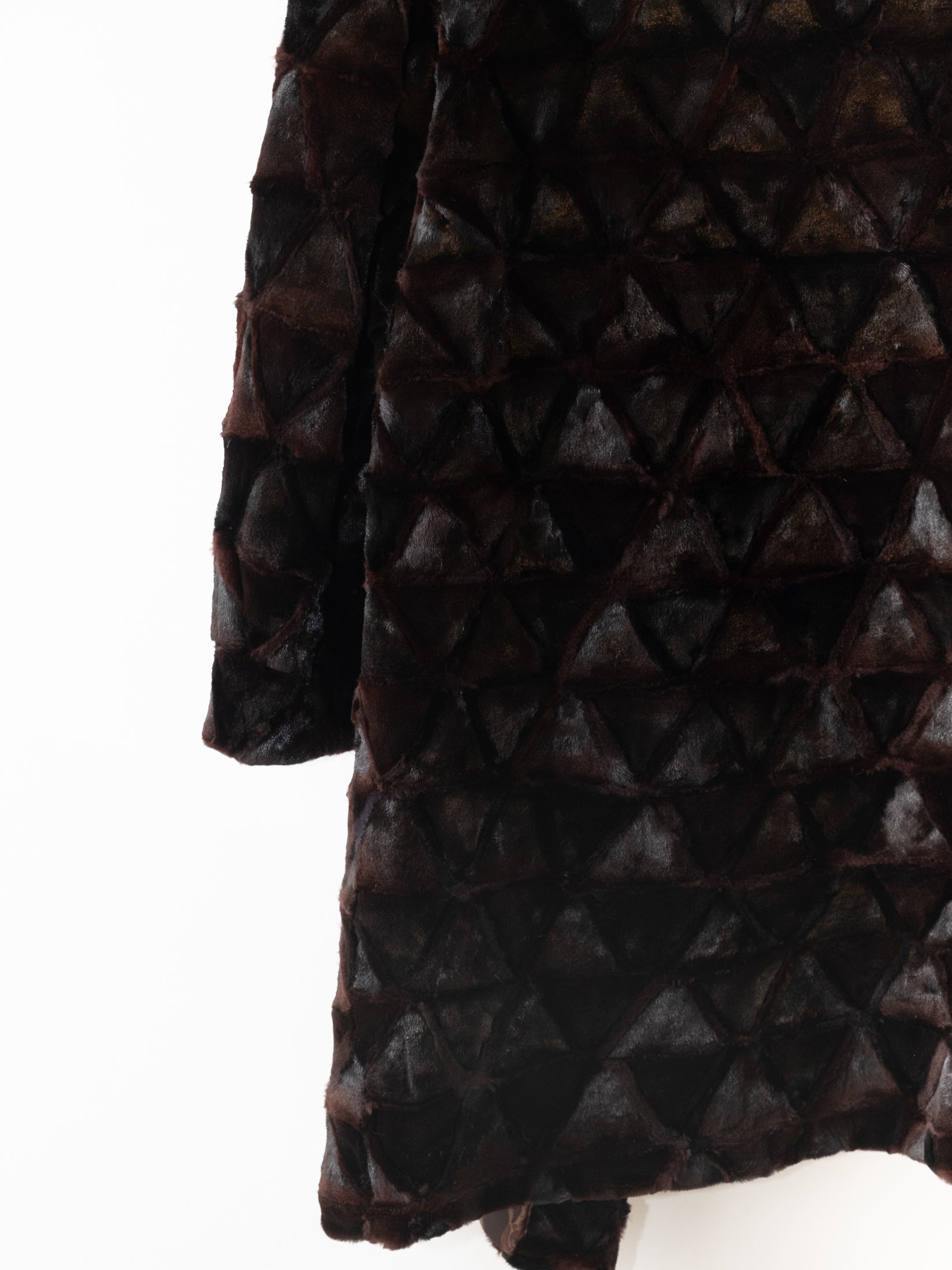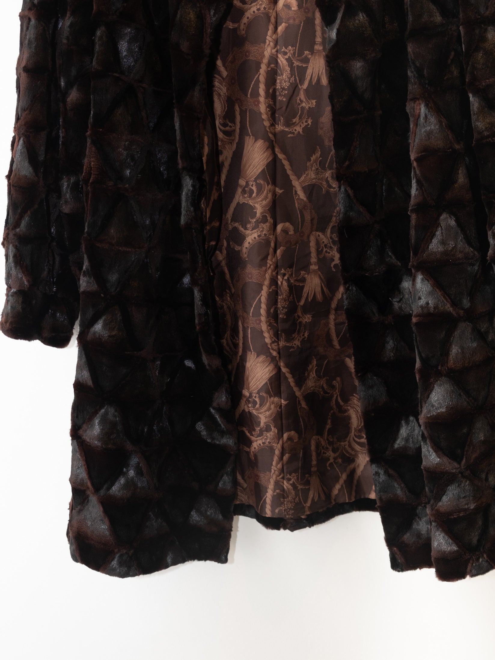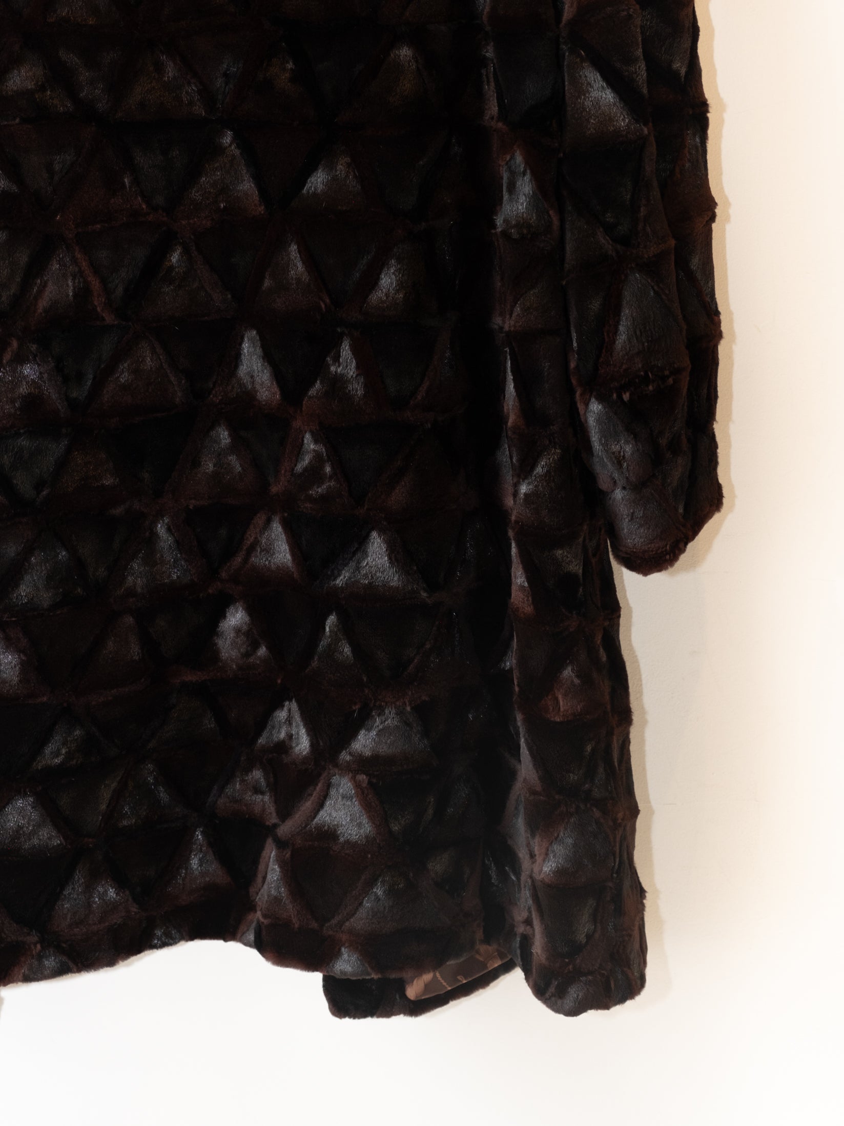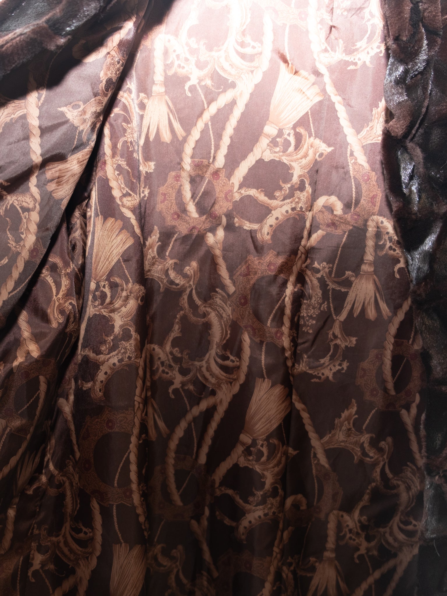 מעיל העשוי מפרווה בצבע חום הנסגר באמצעות ווים מוסתרים וכפתור ממות גדול, בעל שני כיסים צדדים ללא סגירה. הבטנה של המעיל בעלת ציורים המיוחדים של המותג וישנם שני לולאות המאפשרות להניח את המעיל על הכתפיים על מנת להראות את הבטנה.