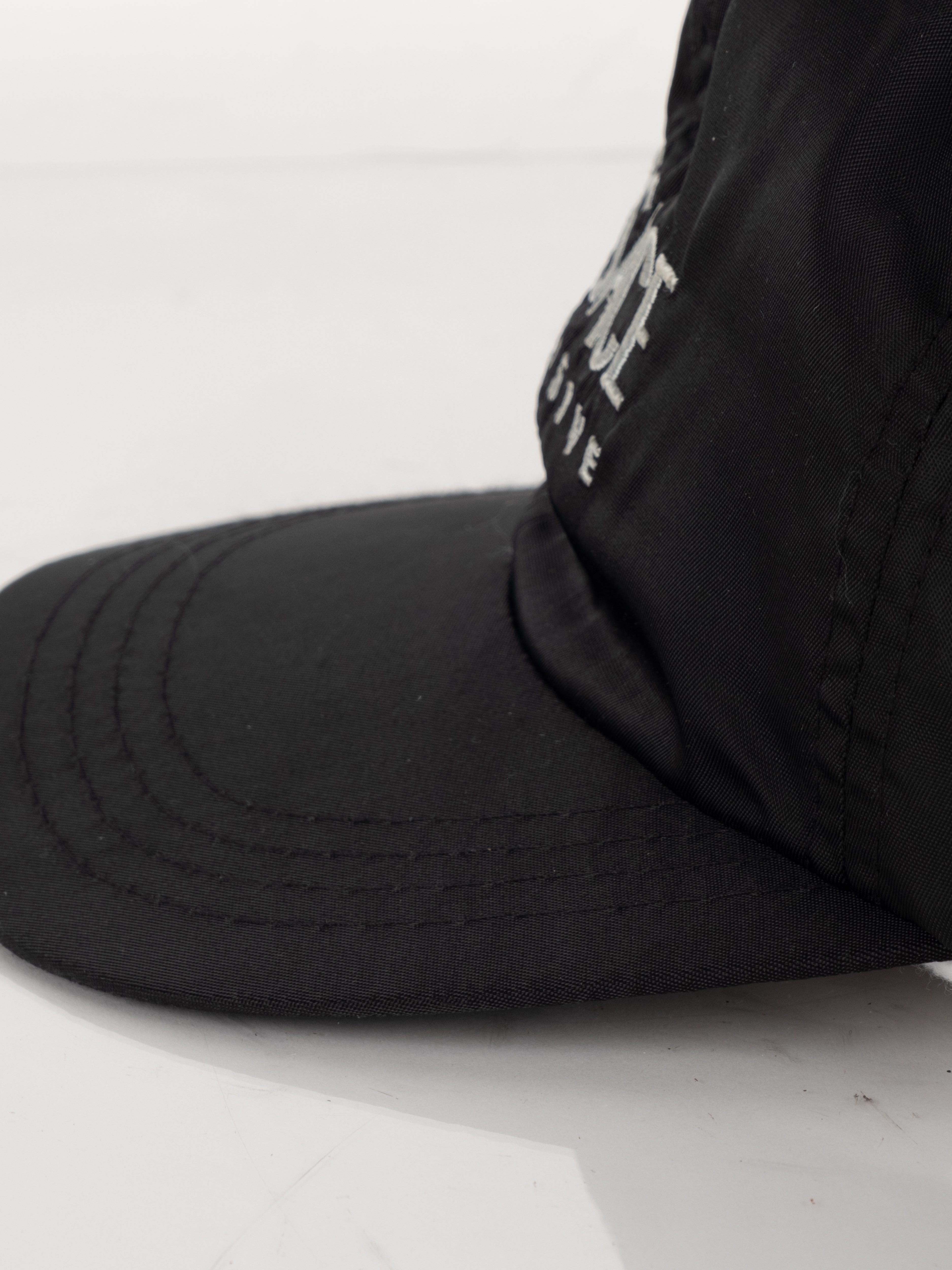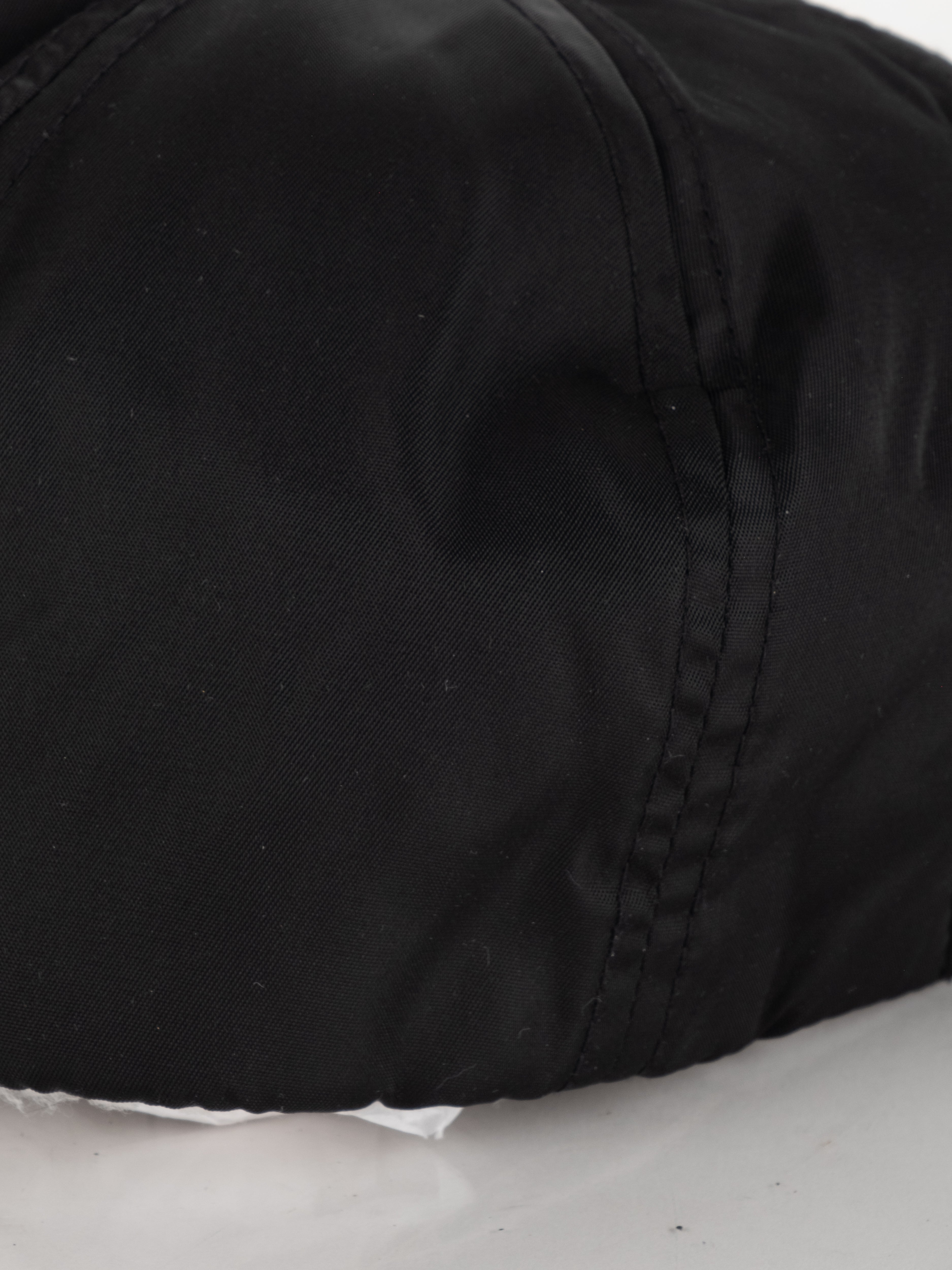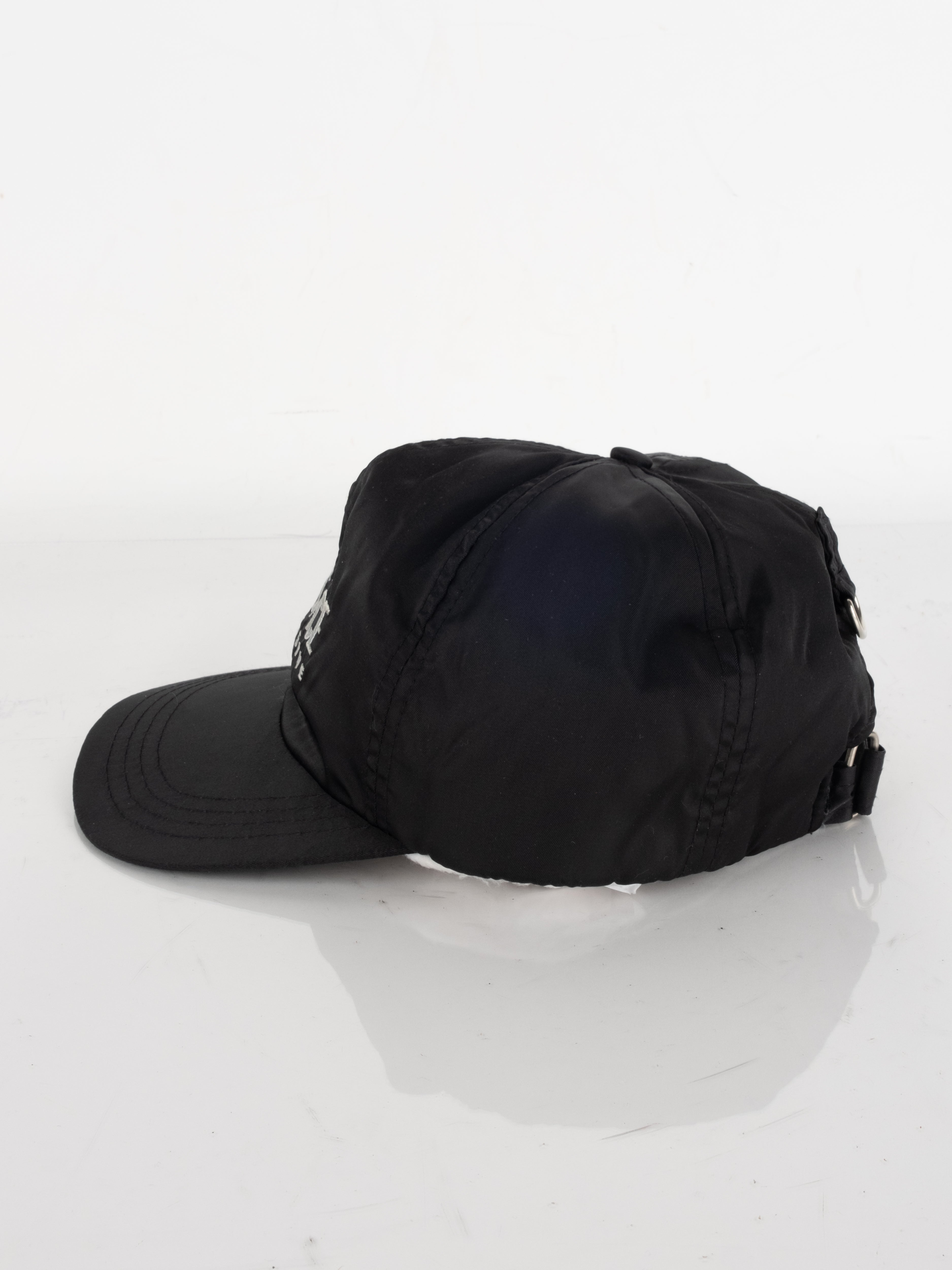 הכובע עשוי בד טקסטילי רך, סגירה אחורית מתכווננת, גוון שחור עם רקמת לוגו לבנה בחזית.