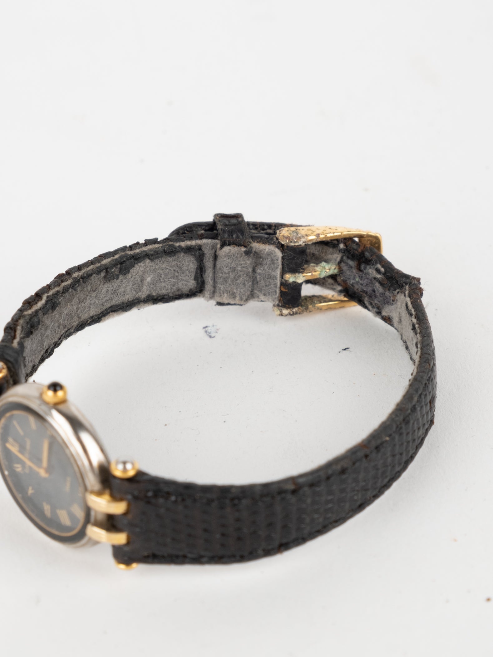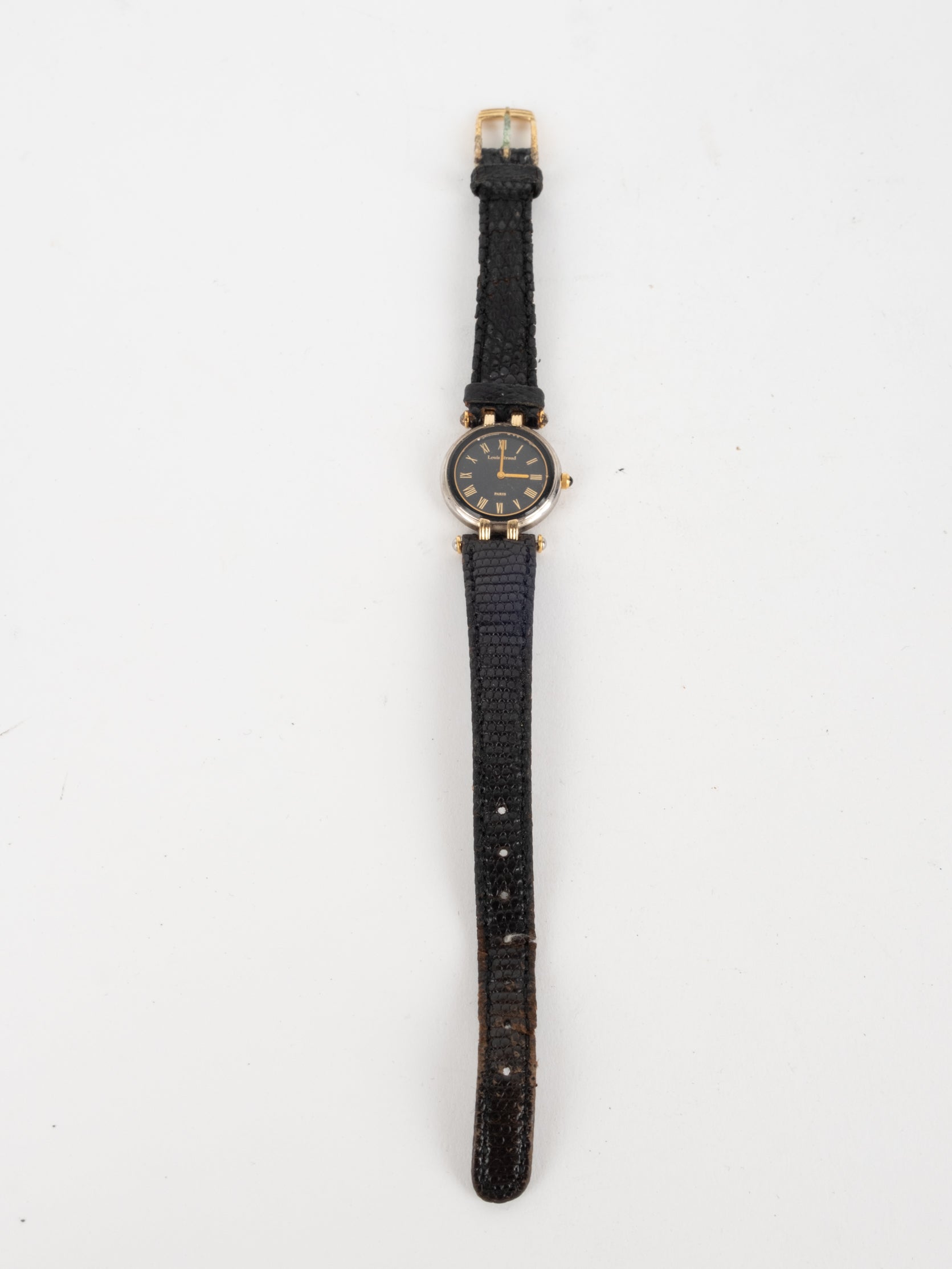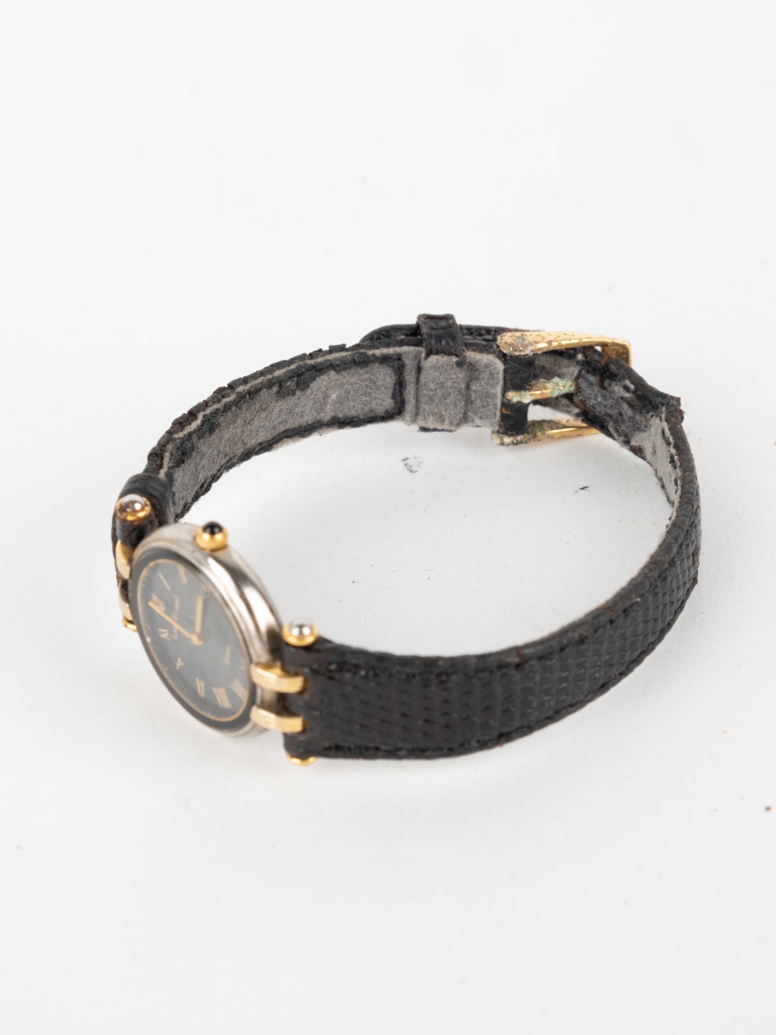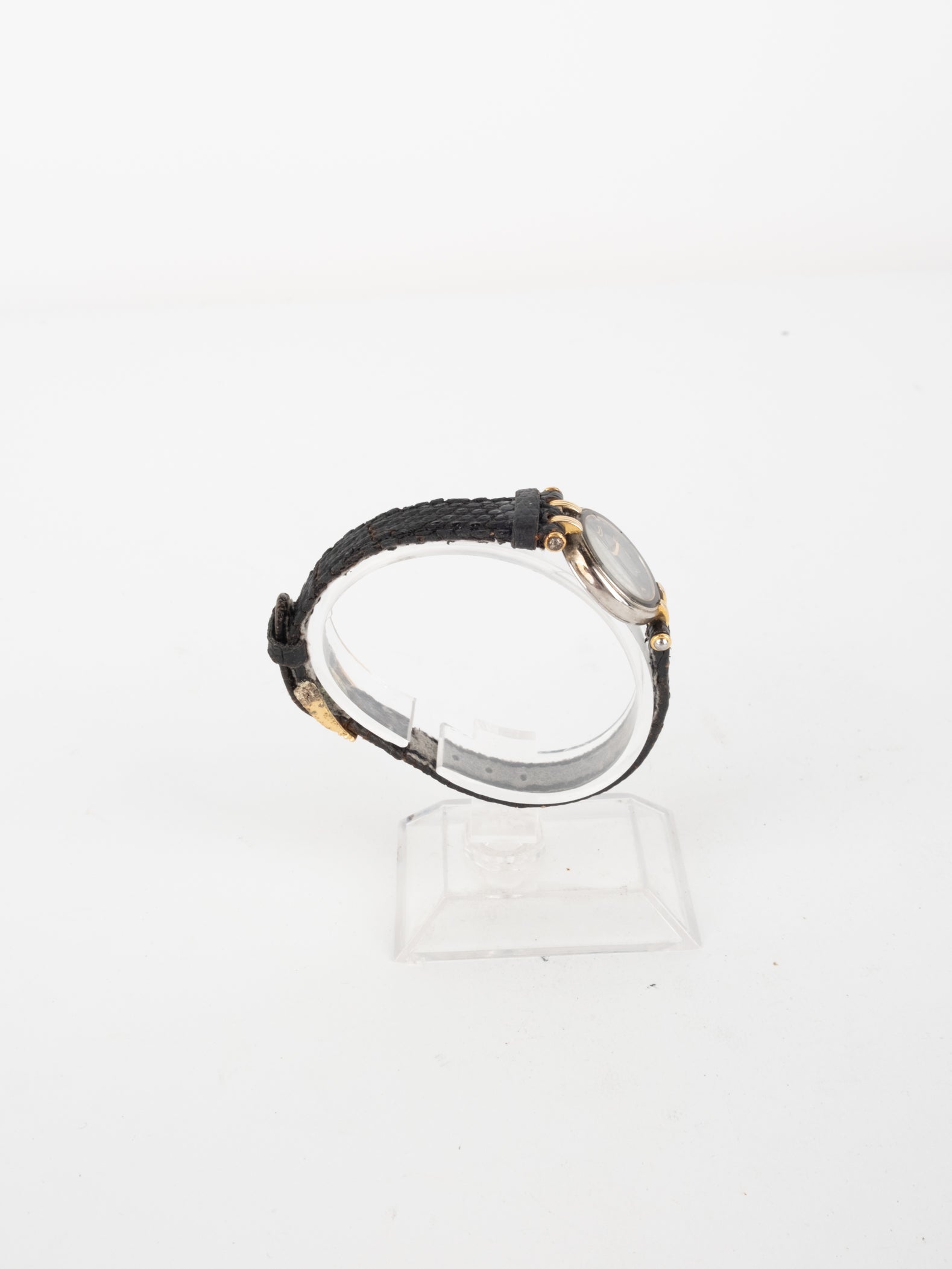 שעון מהמם בעל פני שעון בצורה עגולה עם מסגרת מוזהבת עם רקע שחור ומחוגים. שעון זה נסגר באמצעות רצועות העשויות מעור בצבע שחור שניתן לכוון.