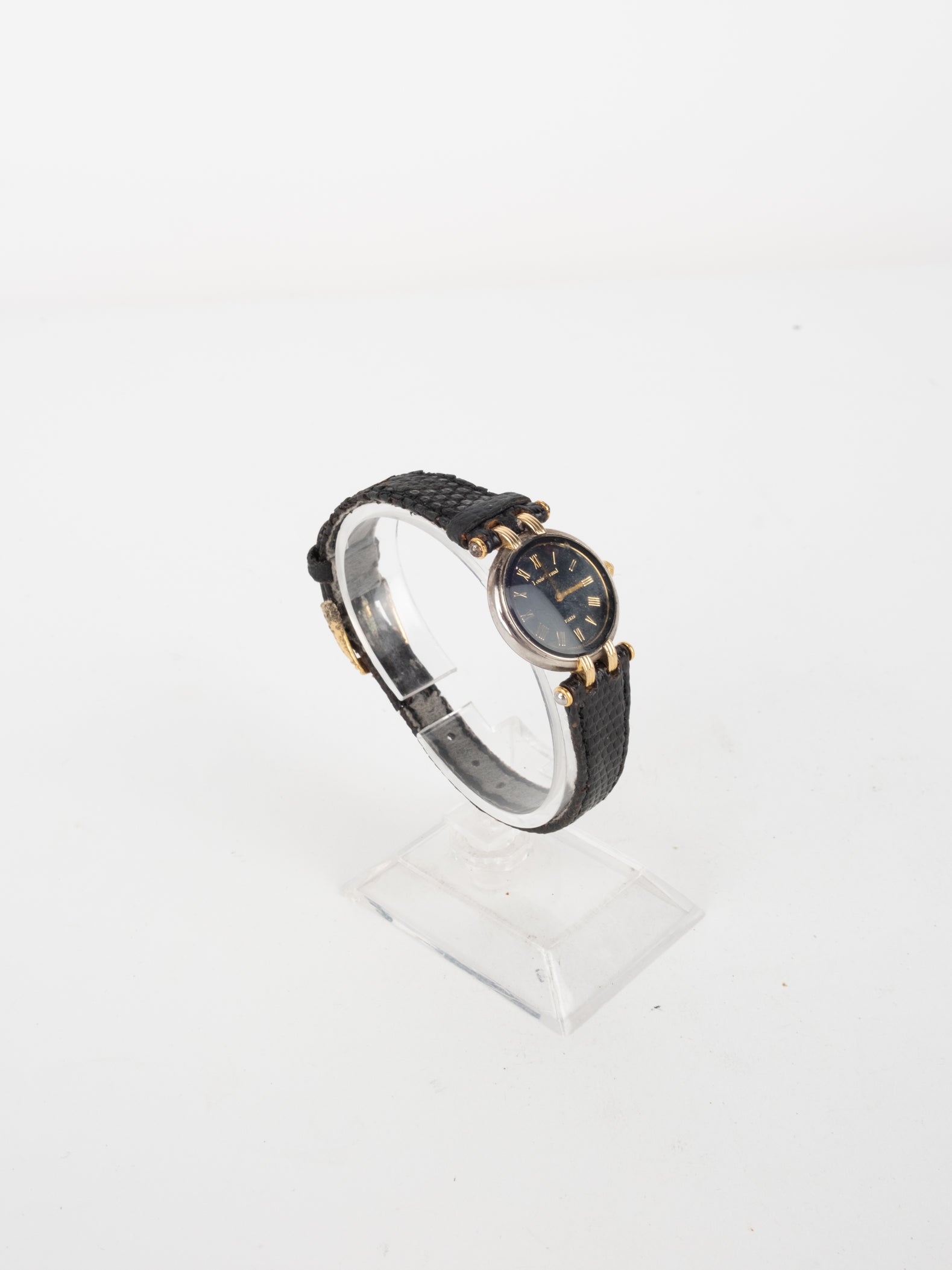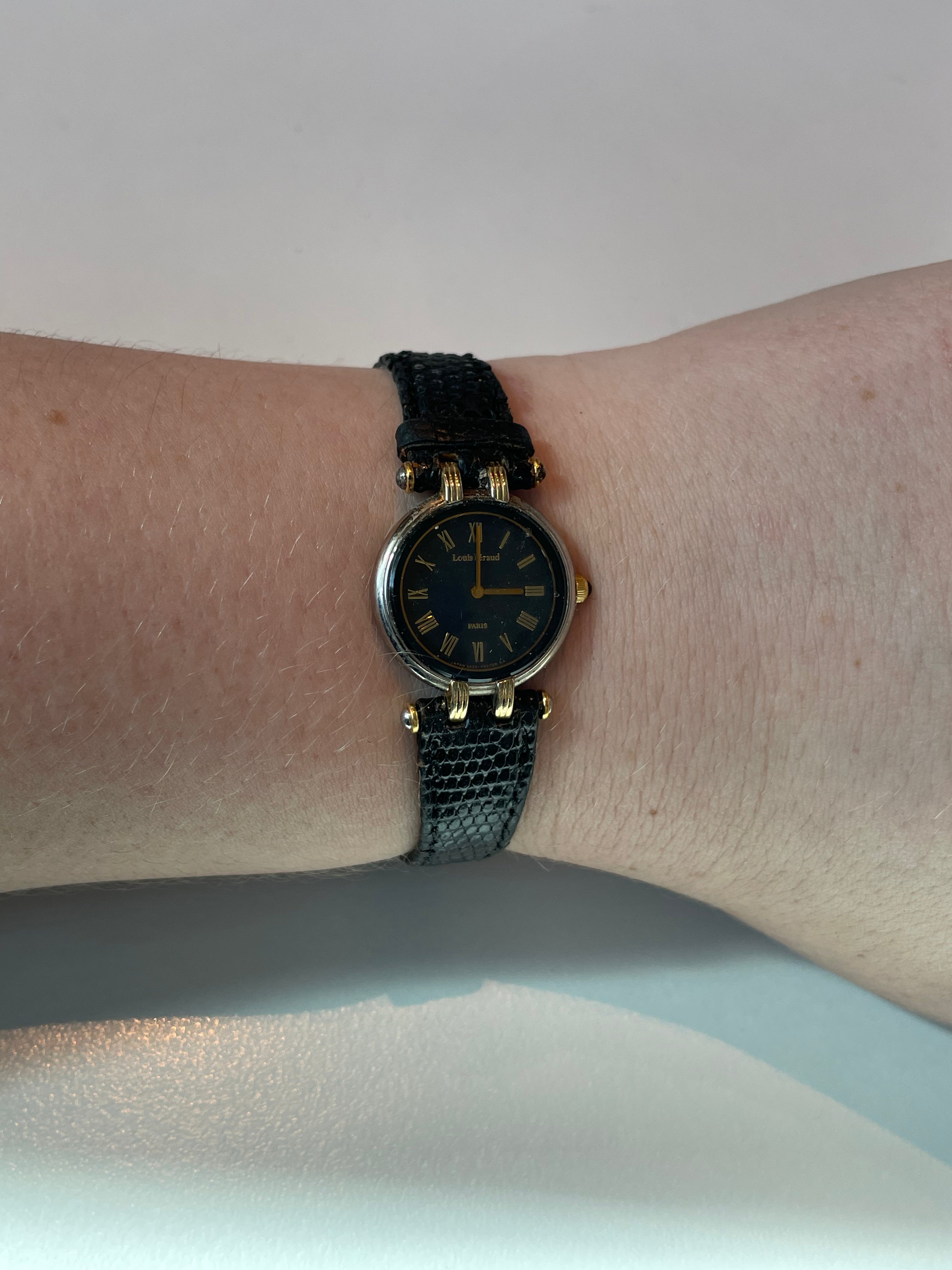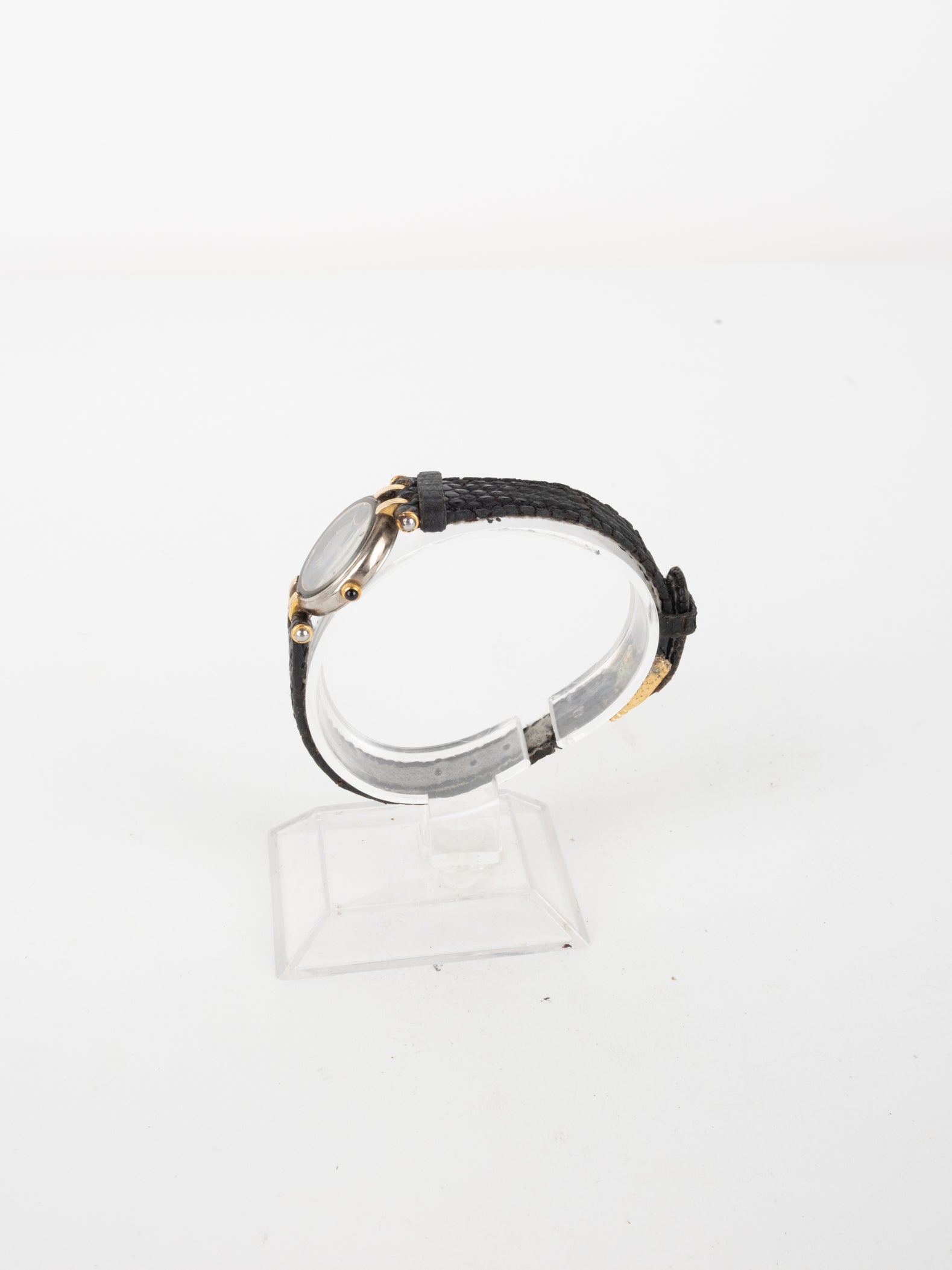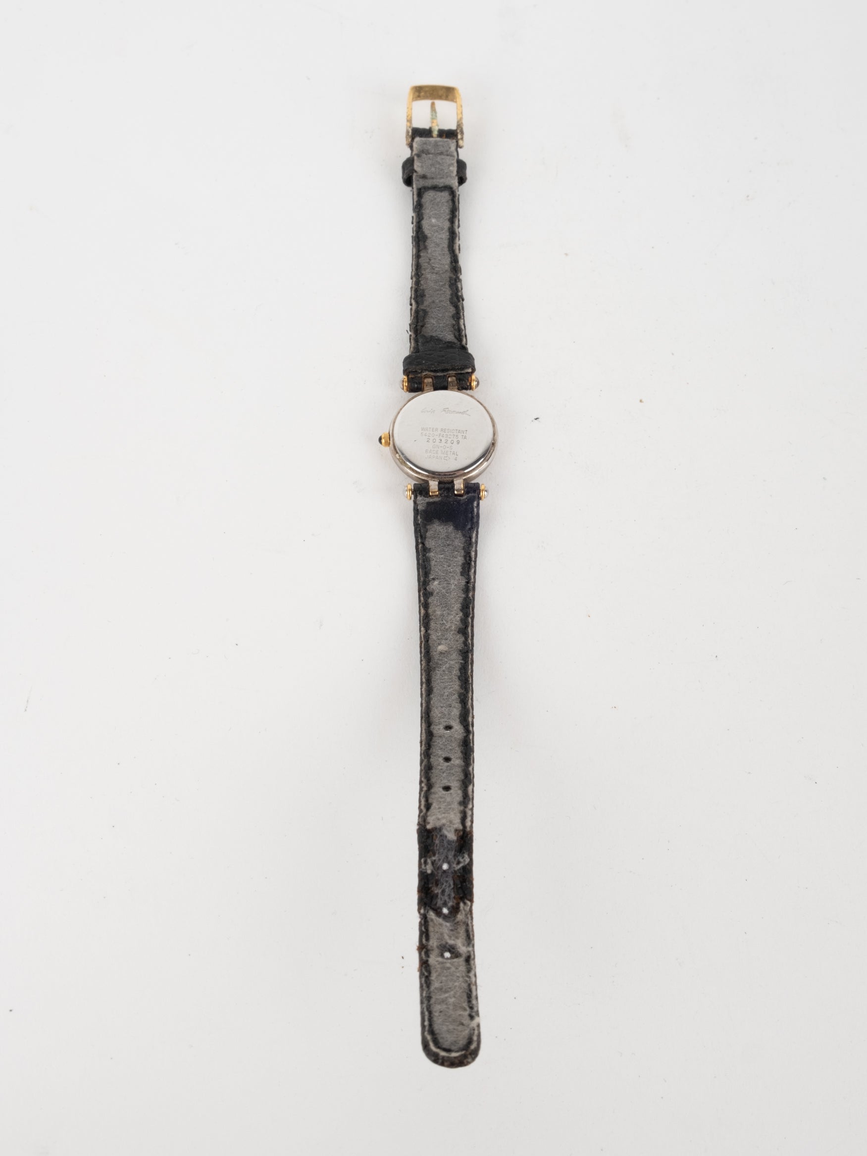 שעון מהמם בעל פני שעון בצורה עגולה עם מסגרת מוזהבת עם רקע שחור ומחוגים. שעון זה נסגר באמצעות רצועות העשויות מעור בצבע שחור שניתן לכוון.