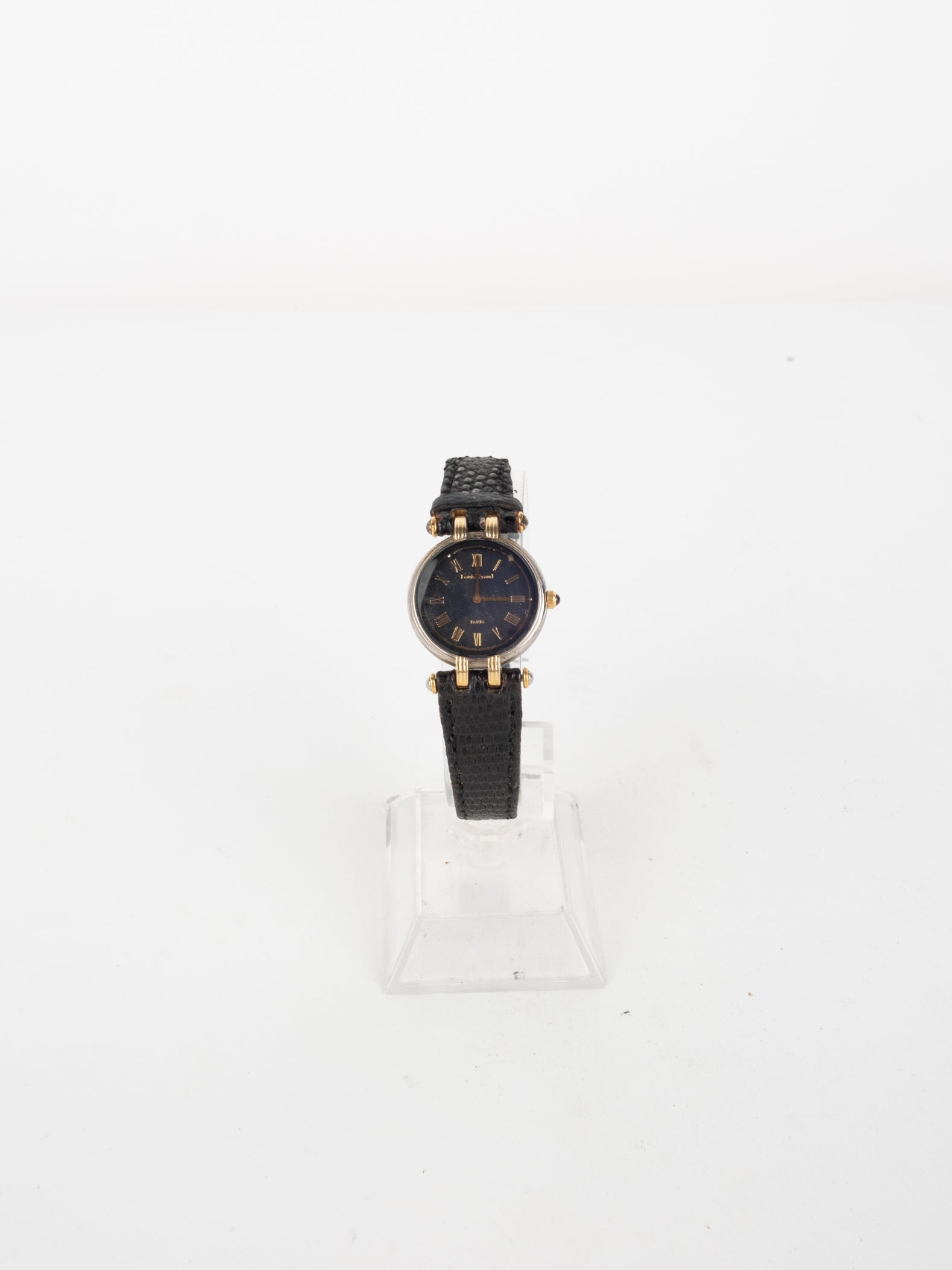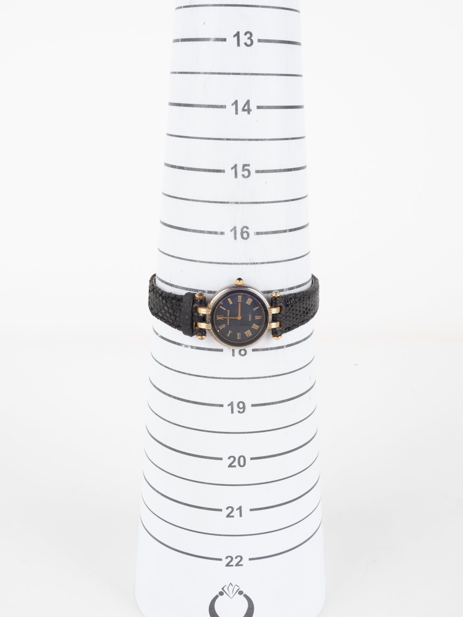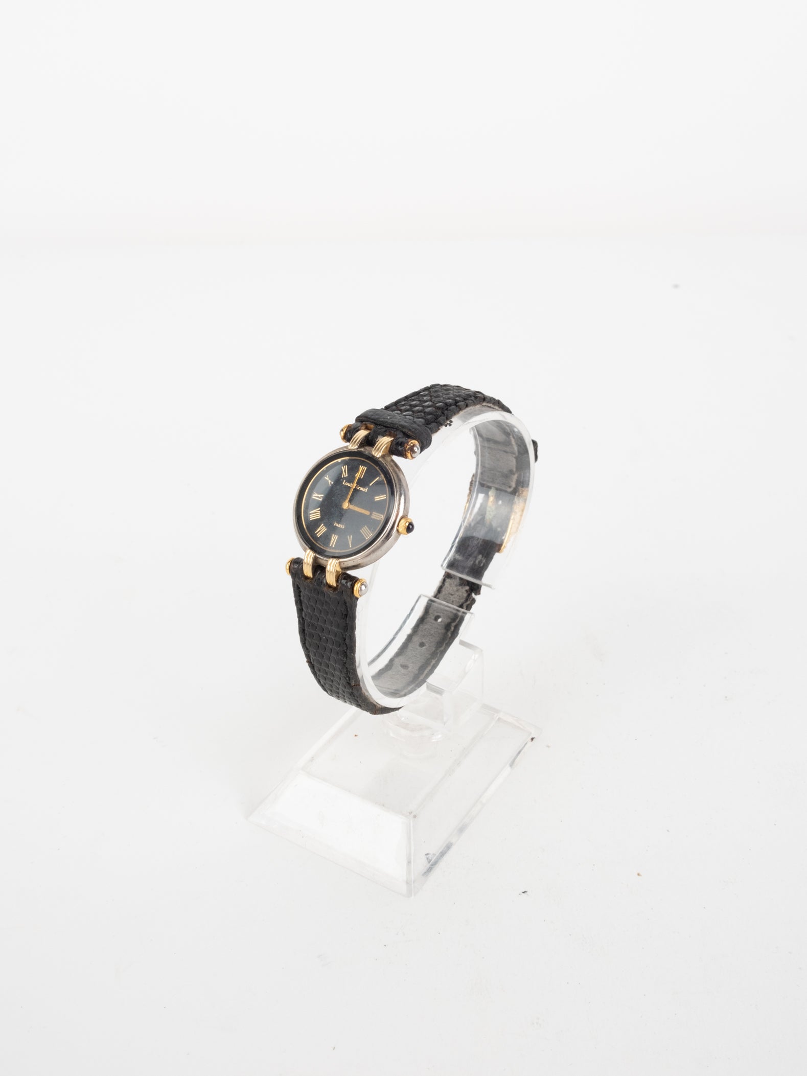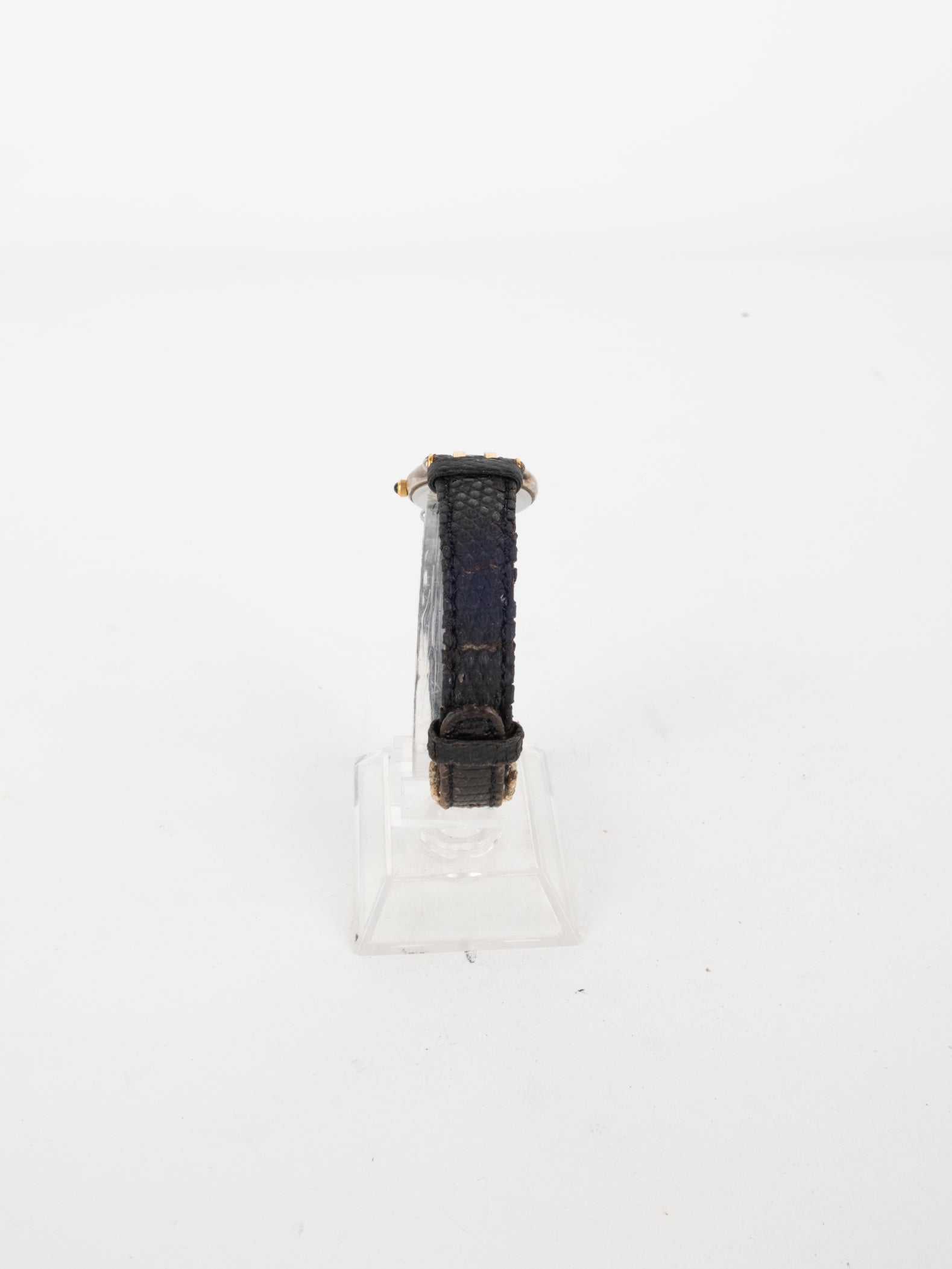 שעון מהמם בעל פני שעון בצורה עגולה עם מסגרת מוזהבת עם רקע שחור ומחוגים. שעון זה נסגר באמצעות רצועות העשויות מעור בצבע שחור שניתן לכוון.