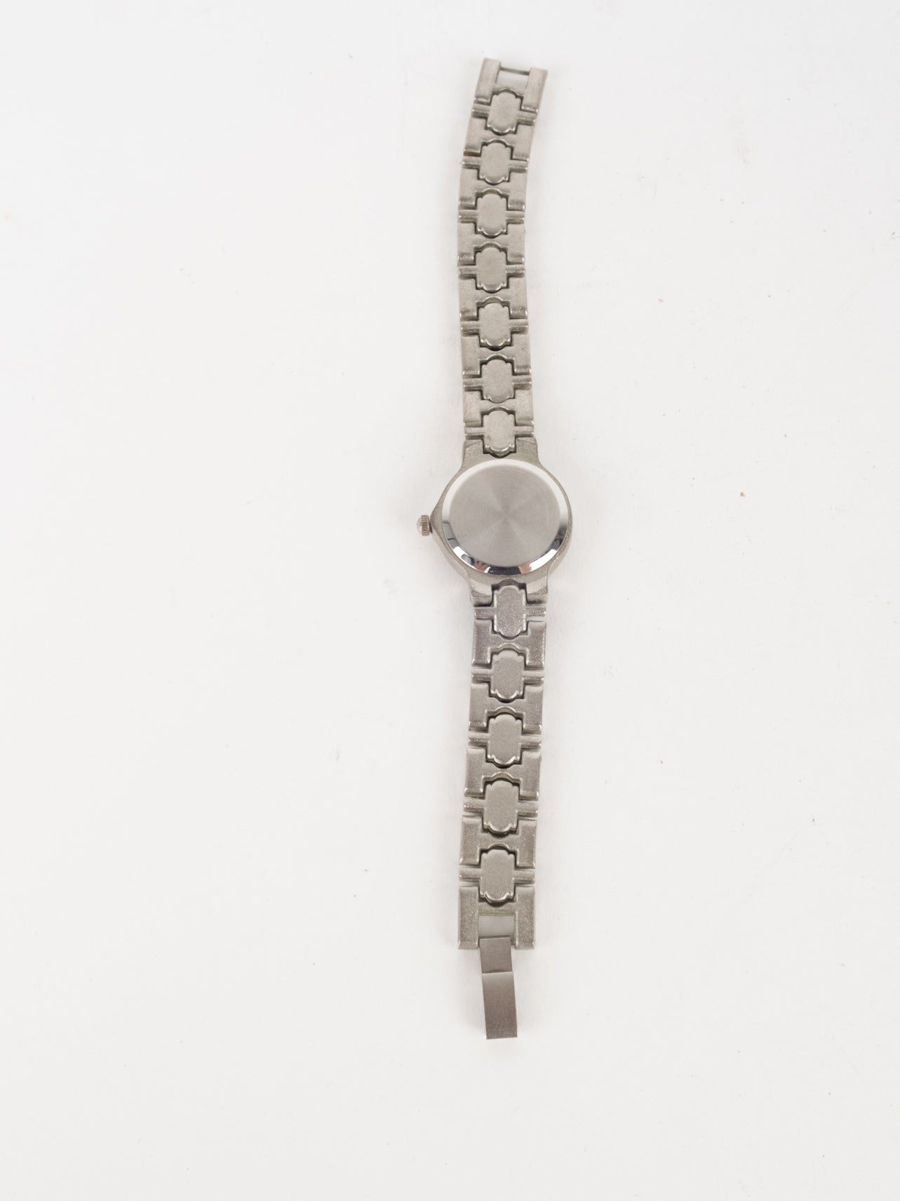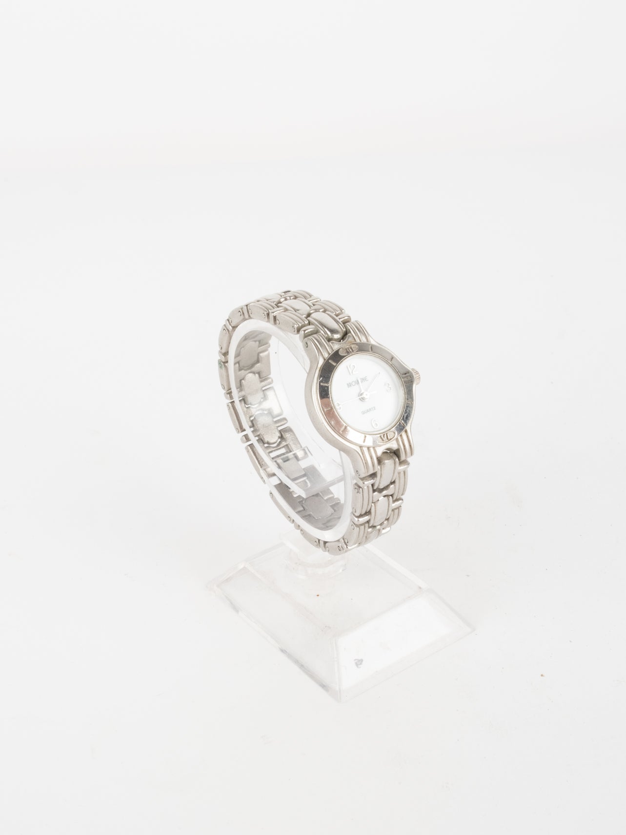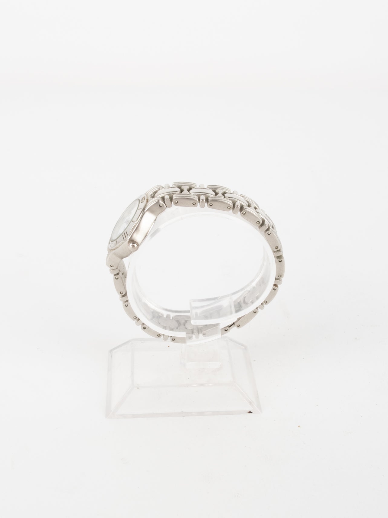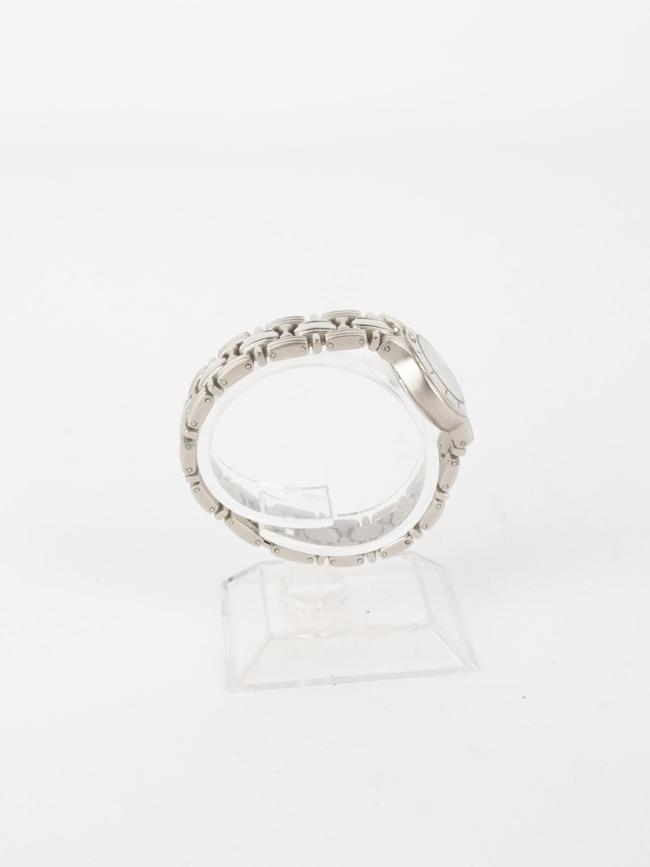שעון קלאסי בצבע כסוף בעל פני שעון בצורה עגולה עם רקע לבן ומחוגים. שעון זה נסגר באמצעות סוגר ממותג.