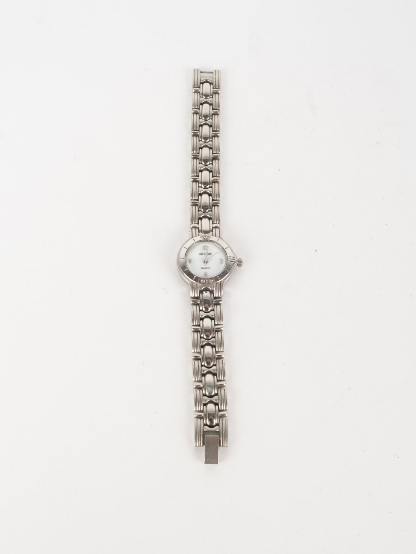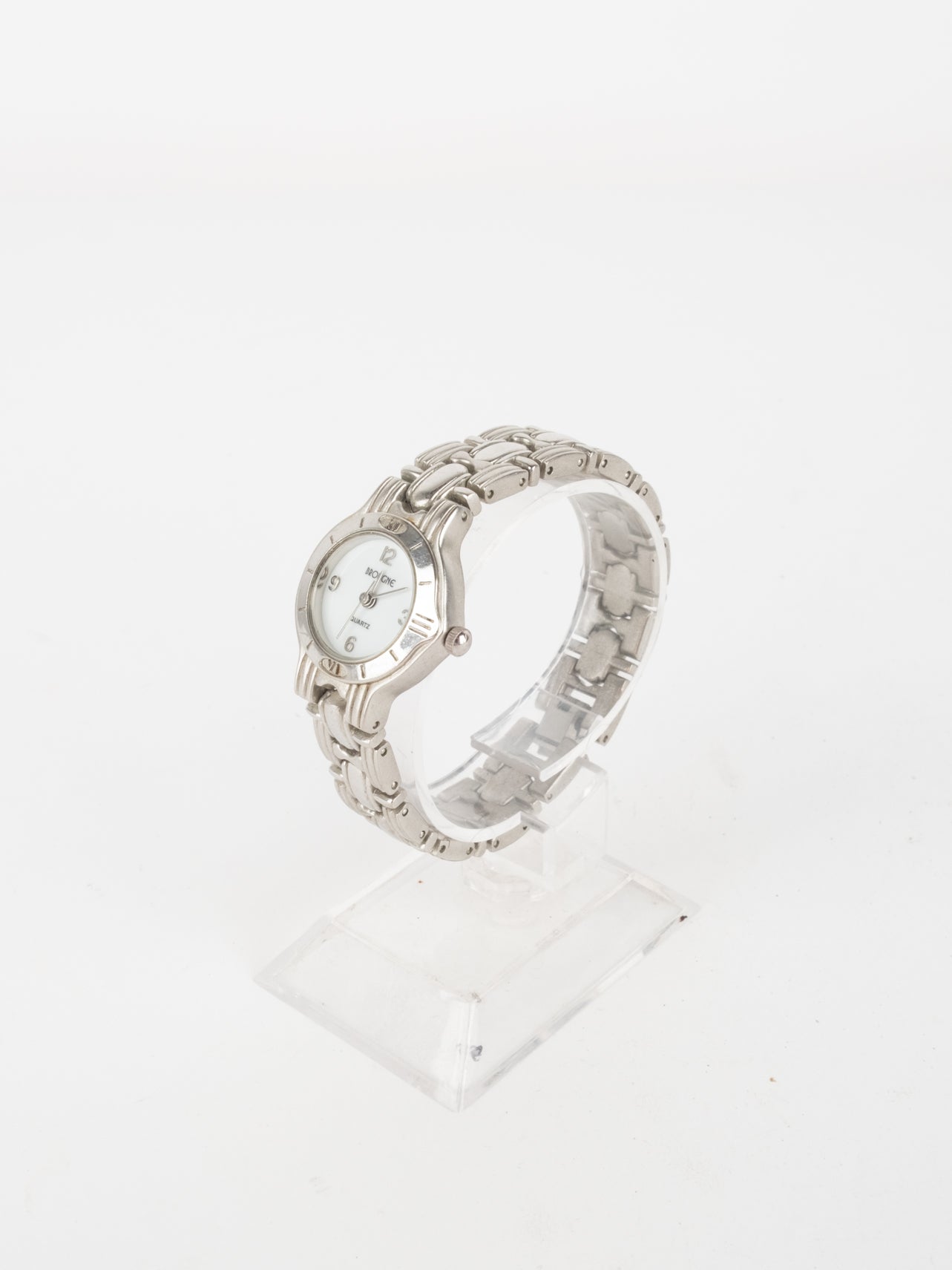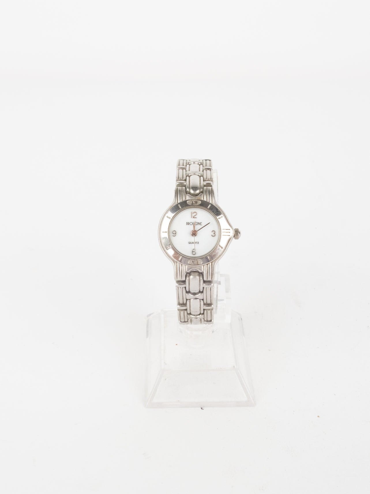 שעון קלאסי בצבע כסוף בעל פני שעון בצורה עגולה עם רקע לבן ומחוגים. שעון זה נסגר באמצעות סוגר ממותג.