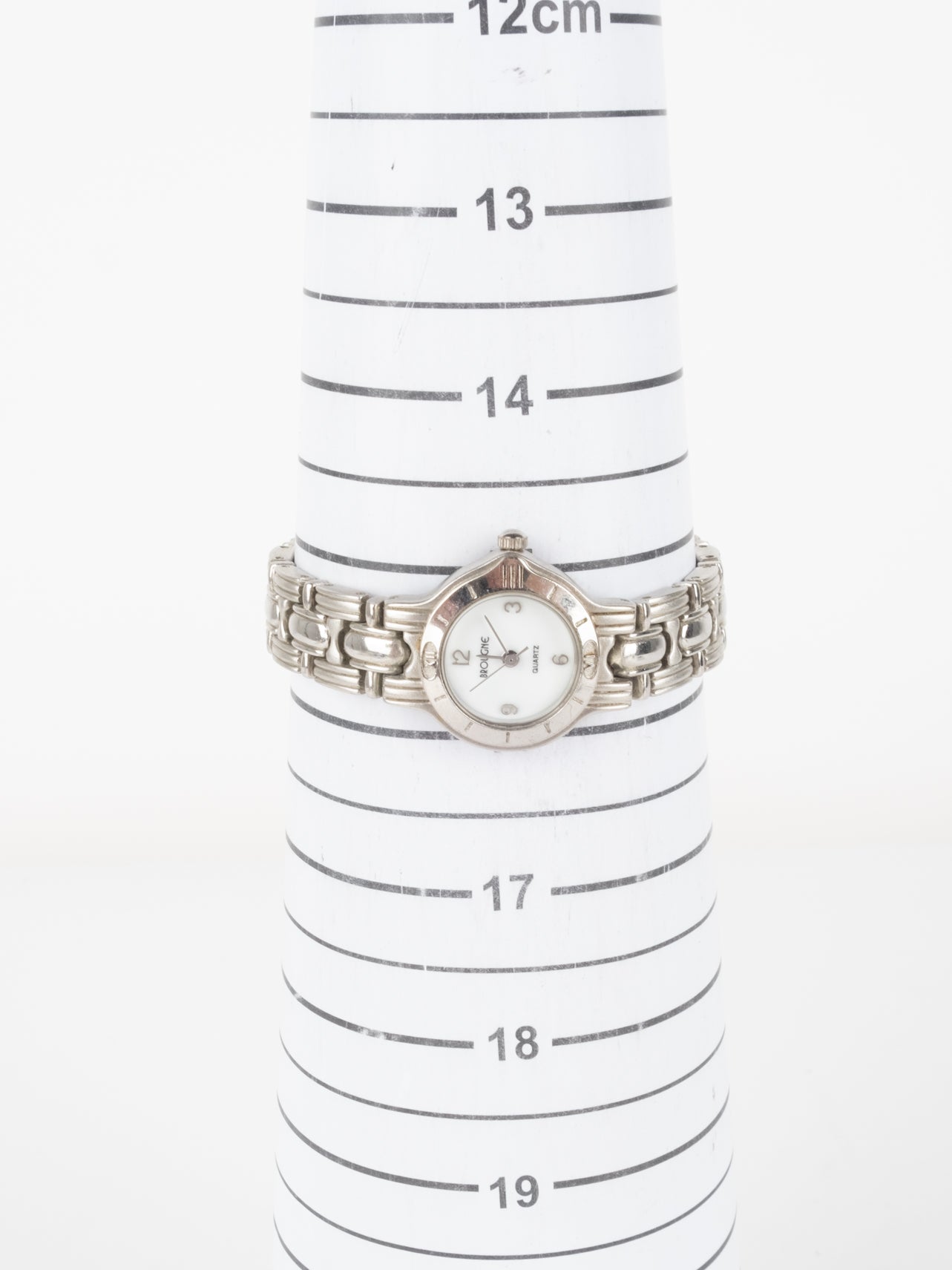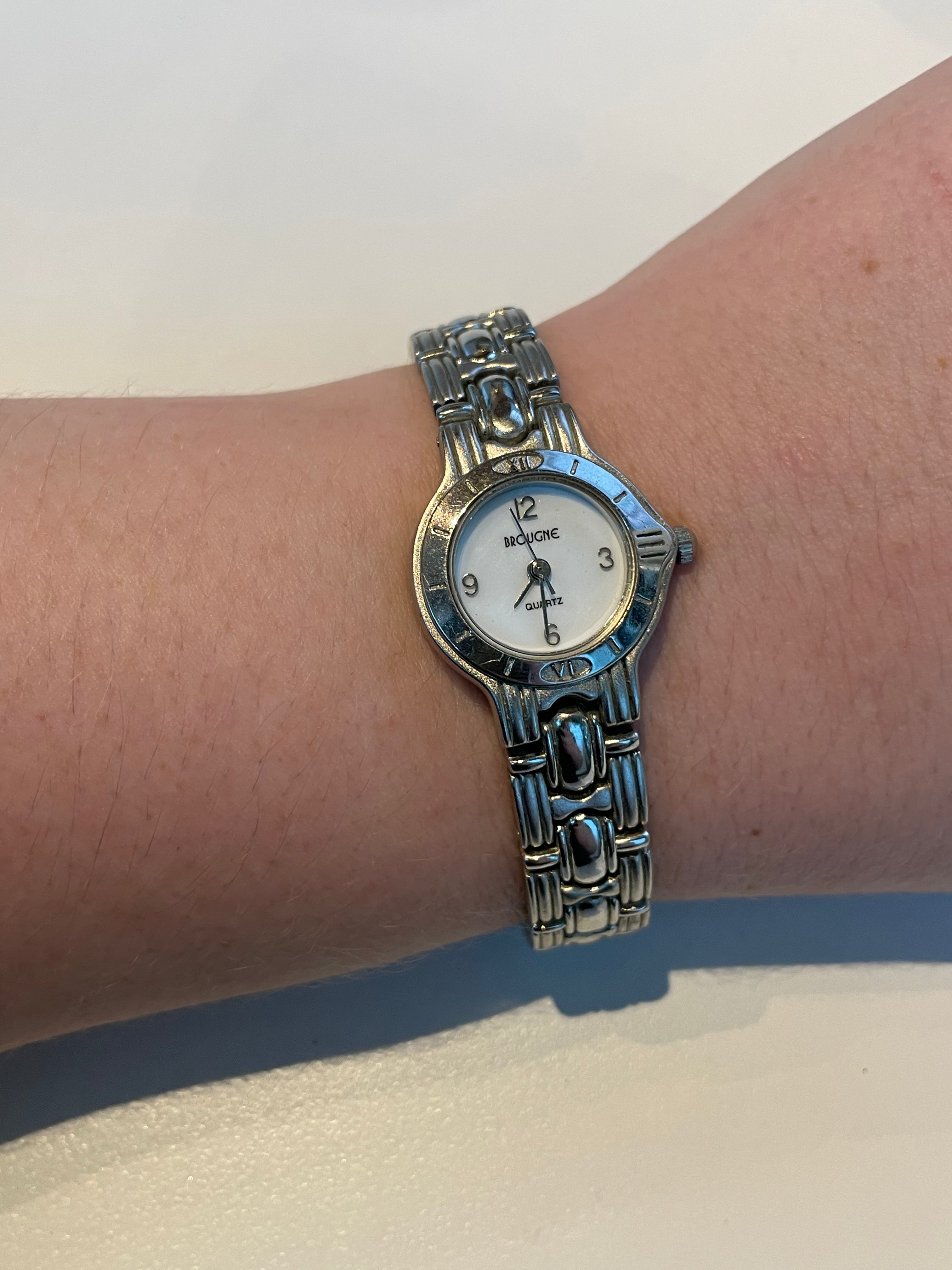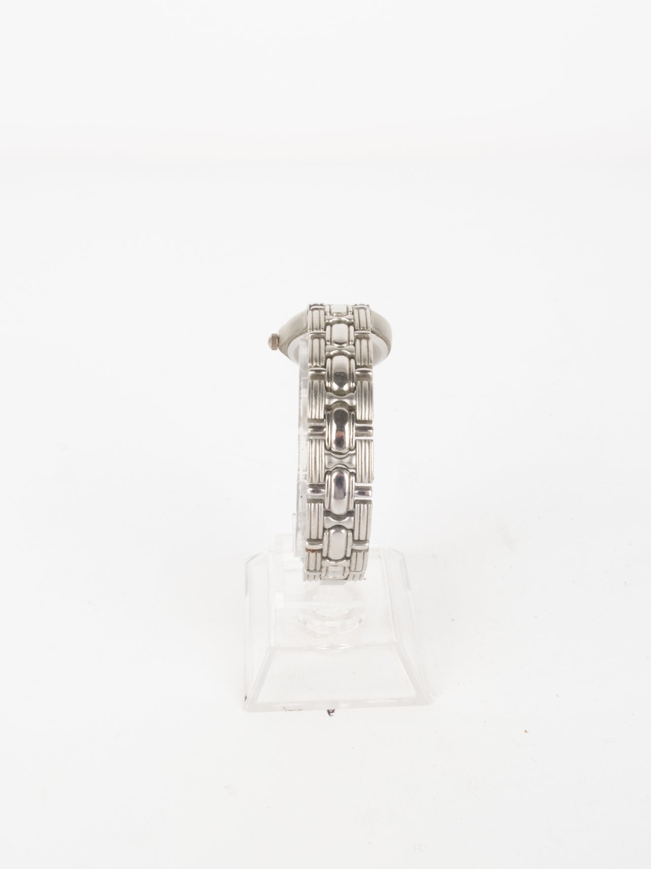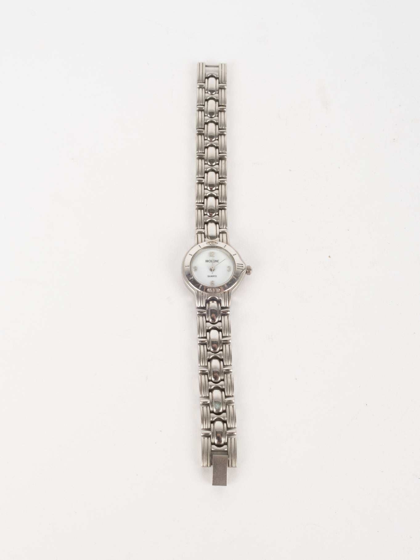 שעון קלאסי בצבע כסוף בעל פני שעון בצורה עגולה עם רקע לבן ומחוגים. שעון זה נסגר באמצעות סוגר ממותג.