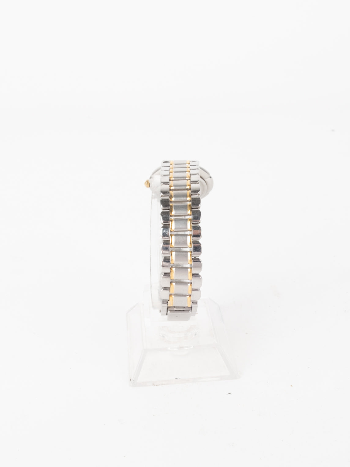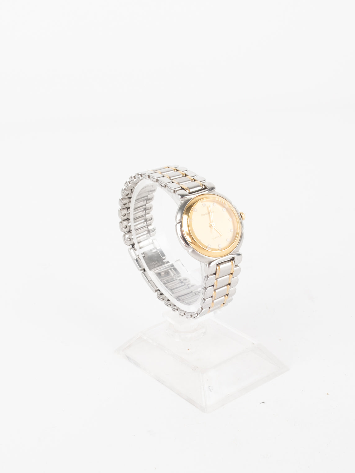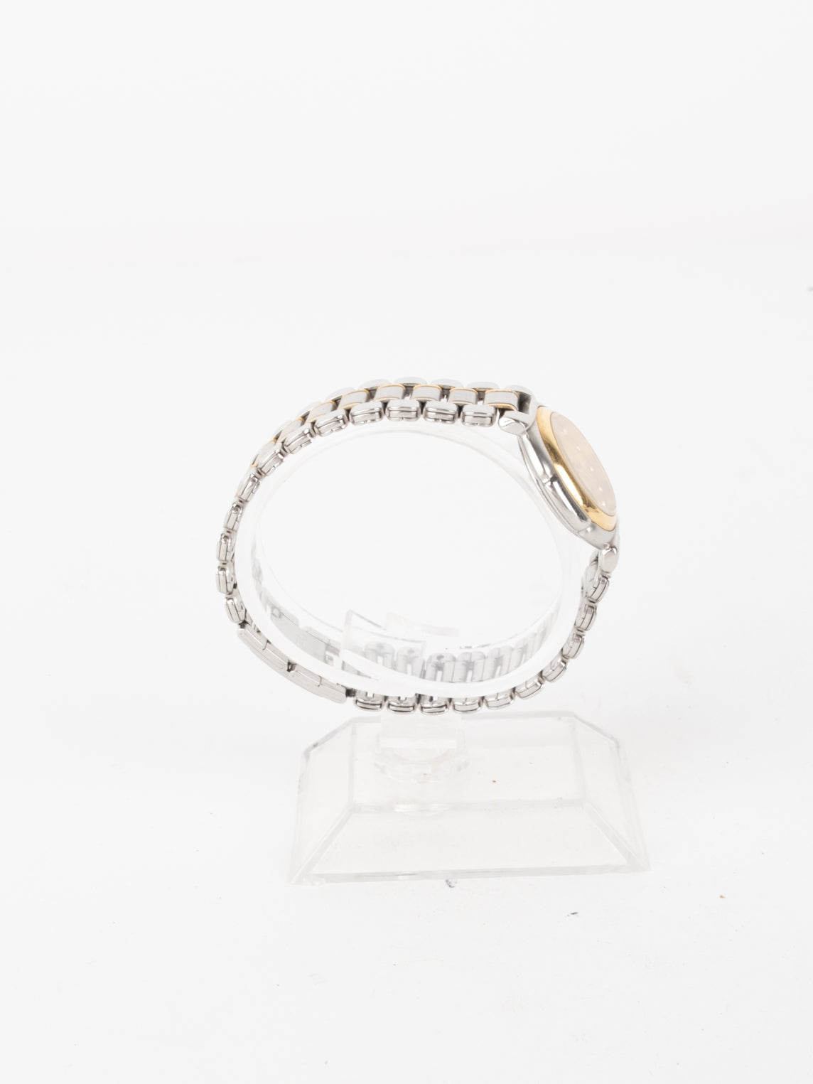 שעון עדין ומהמם בצבע כסוף בשילוב עם זהב בעל פני שעון בצורה עגולה עם רקע מוזהב ומחוגים. שעון זה נסגר באמצעות סוגר ממותגץ