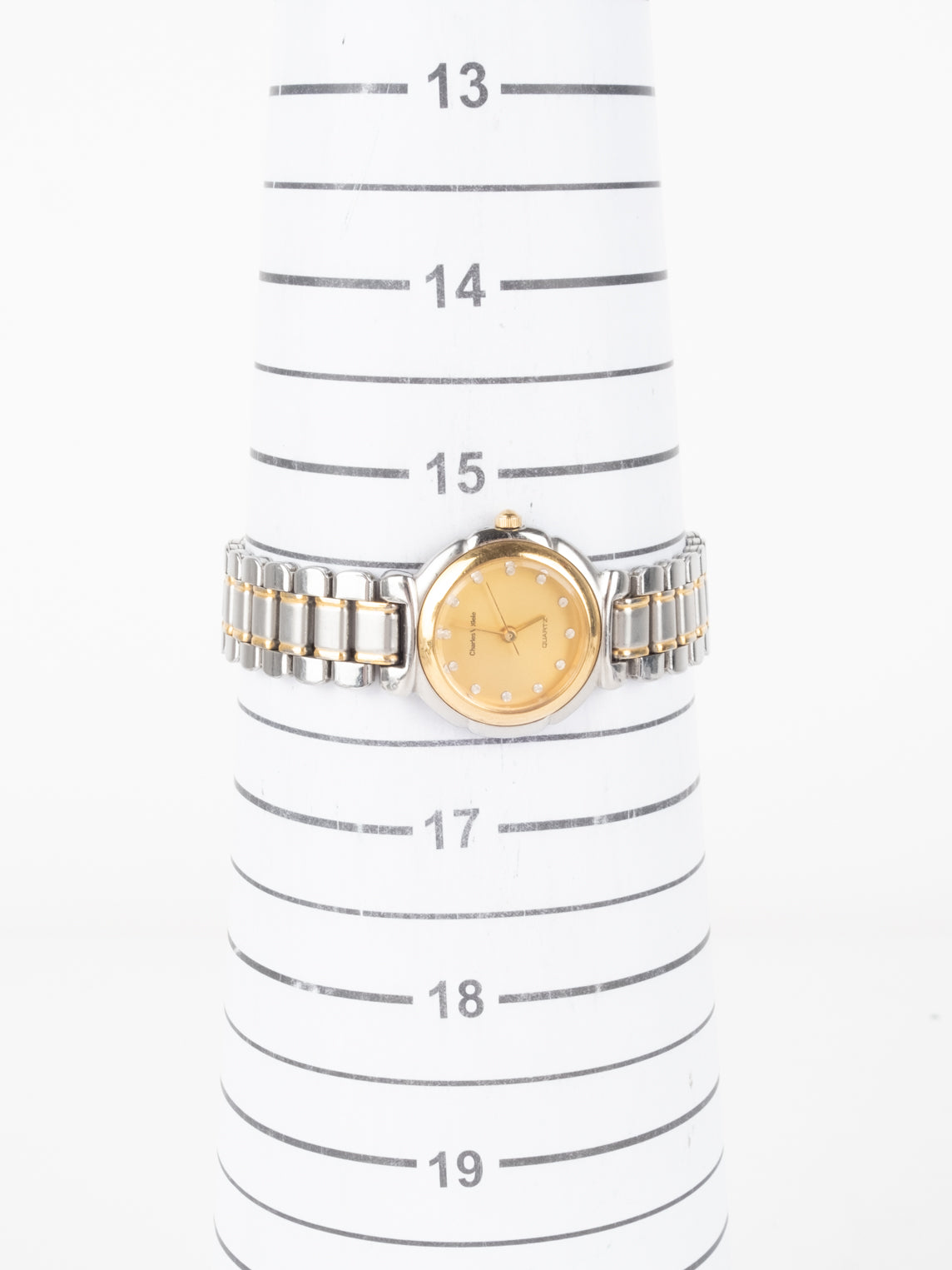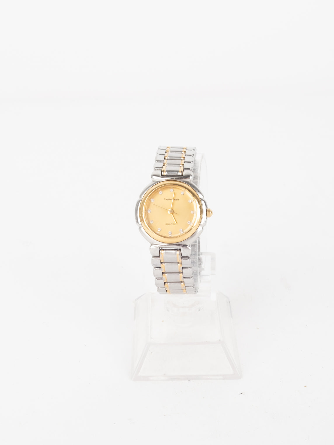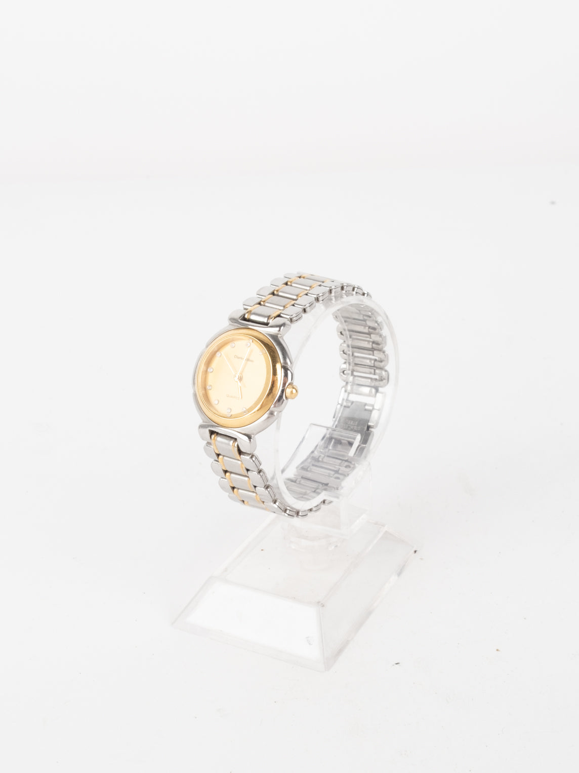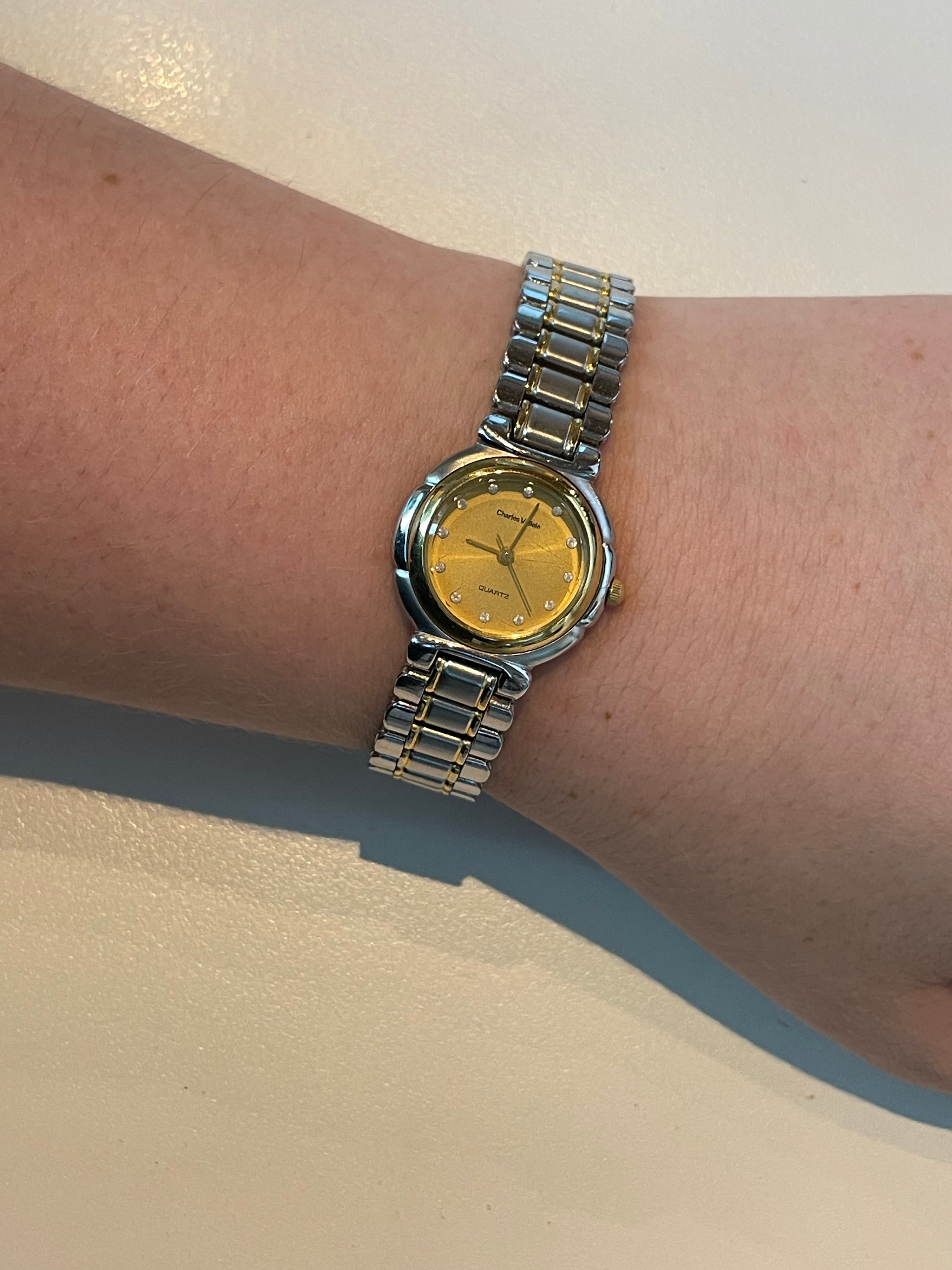 שעון עדין ומהמם בצבע כסוף בשילוב עם זהב בעל פני שעון בצורה עגולה עם רקע מוזהב ומחוגים. שעון זה נסגר באמצעות סוגר ממותגץ