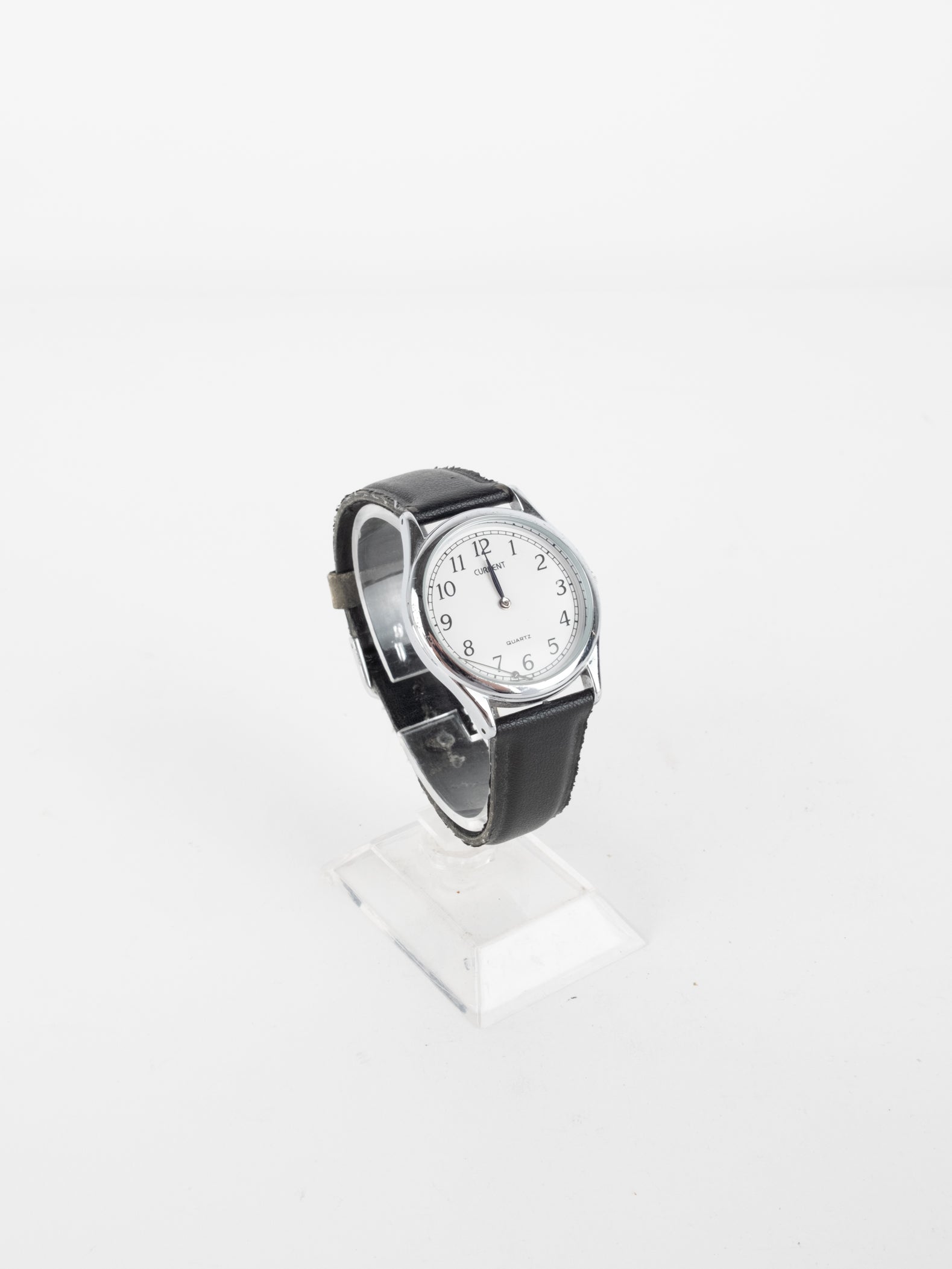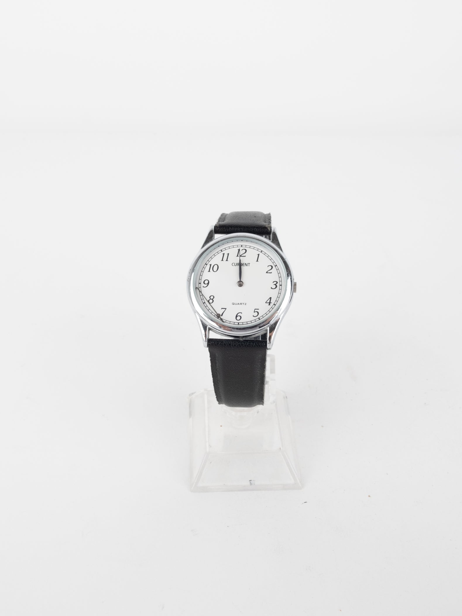 שעון קלאסי בעל פני שעון בצורה עגולה עם מסגרת כסופה, בעל רקע לבן ומחוגים. שעון זה נסגר באמצעות רצועות העשויות מעור בצבע שחור שניתן לכוון.